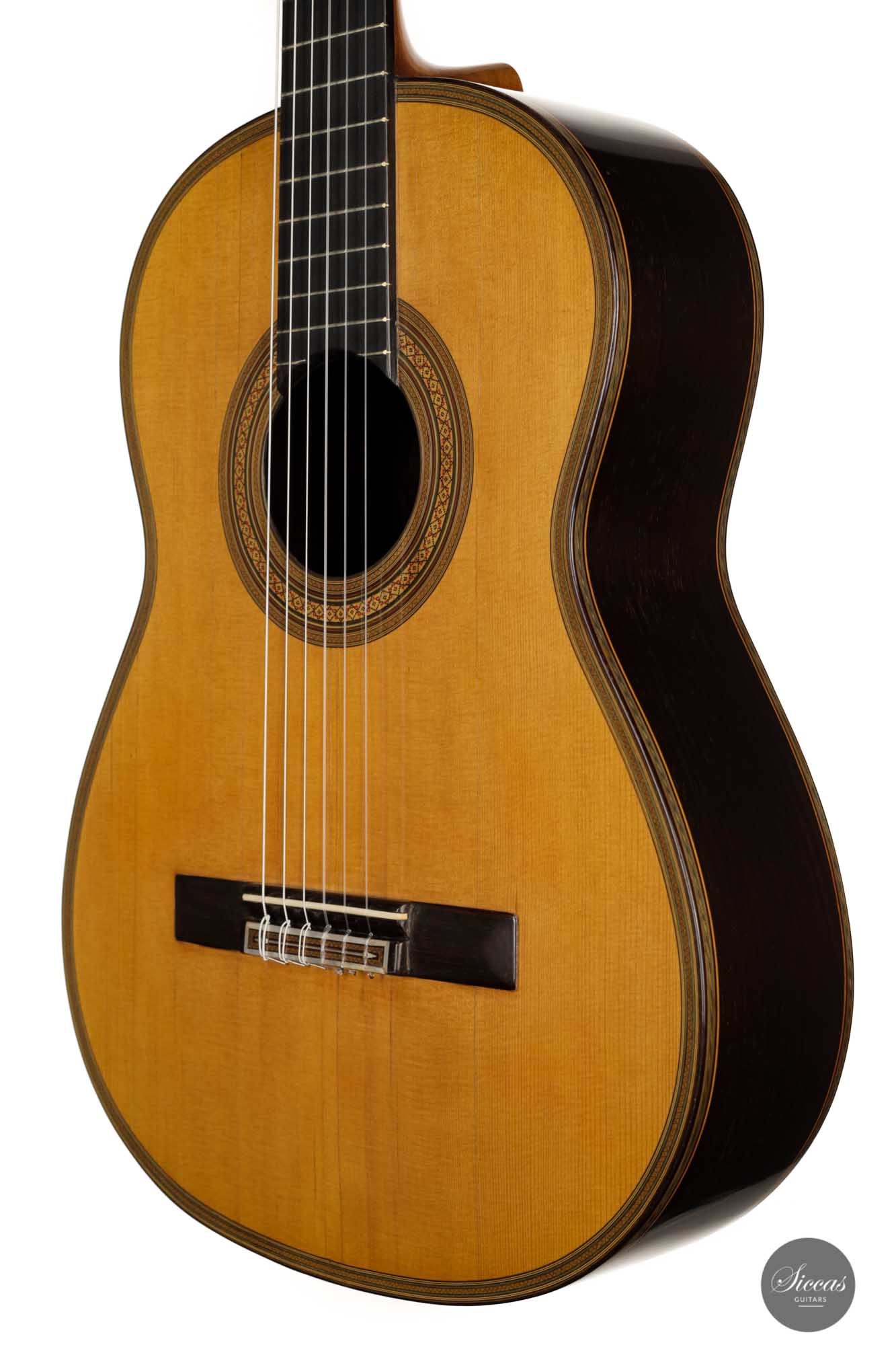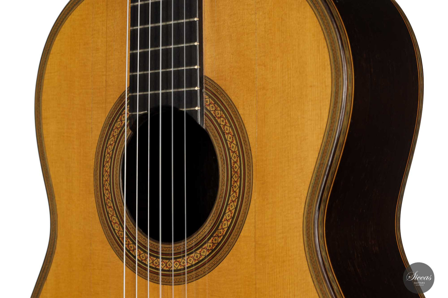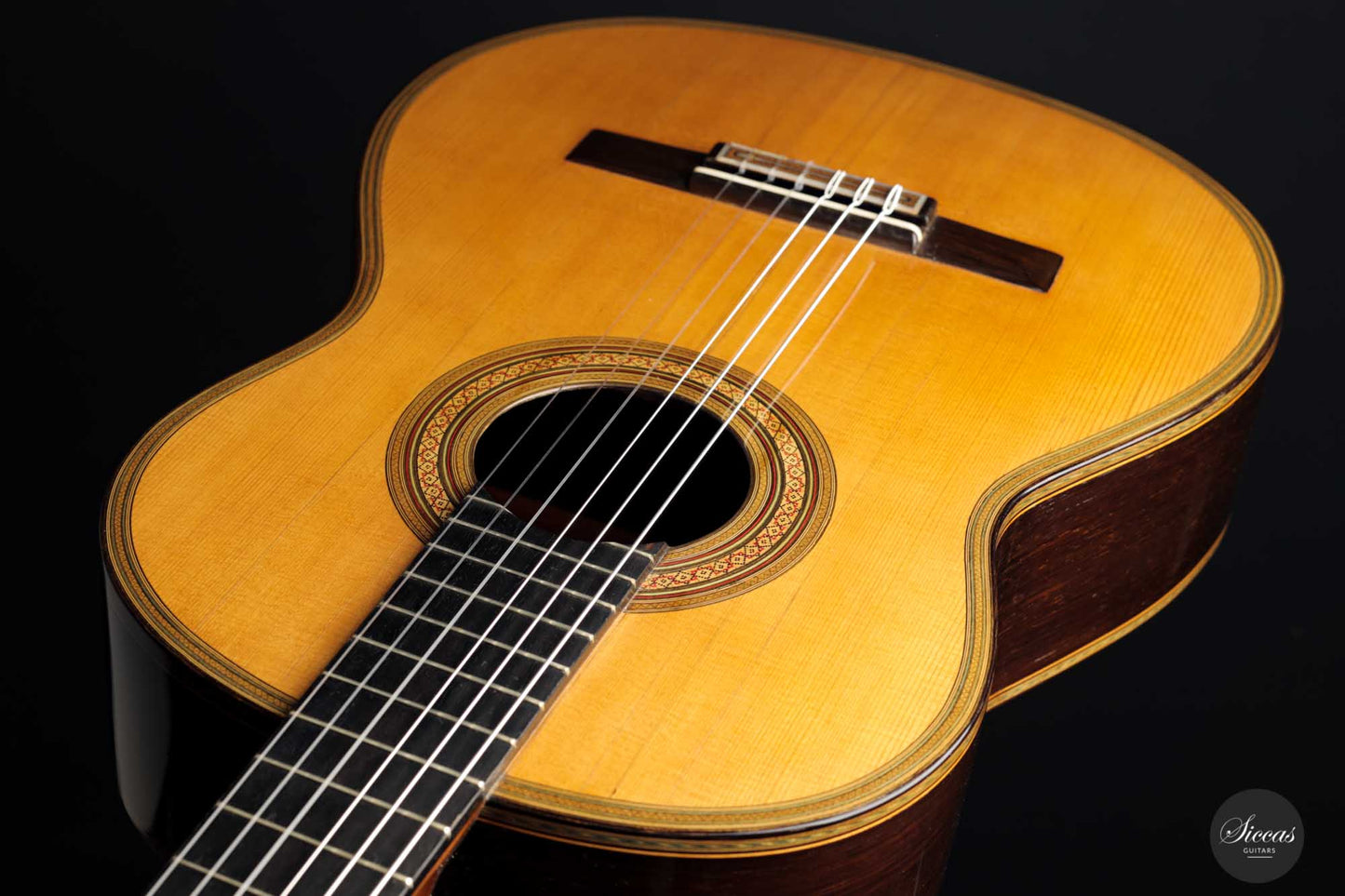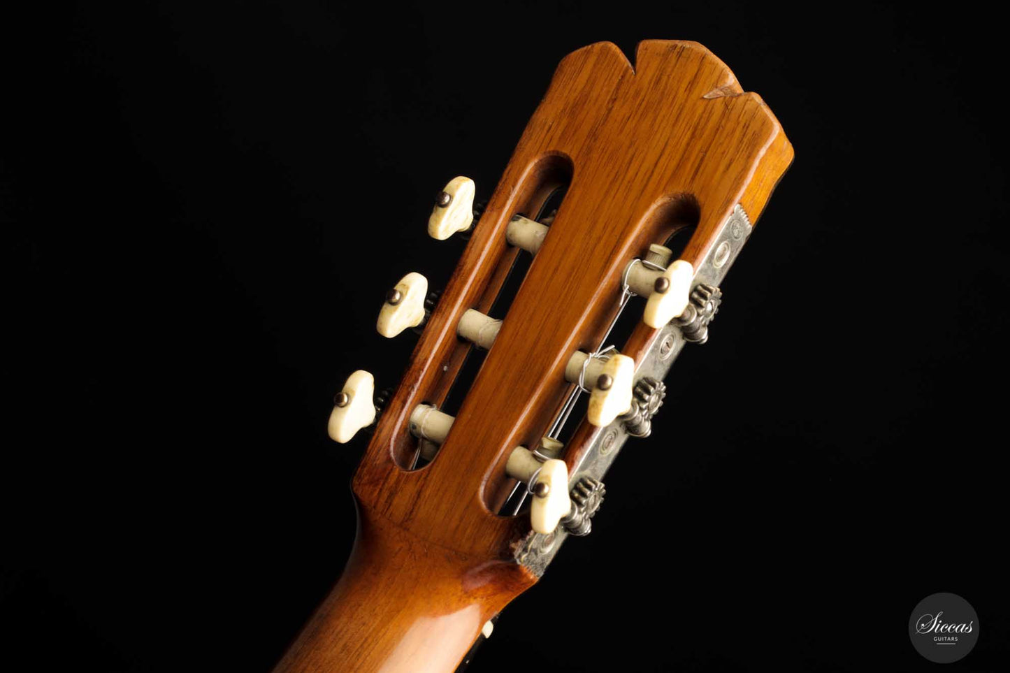 Diese 1920 gebaute Enrique-Garcia-Gitarre mit der Nummer 235 verkörpert die wesentlichen Merkmale der Gitarrenbauschule Barcelonas Anfang des 20. Jahrhunderts. FFür alle Liebhaber der katalanischen Ästhetik dieser Zeit gibt es kaum etwas Besseres, sowohl was den Klang als auch das Design betrifft. Dieses Instrument wurde gegen Ende der beruflichen Laufbahn von Enrique Garcia gebaut und ist ein seltenes, reich dekoriertes Modell. Die breite Rosette, die geschnitzte Kopfplatte, die kunstvollen Randeinlagen und das Mosaik auf der Kopfplatte machen es zu einem wahren Kunstwerk. Die eingefassten Mechaniken sind ein aufregendes Merkmal, das wir bei den Gitarren von Enrique Garcia nur selten bewundern konnten. Von vorn betrachtet sind sie völlig unsichtbar, was zeigt, mit wie viel Liebe zum Detail Enrique Garcia seine Instrumente gestaltete. DDiese Gitarre ist in ausgezeichnetem Zustand und hat einen gewaltigen Klang. Haarrisse in der Decke wurden fachmännisch restauriert, ein Riss am Boden wurde sorgfältig repariert, so dass diese außergewöhnlich seltene und sammelwürdige Gitarre nun bereit ist, gespielt und aufgezeichnet zu werden.