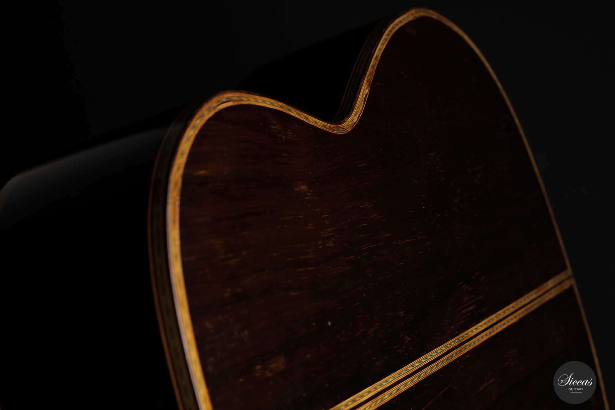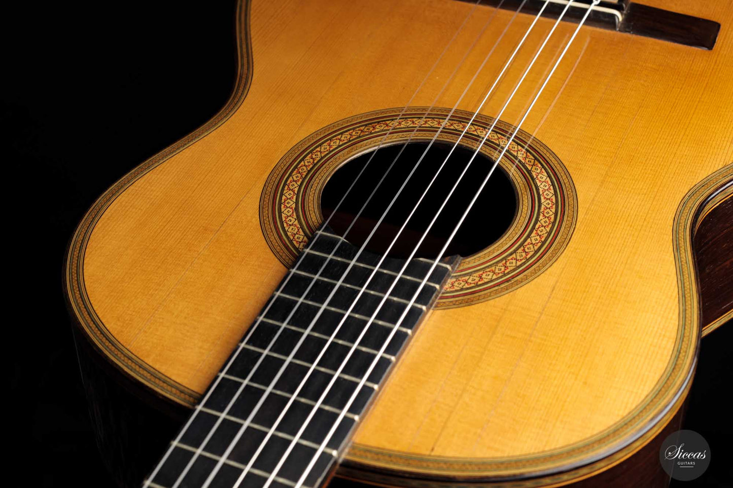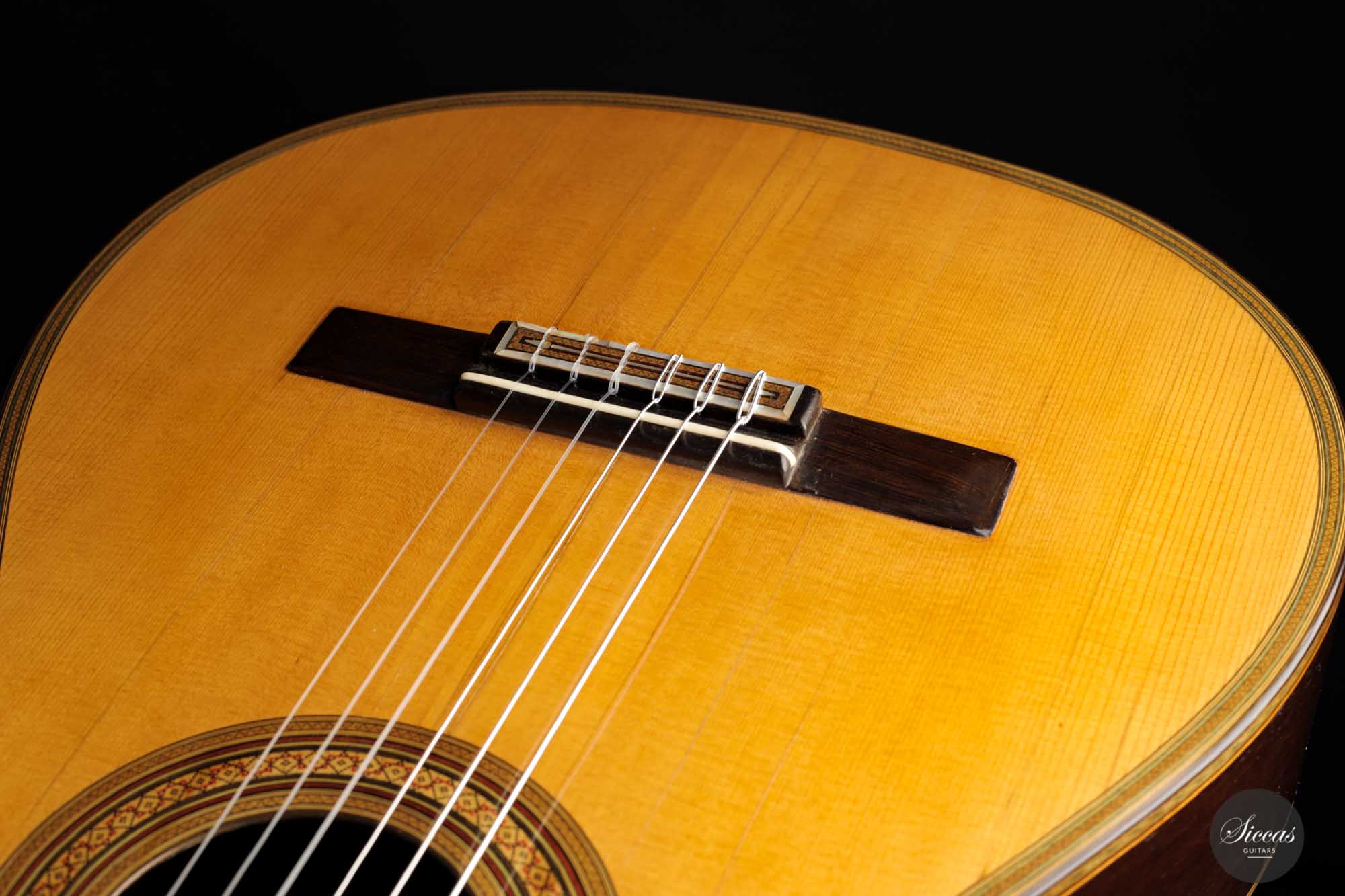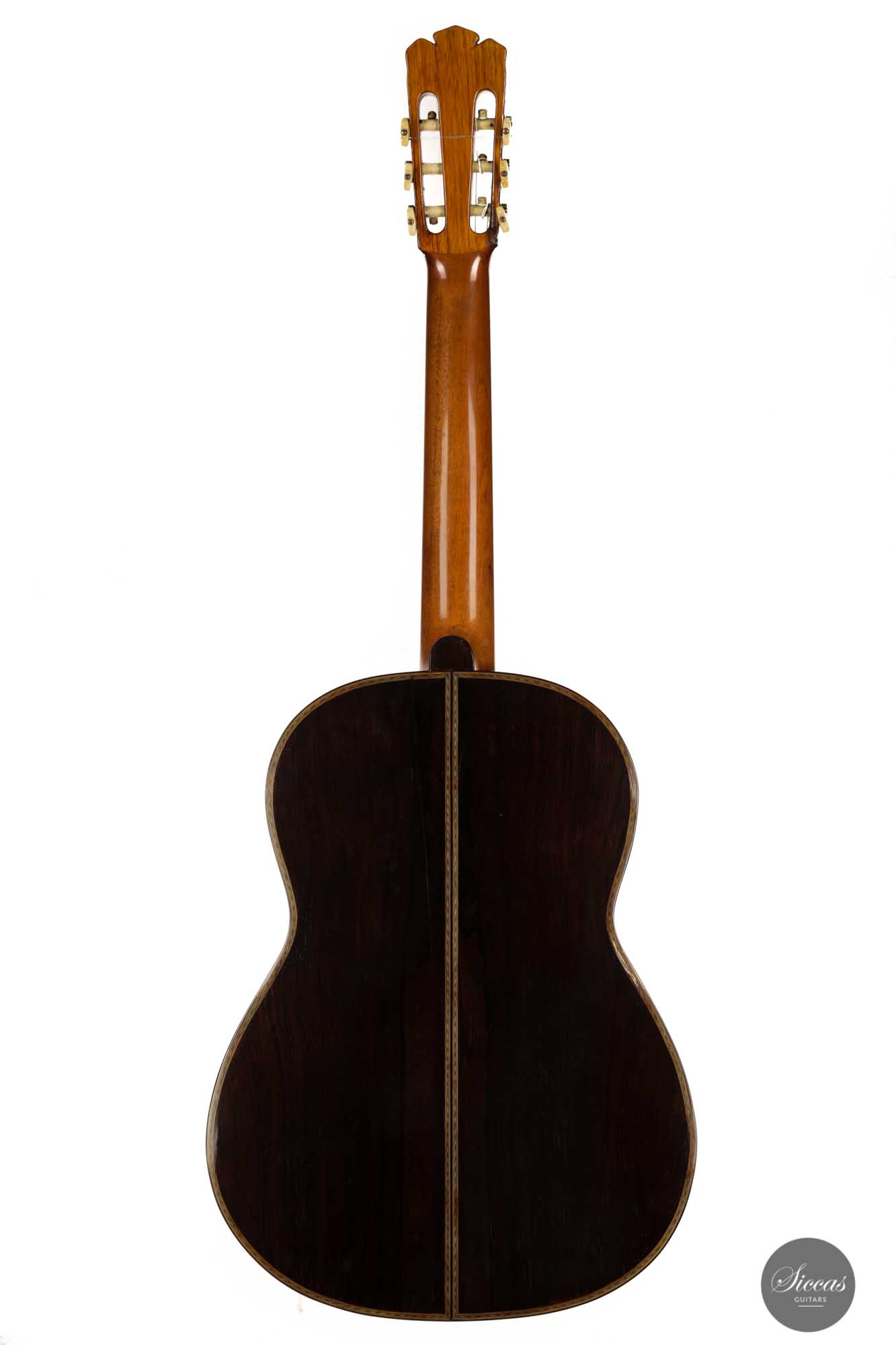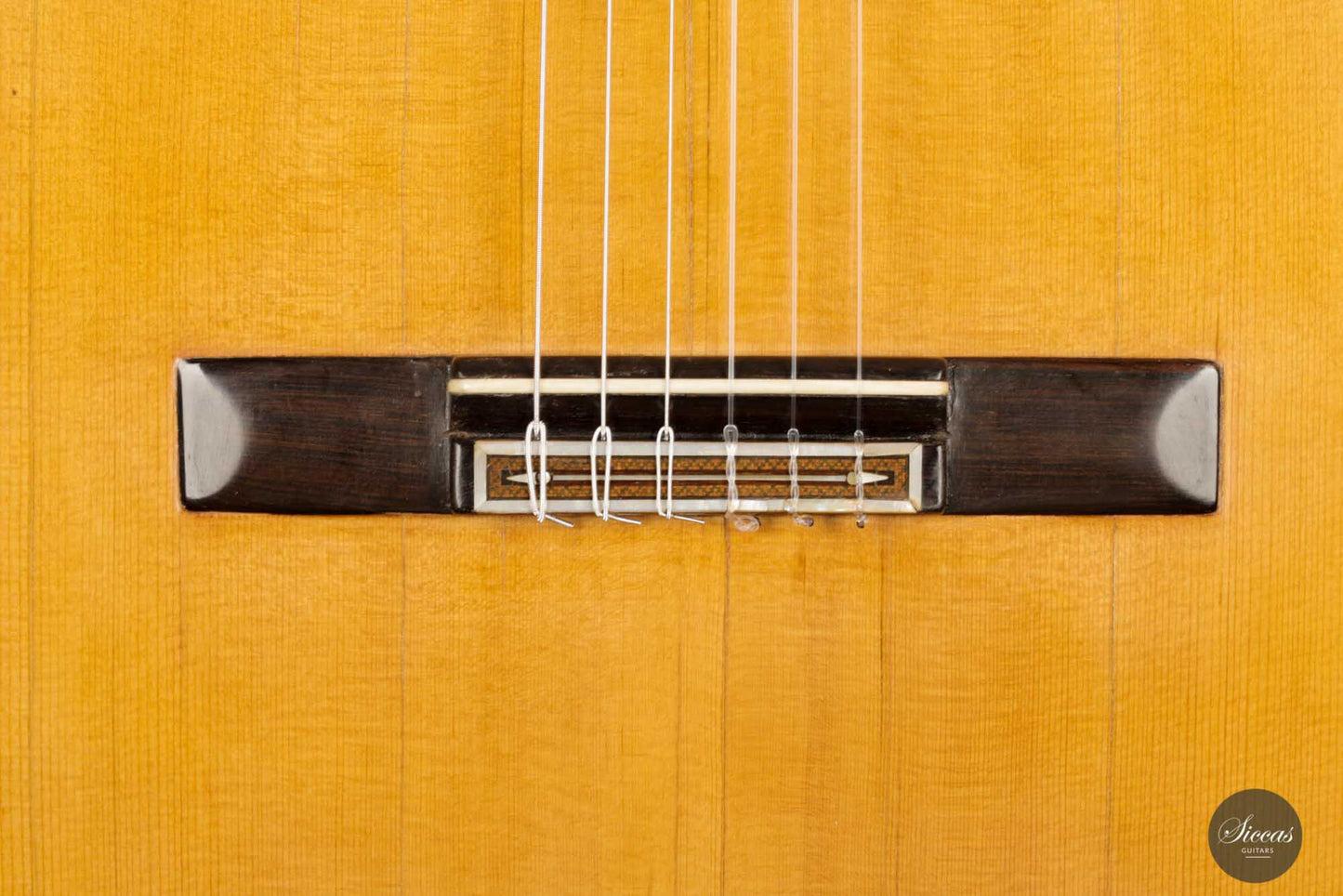 Diese 1920 gebaute Enrique-Garcia-Gitarre mit der Nummer 235 verkörpert die wesentlichen Merkmale der Gitarrenbauschule Barcelonas Anfang des 20. Jahrhunderts. FFür alle Liebhaber der katalanischen Ästhetik dieser Zeit gibt es kaum etwas Besseres, sowohl was den Klang als auch das Design betrifft. Dieses Instrument wurde gegen Ende der beruflichen Laufbahn von Enrique Garcia gebaut und ist ein seltenes, reich dekoriertes Modell. Die breite Rosette, die geschnitzte Kopfplatte, die kunstvollen Randeinlagen und das Mosaik auf der Kopfplatte machen es zu einem wahren Kunstwerk. Die eingefassten Mechaniken sind ein aufregendes Merkmal, das wir bei den Gitarren von Enrique Garcia nur selten bewundern konnten. Von vorn betrachtet sind sie völlig unsichtbar, was zeigt, mit wie viel Liebe zum Detail Enrique Garcia seine Instrumente gestaltete. DDiese Gitarre ist in ausgezeichnetem Zustand und hat einen gewaltigen Klang. Haarrisse in der Decke wurden fachmännisch restauriert, ein Riss am Boden wurde sorgfältig repariert, so dass diese außergewöhnlich seltene und sammelwürdige Gitarre nun bereit ist, gespielt und aufgezeichnet zu werden.