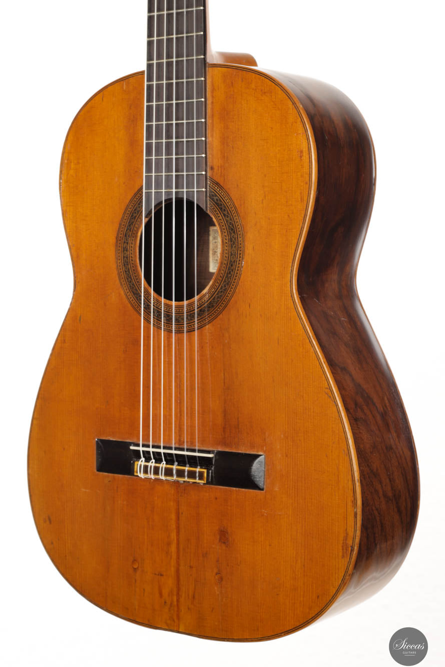 Diese Konzertgitarre aus dem Jahr 1921 ist ein bemerkenswertes Stück Gitarrengeschichte und repräsentiert die berühmte Barcelona Schule des Gitarrenbaus. Ursprünglich mit einer Saitenhalterkonstruktion gebaut, wurde sie später auf ein traditionelles Stegsystem umgebaut, was sichtbare Reparaturstellen auf der Decke hinterlassen hat. Trotz ihres Alters befindet sich die Gitarre in einem guten Zustand. Die Decke weist mehrere reparierte Risse auf, während die Zargen und der Boden jeweils einen reparierten Riss haben. Alle Risse wurden fachgerecht instand gesetzt, sodass die Stabilität gewährleistet ist und die Gitarre spielbereit ist. Klanglich beeindruckt sie mit einem kraftvollen, fundamentalen Bass und brillanten, singenden Höhen, die an die legendären Gitarren von Santos Hernández erinnern. Dieses Instrument ist nicht nur ein wunderschönes Kunstwerk mit großem historischem Wert, sondern auch ein hervorragendes Musikinstrument für anspruchsvolle Spieler.