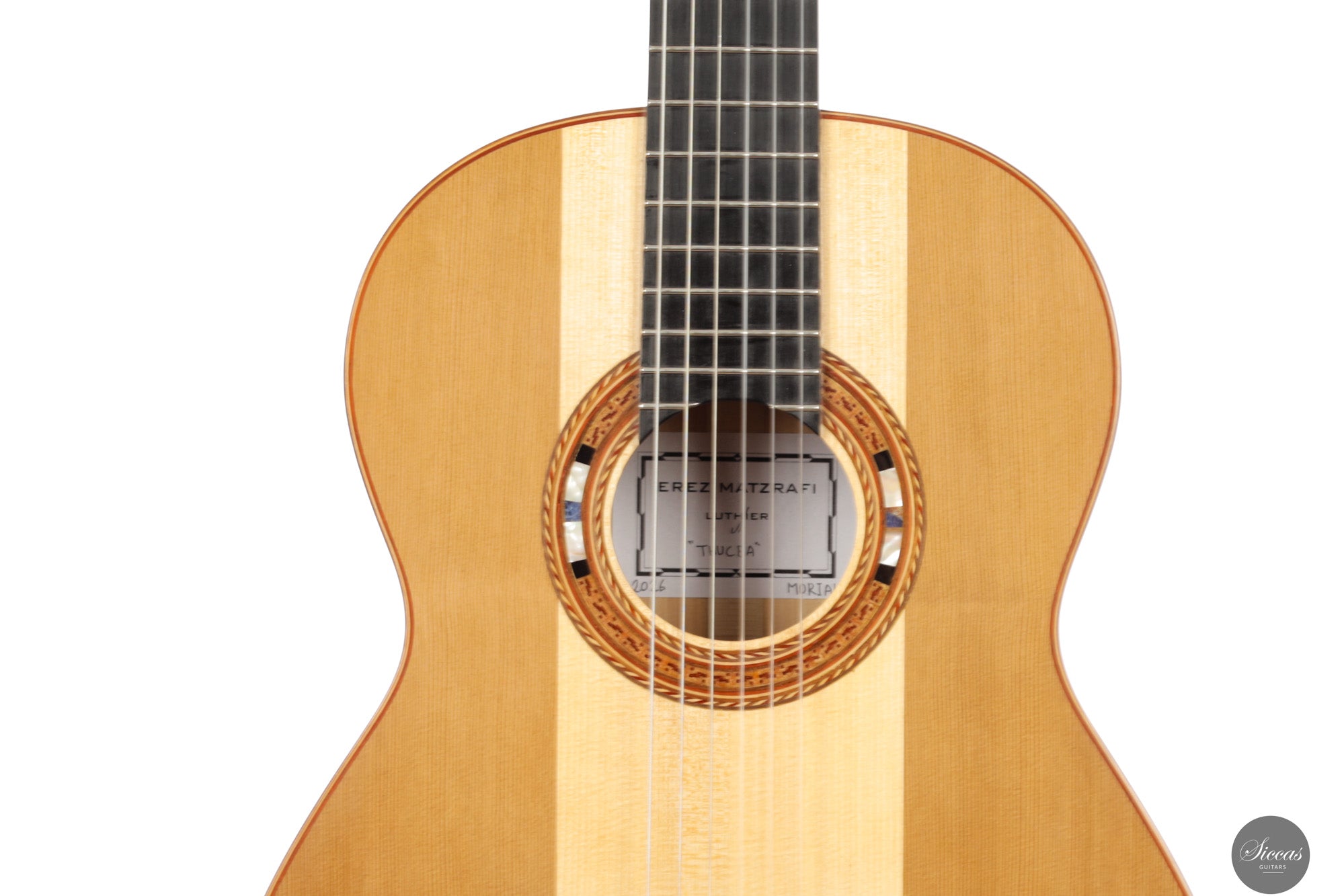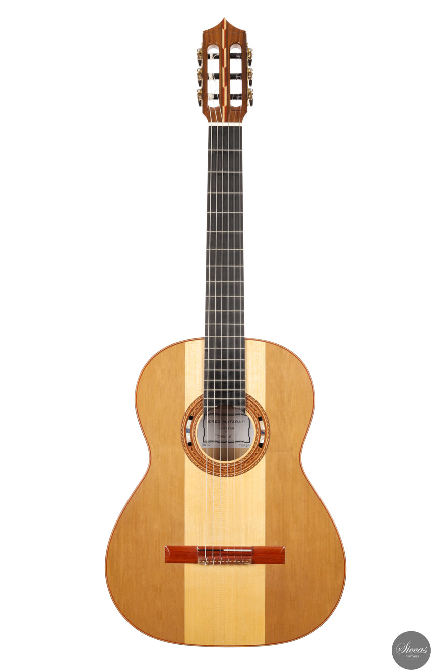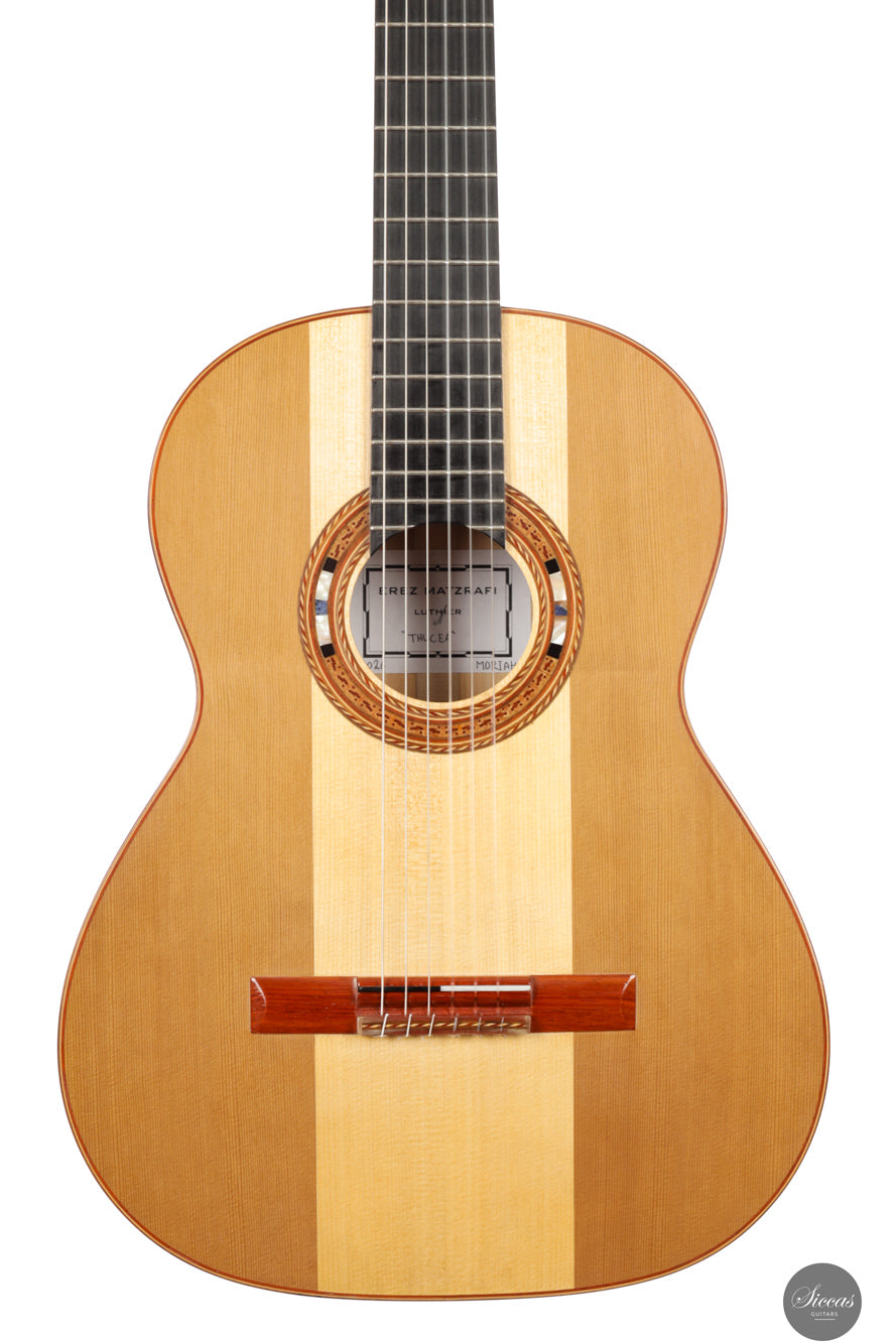 Erez Matzrafi ist ein israelischer Gitarrenbauer, der seit 2013 klassische und Flamenco-Gitarren baut. Was als autodidaktisches Hobby begann – aus einer allgemeinen Leidenschaft für das Bauen, von Modellflugzeugen bis zu Musikinstrumenten – entwickelte sich rasch zu einem professionellen Weg. Maßgeblich geprägt wurde er durch führende klassische Gitarristen Israels wie Yoram Zerbib, Tal Hurwitz und Ruben Seroussi, deren Unterstützung eine zentrale Rolle in seiner Entwicklung spielte. Ein Wendepunkt war die Begegnung mit Andrea Tacchi, vermittelt durch Maestro Hurwitz. Aus dem intensiven Austausch mit Tacchi entstand ein tiefgreifendes Umdenken in Matzrafis Arbeit: eine neue Wertschätzung für Klangsensibilität, ästhetische Klarheit und den bewussten Umgang mit Materialien. Tacchis Einfluss zeigt sich besonders in Matzrafis Behandlung der Deckenstärken, der membranartigen Ansprache, den doppelten Zypressenzargen und der klanglichen Abstimmung von Fichte und Zeder.