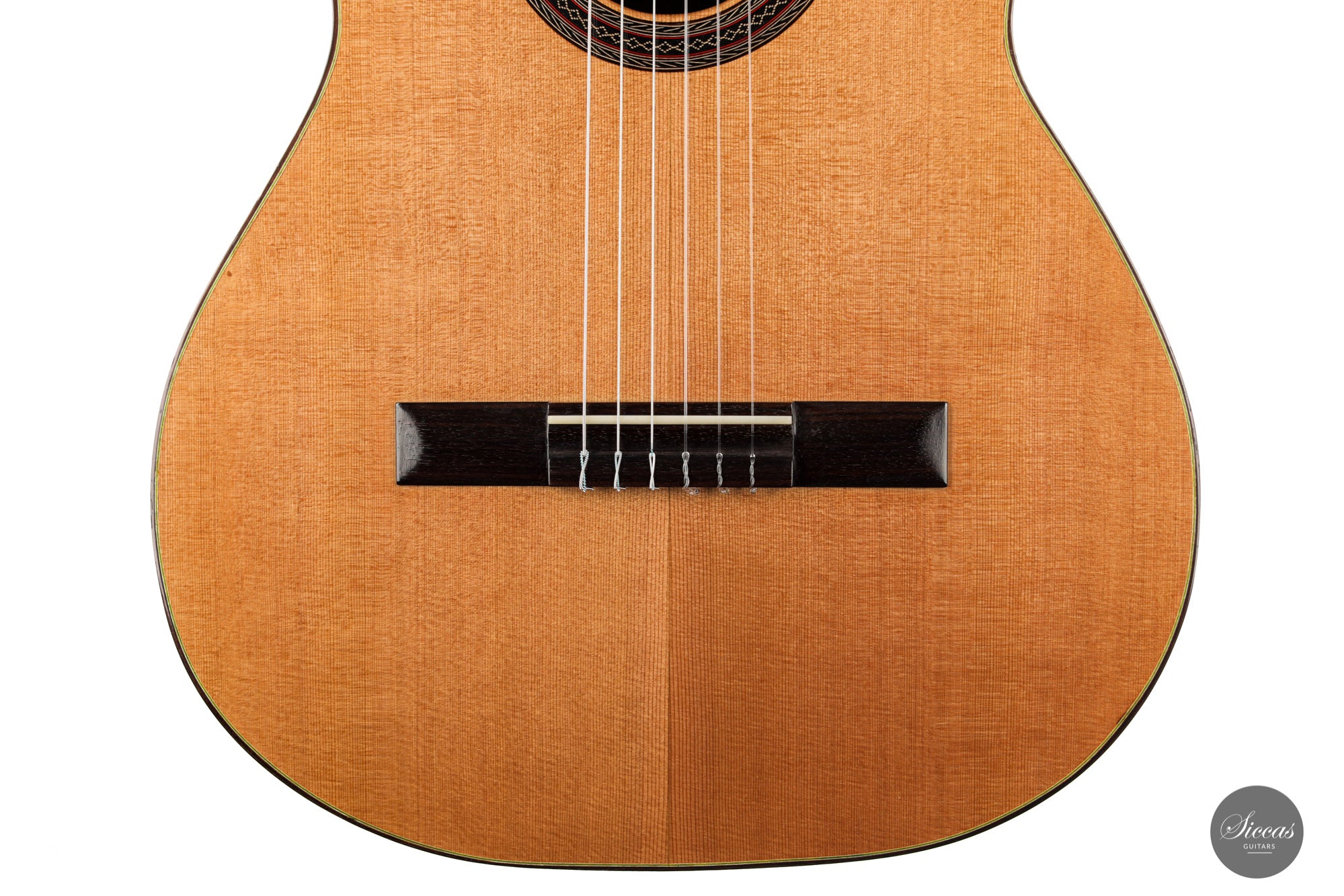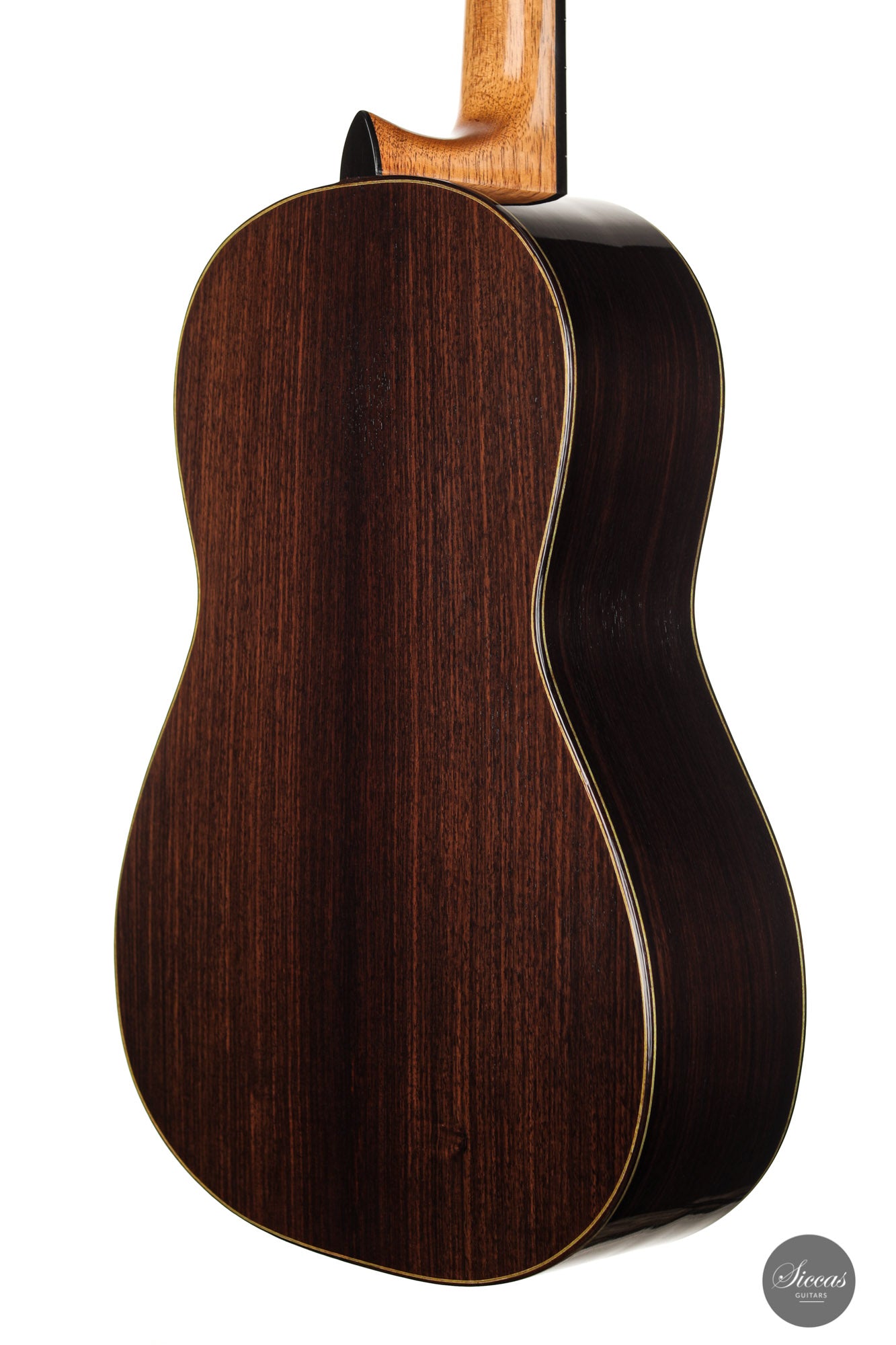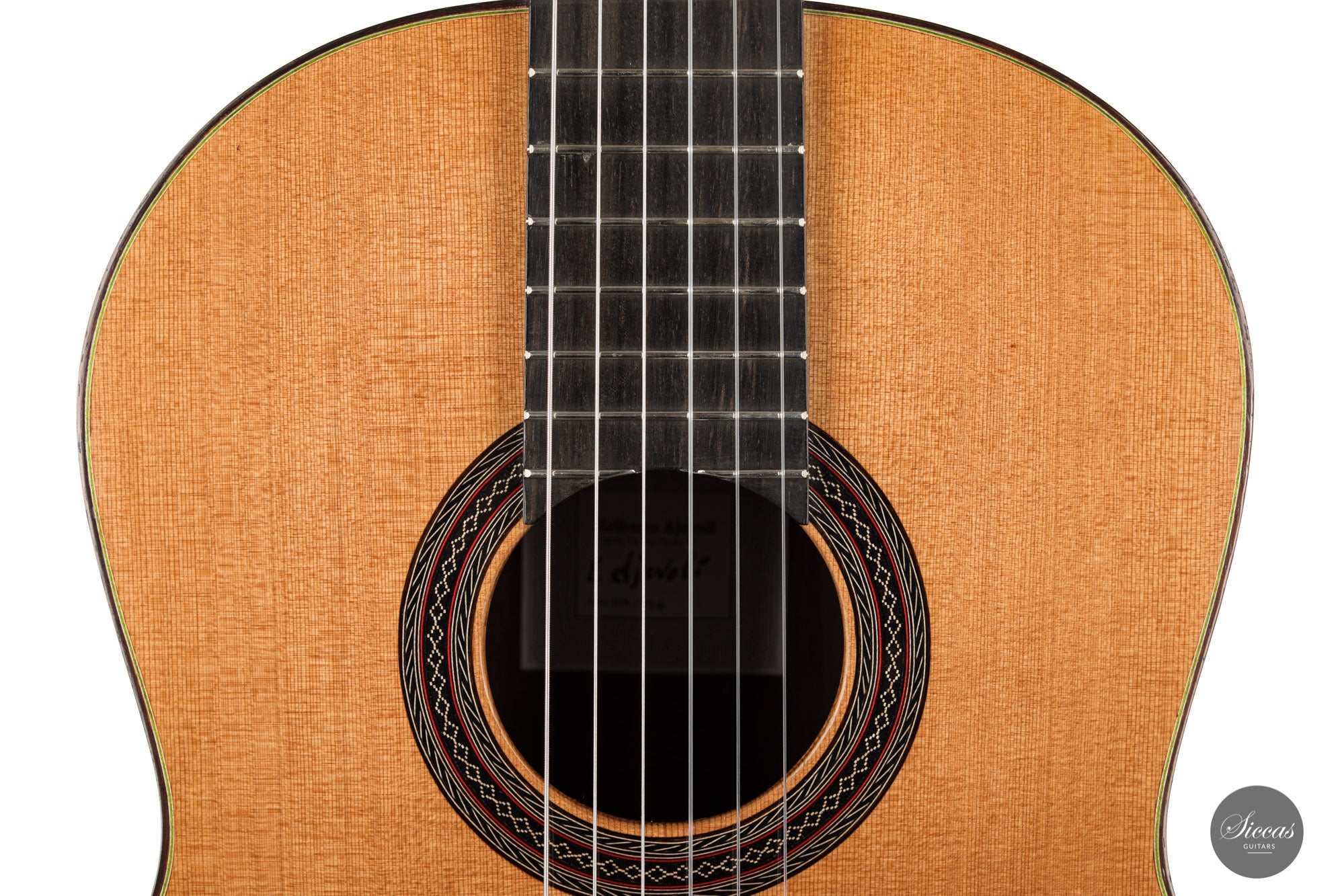 Diese exquisite, im Jahr 2021 gebaute Gitarre mit der Nummer 134 weist die Holzkombination auf, die viele große Konzertgitarren auszeichnet: eine Zederndecke und ein Boden und Zargen aus indischem Palisander. Diese Holzpaarung hat sich in den letzten fünfzig Jahren bewährt und bietet einmal mehr ein wirklich hervorragendes Ergebnis. Der Klang ist sehr voll und reichhaltig, mit einem langen Sustain und einem warmen, abgerundeten Ton. Die Spielfreude ist sofort vorhanden, und die Möglichkeiten der Klangfarben und der Dynamik sind besonders reizvoll. Alles in allem ein wirklich wunderbares Instrument, gebaut im Stil von Robert Bouchet.