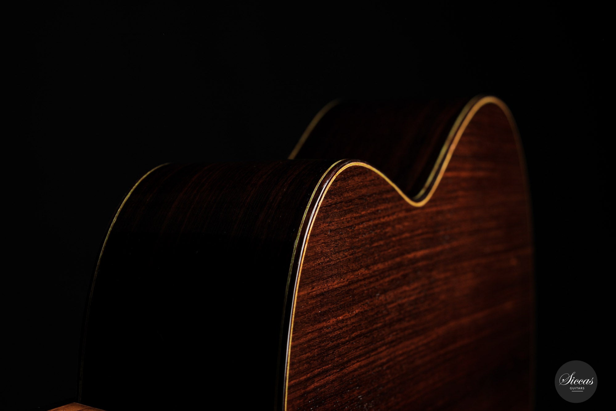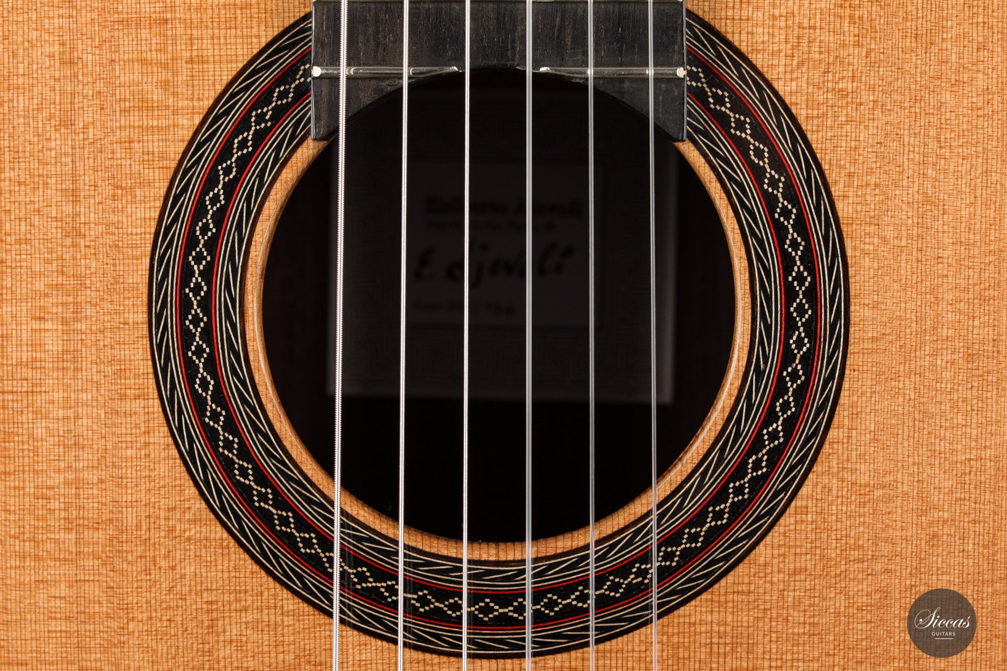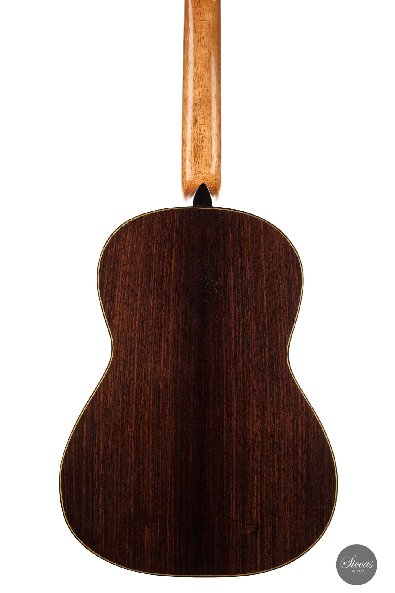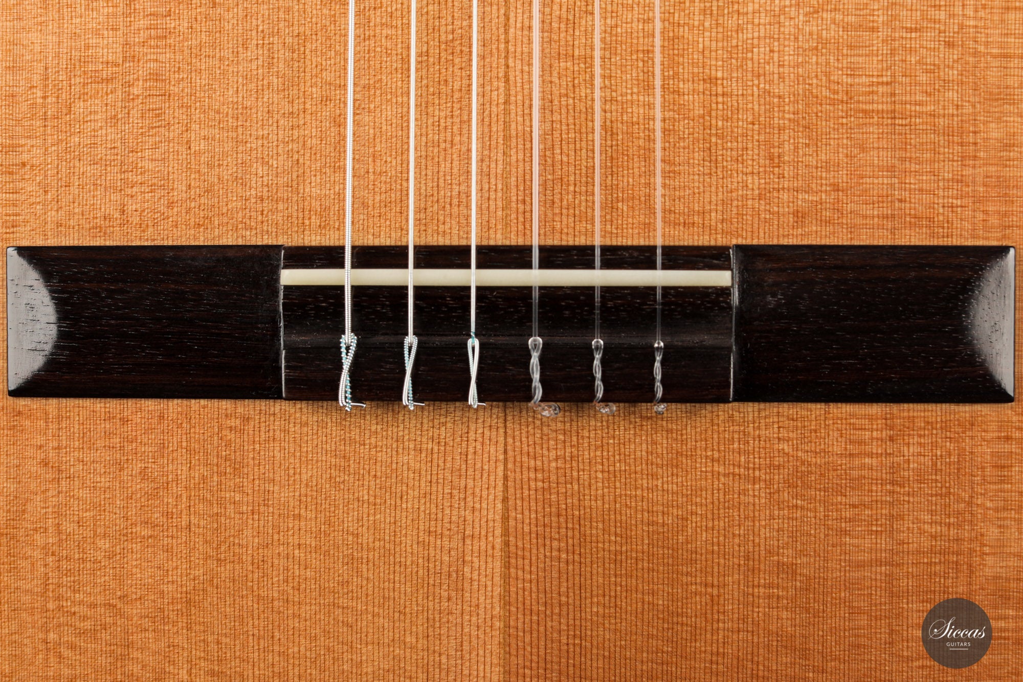 Diese exquisite, im Jahr 2021 gebaute Gitarre mit der Nummer 134 weist die Holzkombination auf, die viele große Konzertgitarren auszeichnet: eine Zederndecke und ein Boden und Zargen aus indischem Palisander. Diese Holzpaarung hat sich in den letzten fünfzig Jahren bewährt und bietet einmal mehr ein wirklich hervorragendes Ergebnis. Der Klang ist sehr voll und reichhaltig, mit einem langen Sustain und einem warmen, abgerundeten Ton. Die Spielfreude ist sofort vorhanden, und die Möglichkeiten der Klangfarben und der Dynamik sind besonders reizvoll. Alles in allem ein wirklich wunderbares Instrument, gebaut im Stil von Robert Bouchet.