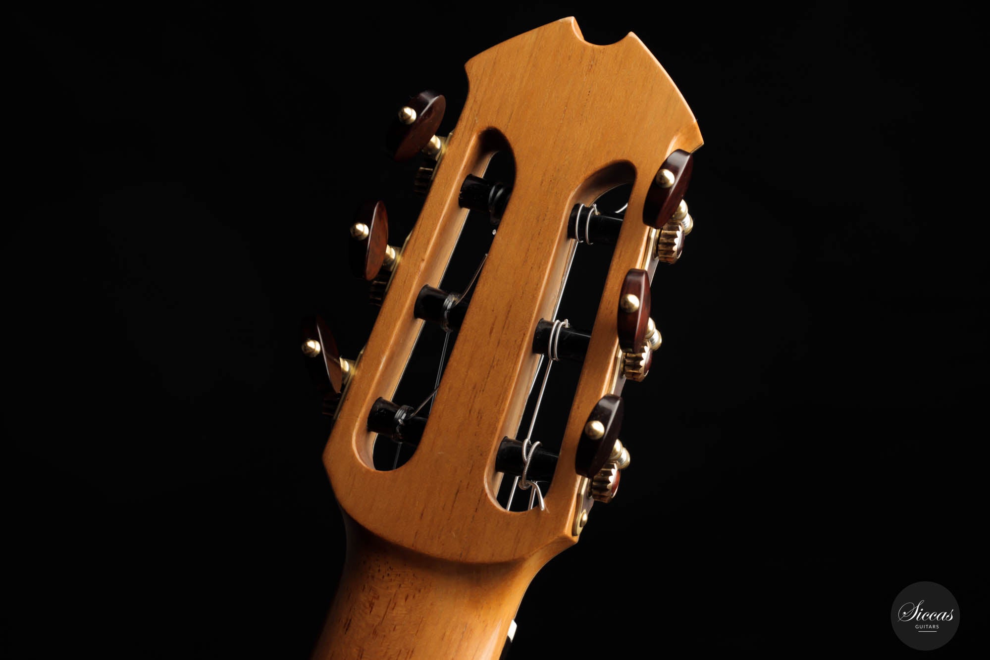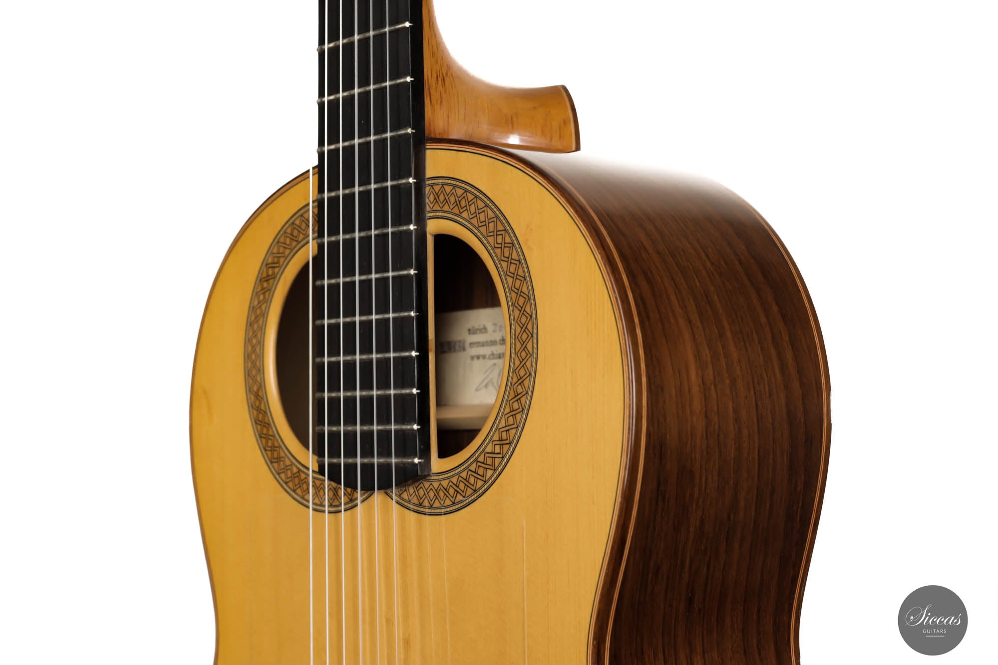 Diese Gitarre ist ein einzigartiges Konzertinstrument mit vielen aufregenden Eigenschaften. Die gut ausgeführten Details und Verzierungen sind das Ergebnis der außergewöhnlichen Handwerkskunst von Ermanno. Aber nicht nur das, sondern auch das durchdachte Design macht diese Gitarre zu einem wunderschönen Konzertinstrument, sowohl ästhetisch als auch akustisch. Dieses Lattice-Modell ist mit einer wunderschönen Fichtendecke und einem sehr schönen Boden und Zargen aus indischem Palisander ausgestattet, ergänzt durch luxuriöse Alessi-Mechaniken mit Stimmknöpfen aus Schlangenholz. Die Idee hinter dem doppelten Schallloch ist, dass durch die Teilung des Schalllochs auf beiden Seiten des Griffbretts mehr Raum für die Schwingung der Decke entsteht. Aufgrund ihrer E-Primärresonanz hat diese Gitarre tiefe und dunkle Bässe sowie klare und singende Höhen. Außerdem hat sie ein ausgezeichnetes und natürlich klingendes Audiosystem von Boton (Hans-Rudolf Bossart). Als "Preloved" Instrument weist diese Gitarre nur oberflächliche Spielspuren auf und ist für jede Konzertsituation bereit.