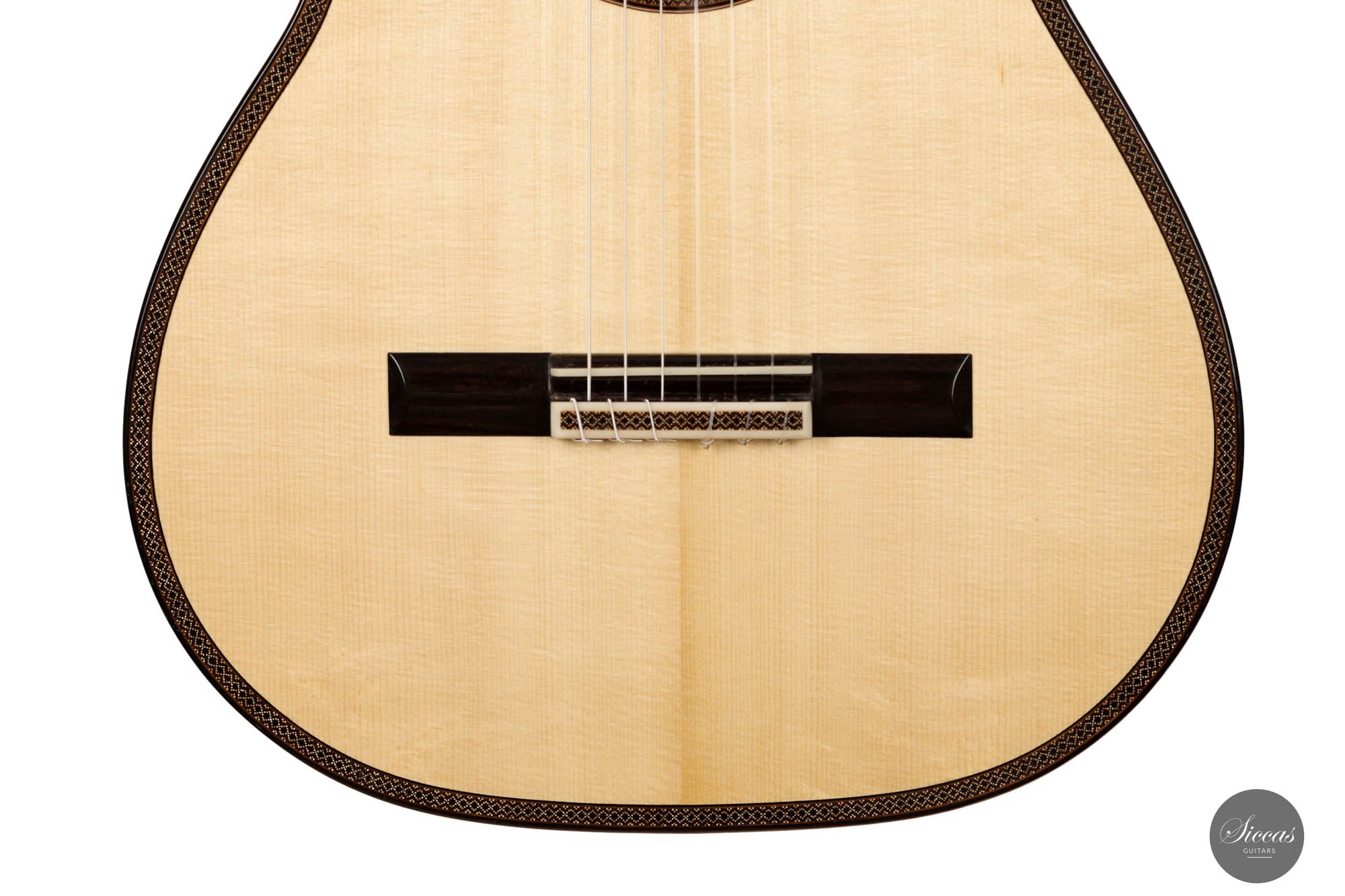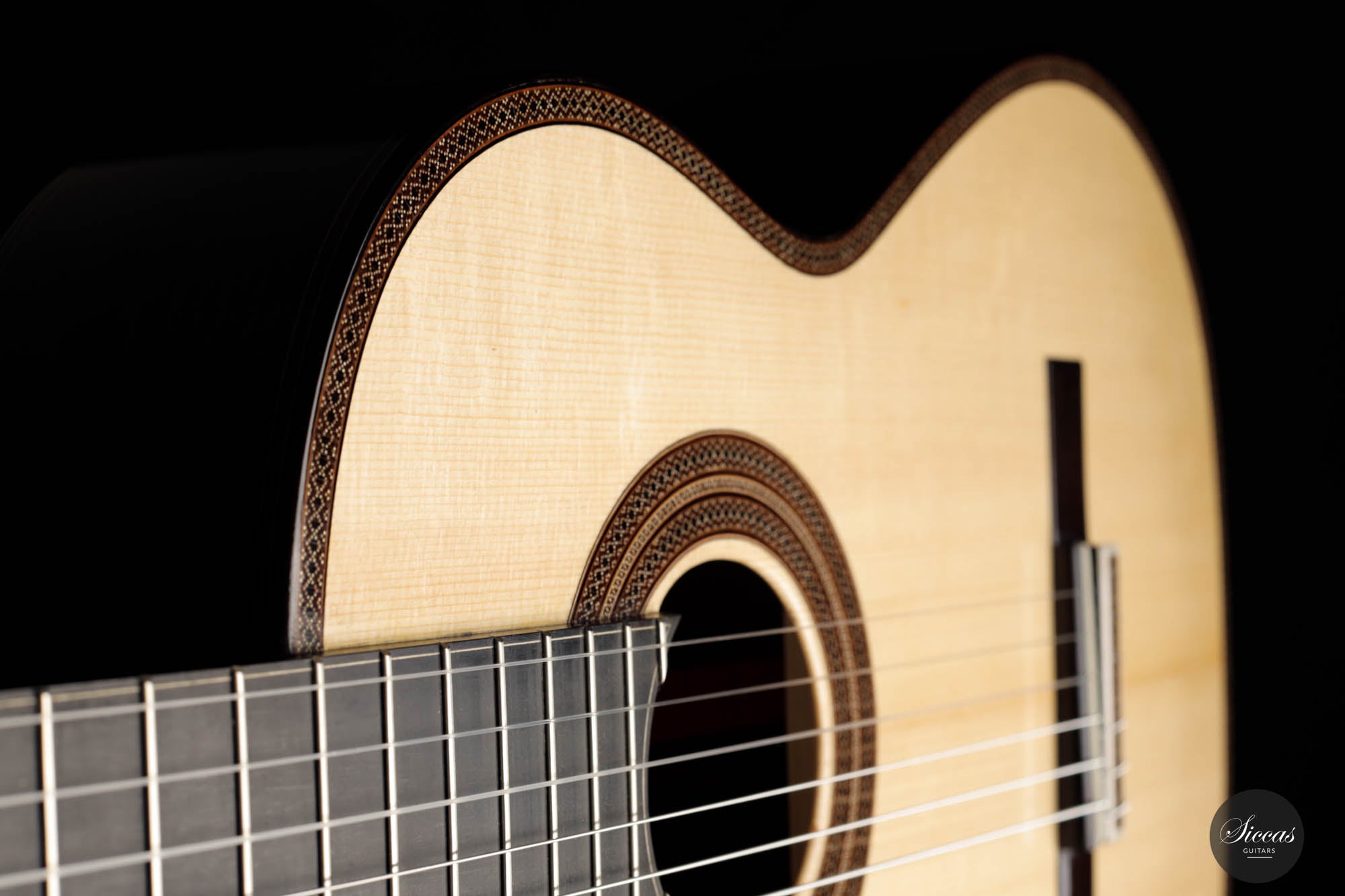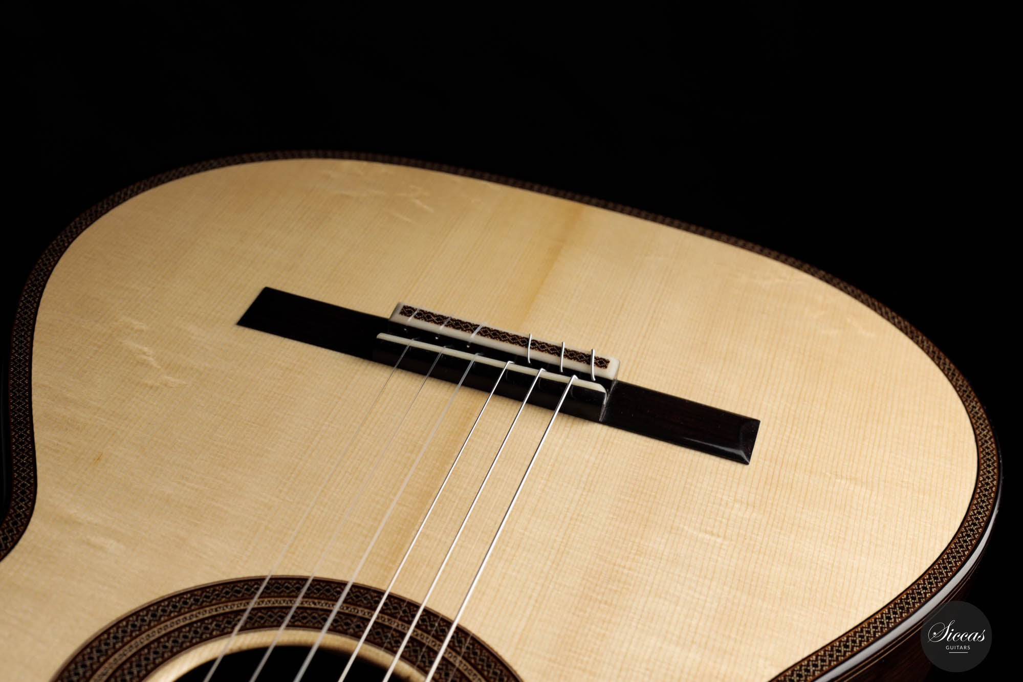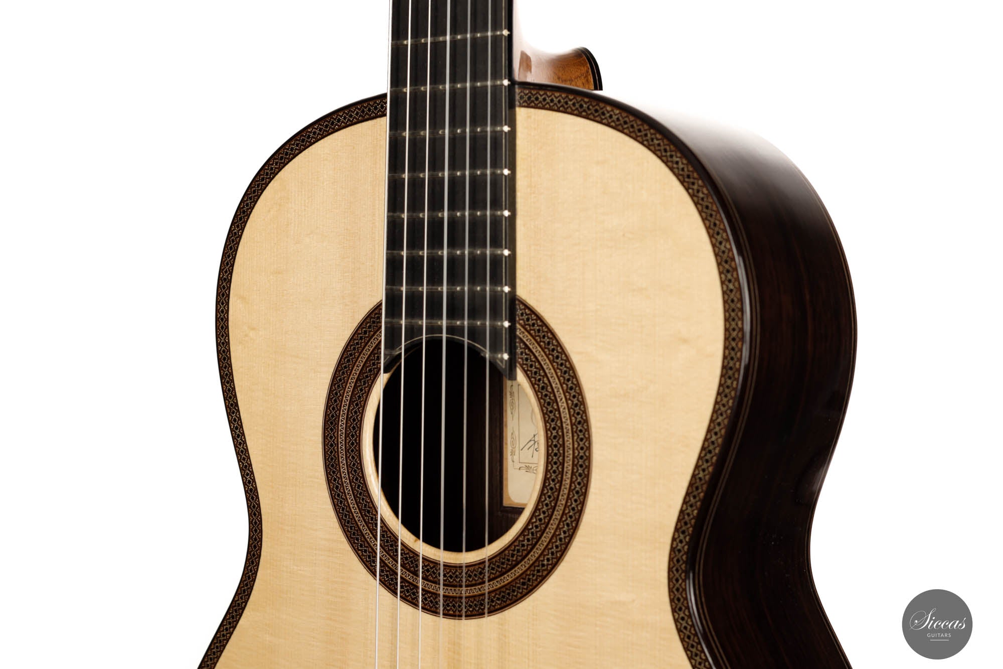 Die Gitarre von Fabio Schmidt, die auf der Roma Guitar Expo 2023 vorgestellt wird, spiegelt die Hingabe des italienischen Gitarrenbauers an sein Handwerk wider. Dieses Instrument, das sich durch sein geschmackvolles Design und hochwertige Materialien auszeichnet, zeigt Schmidts Liebe zum Detail und sein Verständnis für den Gitarrenbau. Optisch beeindruckt die Gitarre mit einem detaillierten Bauplan, der Schmidts Können unter Beweis stellt. Der Boden und die Zargen aus indischem Palisander sind mit sorgfältigen Verzierungen versehen, die der Gitarre einen Hauch von Individualität verleihen, ohne die traditionelle Ästhetik der Gitarre zu beeinträchtigen. Die für dieses Instrument ausgewählten Materialien unterstreichen Schmidts Fokus auf die Klangqualität. Die Decke aus Fichte, gepaart mit Boden und Zargen aus indischem Palisander, ermöglicht eine ausgewogene und umfassende Klangwiedergabe. Fichtenholz wird wegen seiner Langlebigkeit und seines breiten Klangspektrums bevorzugt, während indischer Palisander für seine tiefe Resonanz bekannt ist und einen vollmundigen Klang bietet. Was die Schmidt-Gitarre auszeichnet, ist ihre außergewöhnliche Reaktionsfähigkeit. Dieses Instrument ist so konzipiert, dass es effektiv auf den Anschlag des Spielers reagiert und so ein interaktives und kooperatives Musikerlebnis ermöglicht. Diese leichte Spielbarkeit verbessert die Fähigkeit des Musikers, seine musikalischen Ideen zu vermitteln, und macht die Gitarre zu einem Instrument und einem ausdrucksstarken Werkzeug für die Kunst. Zusammenfassend lässt sich sagen, dass die auf der Roma Guitar Expo 2023 vorgestellte Gitarre von Fabio Schmidt ein bemerkenswertes Instrument ist, das sein handwerkliches Können und seinen durchdachten Ansatz im Gitarrenbau widerspiegelt. Durch die Kombination von ästhetisch ansprechendem Design mit sorgfältig ausgewählten Materialien und außergewöhnlicher Spielbarkeit unterstreicht Schmidts Kreation seine Hingabe an die Kunst des Gitarrenbaus.