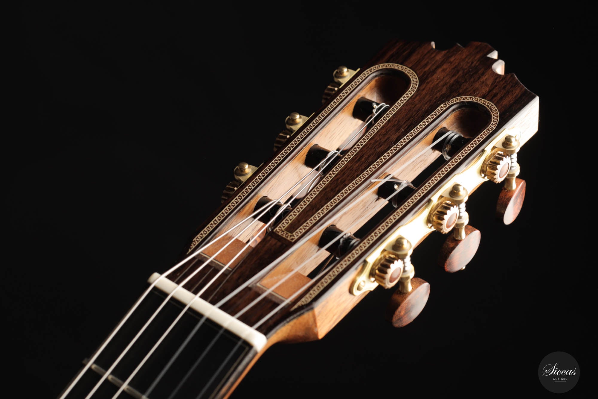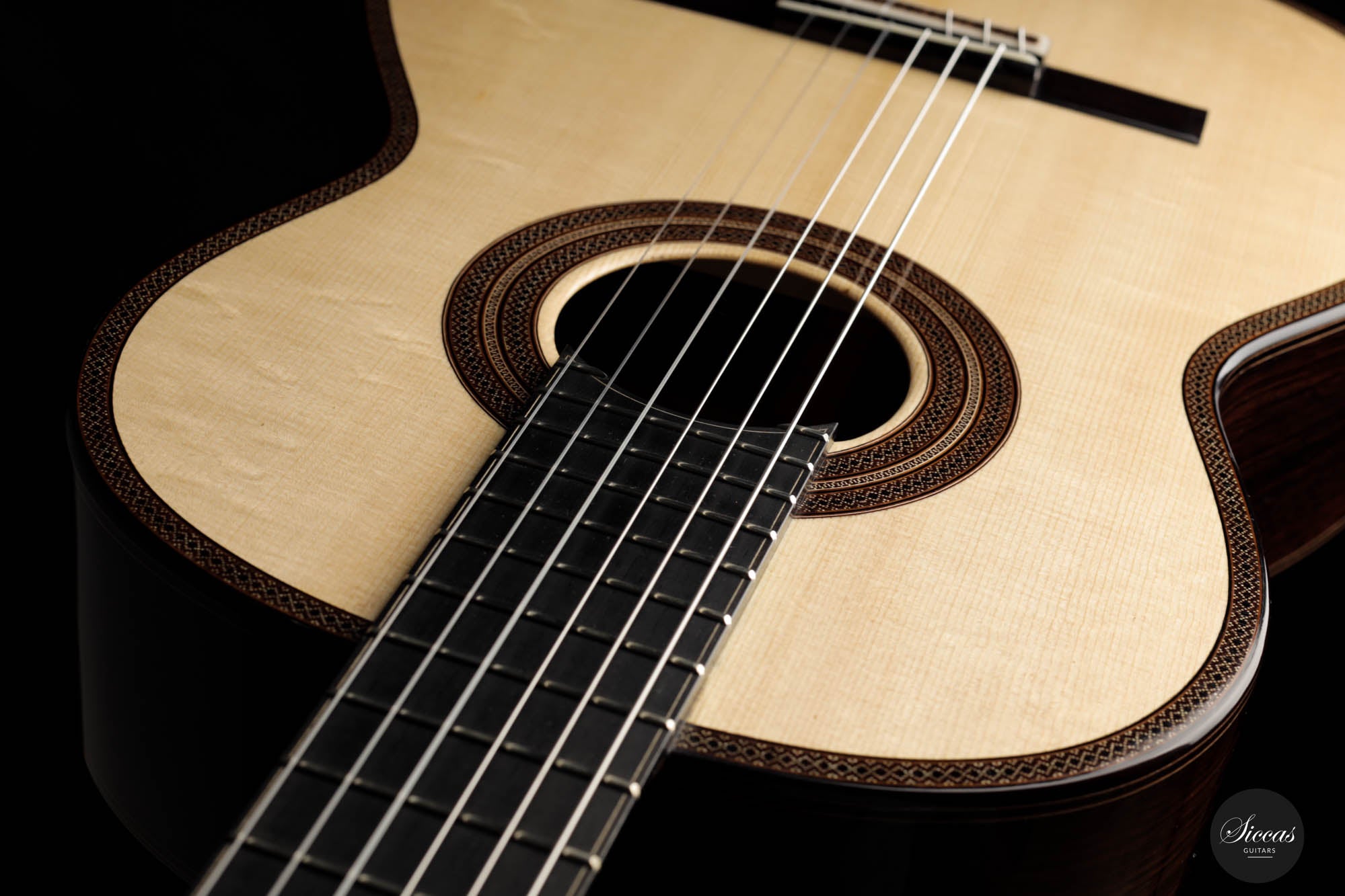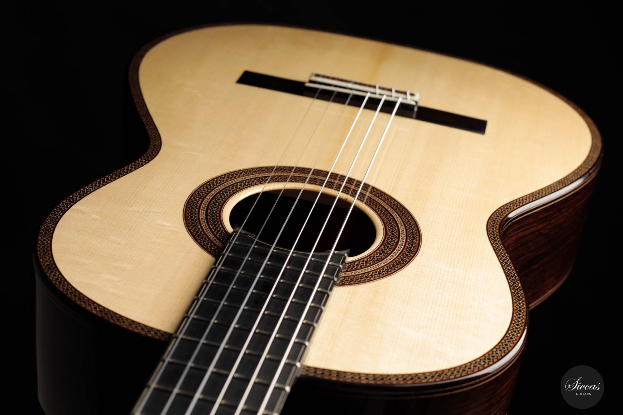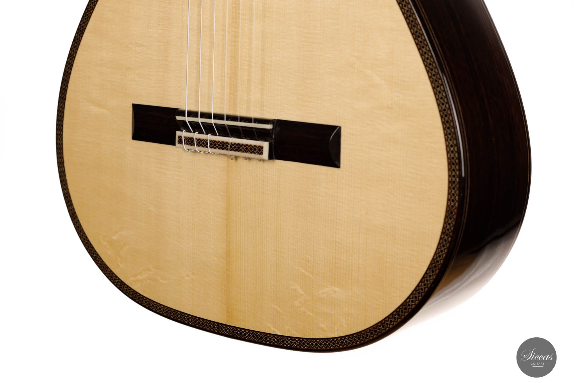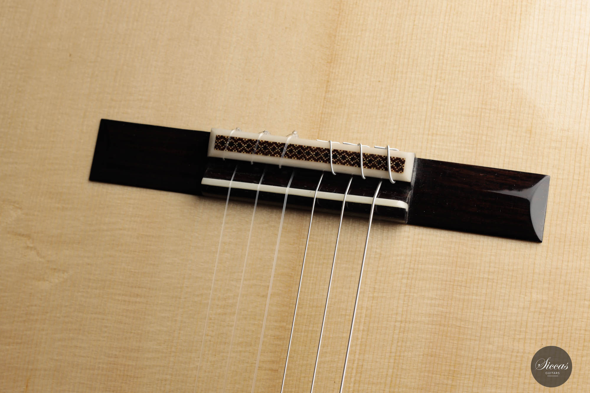 Die Gitarre von Fabio Schmidt, die auf der Roma Guitar Expo 2023 vorgestellt wird, spiegelt die Hingabe des italienischen Gitarrenbauers an sein Handwerk wider. Dieses Instrument, das sich durch sein geschmackvolles Design und hochwertige Materialien auszeichnet, zeigt Schmidts Liebe zum Detail und sein Verständnis für den Gitarrenbau. Optisch beeindruckt die Gitarre mit einem detaillierten Bauplan, der Schmidts Können unter Beweis stellt. Der Boden und die Zargen aus indischem Palisander sind mit sorgfältigen Verzierungen versehen, die der Gitarre einen Hauch von Individualität verleihen, ohne die traditionelle Ästhetik der Gitarre zu beeinträchtigen. Die für dieses Instrument ausgewählten Materialien unterstreichen Schmidts Fokus auf die Klangqualität. Die Decke aus Fichte, gepaart mit Boden und Zargen aus indischem Palisander, ermöglicht eine ausgewogene und umfassende Klangwiedergabe. Fichtenholz wird wegen seiner Langlebigkeit und seines breiten Klangspektrums bevorzugt, während indischer Palisander für seine tiefe Resonanz bekannt ist und einen vollmundigen Klang bietet. Was die Schmidt-Gitarre auszeichnet, ist ihre außergewöhnliche Reaktionsfähigkeit. Dieses Instrument ist so konzipiert, dass es effektiv auf den Anschlag des Spielers reagiert und so ein interaktives und kooperatives Musikerlebnis ermöglicht. Diese leichte Spielbarkeit verbessert die Fähigkeit des Musikers, seine musikalischen Ideen zu vermitteln, und macht die Gitarre zu einem Instrument und einem ausdrucksstarken Werkzeug für die Kunst. Zusammenfassend lässt sich sagen, dass die auf der Roma Guitar Expo 2023 vorgestellte Gitarre von Fabio Schmidt ein bemerkenswertes Instrument ist, das sein handwerkliches Können und seinen durchdachten Ansatz im Gitarrenbau widerspiegelt. Durch die Kombination von ästhetisch ansprechendem Design mit sorgfältig ausgewählten Materialien und außergewöhnlicher Spielbarkeit unterstreicht Schmidts Kreation seine Hingabe an die Kunst des Gitarrenbaus.