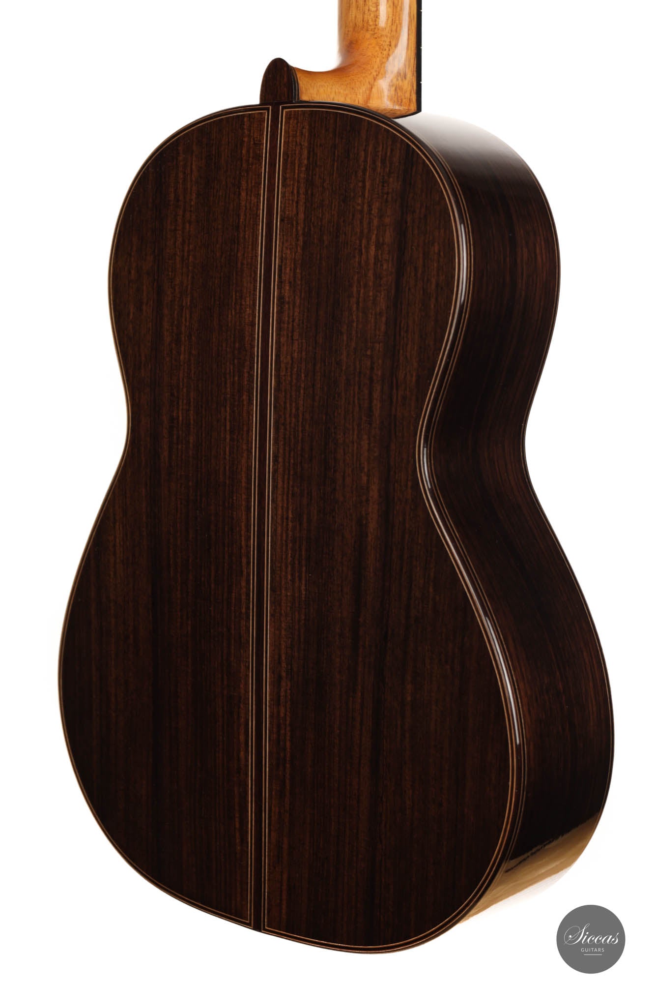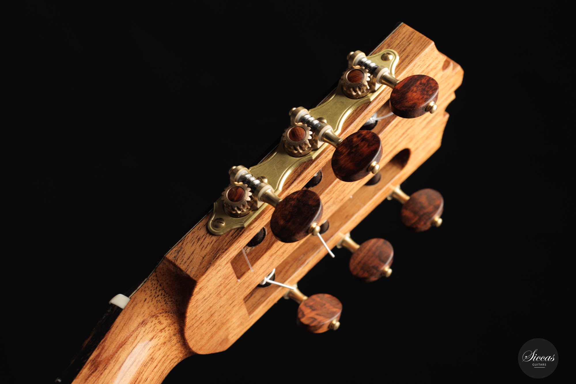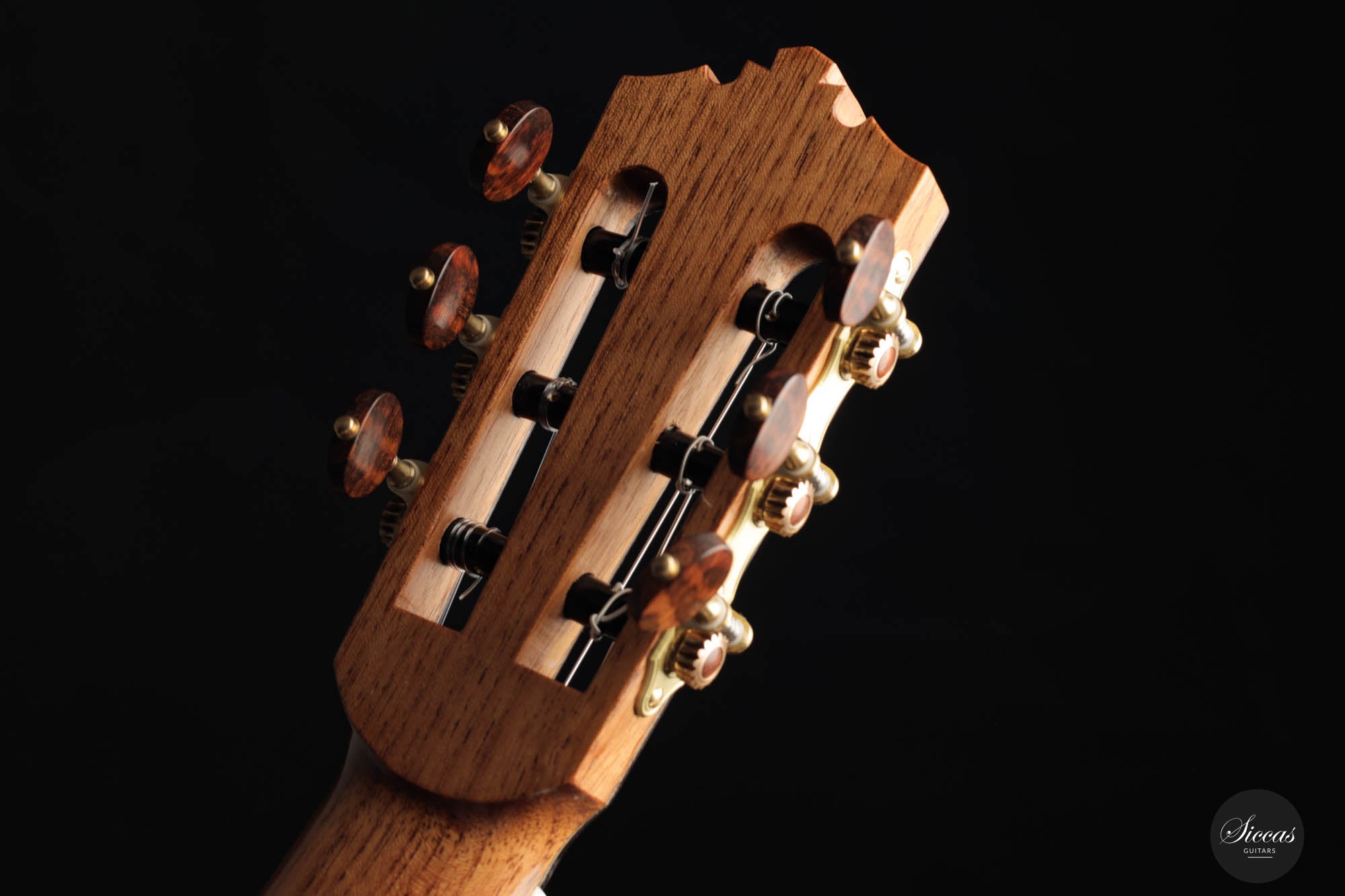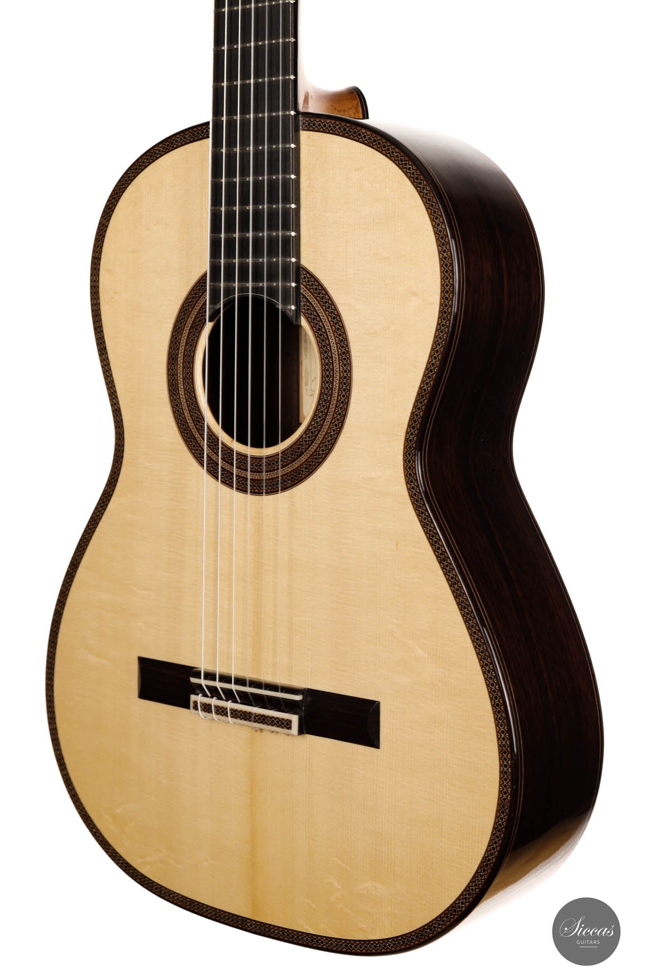 Die Gitarre von Fabio Schmidt, die auf der Roma Guitar Expo 2023 vorgestellt wird, spiegelt die Hingabe des italienischen Gitarrenbauers an sein Handwerk wider. Dieses Instrument, das sich durch sein geschmackvolles Design und hochwertige Materialien auszeichnet, zeigt Schmidts Liebe zum Detail und sein Verständnis für den Gitarrenbau. Optisch beeindruckt die Gitarre mit einem detaillierten Bauplan, der Schmidts Können unter Beweis stellt. Der Boden und die Zargen aus indischem Palisander sind mit sorgfältigen Verzierungen versehen, die der Gitarre einen Hauch von Individualität verleihen, ohne die traditionelle Ästhetik der Gitarre zu beeinträchtigen. Die für dieses Instrument ausgewählten Materialien unterstreichen Schmidts Fokus auf die Klangqualität. Die Decke aus Fichte, gepaart mit Boden und Zargen aus indischem Palisander, ermöglicht eine ausgewogene und umfassende Klangwiedergabe. Fichtenholz wird wegen seiner Langlebigkeit und seines breiten Klangspektrums bevorzugt, während indischer Palisander für seine tiefe Resonanz bekannt ist und einen vollmundigen Klang bietet. Was die Schmidt-Gitarre auszeichnet, ist ihre außergewöhnliche Reaktionsfähigkeit. Dieses Instrument ist so konzipiert, dass es effektiv auf den Anschlag des Spielers reagiert und so ein interaktives und kooperatives Musikerlebnis ermöglicht. Diese leichte Spielbarkeit verbessert die Fähigkeit des Musikers, seine musikalischen Ideen zu vermitteln, und macht die Gitarre zu einem Instrument und einem ausdrucksstarken Werkzeug für die Kunst. Zusammenfassend lässt sich sagen, dass die auf der Roma Guitar Expo 2023 vorgestellte Gitarre von Fabio Schmidt ein bemerkenswertes Instrument ist, das sein handwerkliches Können und seinen durchdachten Ansatz im Gitarrenbau widerspiegelt. Durch die Kombination von ästhetisch ansprechendem Design mit sorgfältig ausgewählten Materialien und außergewöhnlicher Spielbarkeit unterstreicht Schmidts Kreation seine Hingabe an die Kunst des Gitarrenbaus.