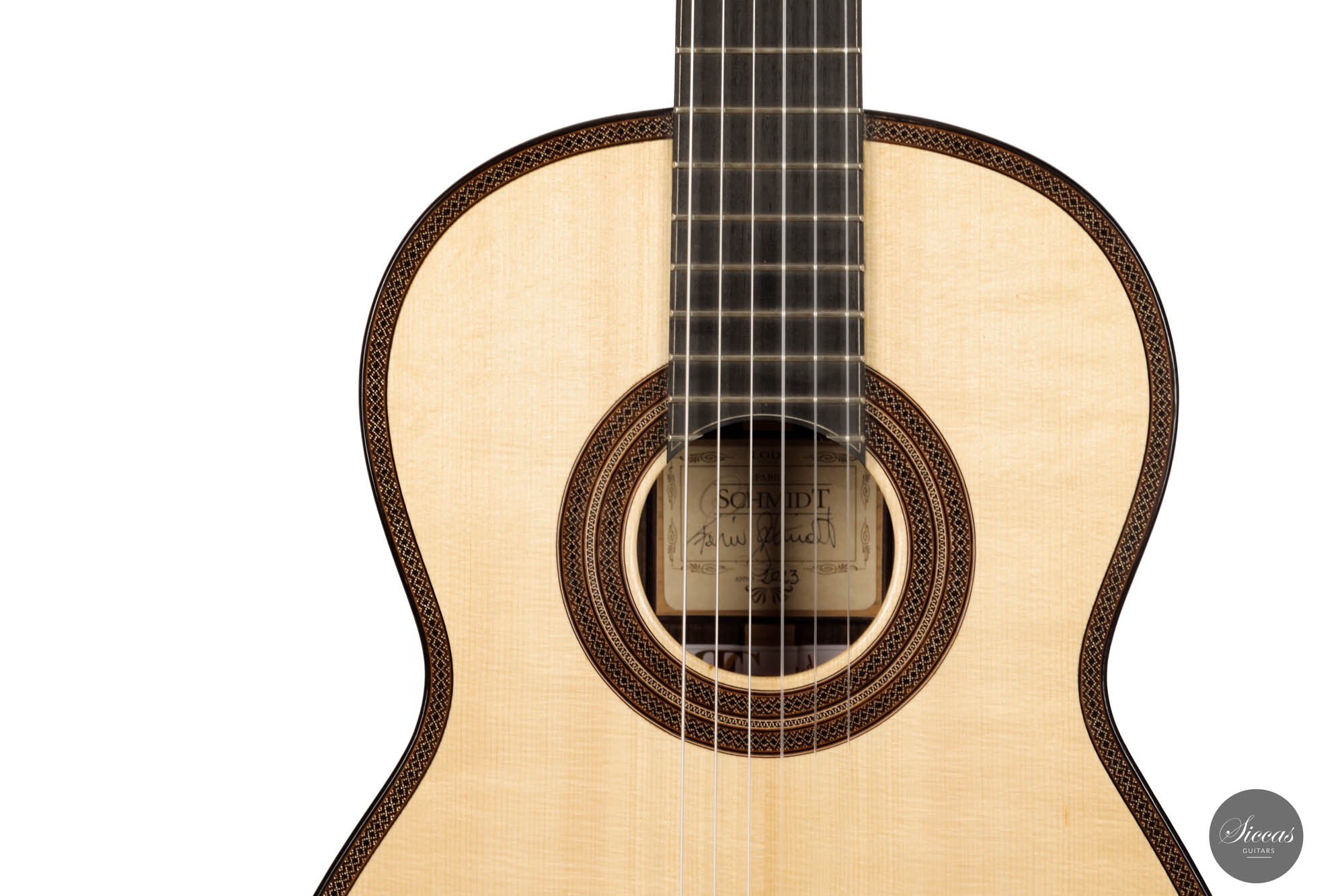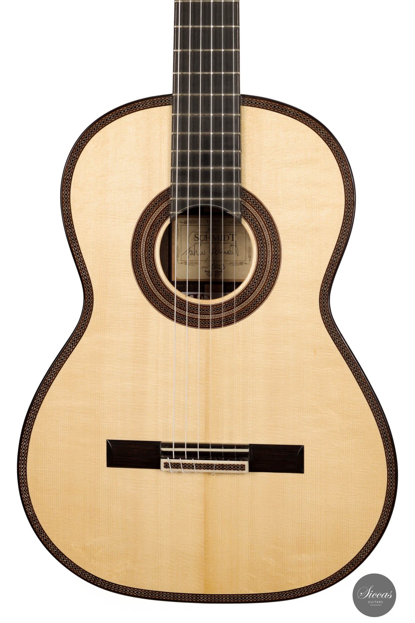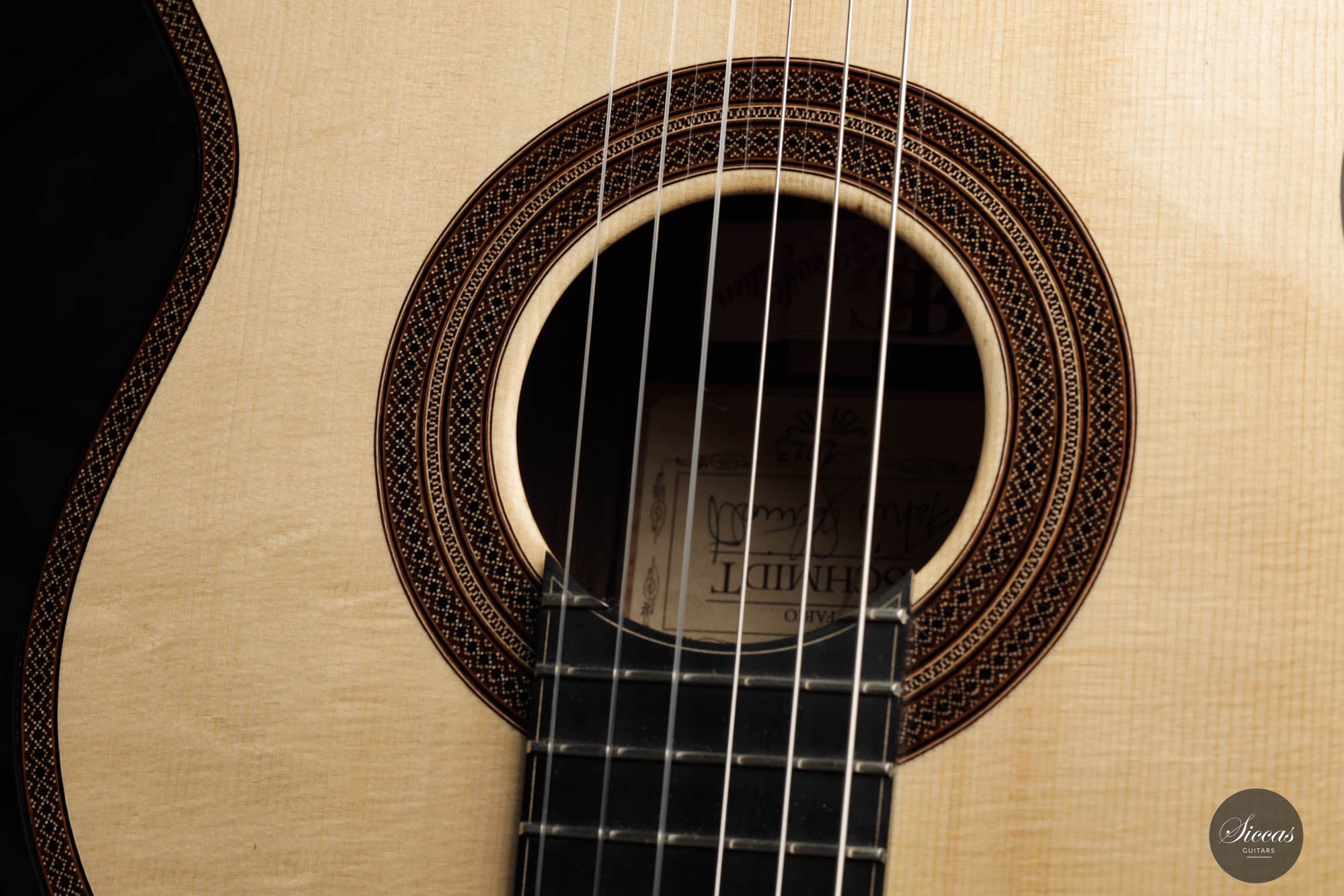 Fabio Schmidt, ein erfahrener italienischer Gitarrenbauer, begann seine Reise in den Gitarrenbau, als er sich im Studienjahr 2004/2005 an der Civica Scuola di Liuteria in Mailand einschrieb. Unter der Anleitung der berühmten Meister Aldo Illotta, Lorenzo Lippi und Gabriele Negri eignete sich Schmidt unschätzbares Wissen an und verfeinerte sein Handwerk. Im Jahr 2007 begann er ein einjähriges Praktikum bei Gitarrenbaumeister Roberto De Miranda, eine berufliche Beziehung, die bis heute andauert. Diese Zeit war für Schmidt von entscheidender Bedeutung, denn sie ermöglichte es ihm, die Feinheiten des Gitarrenbaus direkt unter der Anleitung eines Branchenexperten zu vertiefen. Stets bestrebt, sein Handwerk zu verbessern, besuchte Schmidt zahlreiche Seminare, die von Branchenveteranen wie Tiziano Rizzi, Enrico Bottelli und Roberto De Miranda geleitet wurden. Diese Erfahrungen haben zweifelsohne seinen Blickwinkel auf den Gitarrenbau erweitert und seine Fähigkeiten weiterentwickelt. Seit 2008 nimmt Schmidt regelmäßig an zahlreichen Festivals und Lutherie-Ausstellungen in ganz Italien teil, um seine exquisite Handwerkskunst zu präsentieren und einen Beitrag zur reichen Gitarrenbautradition des Landes zu leisten. Im Laufe seiner Karriere hat Schmidt in verschiedenen italienischen Regionen gearbeitet, darunter die Lombardei, Apulien und das Piemont. An jedem Ort hat er eng mit hervorragenden lokalen Gitarristen zusammengearbeitet und so ein reichhaltiges berufliches und kulturelles Netzwerk gewoben, das sein Verständnis für die vielfältigen musikalischen Landschaften Italiens erweitert hat. Schmidt lebt und arbeitet derzeit in Lodi, wo er weiterhin außergewöhnliche Gitarren fertigt, die seine große Erfahrung, sein fundiertes Wissen und die vielfältigen Einflüsse widerspiegeln, die er auf seiner Reise als Gitarrenbauer gesammelt hat. Seine Geschichte ist ein Zeugnis für das Streben nach meisterhafter Gitarrenbaukunst.