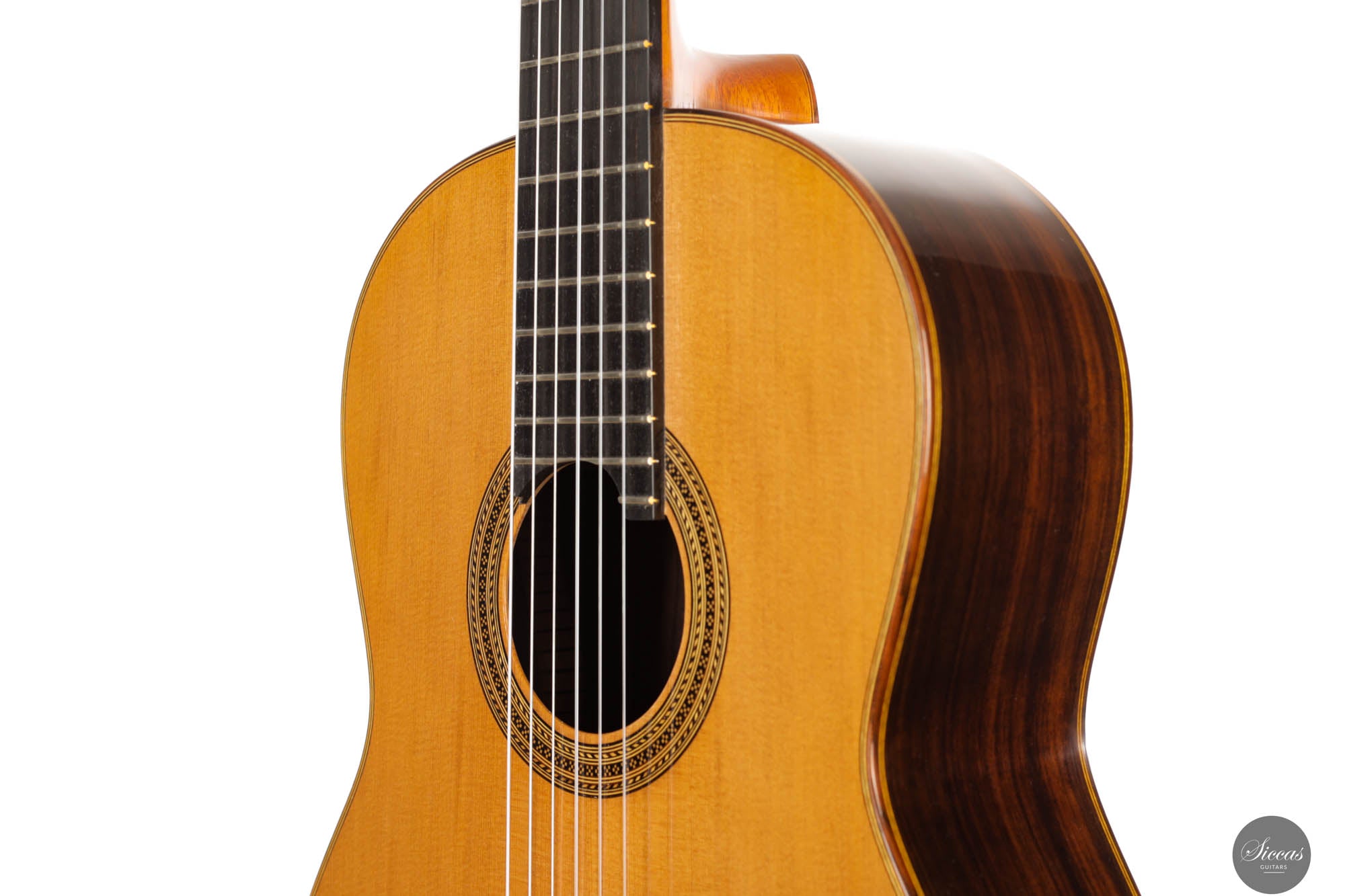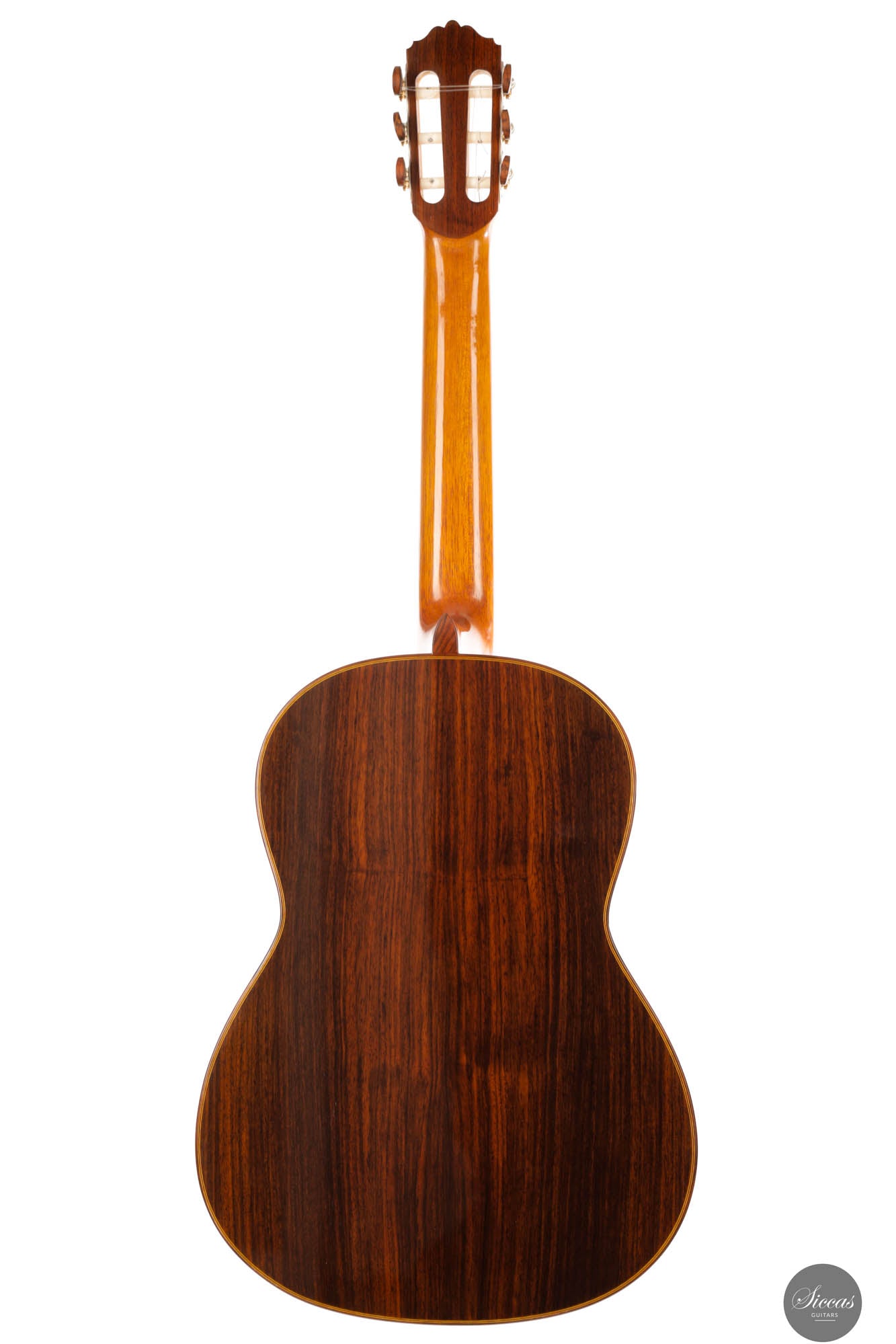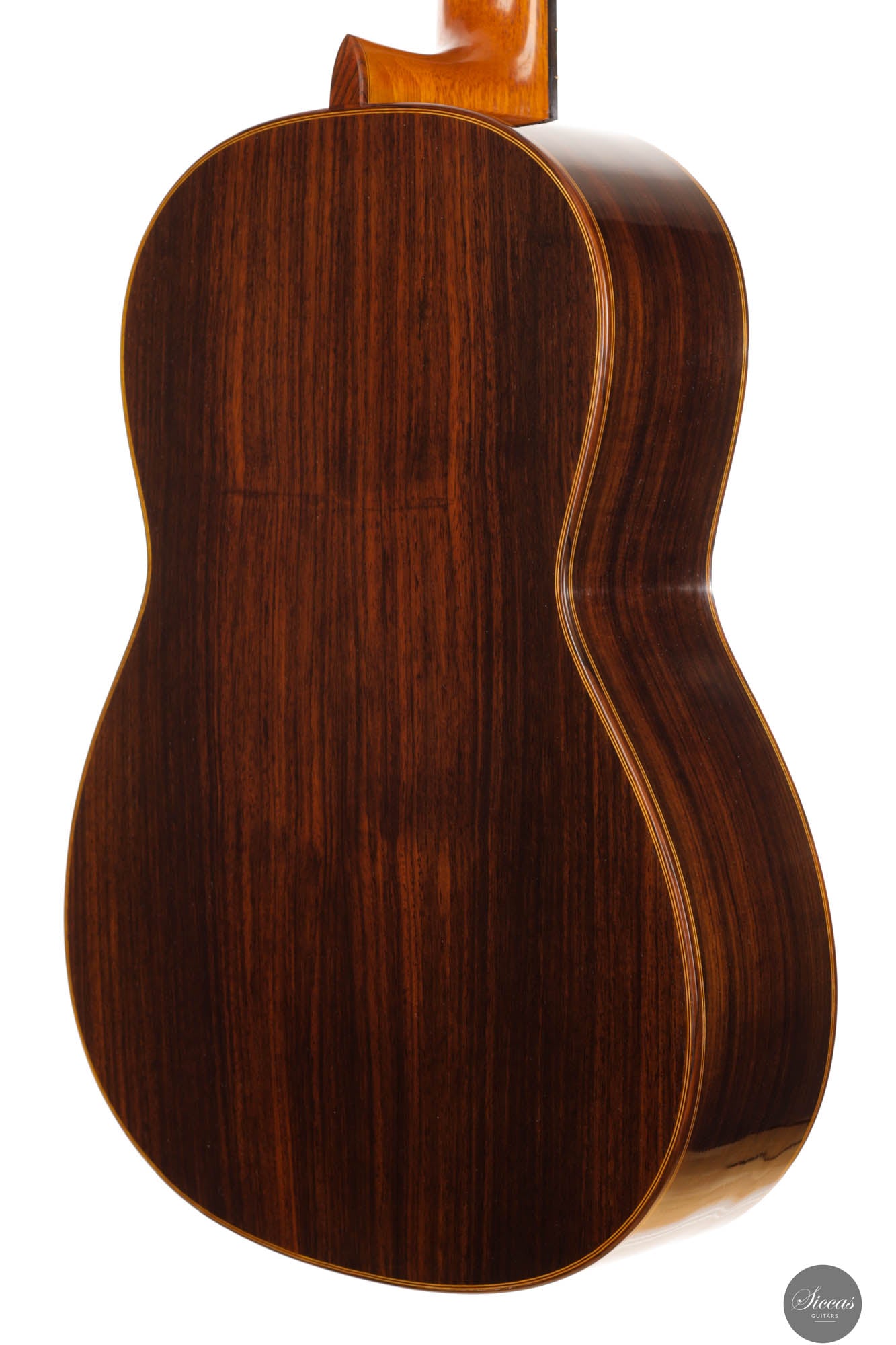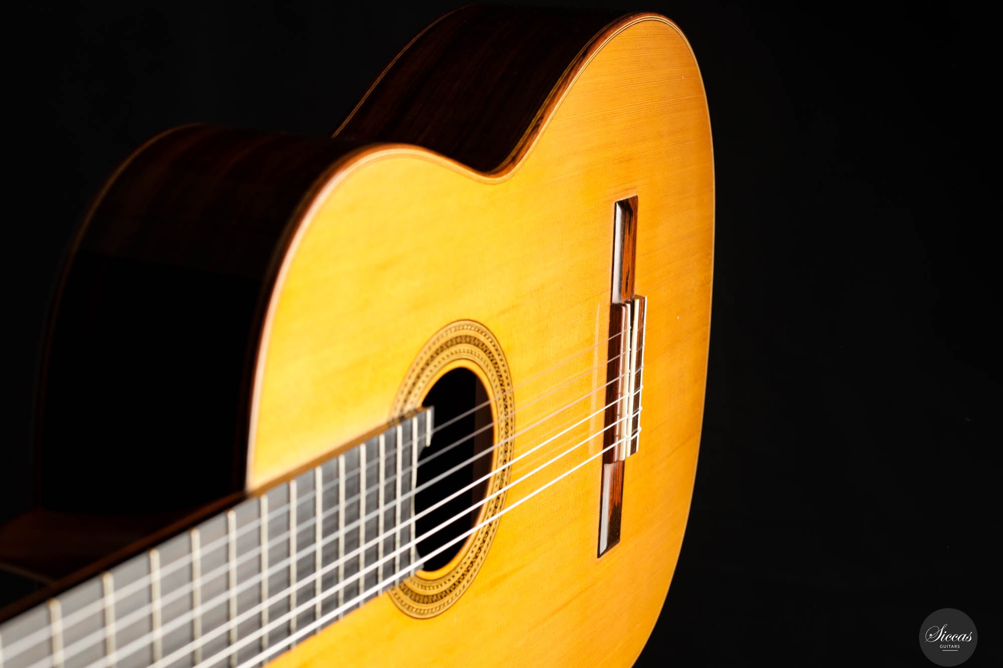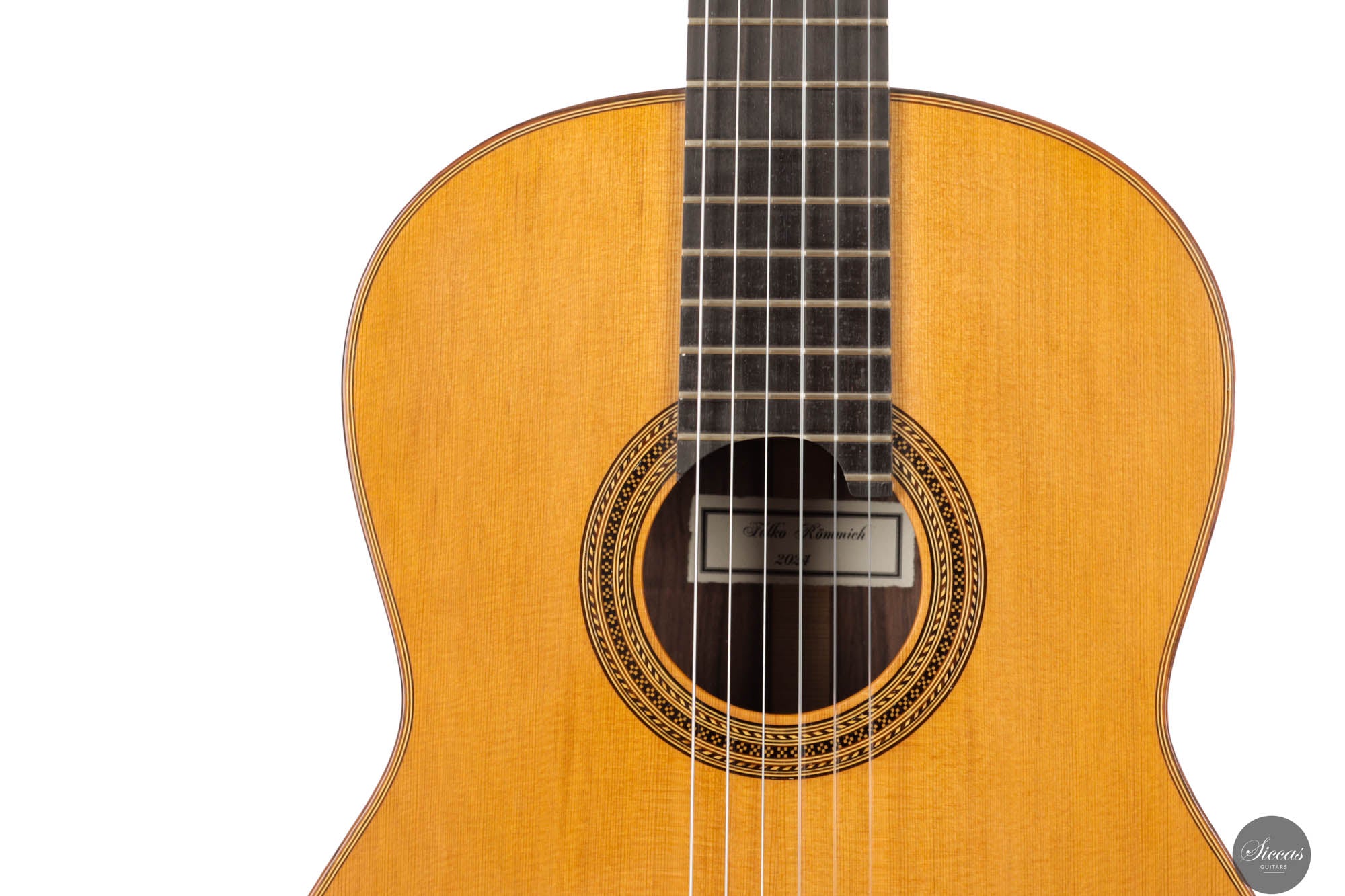 Die 2024er Falko Römmich Gitarre, direkt aus der renommierten Römmich-Werkstatt kommend, ist ein Zeugnis für die Fortführung und Evolution einer reichen Familientradition im Gitarrenbau. Falko Römmich, der die Bauweisen und Klangphilosophie seines Vaters übernommen hat, hat eine Gitarre geschaffen, die nicht nur wunderschön klingt, sondern auch das Wesen des klassischen Gitarrenbaus verkörpert. Die Zedern-Schalldecke dieses Instruments gewährleistet eine warme Klangqualität und außergewöhnliche Ansprechbarkeit, ein Markenzeichen für Römmichs akribische Aufmerksamkeit für akustische Details. Ergänzt durch ein Set aus dunkel schokoladenfarbenem indischen Palisander, besticht die Gitarre auch durch eine elegante Ästhetik. Falkos Hintergrund als ehemaliger Uhrmacher spiegelt sich in seiner außergewöhnlichen Liebe zum Detail wider, was diese Gitarre nicht nur zu einem Instrument, sondern zu einem Kunstwerk macht. Mit ihrem enormen Volumen und ihrer leichten Bespielbarkeit eignet sich diese Gitarre besonders gut für Konzertinterpreten und Wettbewerber und bietet einen zuverlässigen und inspirierenden Begleiter für jede musikalische Reise.