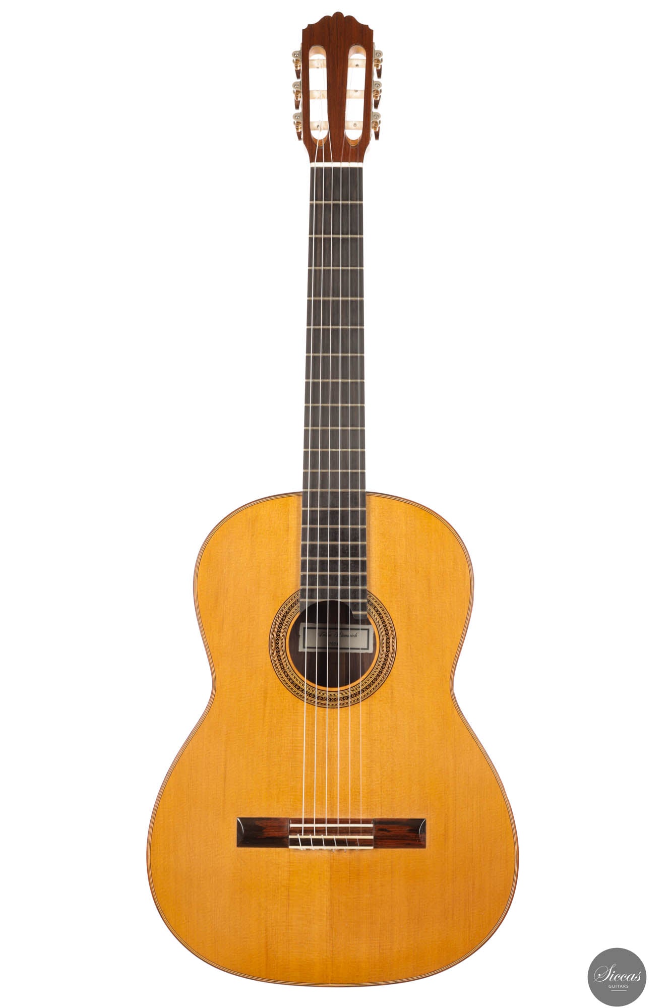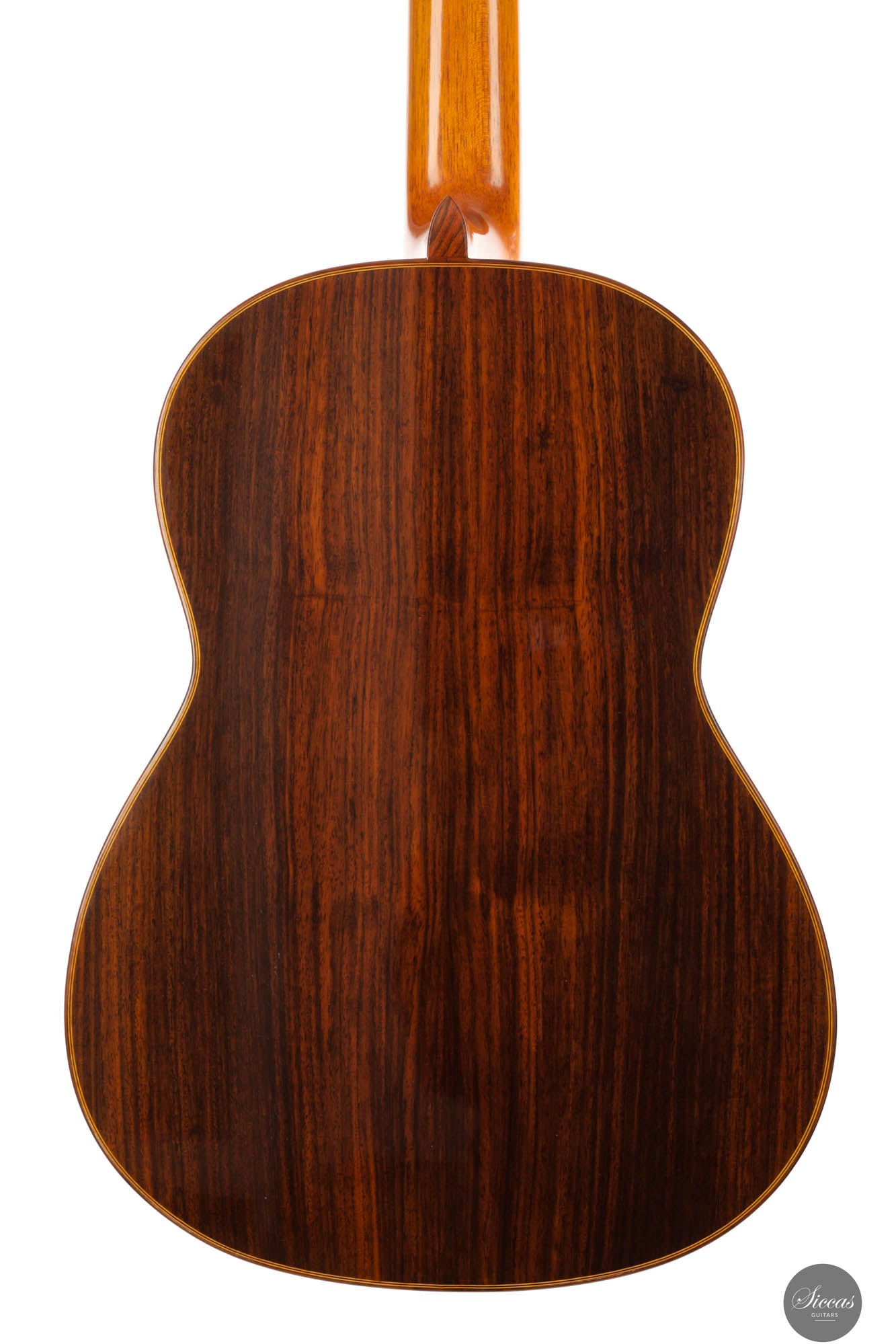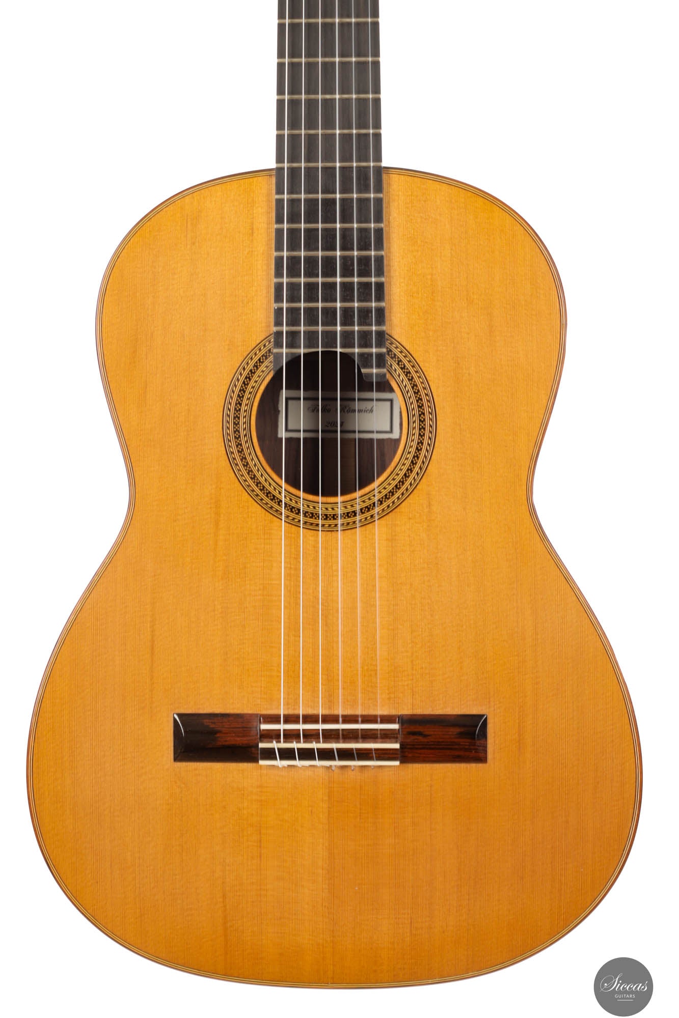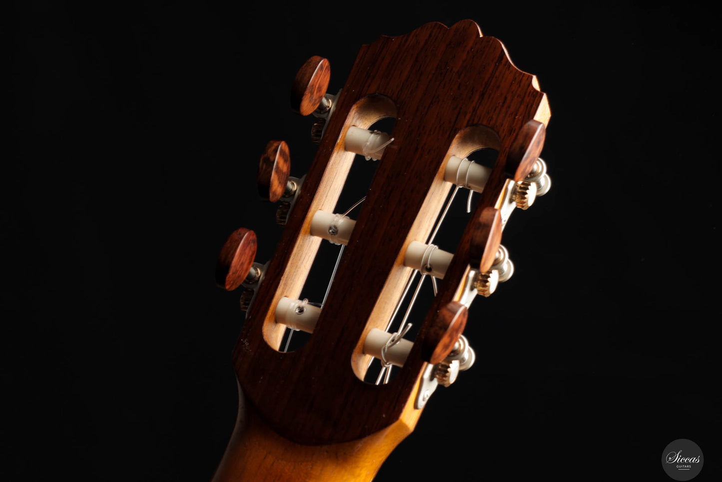 Die 2024er Falko Römmich Gitarre, direkt aus der renommierten Römmich-Werkstatt kommend, ist ein Zeugnis für die Fortführung und Evolution einer reichen Familientradition im Gitarrenbau. Falko Römmich, der die Bauweisen und Klangphilosophie seines Vaters übernommen hat, hat eine Gitarre geschaffen, die nicht nur wunderschön klingt, sondern auch das Wesen des klassischen Gitarrenbaus verkörpert. Die Zedern-Schalldecke dieses Instruments gewährleistet eine warme Klangqualität und außergewöhnliche Ansprechbarkeit, ein Markenzeichen für Römmichs akribische Aufmerksamkeit für akustische Details. Ergänzt durch ein Set aus dunkel schokoladenfarbenem indischen Palisander, besticht die Gitarre auch durch eine elegante Ästhetik. Falkos Hintergrund als ehemaliger Uhrmacher spiegelt sich in seiner außergewöhnlichen Liebe zum Detail wider, was diese Gitarre nicht nur zu einem Instrument, sondern zu einem Kunstwerk macht. Mit ihrem enormen Volumen und ihrer leichten Bespielbarkeit eignet sich diese Gitarre besonders gut für Konzertinterpreten und Wettbewerber und bietet einen zuverlässigen und inspirierenden Begleiter für jede musikalische Reise.