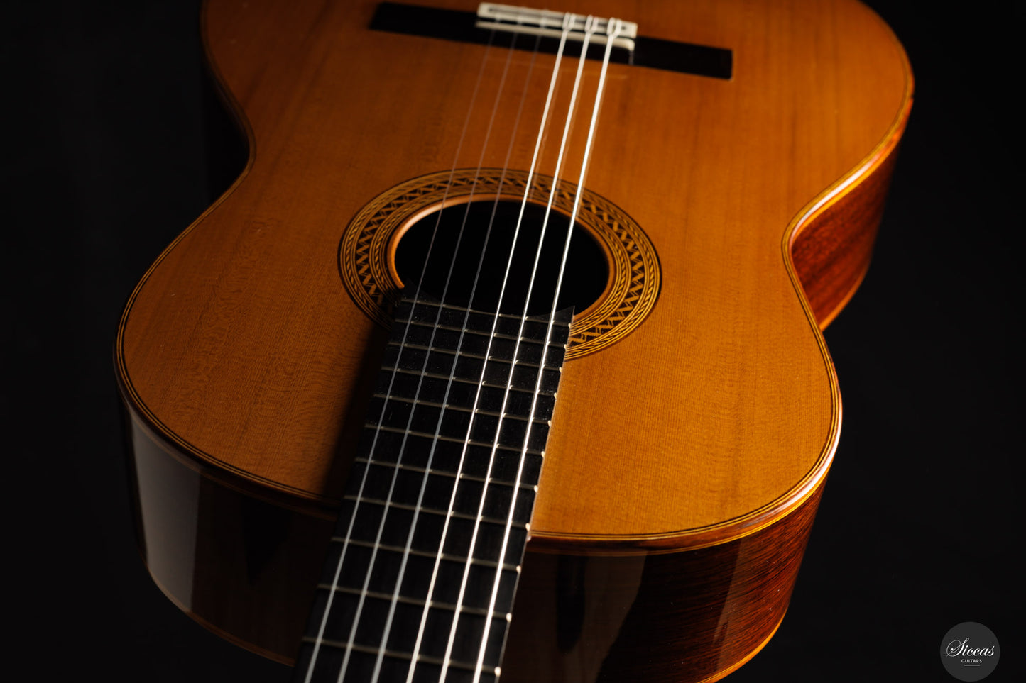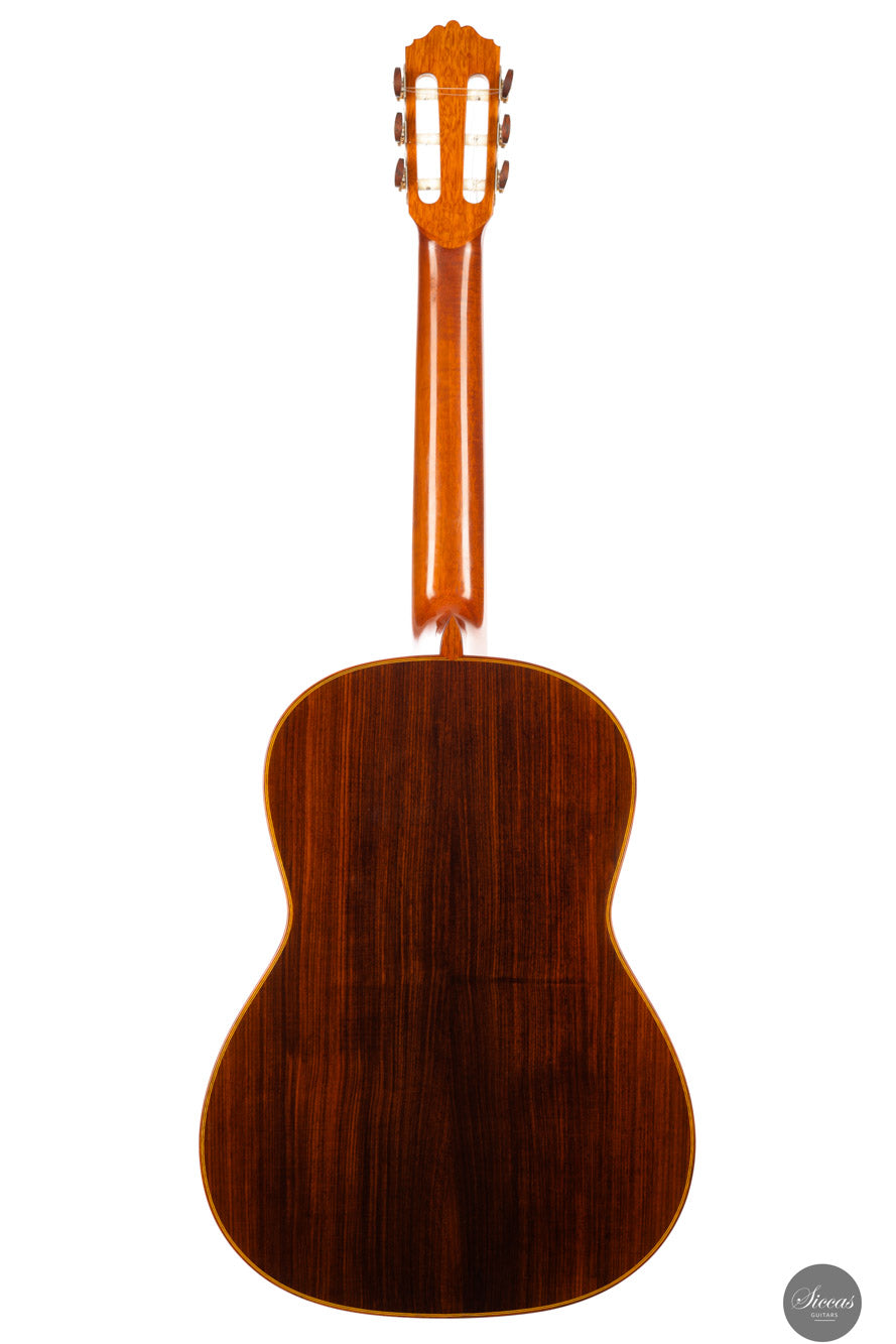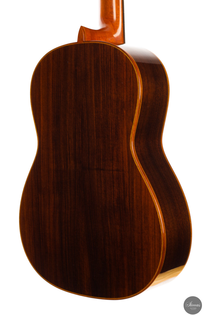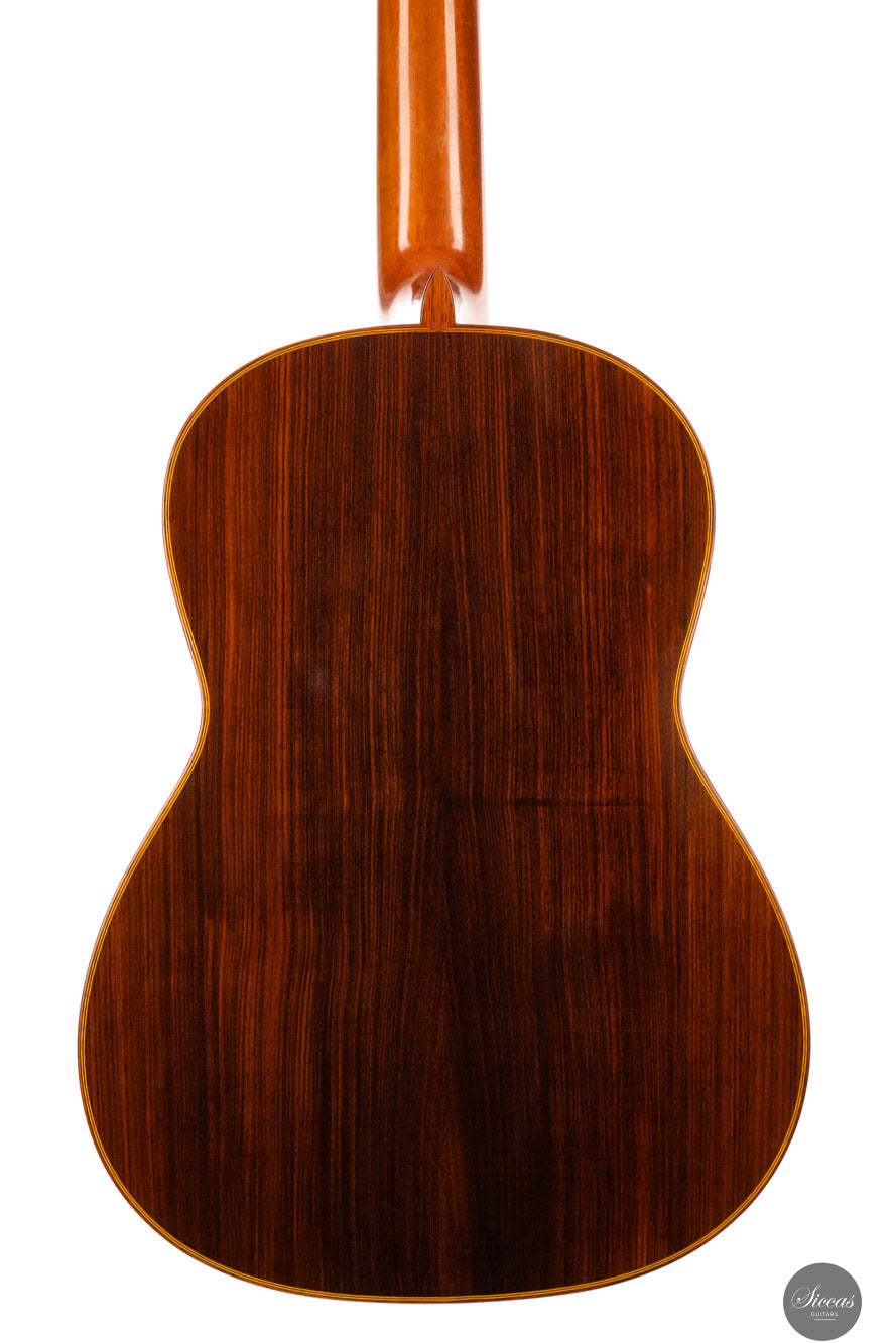 Die Falko Römmich Gitarre 2025 ist ein herausragendes Beispiel moderner Gitarrenbaukunst, die fest in einer traditionellen Familienlinie verwurzelt ist. Diese Gitarre stammt direkt aus der renommierten Werkstatt Römmich und verkörpert die gelungene Fortführung und Weiterentwicklung des handwerklichen Erbes seines Vaters. Falko Römmich bleibt dabei den Bauprinzipien und der Klangphilosophie seines Vaters treu und schafft ein Instrument, das sowohl klanglich als auch ästhetisch auf höchstem Niveau überzeugt. Die Decke besteht aus kanadischem Zedernholz und bietet eine warme Klangfarbe, außergewöhnliche Ansprache und große Ausdruckskraft. Die Zargen und der Boden aus indischem Palisander in dunkler Schokoladenfarbe verleihen dem Instrument nicht nur eine edle Optik, sondern unterstützen auch seine klangliche Tiefe. Falkos Werdegang als ehemaliger Uhrmacher zeigt sich deutlich in der präzisen Verarbeitung und der Liebe zum Detail. Jedes Element dieser Gitarre – von der Beleistung bis zum Finish – ist mit höchster Sorgfalt ausgeführt und macht sie zu weit mehr als nur einem Musikinstrument – sie ist ein Kunstwerk. Klanglich überzeugt die Gitarre durch außergewöhnliche Leichtigkeit im Spiel, enorme Lautstärke und Projektion, was sie zur idealen Wahl für Konzertgitarristen, Wettbewerbsteilnehmer und professionelle Musiker macht, die ein ausdrucksstarkes und verlässliches Instrument suchen.