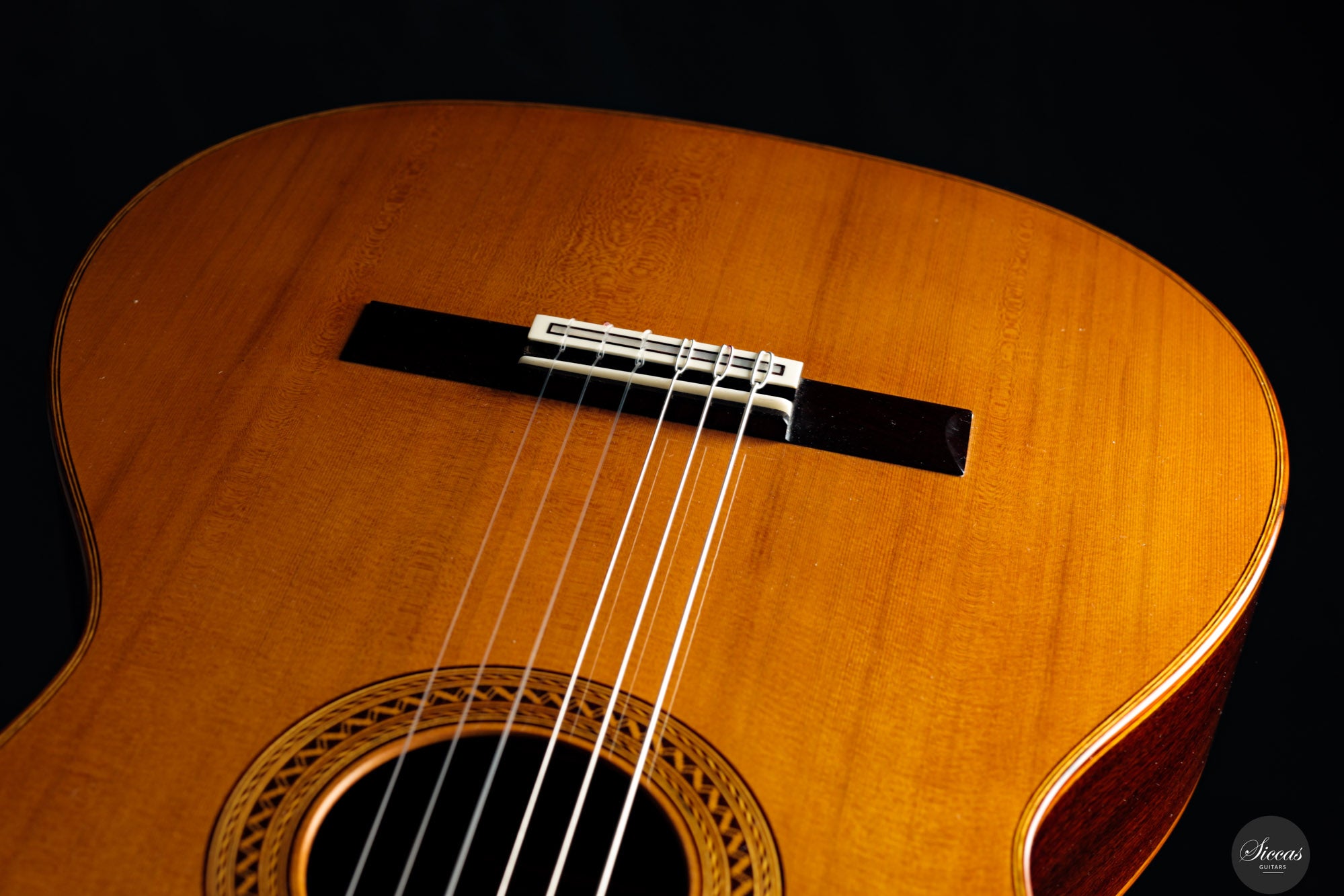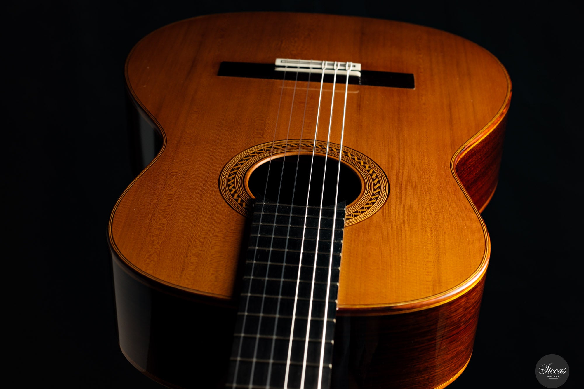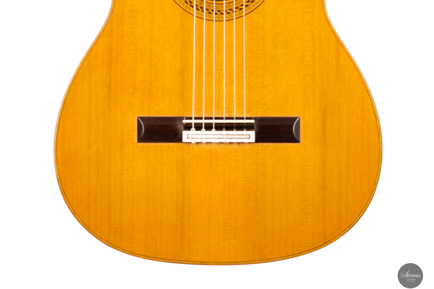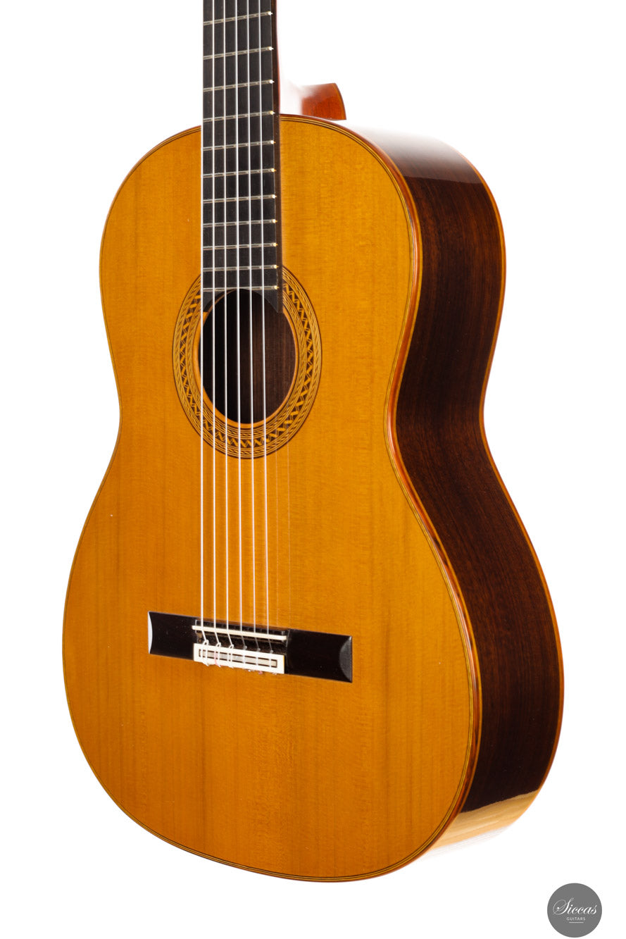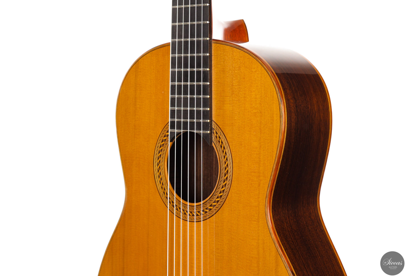 Die Falko Römmich Gitarre 2025 ist ein herausragendes Beispiel moderner Gitarrenbaukunst, die fest in einer traditionellen Familienlinie verwurzelt ist. Diese Gitarre stammt direkt aus der renommierten Werkstatt Römmich und verkörpert die gelungene Fortführung und Weiterentwicklung des handwerklichen Erbes seines Vaters. Falko Römmich bleibt dabei den Bauprinzipien und der Klangphilosophie seines Vaters treu und schafft ein Instrument, das sowohl klanglich als auch ästhetisch auf höchstem Niveau überzeugt. Die Decke besteht aus kanadischem Zedernholz und bietet eine warme Klangfarbe, außergewöhnliche Ansprache und große Ausdruckskraft. Die Zargen und der Boden aus indischem Palisander in dunkler Schokoladenfarbe verleihen dem Instrument nicht nur eine edle Optik, sondern unterstützen auch seine klangliche Tiefe. Falkos Werdegang als ehemaliger Uhrmacher zeigt sich deutlich in der präzisen Verarbeitung und der Liebe zum Detail. Jedes Element dieser Gitarre – von der Beleistung bis zum Finish – ist mit höchster Sorgfalt ausgeführt und macht sie zu weit mehr als nur einem Musikinstrument – sie ist ein Kunstwerk. Klanglich überzeugt die Gitarre durch außergewöhnliche Leichtigkeit im Spiel, enorme Lautstärke und Projektion, was sie zur idealen Wahl für Konzertgitarristen, Wettbewerbsteilnehmer und professionelle Musiker macht, die ein ausdrucksstarkes und verlässliches Instrument suchen.