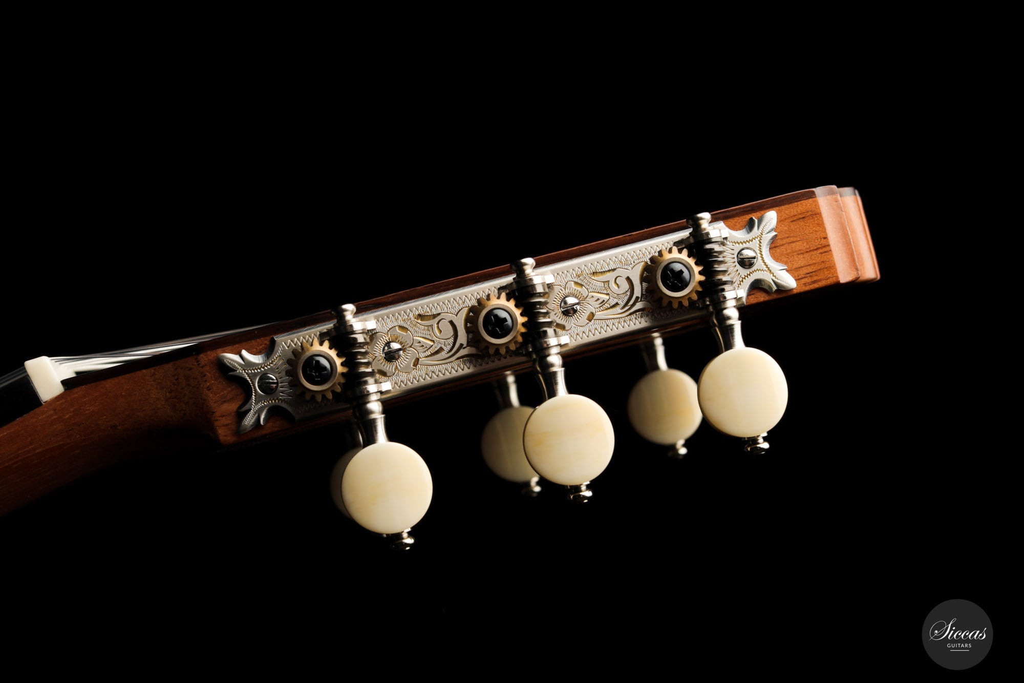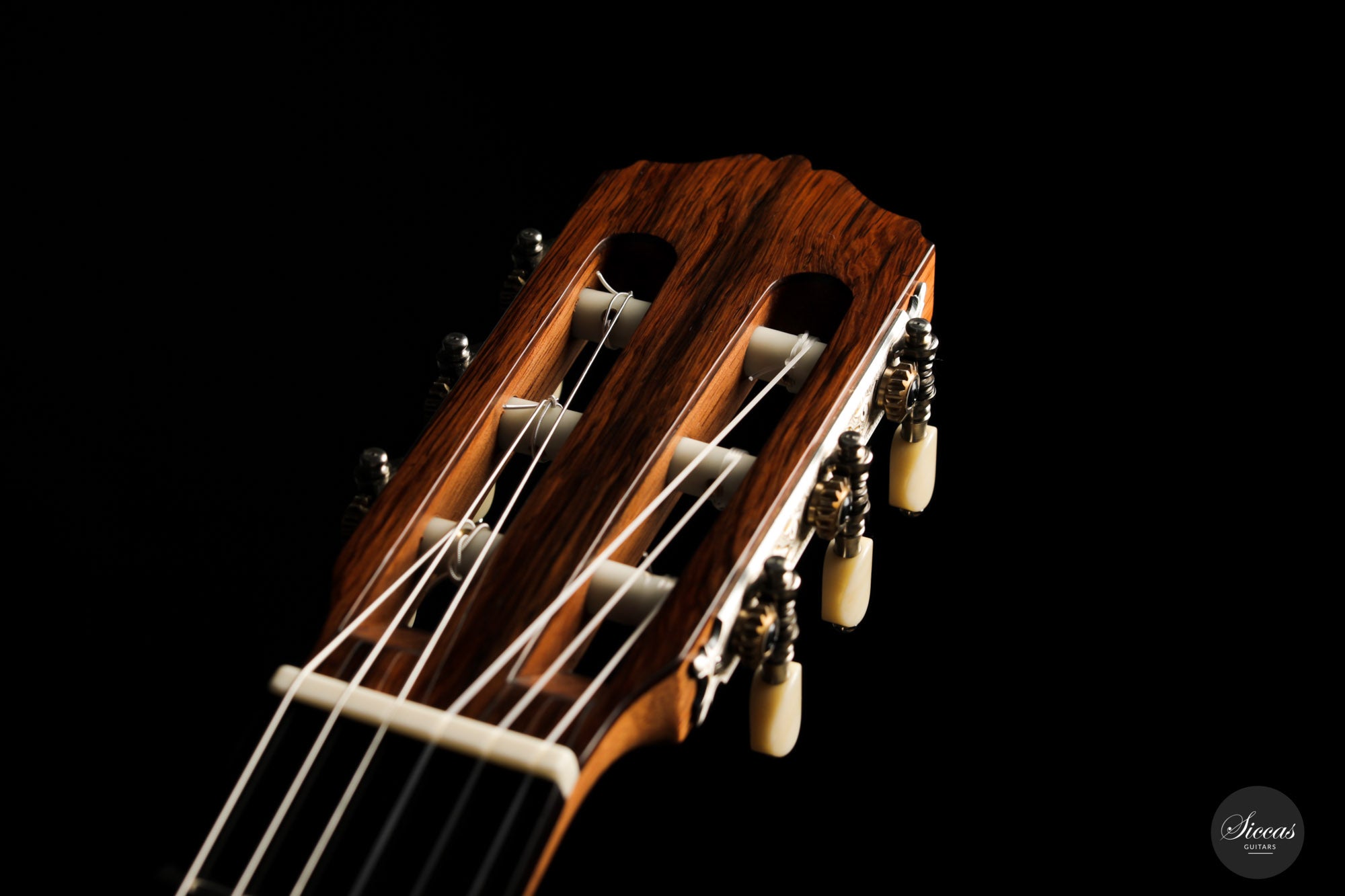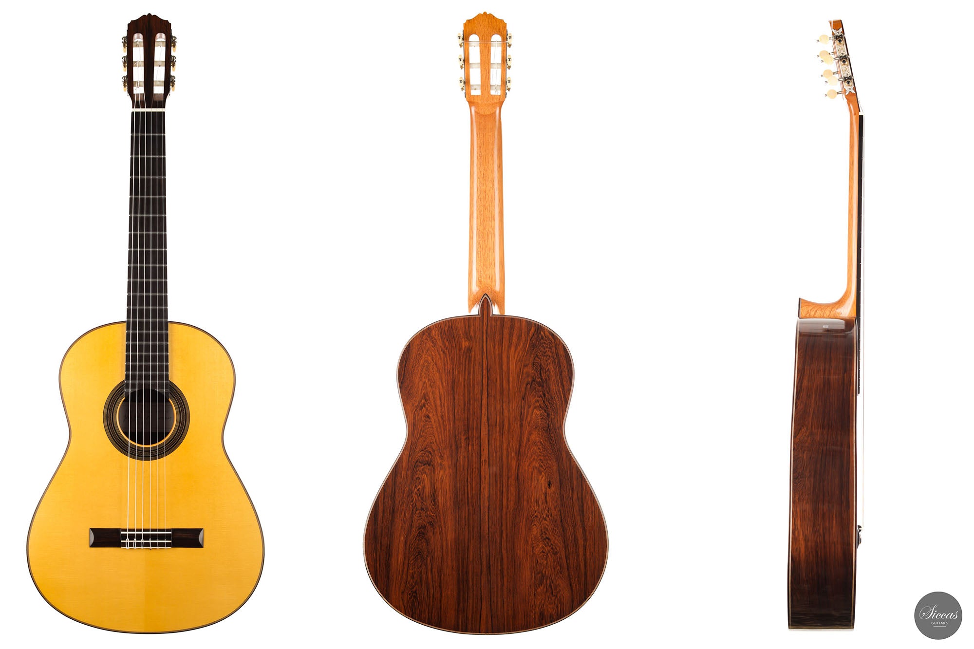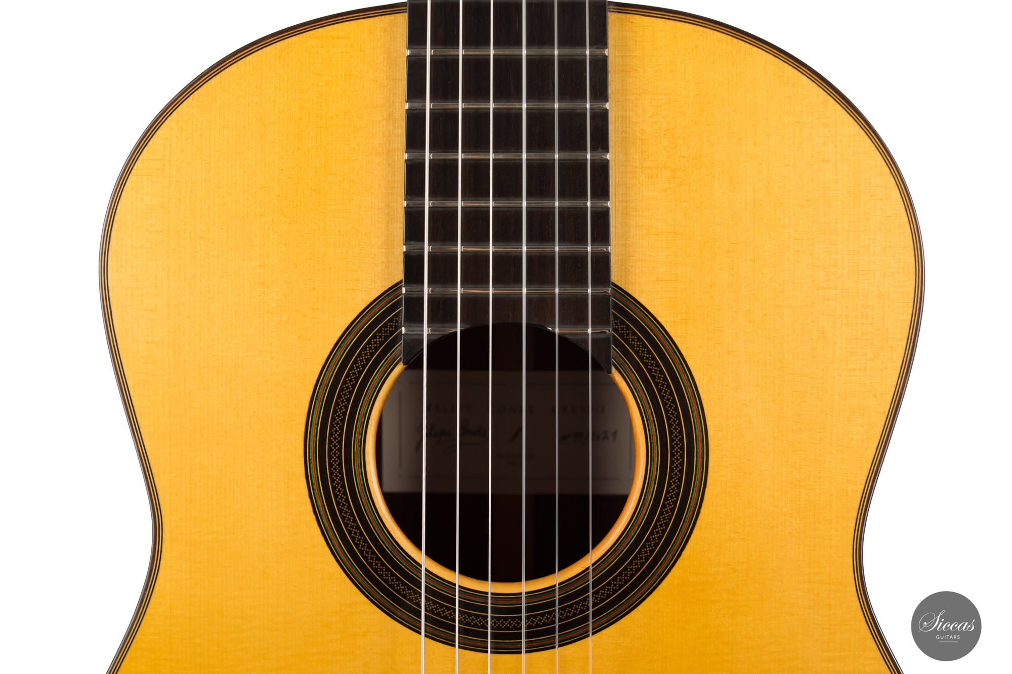 "The sobriety and elegance of Esteso Instruments are the main characteristics of this guitar genius of the XX century, and this is exactly what I tried to achieve with my work. It is made of some of our best and oldest woods. The top is made of German spruce (Picea abies) and the back and sides of Madagascar rosewood (Dalbergia baronii). The "plantilla" and bracing are an exact copy of this instrument made by Domingo Esteso in 1931 with some inlays and purflings that I created myself. The tuners are copies of the original ones and to give the instrument a vintage look, I applied a special vintage-looking shellac finish."