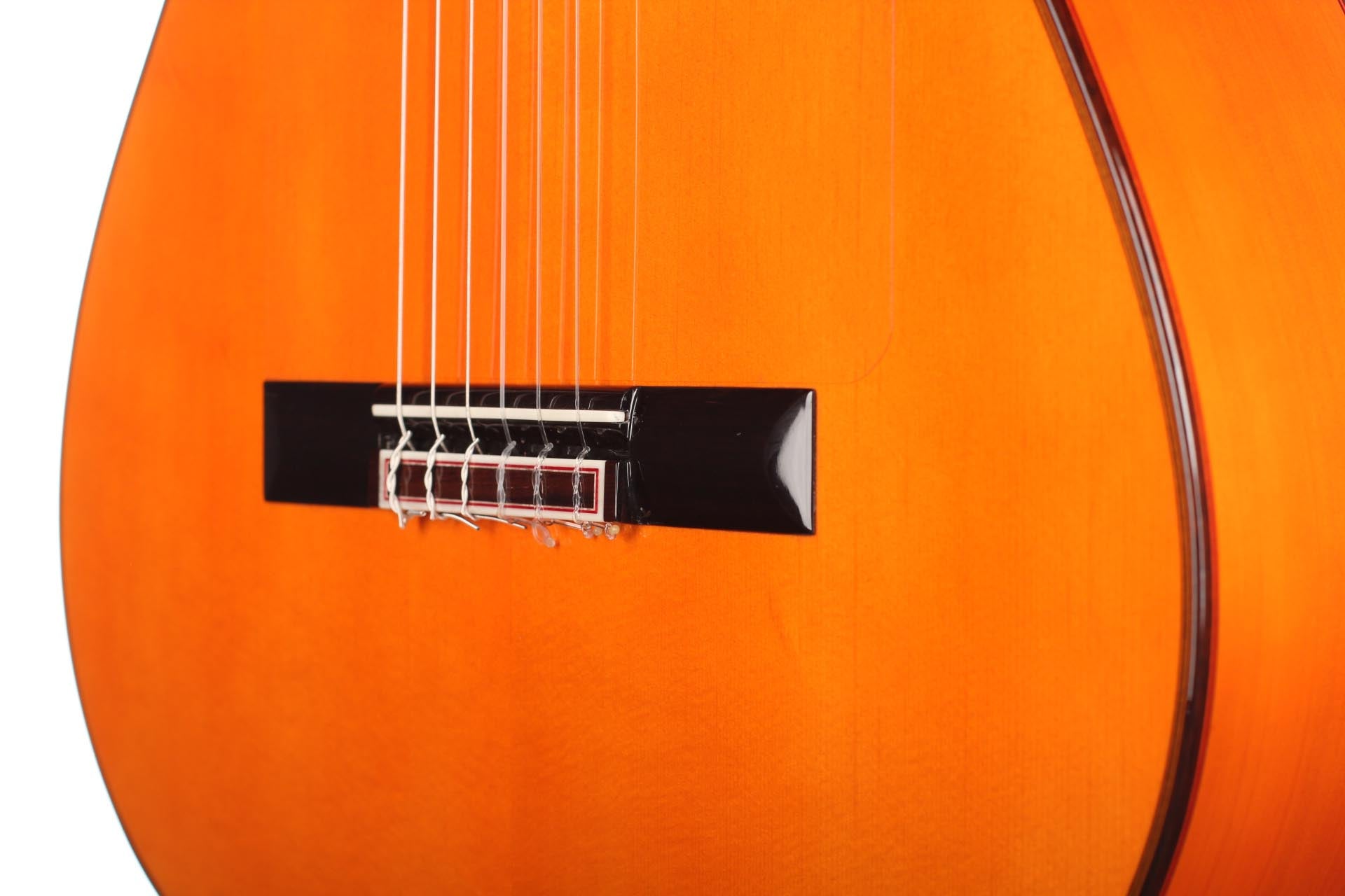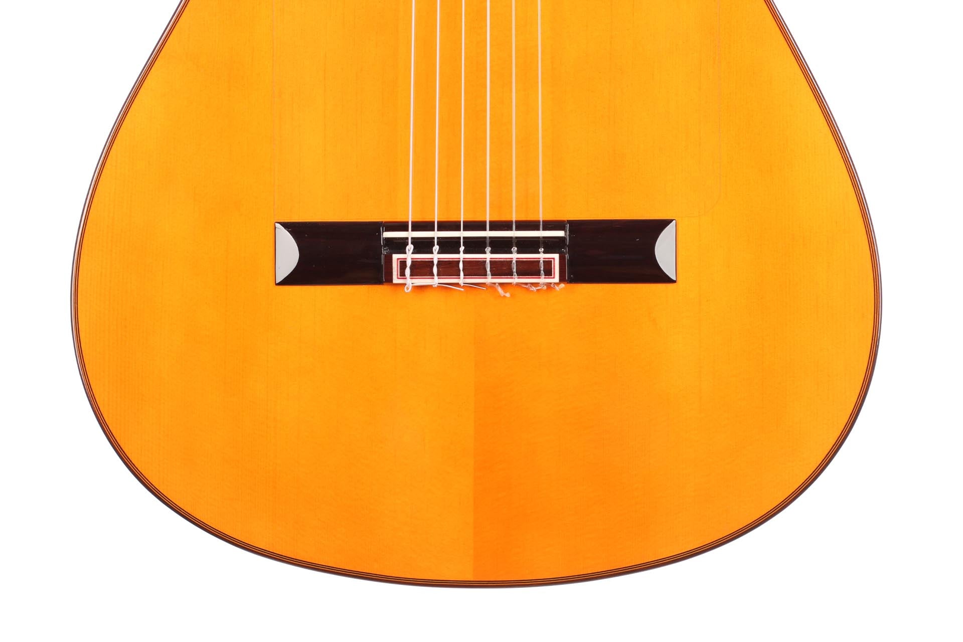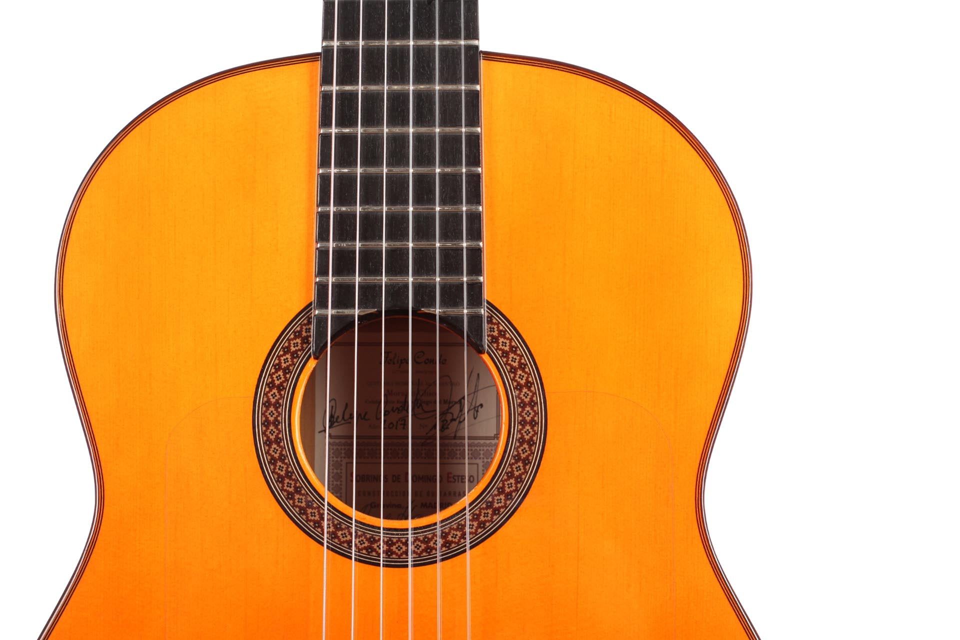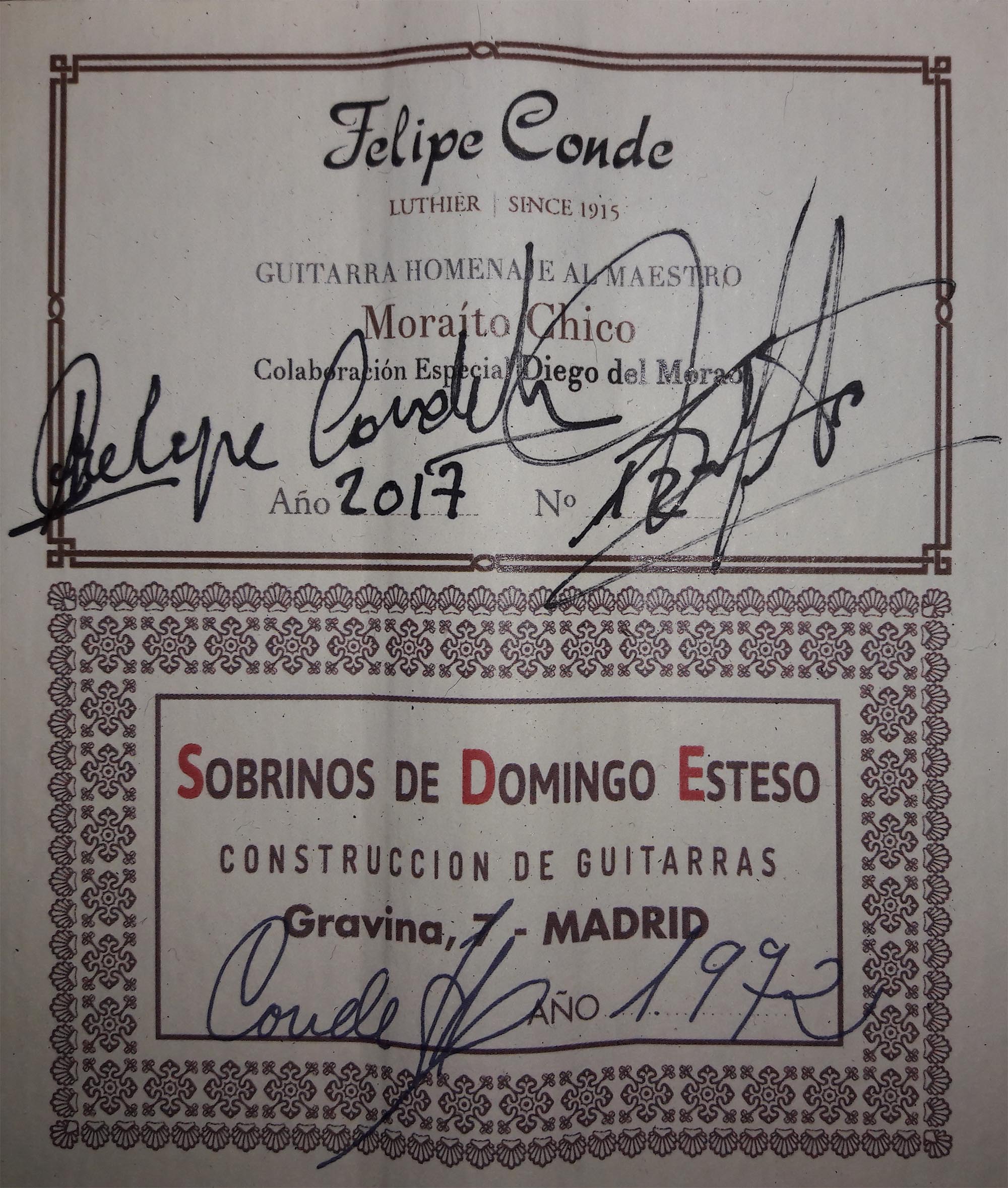 This guitar is the No. 12 of the 25 “Moraíto Chico reedición” guitars built as a special limited edition in homage to the great Master Moraíto Chico. This guitar is featuring the highest quality woods and gathering all the typical flamenco sound aspects and esthetical details. It has a brilliant sound with rhythmical percussive basses and singing complex trebles. The perfect playability and the unique quality of the sound are a guarantee of deep playing pleasure and spectacular public performances. A Conde hard-shell case is included. This guitar is Cites-free (CF).