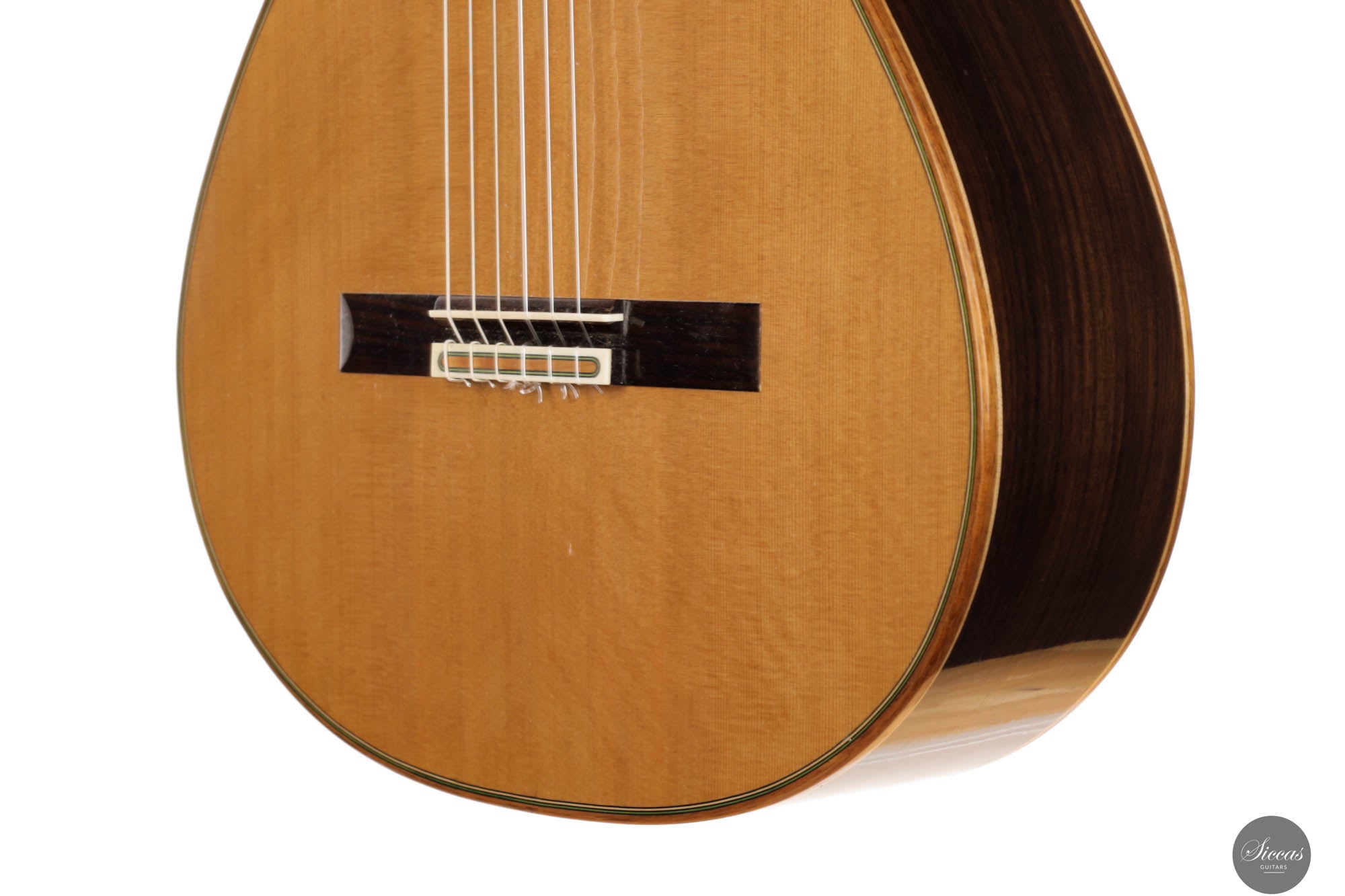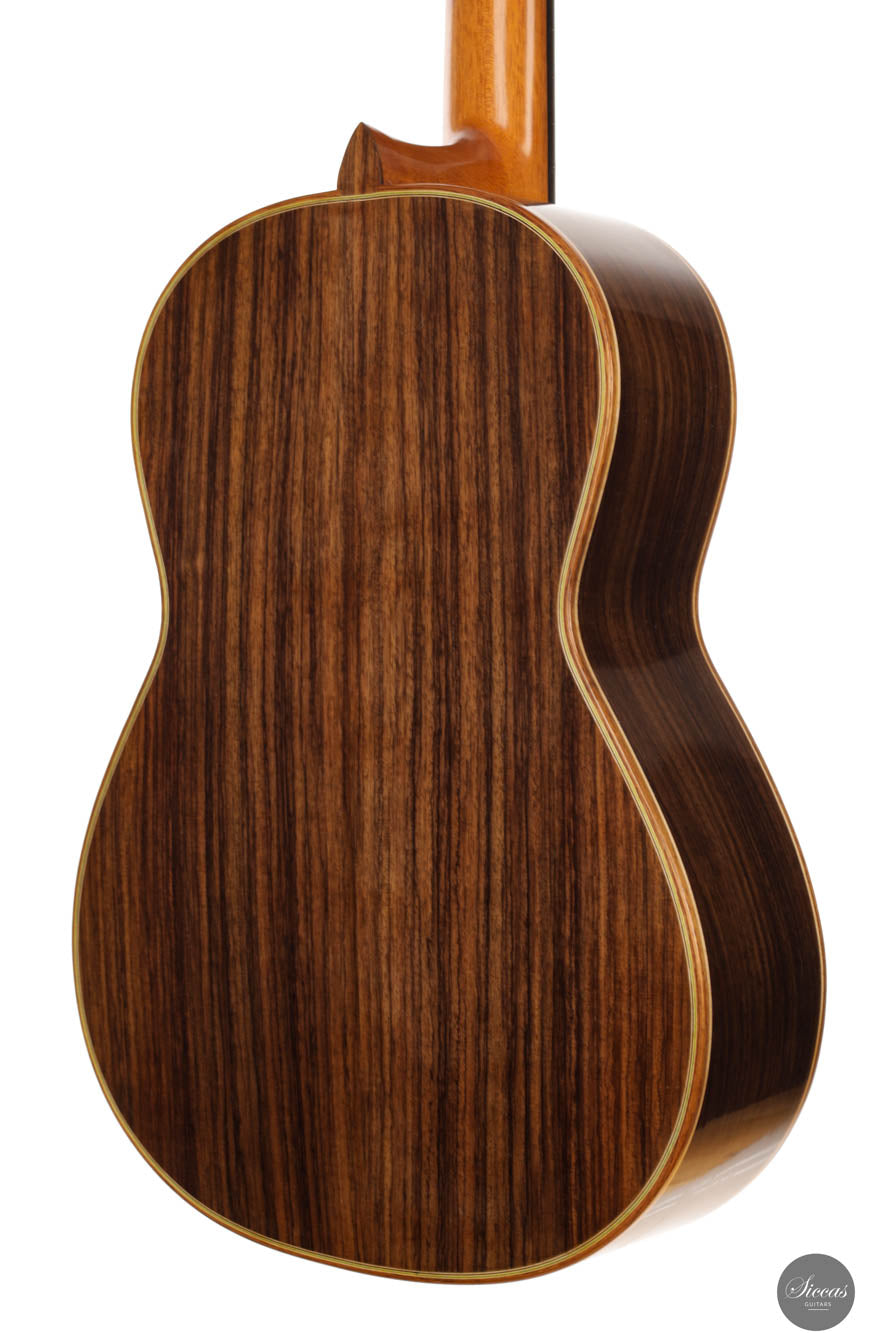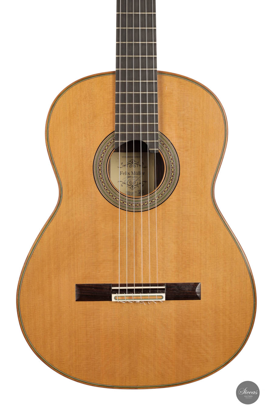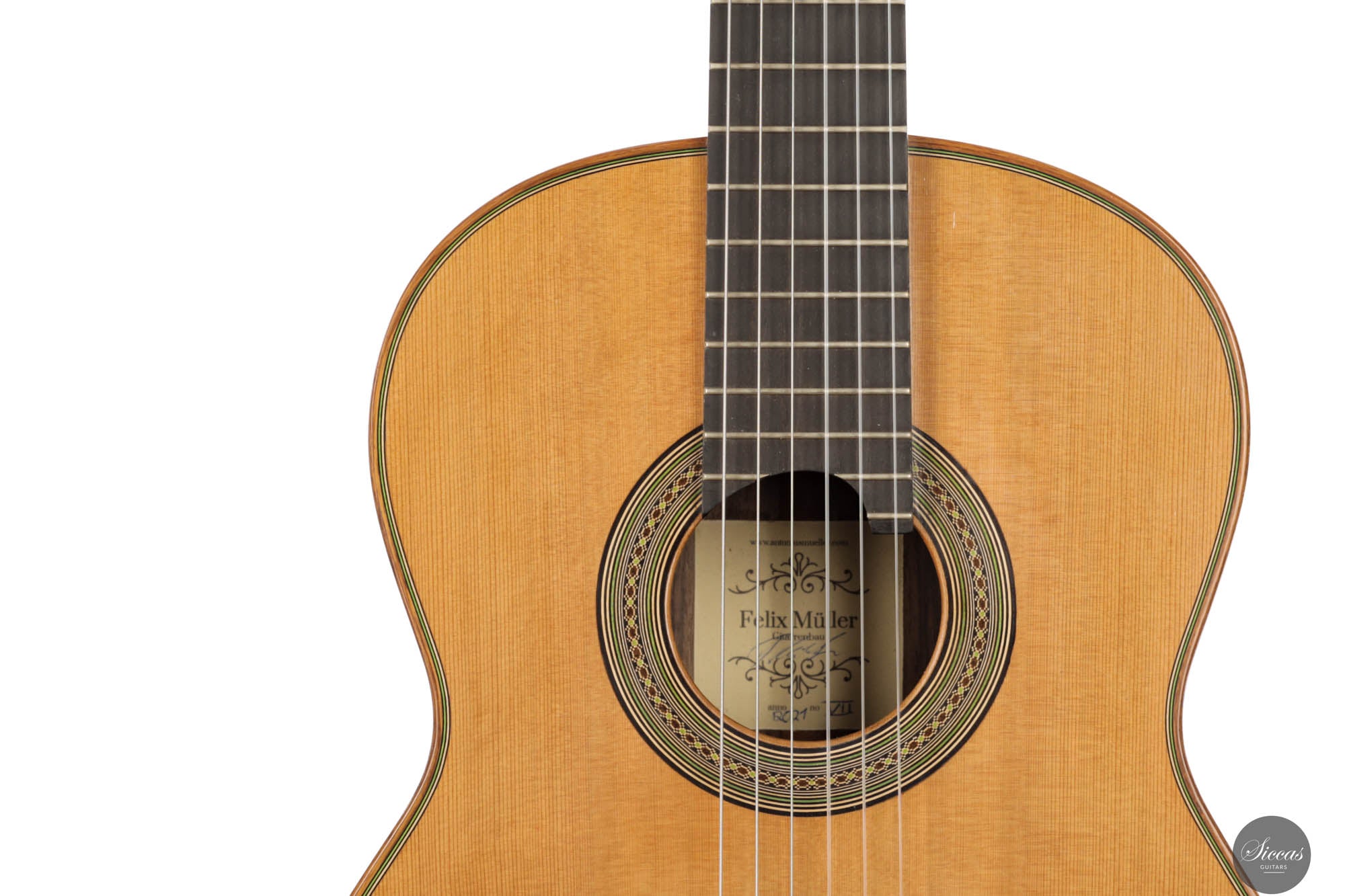 Diese Gitarre, gefertigt vom renommierten Felix Müller, steht als Zeugnis für seine Position als führende Persönlichkeit in der Welt des Double-Top-Gitarrenbaus, eine Kunst, die er unter der Anleitung seines Vaters, Antonius Müller, verfeinert hat. Felix hat die Einflüsse der Designs seines Vaters in seine eigene Arbeit integriert, während er jedem Instrument auch seinen starken persönlichen Stil aufprägt. Diese spezielle Gitarre exemplifiziert hervorragende Spielbarkeit und bietet außergewöhnlichen Komfort für sowohl die rechte als auch die linke Hand, was ein Markenzeichen von Felix' Aufmerksamkeit für das ergonomische Design seiner Gitarren ist. Das phänomenale Volumen des Instruments paart sich wunderschön mit seinem langen Sustain und orchestralen sympathischen Resonanzen, was seine lyrischen Qualitäten verstärkt. Der erzeugte Klang ist reich und raumfüllend, charakterisiert durch einen warmen, dunklen Klang und eine ausgezeichnete Trennung der Stimmen, was eine ausgewogene Ausgabe über alle Frequenzen sicherstellt.