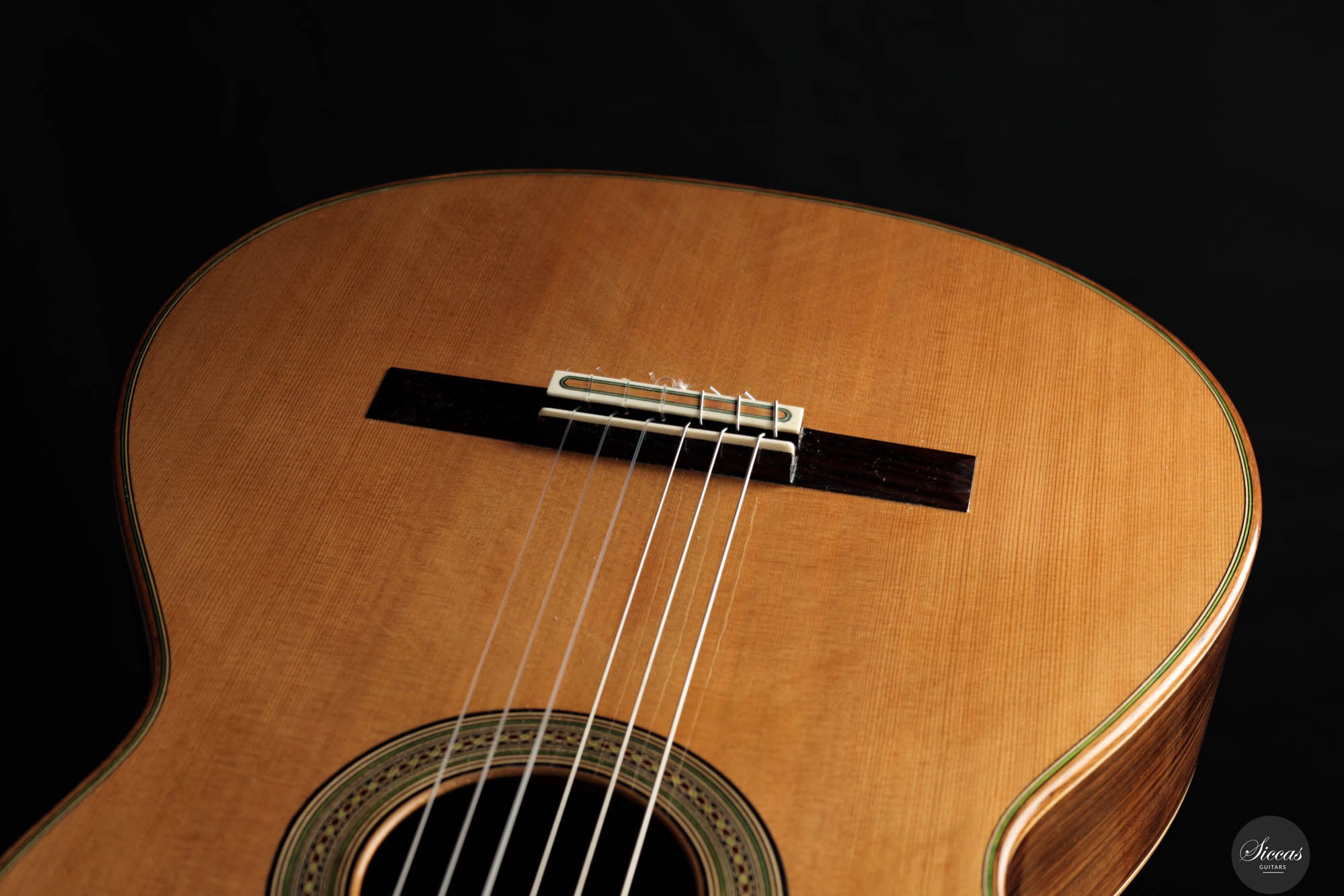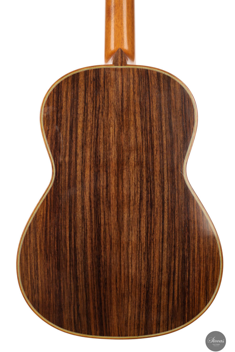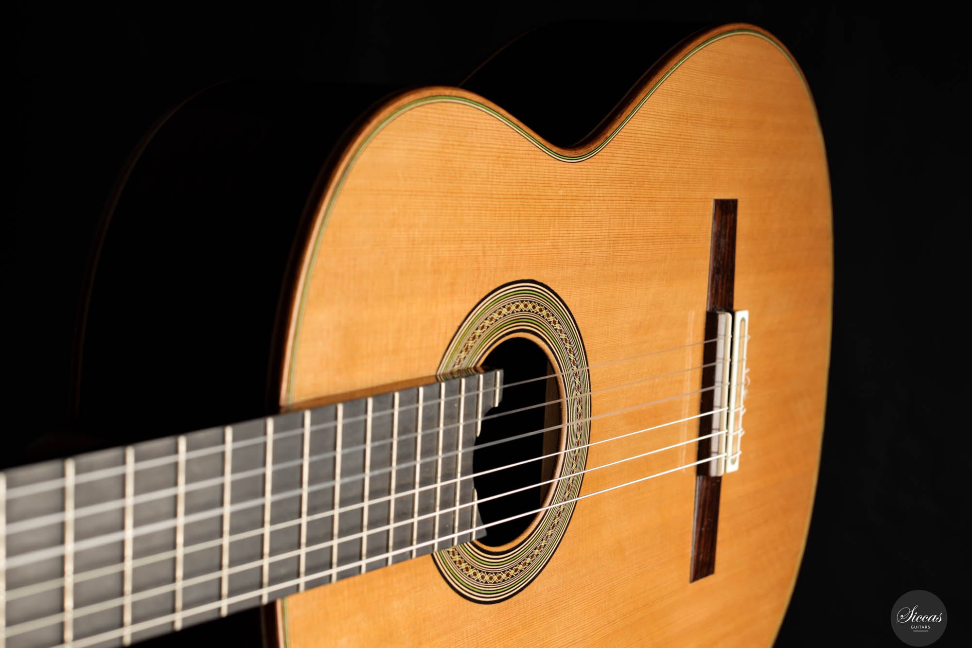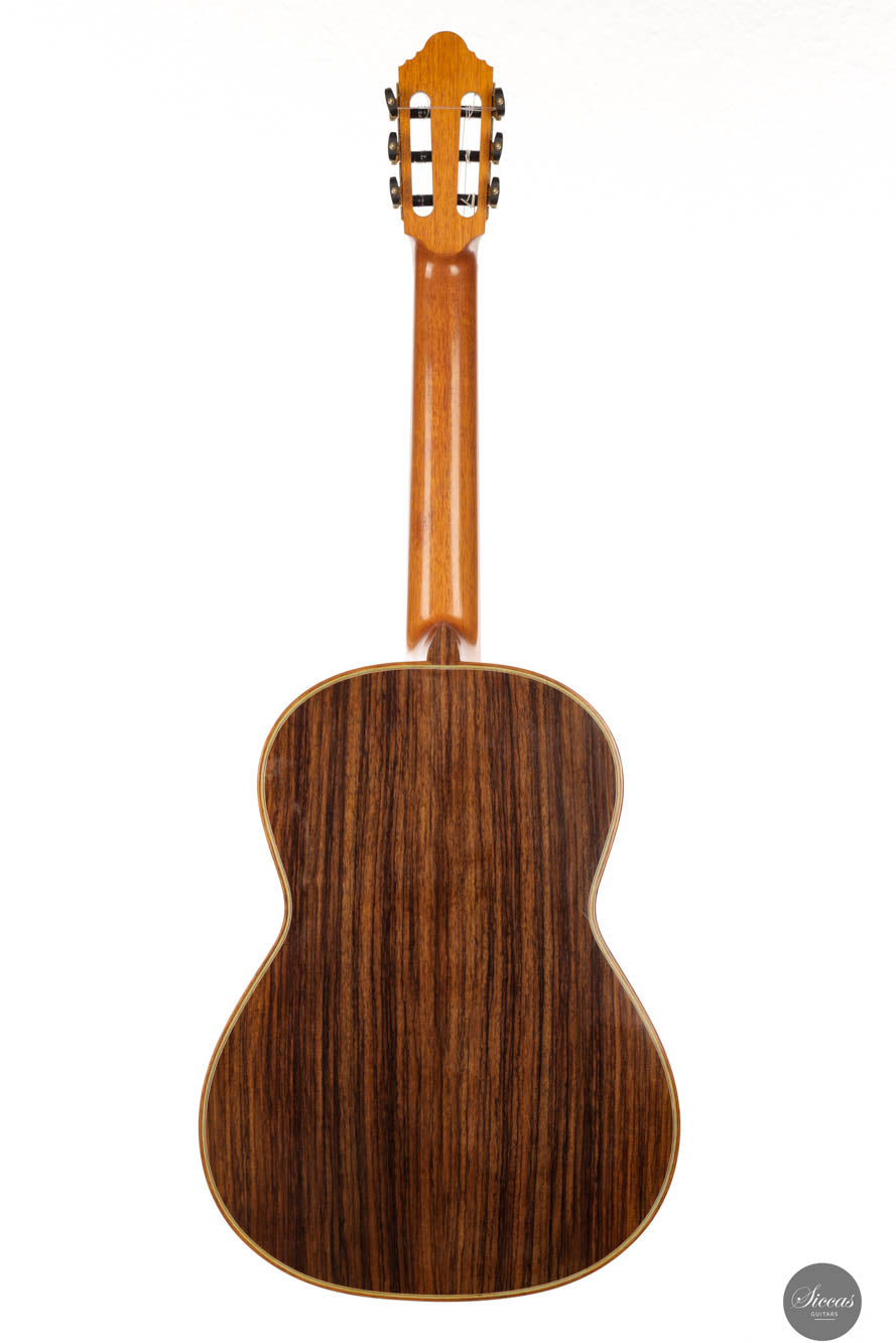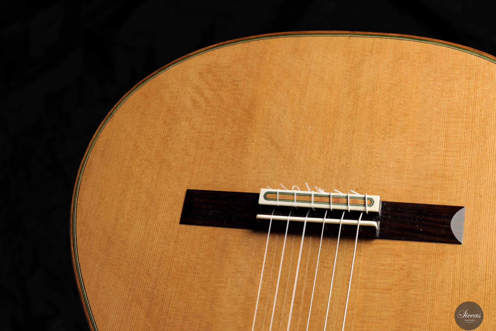 Diese Gitarre, gefertigt vom renommierten Felix Müller, steht als Zeugnis für seine Position als führende Persönlichkeit in der Welt des Double-Top-Gitarrenbaus, eine Kunst, die er unter der Anleitung seines Vaters, Antonius Müller, verfeinert hat. Felix hat die Einflüsse der Designs seines Vaters in seine eigene Arbeit integriert, während er jedem Instrument auch seinen starken persönlichen Stil aufprägt. Diese spezielle Gitarre exemplifiziert hervorragende Spielbarkeit und bietet außergewöhnlichen Komfort für sowohl die rechte als auch die linke Hand, was ein Markenzeichen von Felix' Aufmerksamkeit für das ergonomische Design seiner Gitarren ist. Das phänomenale Volumen des Instruments paart sich wunderschön mit seinem langen Sustain und orchestralen sympathischen Resonanzen, was seine lyrischen Qualitäten verstärkt. Der erzeugte Klang ist reich und raumfüllend, charakterisiert durch einen warmen, dunklen Klang und eine ausgezeichnete Trennung der Stimmen, was eine ausgewogene Ausgabe über alle Frequenzen sicherstellt.
