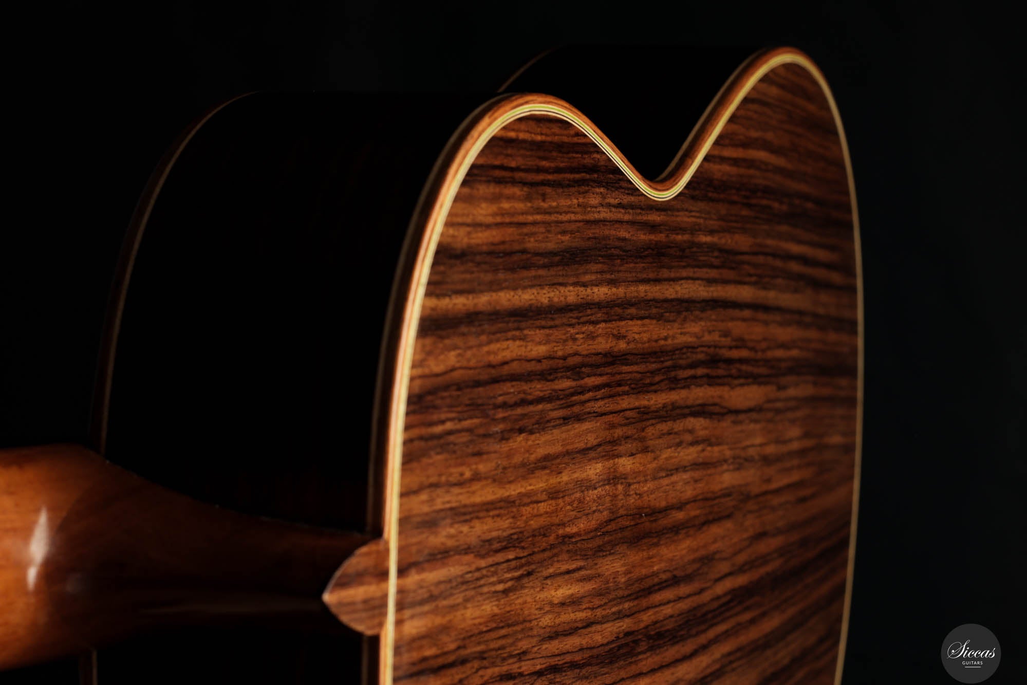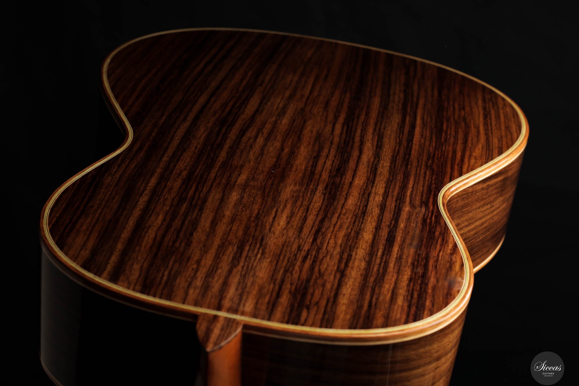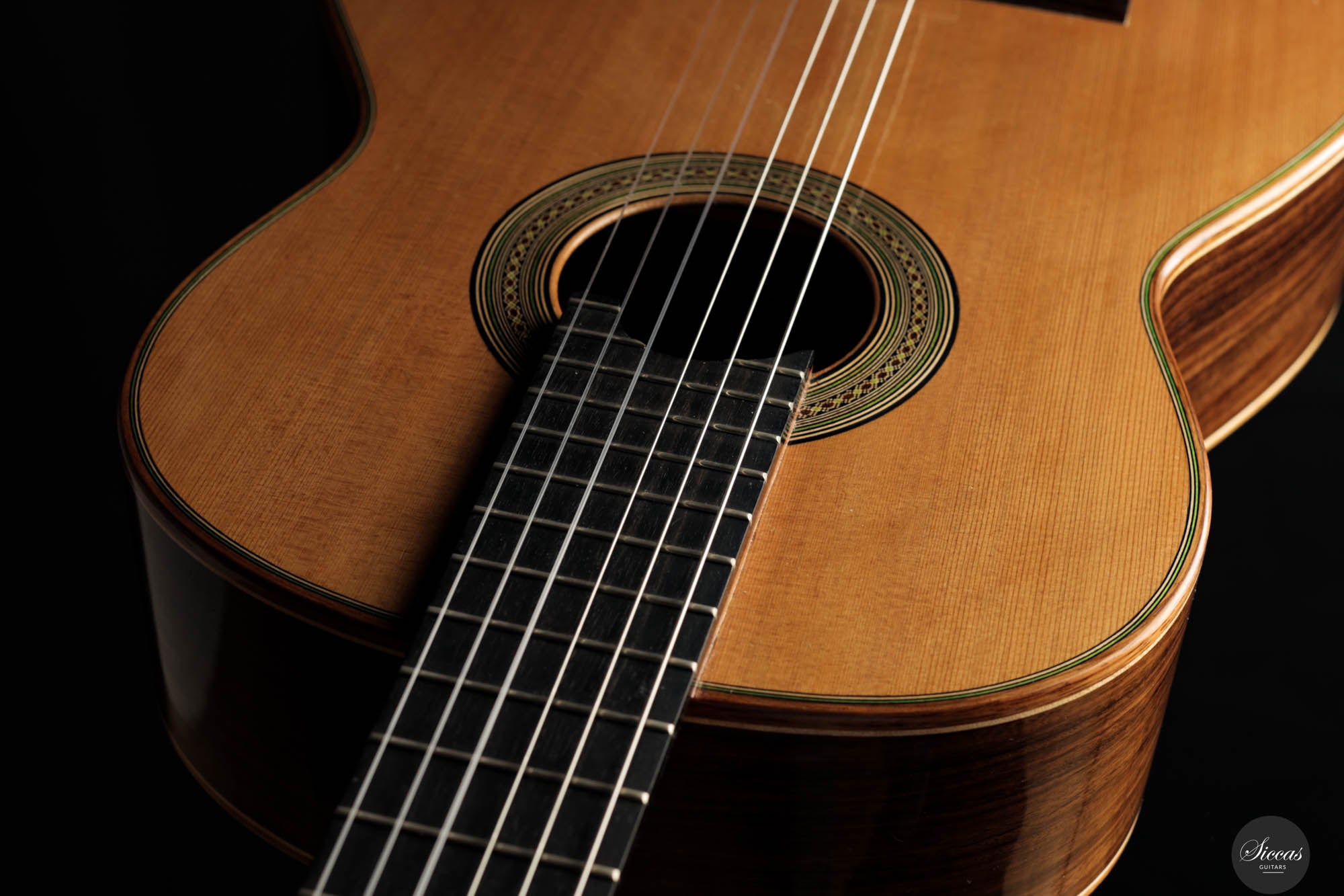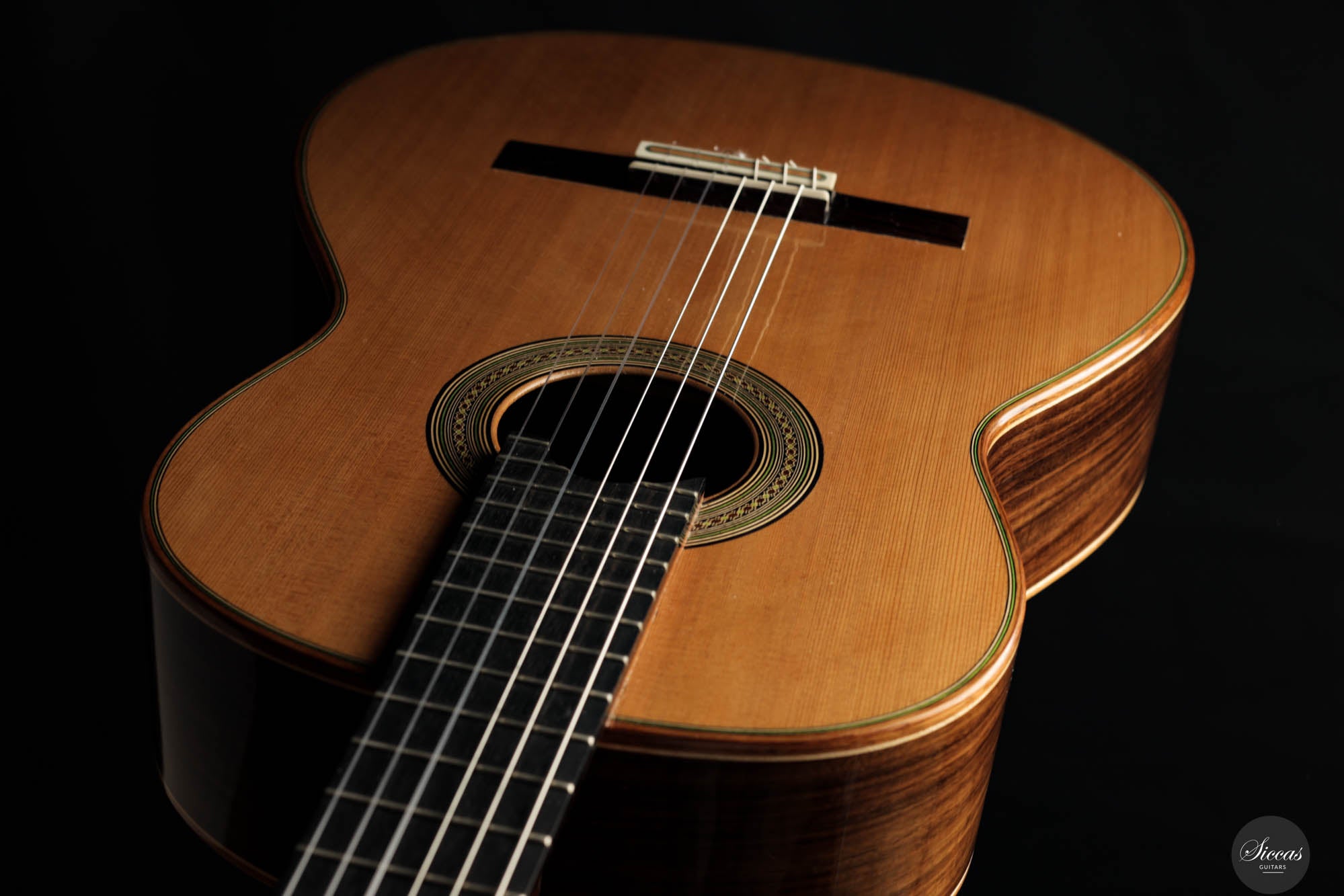 Diese Gitarre, gefertigt vom renommierten Felix Müller, steht als Zeugnis für seine Position als führende Persönlichkeit in der Welt des Double-Top-Gitarrenbaus, eine Kunst, die er unter der Anleitung seines Vaters, Antonius Müller, verfeinert hat. Felix hat die Einflüsse der Designs seines Vaters in seine eigene Arbeit integriert, während er jedem Instrument auch seinen starken persönlichen Stil aufprägt. Diese spezielle Gitarre exemplifiziert hervorragende Spielbarkeit und bietet außergewöhnlichen Komfort für sowohl die rechte als auch die linke Hand, was ein Markenzeichen von Felix' Aufmerksamkeit für das ergonomische Design seiner Gitarren ist. Das phänomenale Volumen des Instruments paart sich wunderschön mit seinem langen Sustain und orchestralen sympathischen Resonanzen, was seine lyrischen Qualitäten verstärkt. Der erzeugte Klang ist reich und raumfüllend, charakterisiert durch einen warmen, dunklen Klang und eine ausgezeichnete Trennung der Stimmen, was eine ausgewogene Ausgabe über alle Frequenzen sicherstellt.