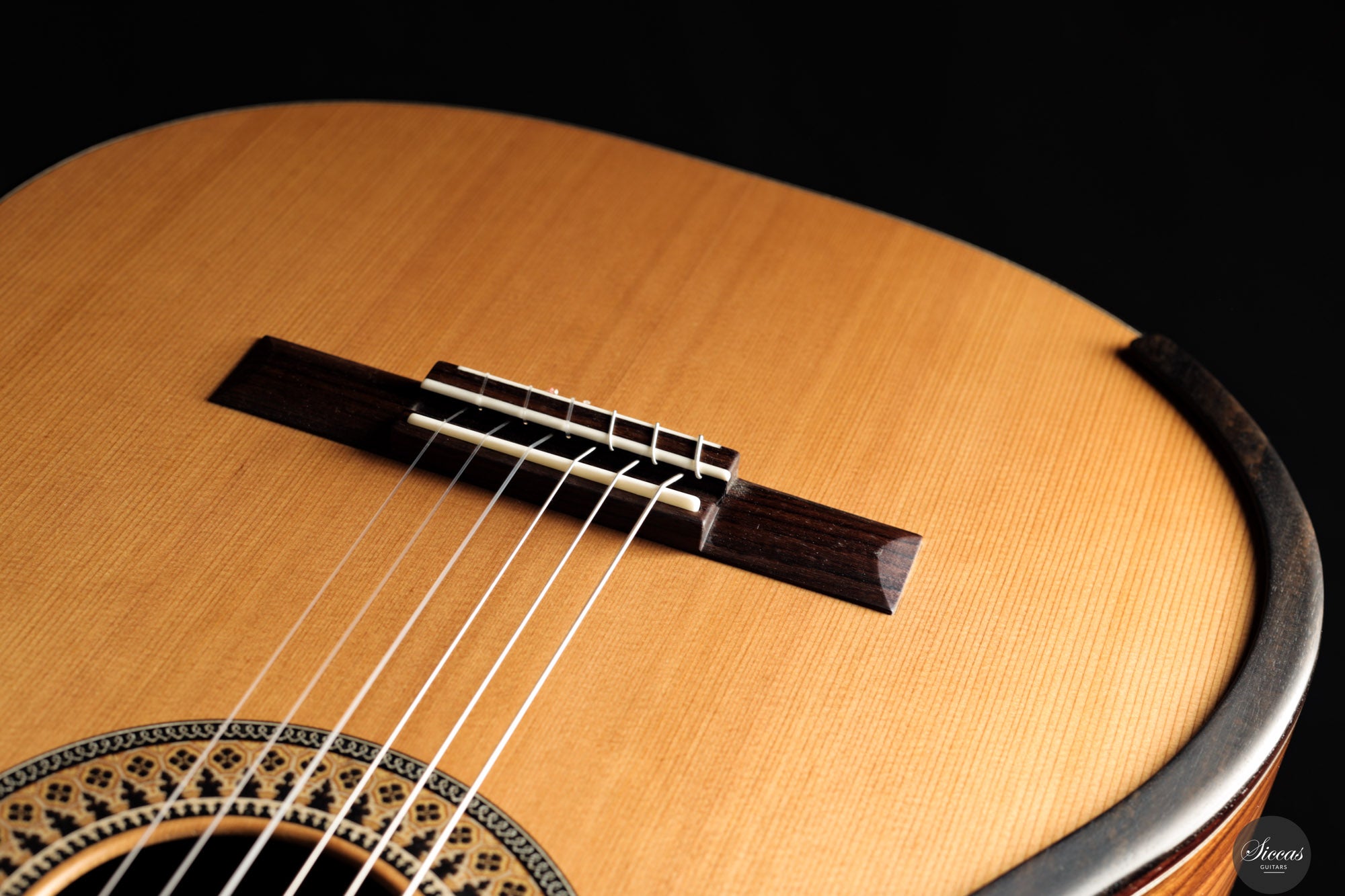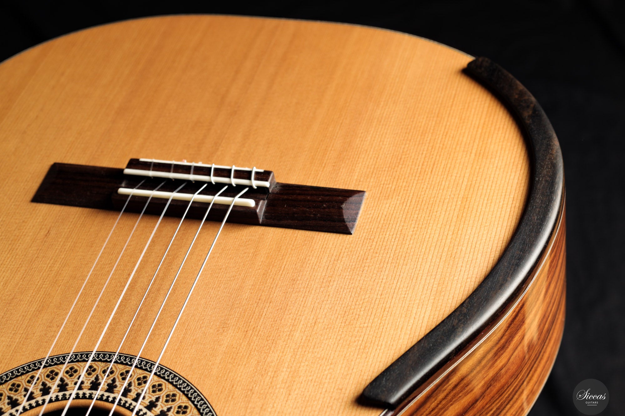 Diese Konzertgitarre aus dem Jahr 2025 ist ein eindrucksvolles Beispiel für Fernando Mazzas moderne Gitarrenbaukunst. Mit einer Mensur von 640 mm eignet sie sich besonders für Spieler, die ein etwas kompakteres Instrument mit voller Klangtiefe bevorzugen. Die Decke aus rotem Zedernholz ist mit Balsaholz verstärkt, das durch Kohlefaser ergänzt wird – eine Konstruktion, die durch intensive Forschung entwickelt wurde. Die Stärke der Verstrebung variiert zwischen 2,3 mm und 1 mm, was eine optimale Balance aus Stabilität, Flexibilität und Klangwärme schafft. Die Zargen bestehen aus Santos-Palisander mit einer Verstärkung durch Ahorn, was nicht nur zur strukturellen Stabilität beiträgt, sondern auch die Lautstärke und Projektion des Instruments erhöht. Der Boden besteht aus Santos-Palisander in Kombination mit Nomex, was eine stabile, dennoch resonanzfreudige Struktur ergibt. Diese Kombination sorgt für ein leichtes, aber äußerst klangvolles Gehäuse mit hoher Effizienz. Klanglich überzeugt die Gitarre mit einem sehr direkten, durchsetzungsfähigen Klang. Akkorde entfalten sich mit einer fast atmenden Leichtigkeit und selbst einzelne Töne erscheinen kraftvoll, ohne großen Kraftaufwand. Die Ansprache ist außergewöhnlich fein, die Gitarre reagiert auch dann noch musikalisch und rund, wenn die Nägel nicht perfekt geformt sind. Sie bietet ein modernes Klangbild mit reichen Obertönen und großer Dynamik. Schon der erste Ton hinterlässt einen bleibenden Eindruck. Für Liebhaber moderner Konzertgitarren im Stil von Greg Smallman oder Simon Marty ist dieses Instrument eine exzellente Wahl mit eigenständigem Charakter.