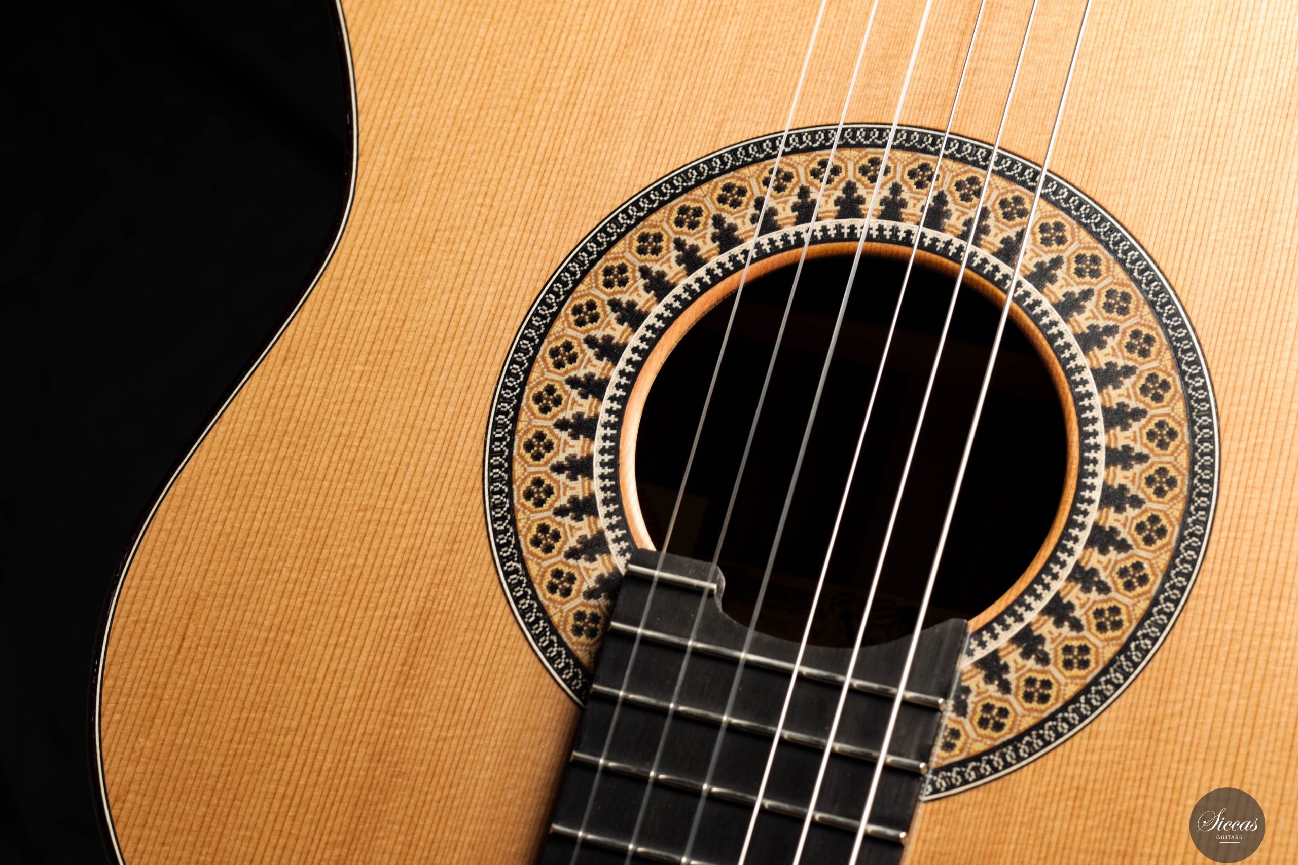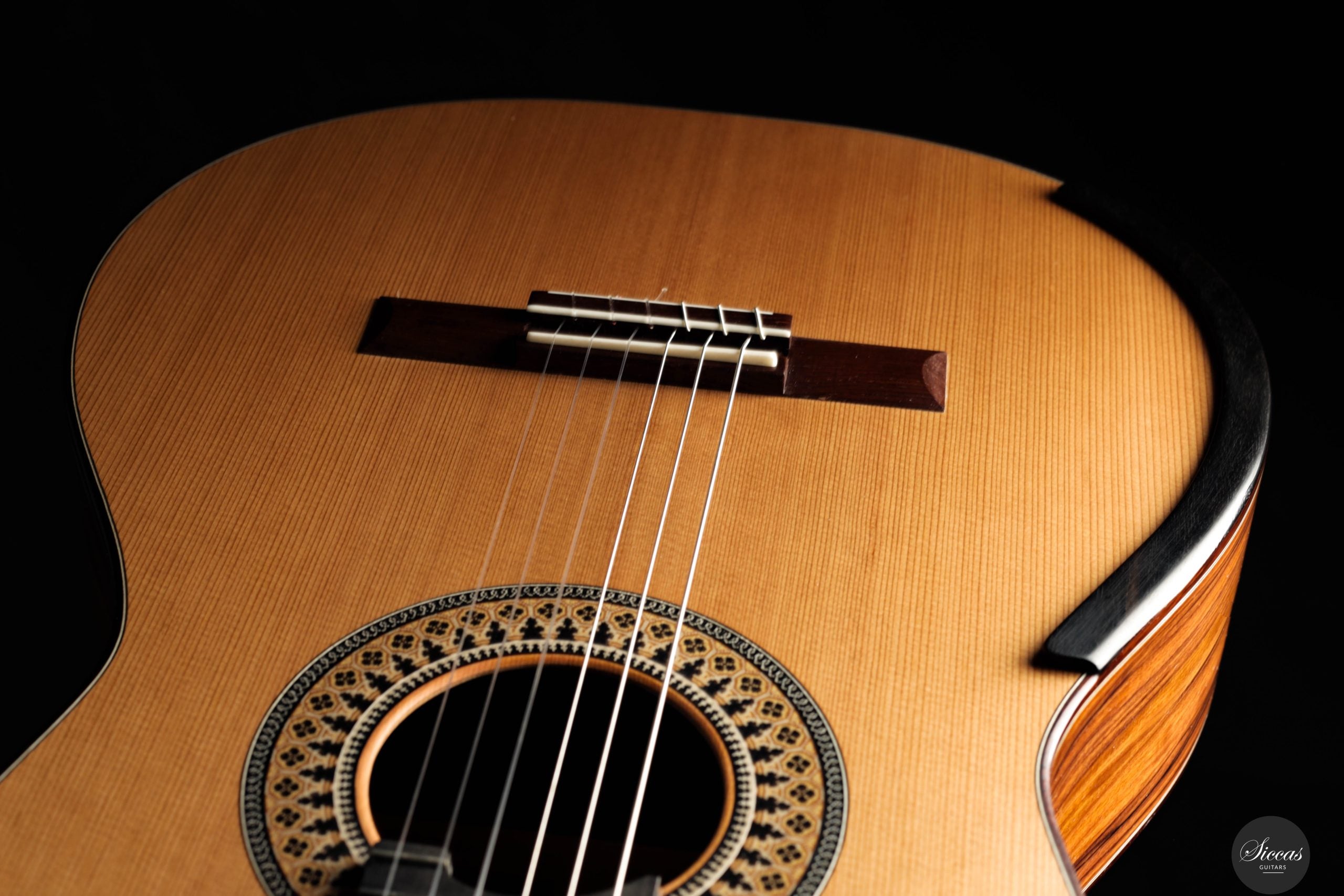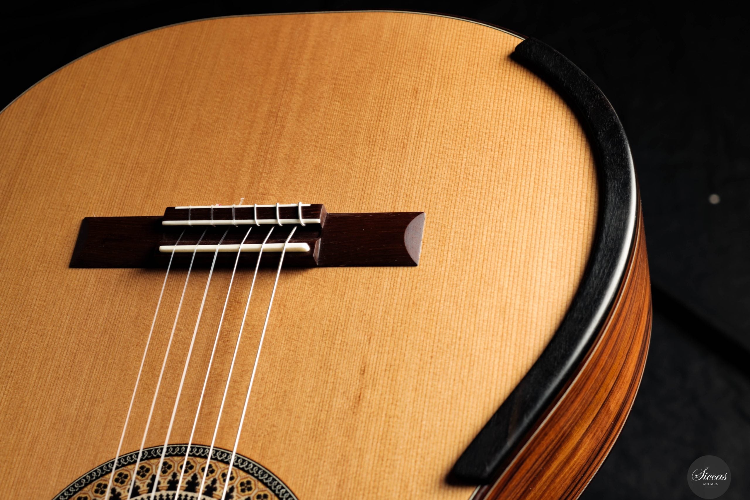 Die Decke besteht aus rotem Zedernholz, das durch eine Kombination aus Balsaholz und Carbonfaser-Verstrebungen verstärkt wird. Diese Verstrebungen variieren in ihrer Stärke von 2,3 mm bis 1 mm. Fernando Mazza hat intensiv daran gearbeitet, das Verhältnis von Carbonmenge und Holzstärke optimal auszutarieren, um einen ausgewogenen, kraftvollen und zugleich natürlichen Klang zu erzielen, der reich an Obertönen und Sustain ist.