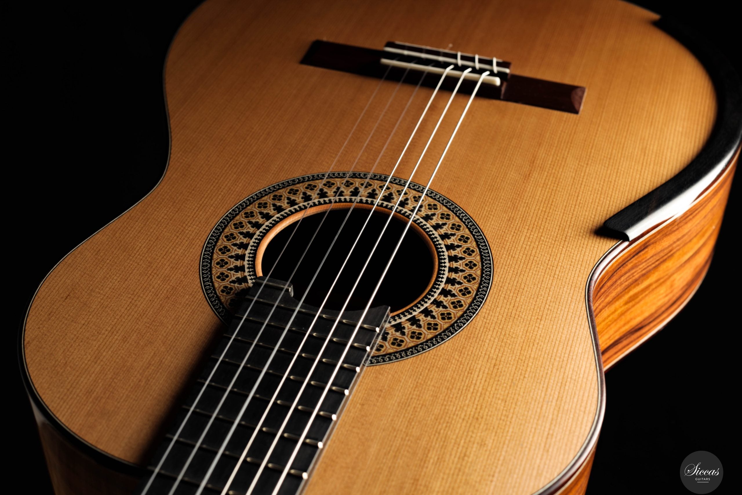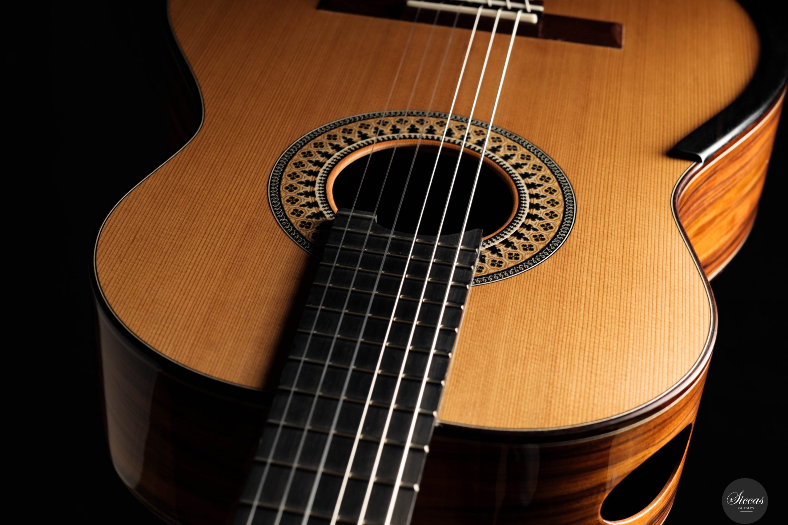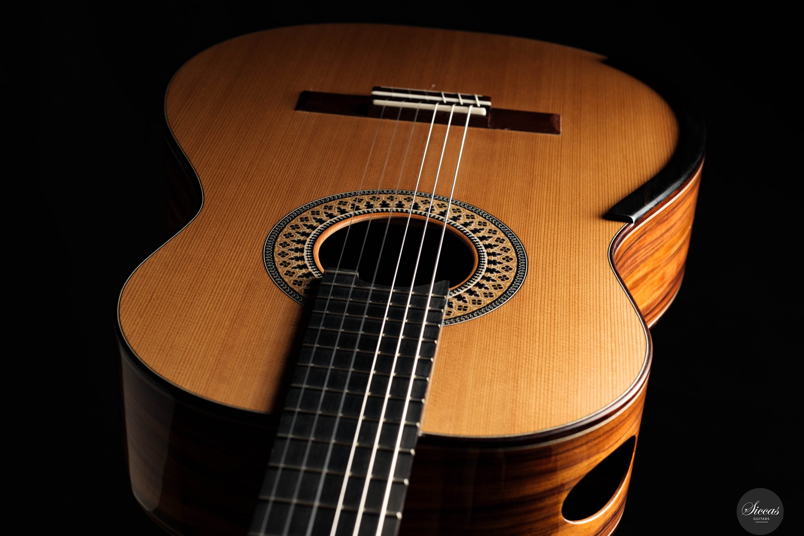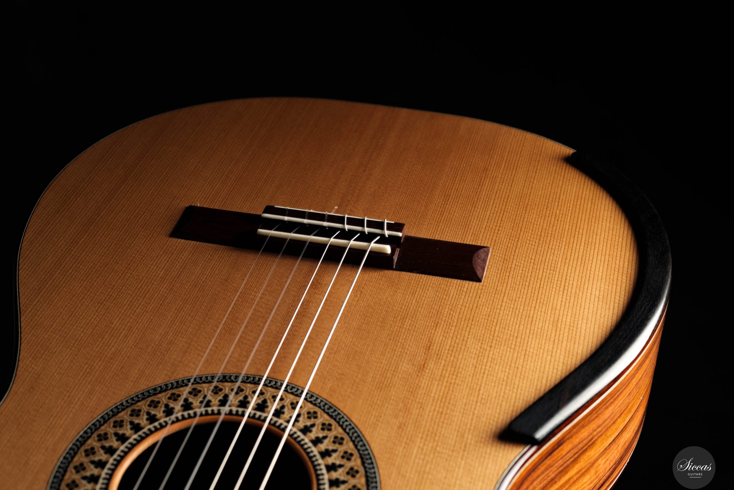 Die Decke besteht aus rotem Zedernholz, das durch eine Kombination aus Balsaholz und Carbonfaser-Verstrebungen verstärkt wird. Diese Verstrebungen variieren in ihrer Stärke von 2,3 mm bis 1 mm. Fernando Mazza hat intensiv daran gearbeitet, das Verhältnis von Carbonmenge und Holzstärke optimal auszutarieren, um einen ausgewogenen, kraftvollen und zugleich natürlichen Klang zu erzielen, der reich an Obertönen und Sustain ist.