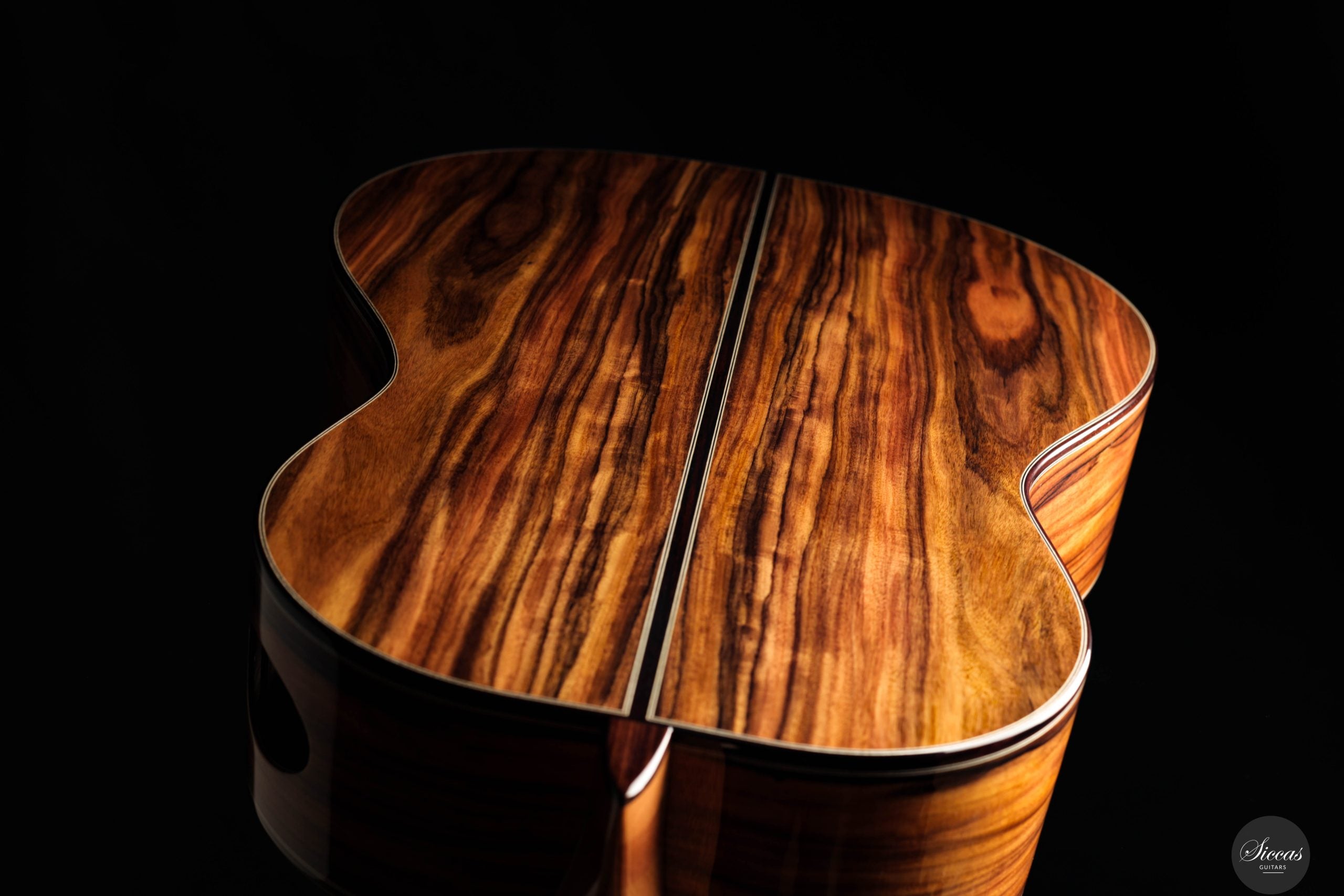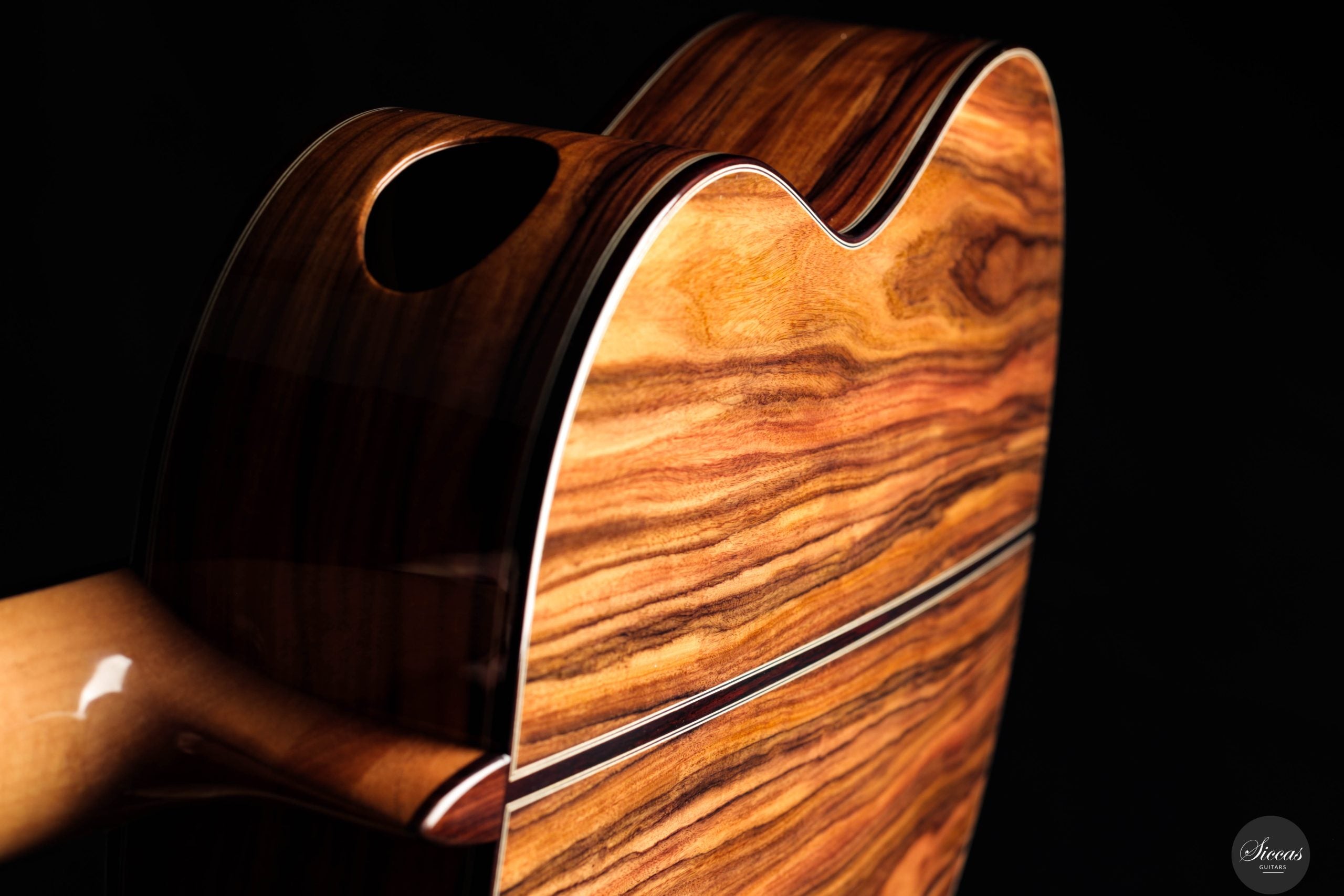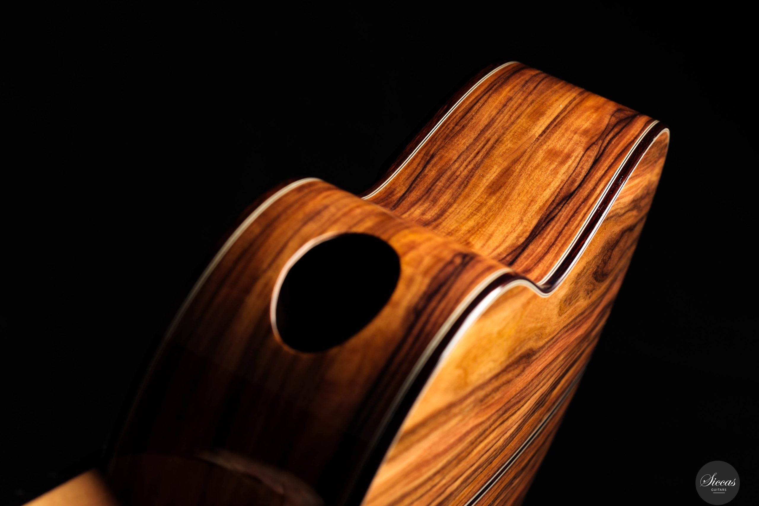 Die Zargen bestehen aus einer Kombination von Santos-Palisander und Ahorn. Diese Materialwahl erhöht die Steifigkeit der Konstruktion und trägt wesentlich zur Stabilität und zum Volumen des Instruments bei.