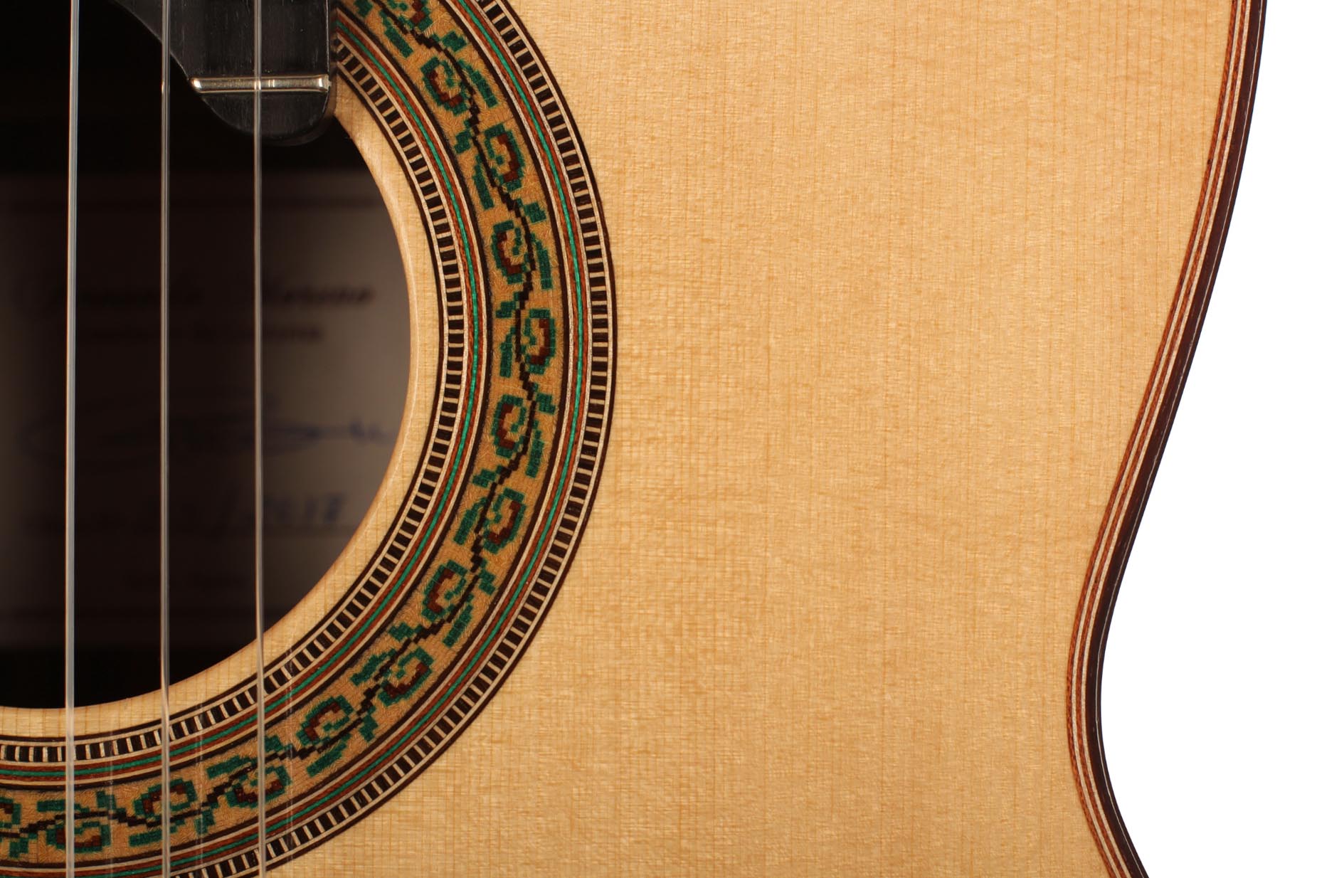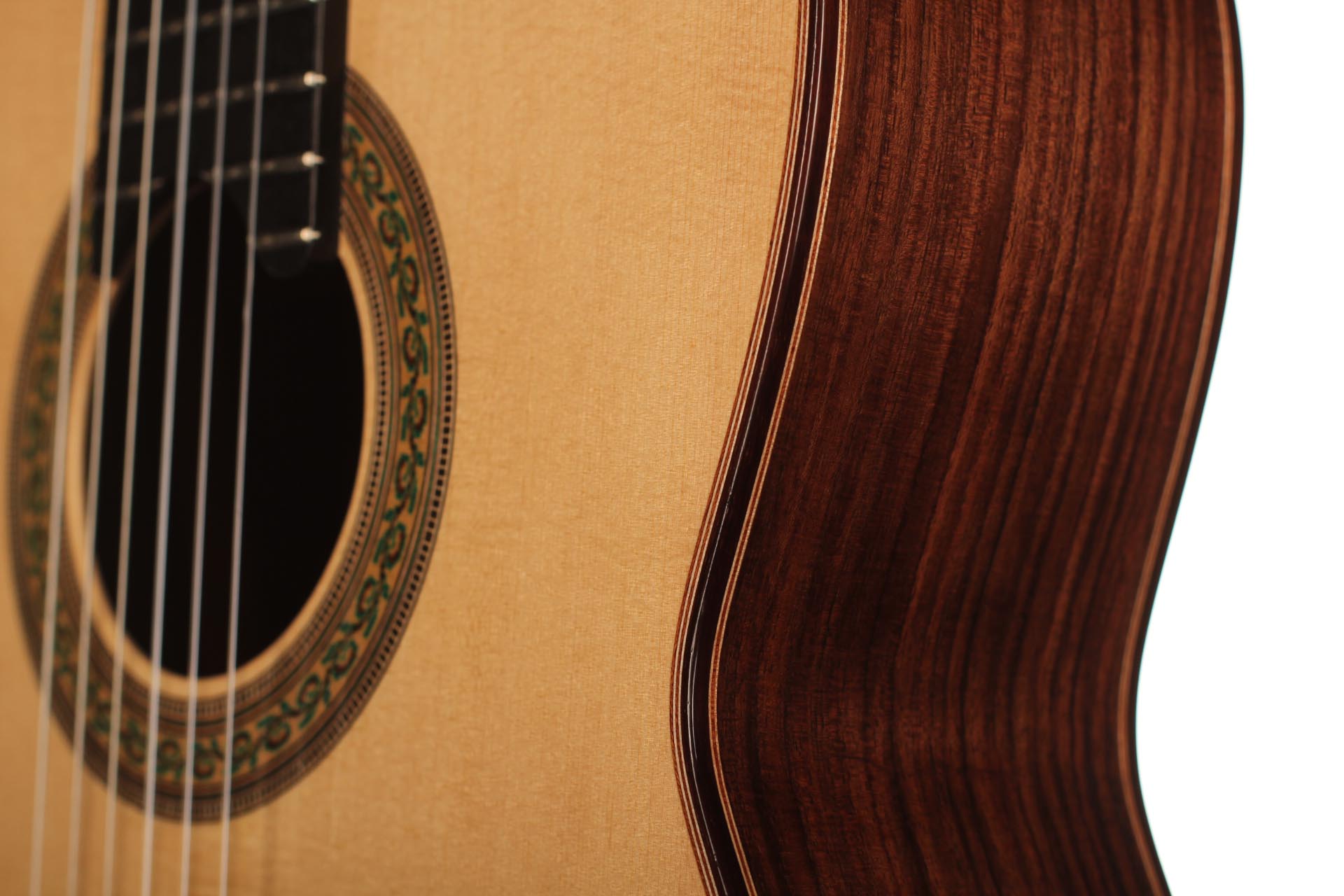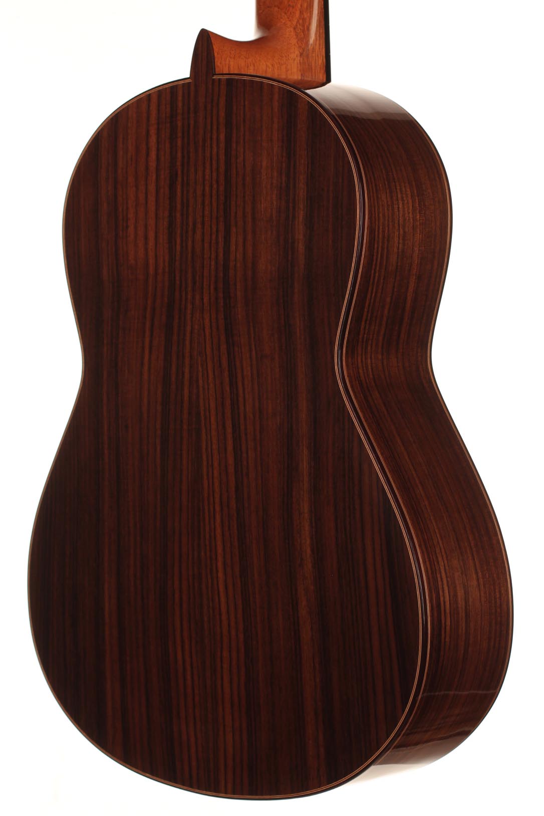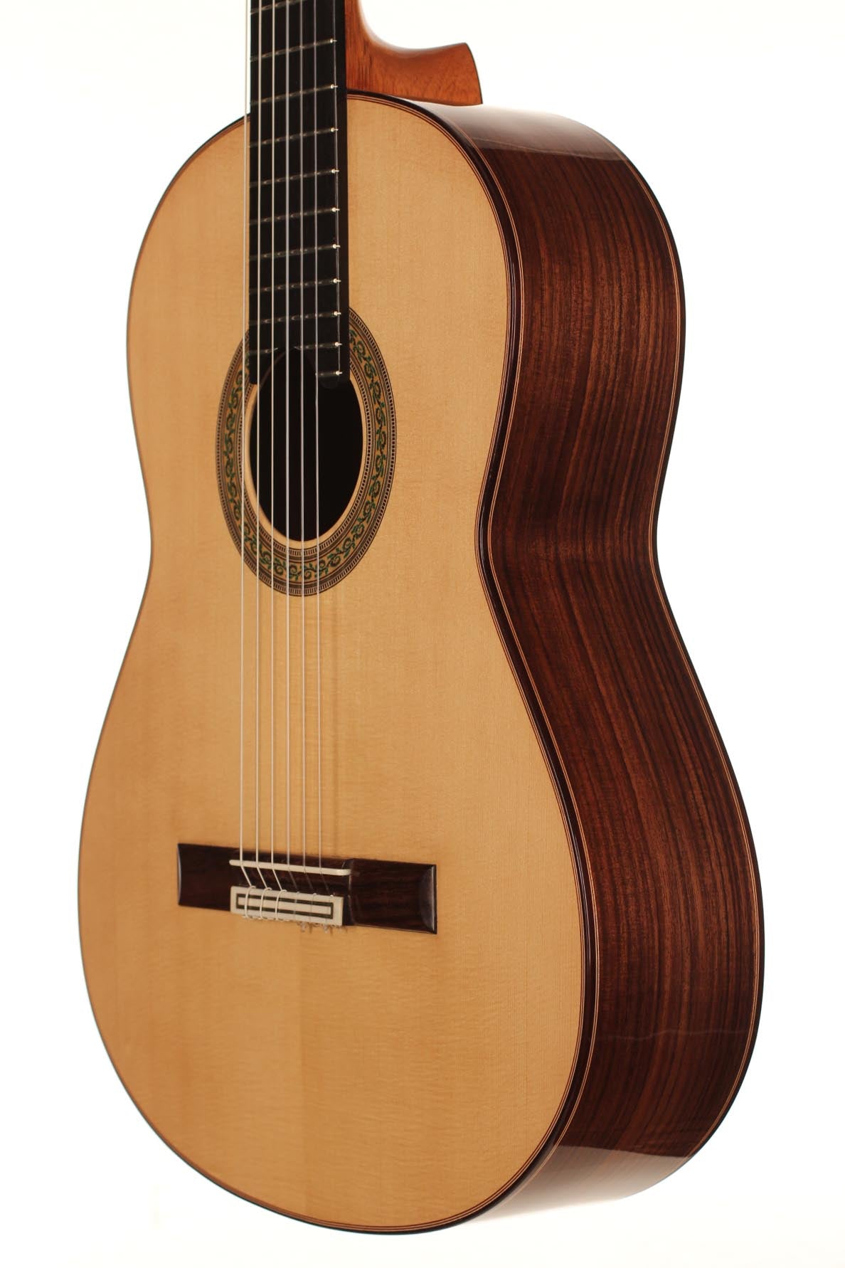Diese Gitarre hat eine schöne Fichtendecke, die eine elegante warmen Farbe besitzt. Der Boden und die Zargen aus indischem Palisander sind von bester Qualität und die Quer-Maserung des Holzes verleiht ihm eine tiefe und ansprechende Textur. Klanglich sticht bei dieser Gitarre Ihre Klarheit, Reinheit und Sensibilität heraus. Sie besitzt viel Persönlichkeit in Ihren Klangfarben und wir empfehlen jedem Liebhaber des spanischen Klangs, dieses feine Instrument auszuprobieren. Veredelt wurde diese Gitarre mit einer Schellack-Politur. Ein Hartschalenkoffer ist inklusive.