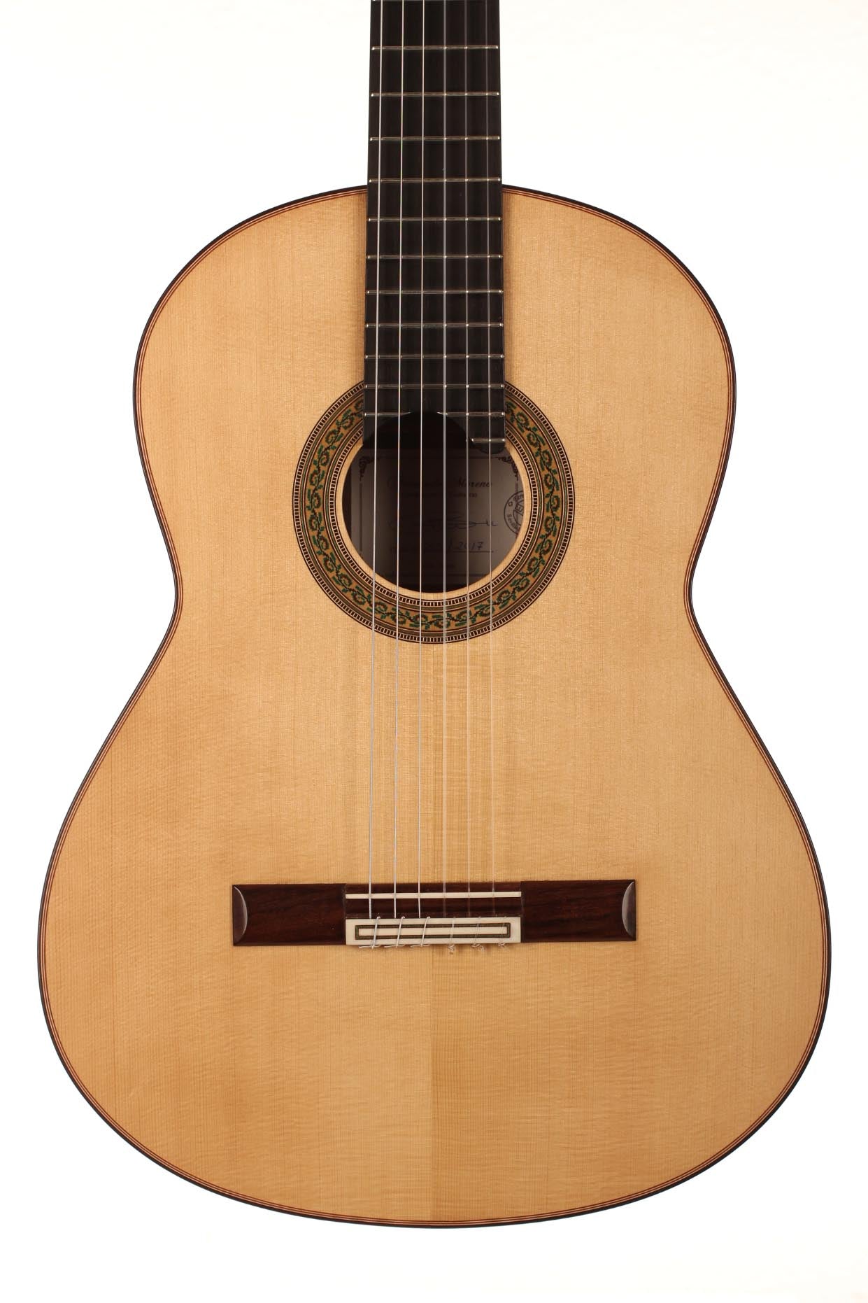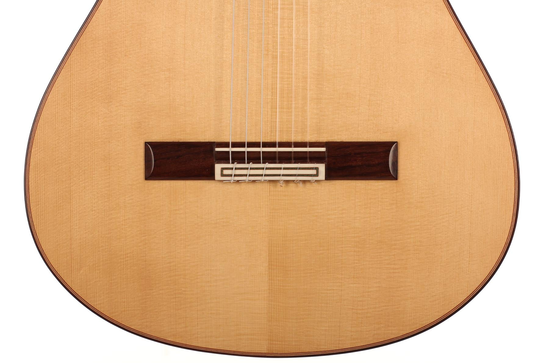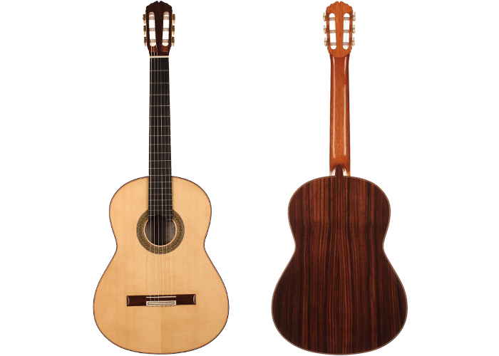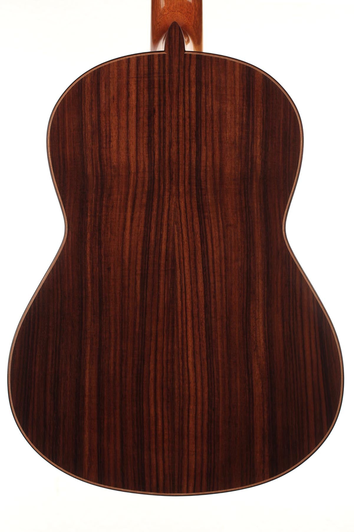 Diese Gitarre hat eine schöne Fichtendecke, die eine elegante warmen Farbe besitzt. Der Boden und die Zargen aus indischem Palisander sind von bester Qualität und die Quer-Maserung des Holzes verleiht ihm eine tiefe und ansprechende Textur. Klanglich sticht bei dieser Gitarre Ihre Klarheit, Reinheit und Sensibilität heraus. Sie besitzt viel Persönlichkeit in Ihren Klangfarben und wir empfehlen jedem Liebhaber des spanischen Klangs, dieses feine Instrument auszuprobieren. Veredelt wurde diese Gitarre mit einer Schellack-Politur. Ein Hartschalenkoffer ist inklusive.