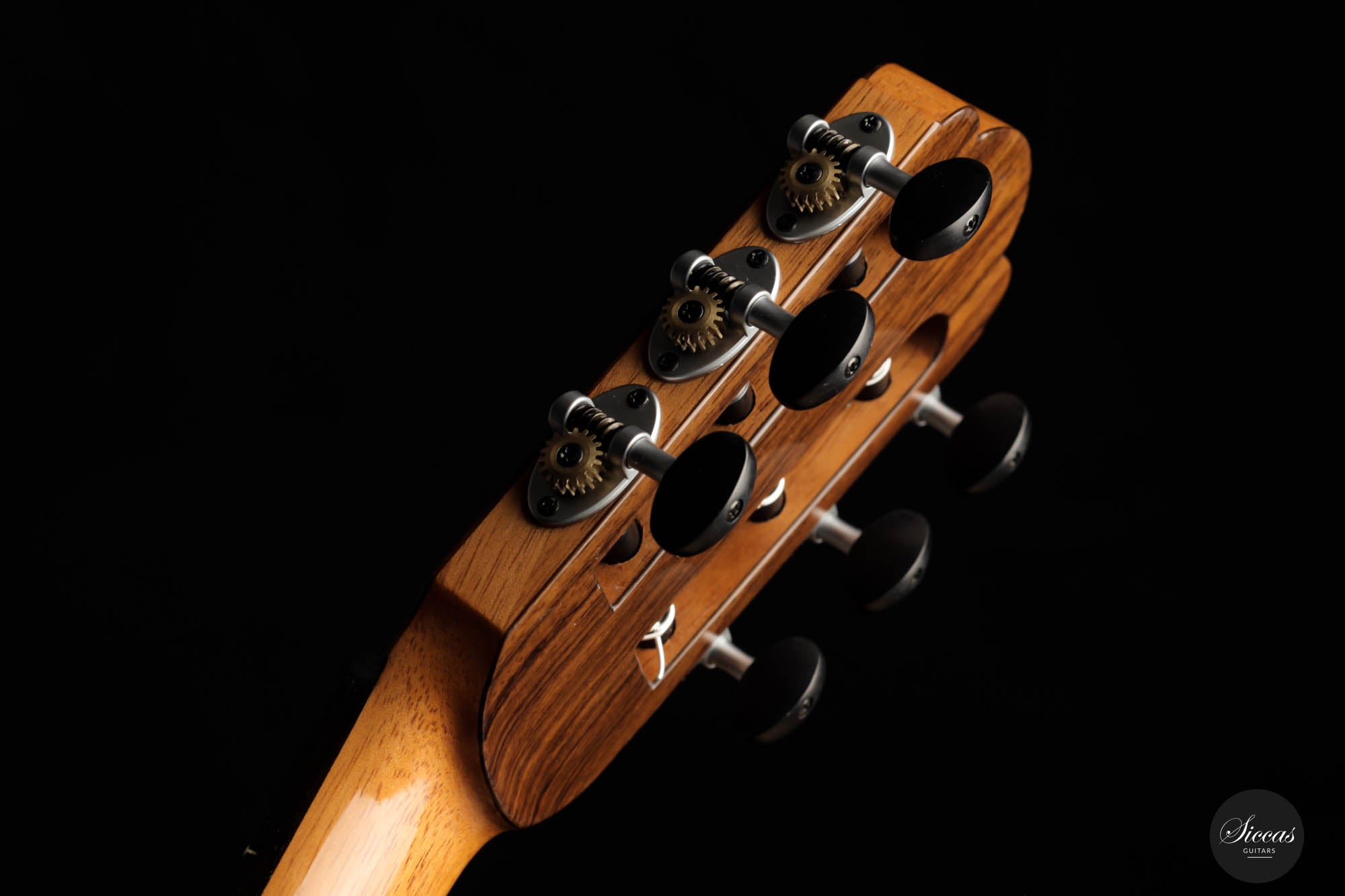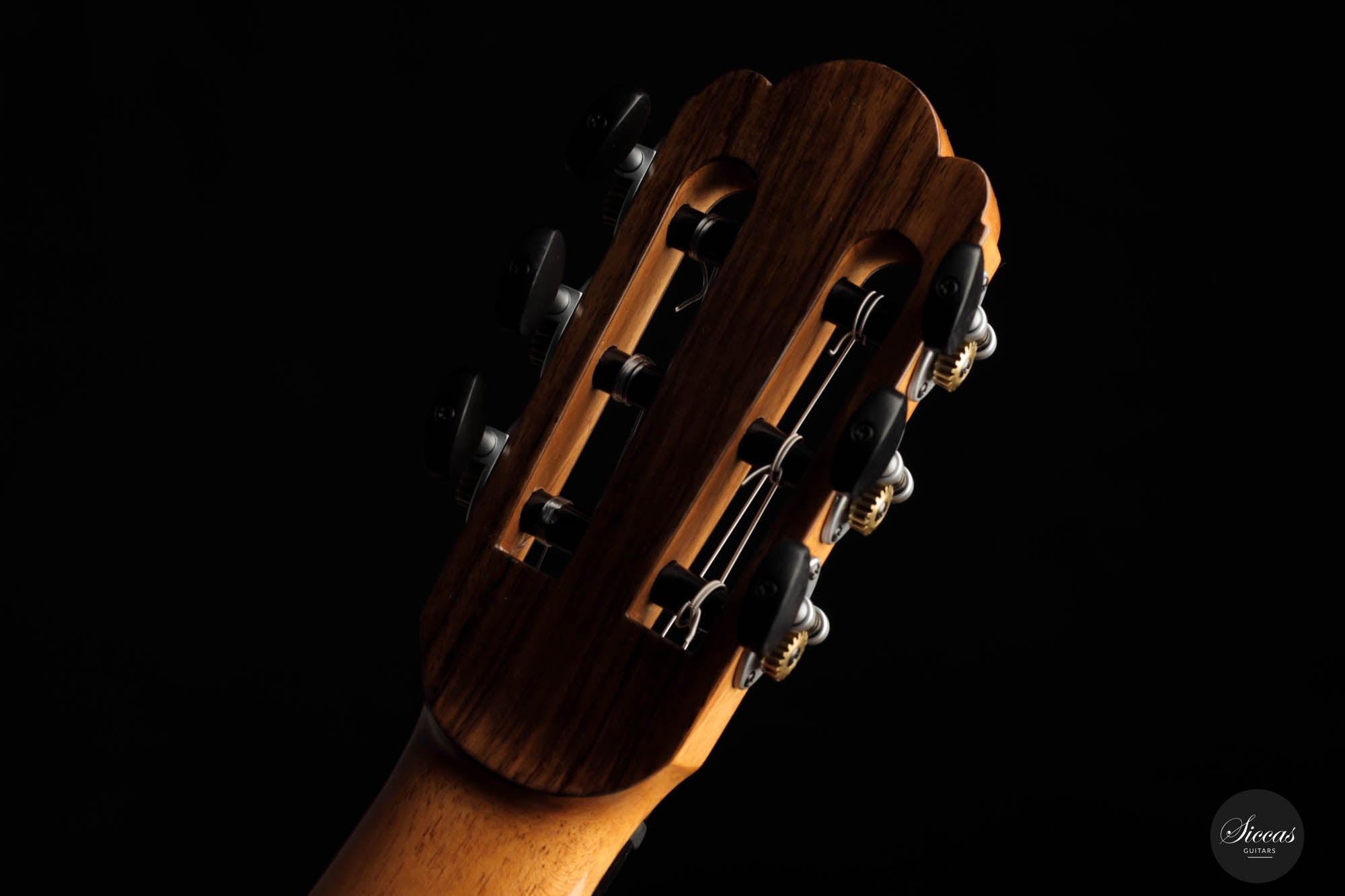 The back of the guitar is made from a four-piece construction, with Indian rosewood for the outer parts and Bosse (Guarea cedrata) for the inner parts. Indian rosewood is a prized material for guitar backs and sides due to its strong, clear tone and beautiful grain patterns. Bosse, a species of hardwood native to West and Central Africa, is known for its density, stability, and visually striking grain patterns. The combination of these materials provides a strong, clear, and balanced tonality for the guitar, resulting in a rich, warm sound with excellent projection. The first string, in particular, is noteworthy, with a singing quality that adds a special touch to any performance. Whether playing solo or as part of an ensemble, this guitar will provide a captivating voice that will inspire and impress.