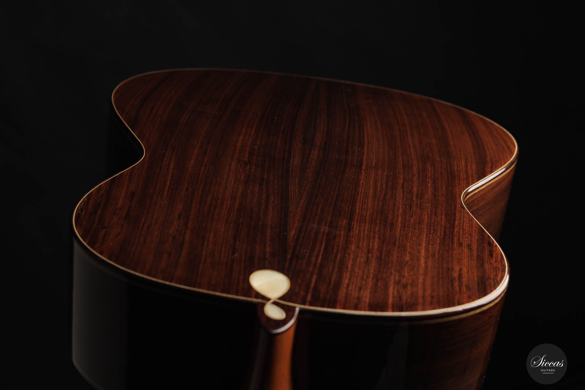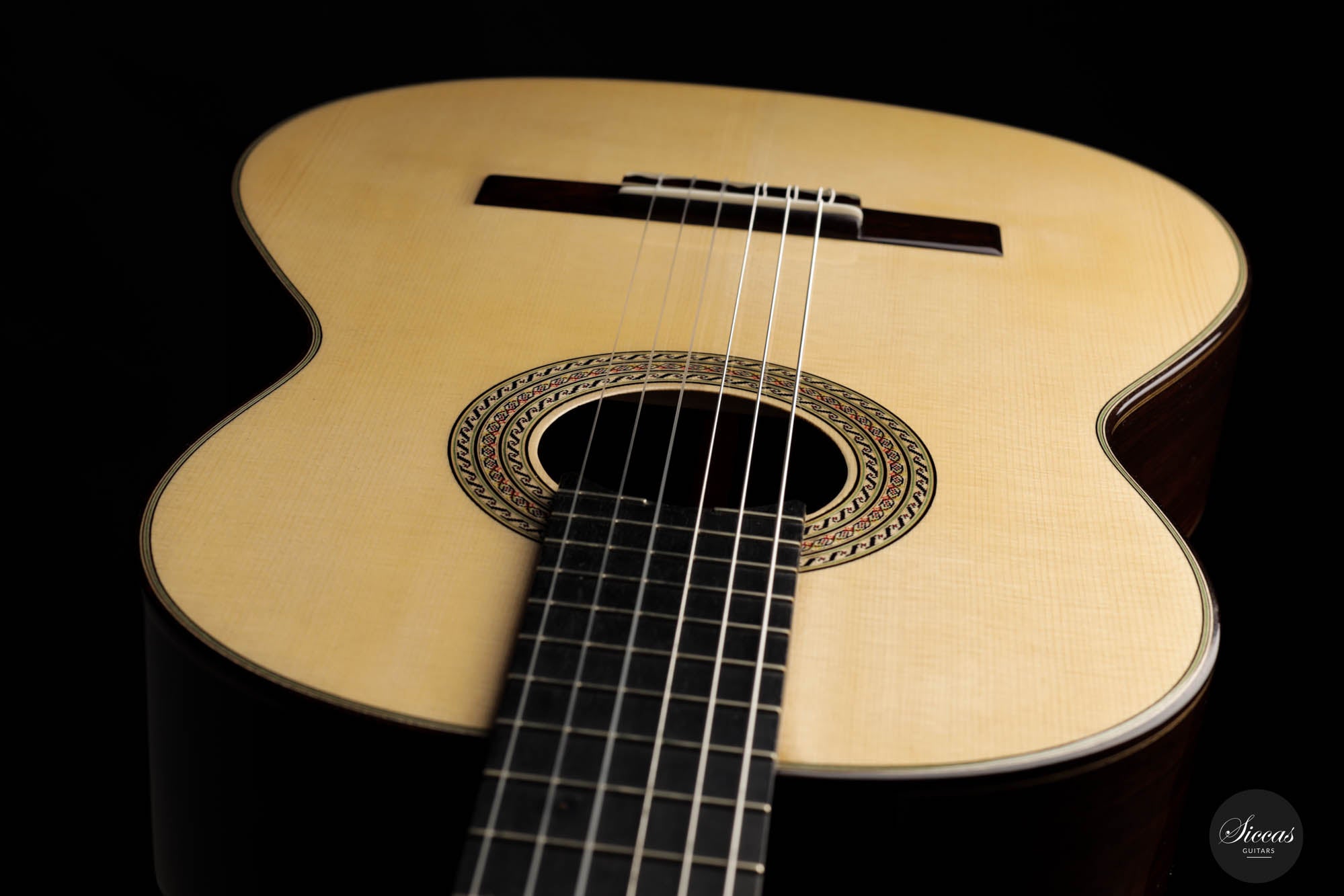 Die Francesco de Gregorio-Gitarre für die Roma Expo 2023 ist ein leuchtendes Beispiel für hochwertige Gitarrenbaukunst. Francesco hat sich mit diesem Instrument wirklich hervorgetan und sein großes Engagement und beeindruckendes Können unter Beweis gestellt. Eines der herausragenden Merkmale dieser Gitarre ist die geschnitzte Kopfplatte. Dieses Detail zeigt Francescos künstlerisches Gespür und seine Leidenschaft für seine Arbeit und macht diese Gitarre von einem einfachen Instrument zu einem Kunstwerk. Die Gitarre ist aus einer Fichtendecke und indischem Palisander für Boden und Zargen gefertigt. Diese Materialien wurden sorgfältig nach ihrer Qualität ausgewählt, und die Rosette und die Einfassungen verleihen der Gitarre einen geschmackvollen dekorativen Touch. Die Wahl der Materialien und der Verzierungen trägt zur Schönheit der Gitarre bei. Aber die Gitarre ist nicht nur schön. Sie hat auch einen fantastischen Klang. Die F-Hauptresonanz verleiht der Gitarre einen tiefen und dunklen Bass-Sound, während die Höhen klar und gesanglich sind. Dieses Gleichgewicht zwischen Bass und Diskant verleiht der Gitarre einen schönen und harmonischen Klang. Zusammenfassend lässt sich sagen, dass die Francesco de Gregorio-Gitarre, die für die Roma Expo 2023 gebaut wurde, den Gipfel dessen darstellt, was im Gitarrenbau möglich ist. Sie vereint Handwerkskunst, Kunstfertigkeit und großartigen Klang in einem attraktiven Paket.