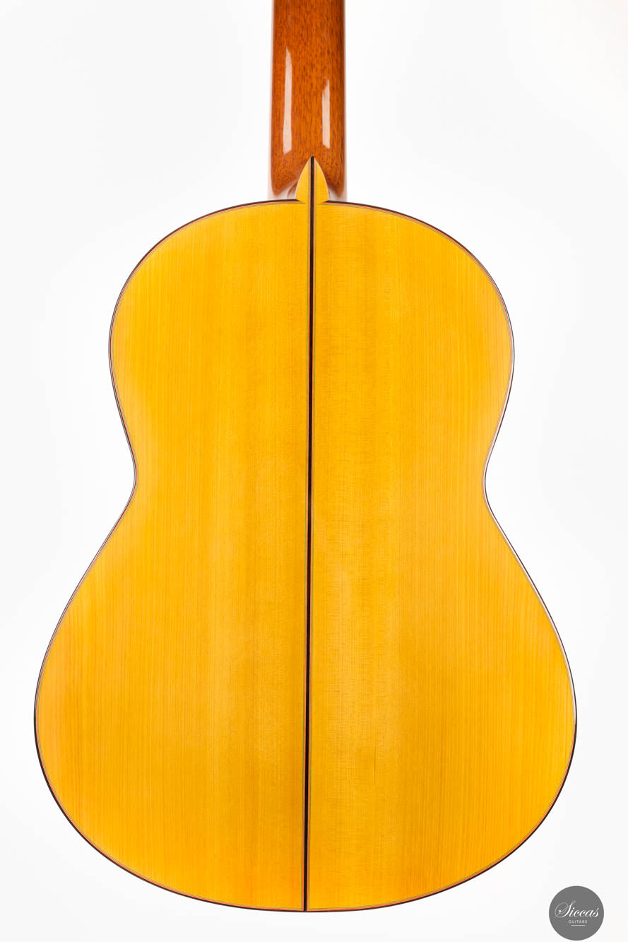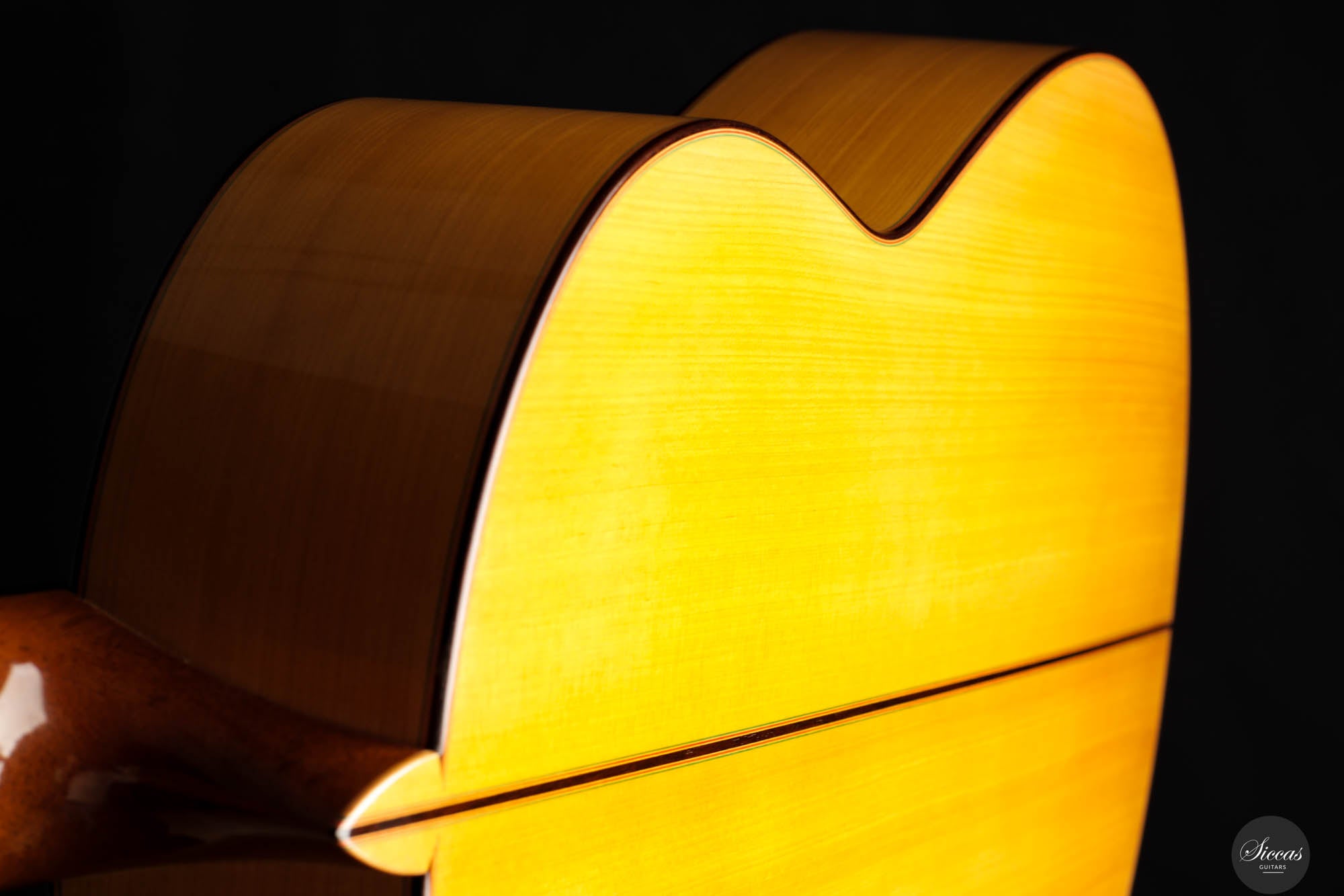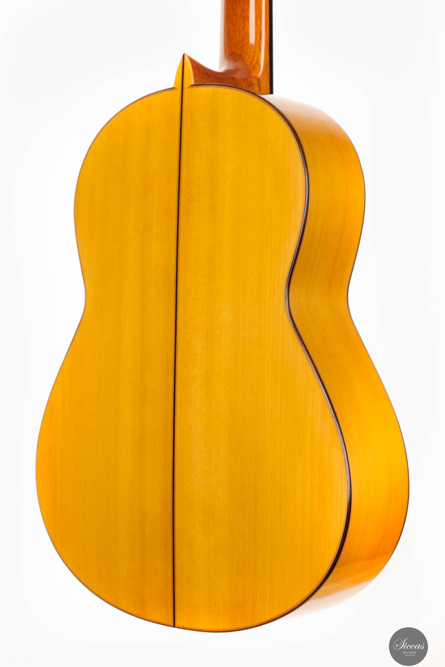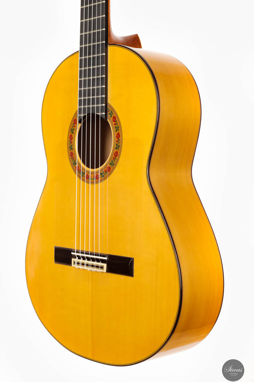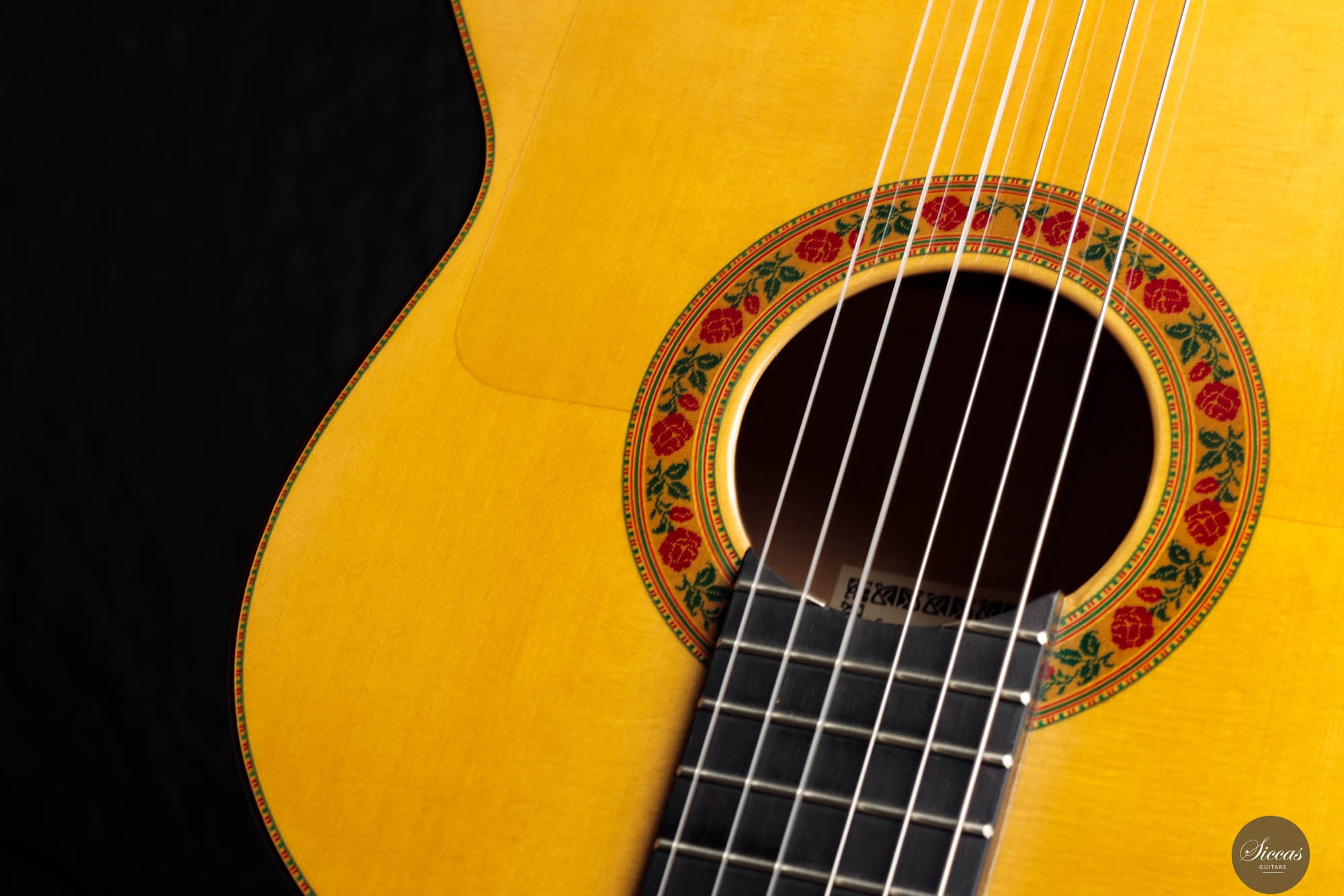 Direkt aus den Händen des spanischen Meistergitarrenbauers, ist die brandneue Flamencogitarre von Francisco Barba aus dem Jahr 2023 ein Zeugnis für traditionelles Handwerk und moderne Bespielbarkeit. Dieses Instrument ist bemerkenswert leicht mit nur 1480 Gramm, was es außergewöhnlich komfortabel für Übung und Auftritt macht. Es ist auf den tieferen Register um F# gestimmt, eine Stimmung, die seinen hellen und lebendigen Ton ergänzt. Ausgestattet mit sehr funktionalen Gotoh-Mechaniken, gewährleistet diese Gitarre eine ausgezeichnete Stimmstabilität, ein entscheidendes Merkmal für den dynamischen Bereich der Flamenco-Musik. Die Kombination aus Fichte für die Decke und Zypresse für Boden und Zargen ist traditionell für in Sevilla gebaute Flamencogitarren und bietet einen Klang, der sowohl brillant als auch tief in der Flamenco-Tradition verwurzelt ist.