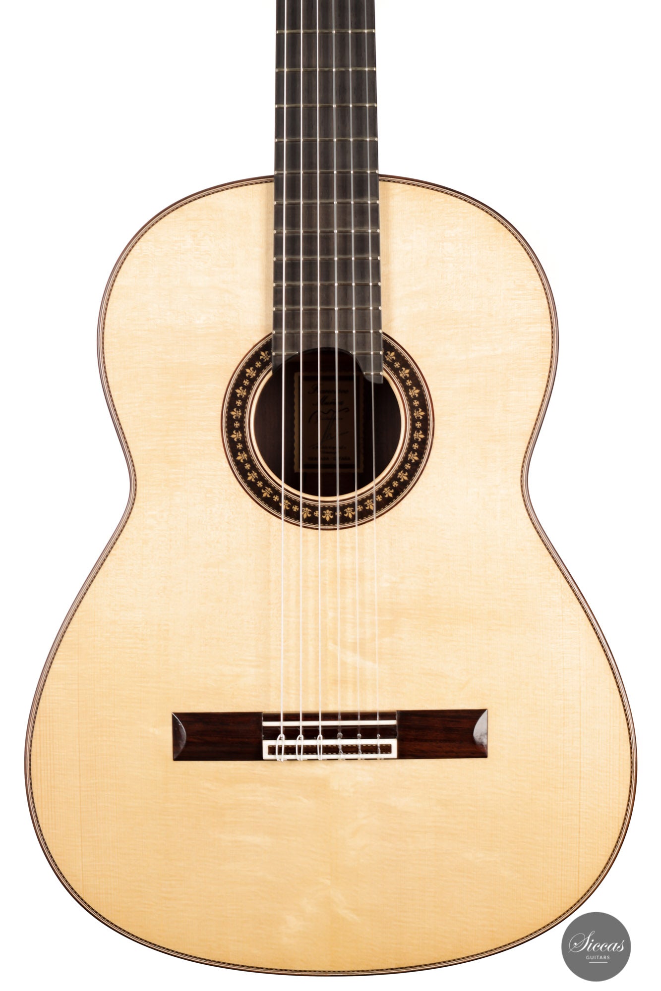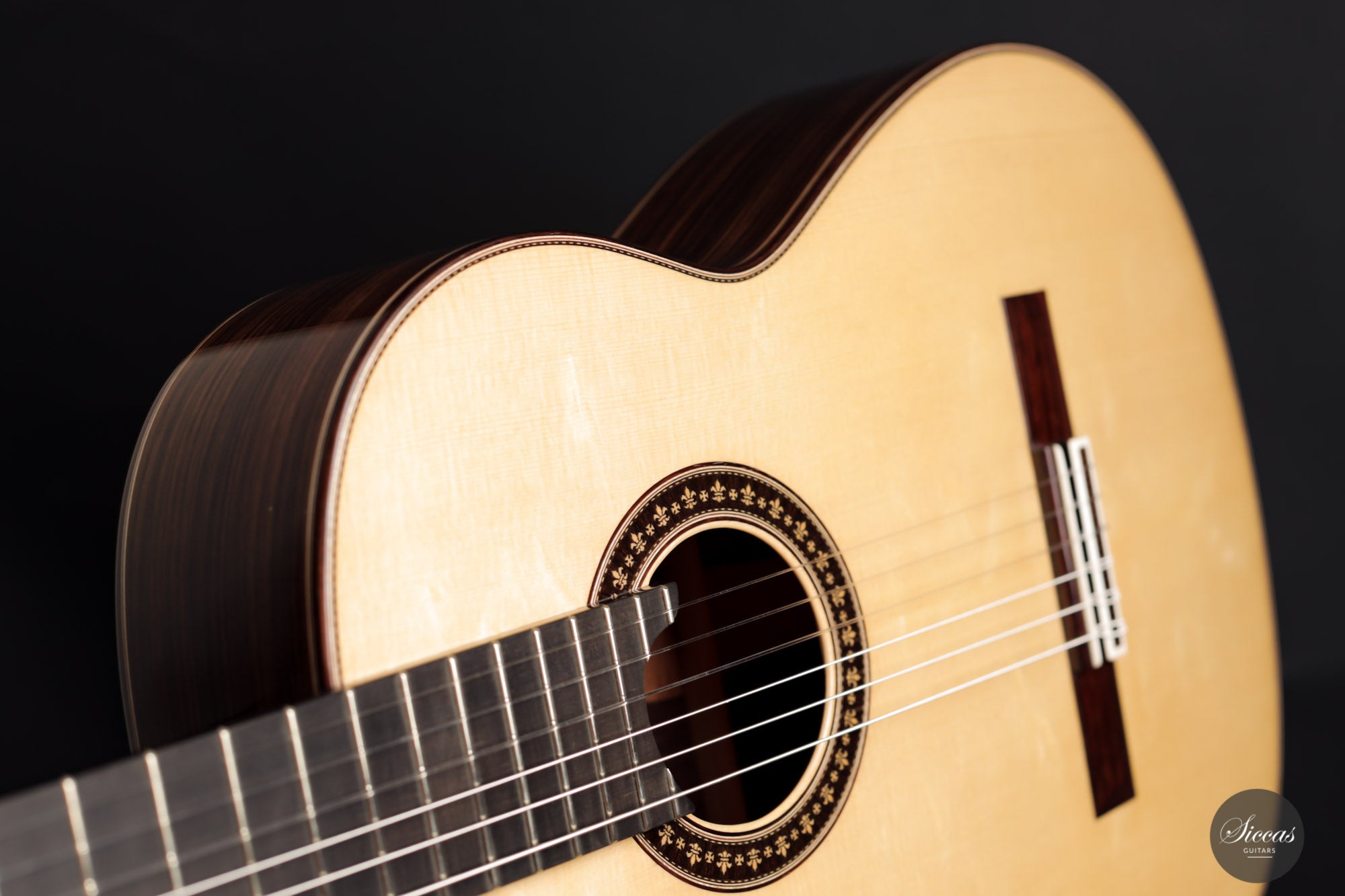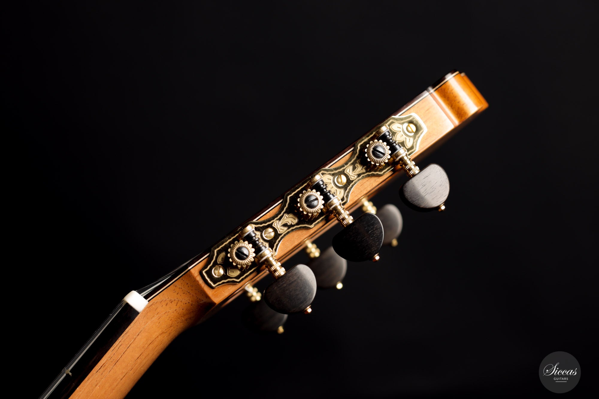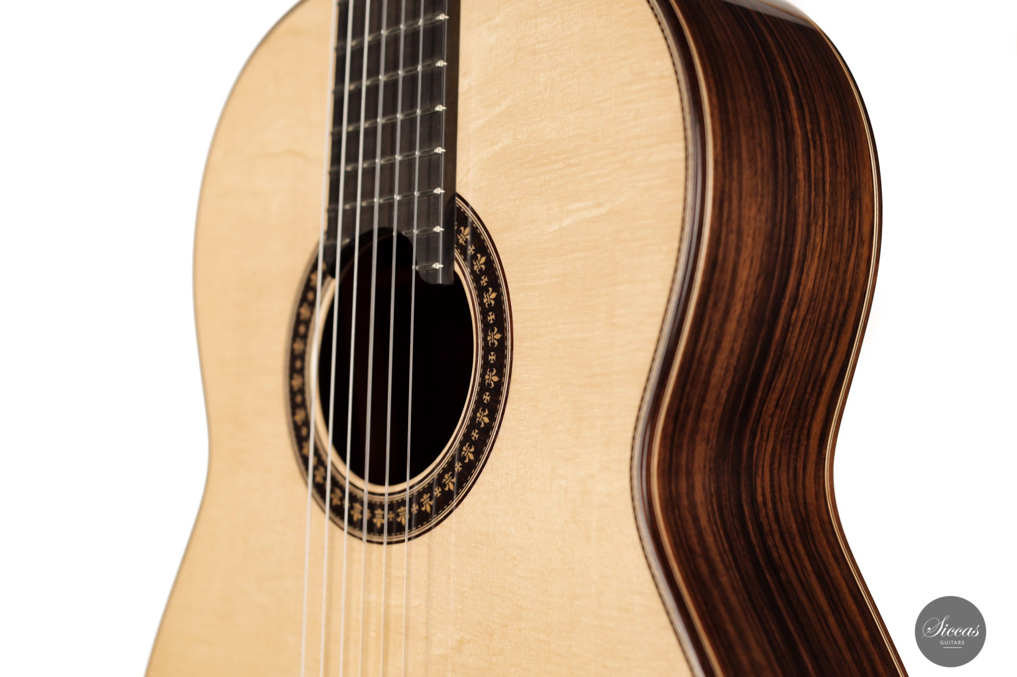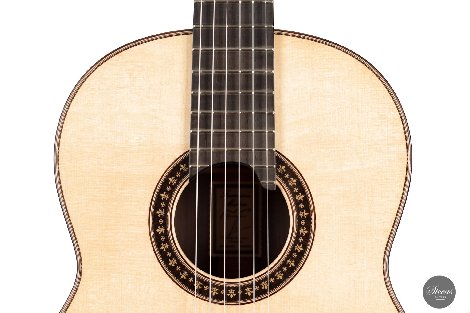 Already the appearance of this stunningly built guitar reveals why this model received an award at the guitar building competition. The instrument is tastefully decorated and the fine inlay work, which was carried out with utmost precision, gives the instrument a gorgeous and unique aesthetic. The sound of this Homenaje model impresses with its powerful and well-balanced sonority. The pleasantly crisp basses support the clear and singing trebles excellently and the playing feel is spot on. All in all, this is a traditionally built guitar of the highest level, which is very versatile and spreads a lot of playing enthusiasm.