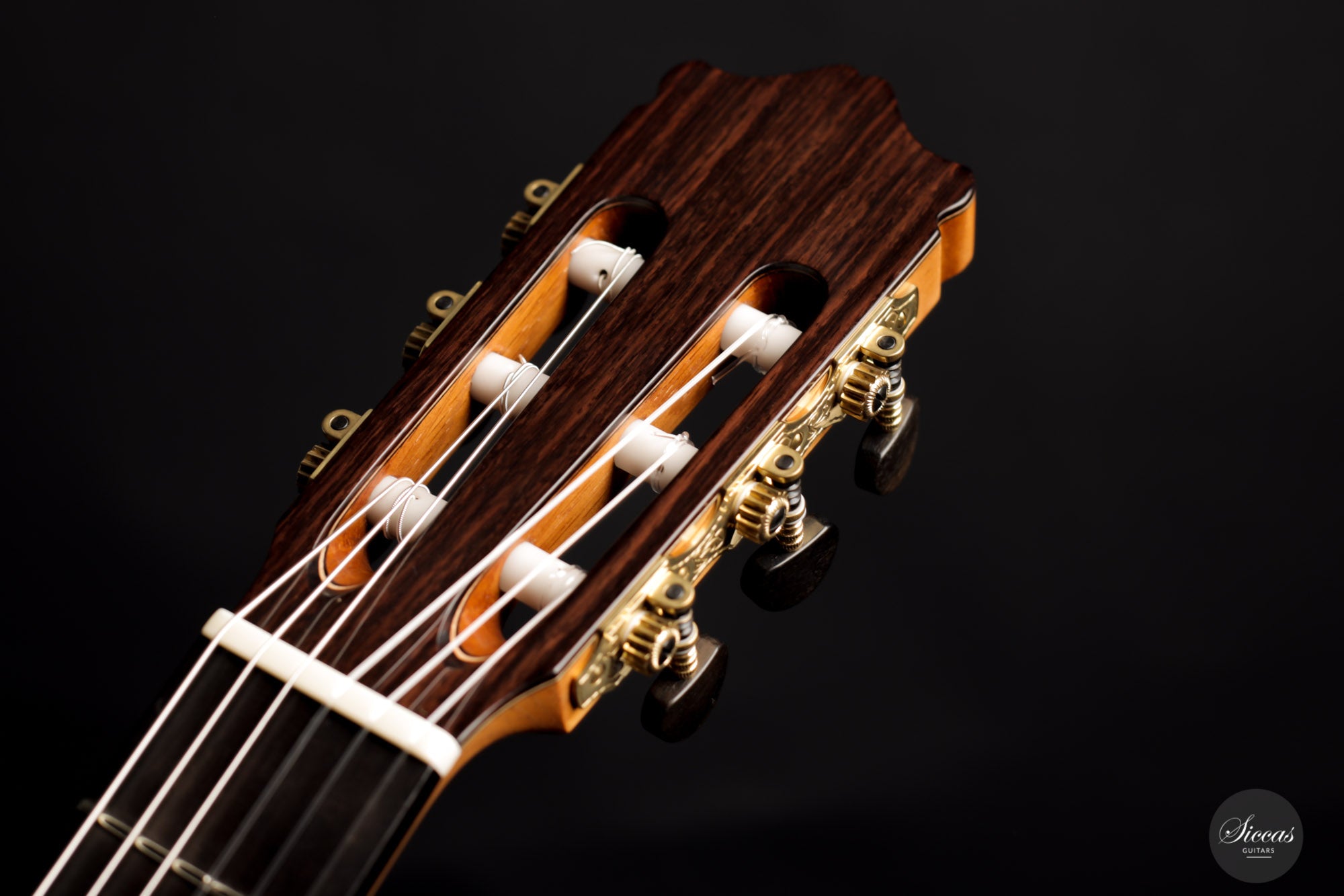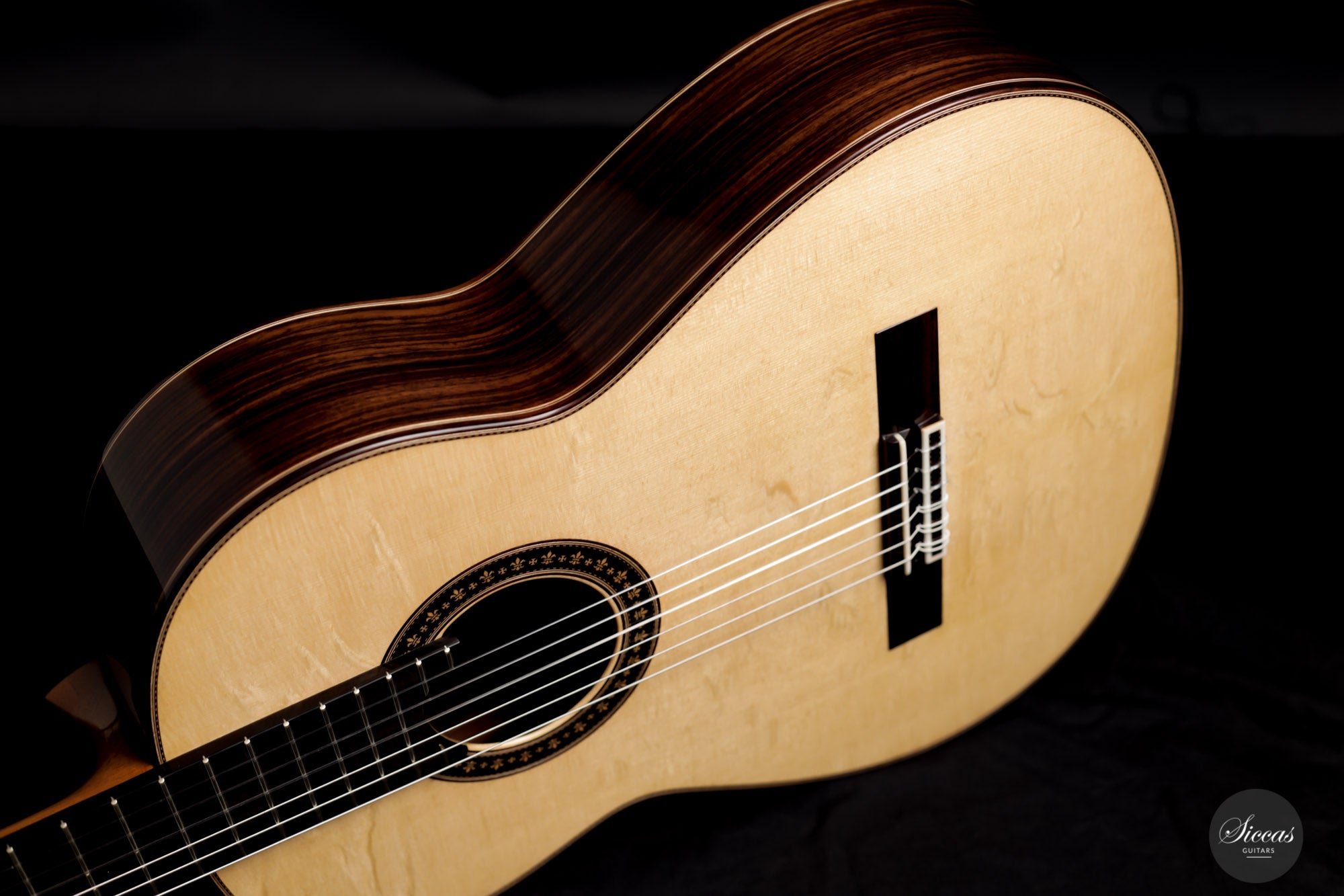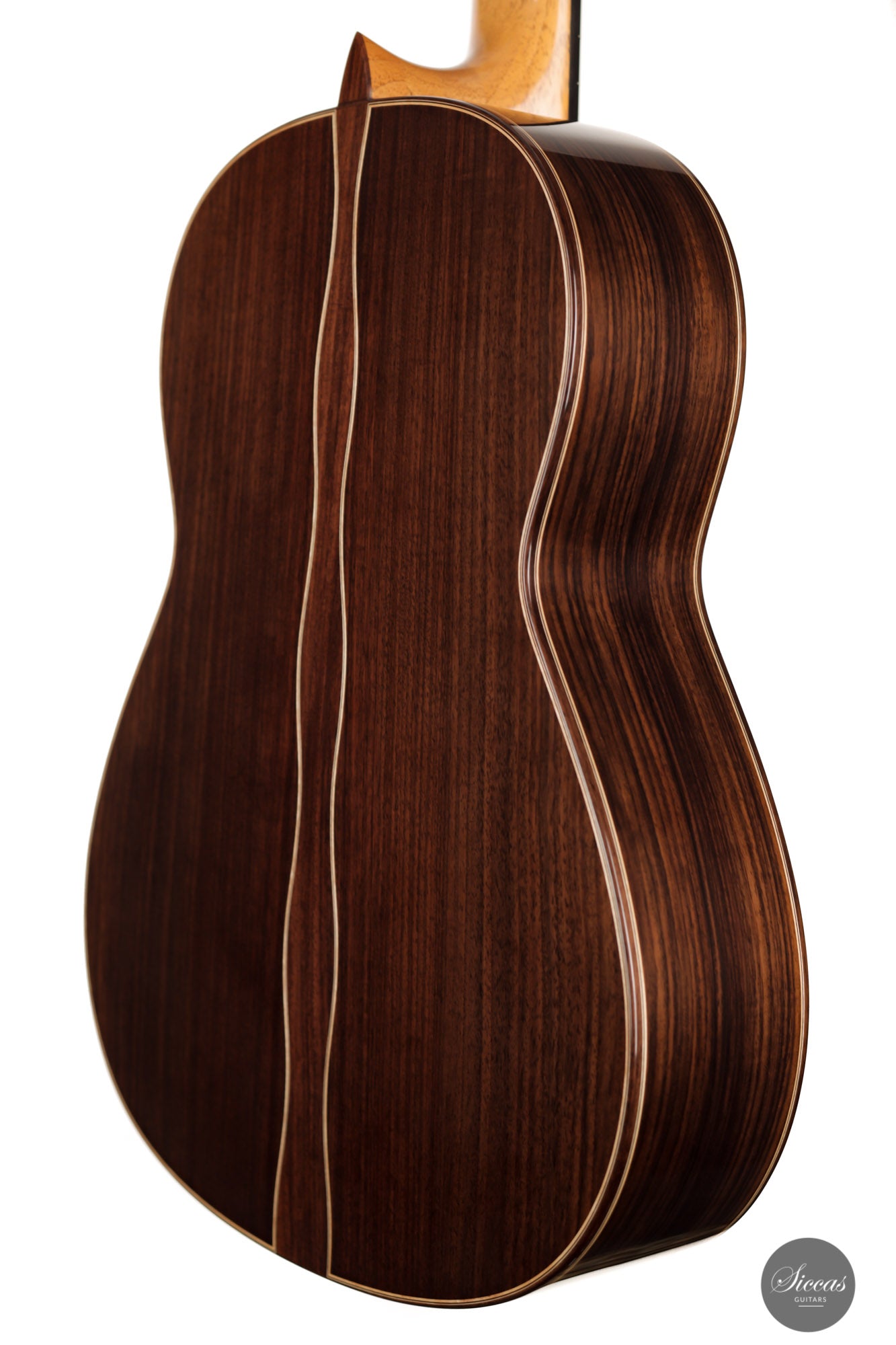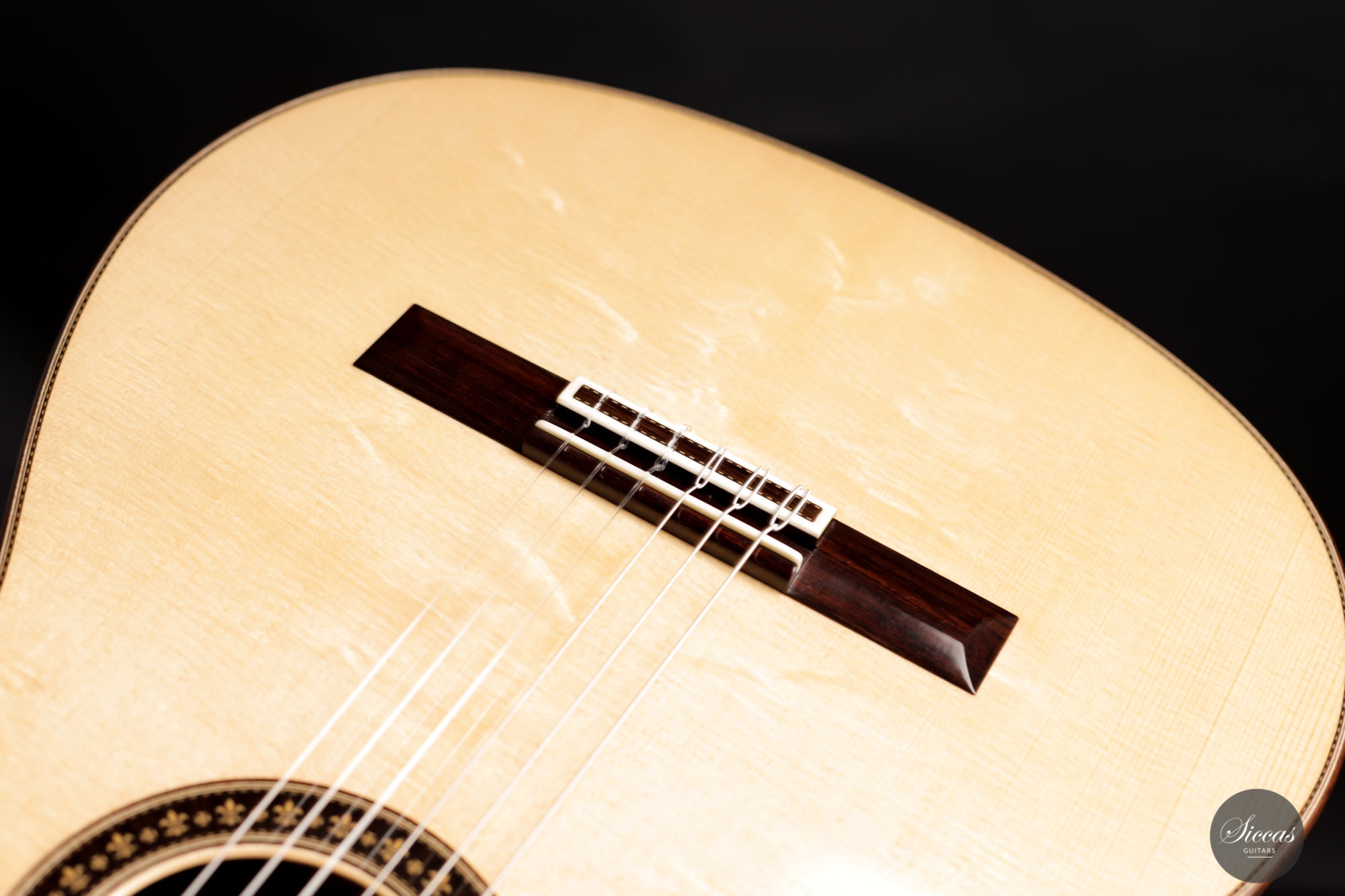 Already the appearance of this stunningly built guitar reveals why this model received an award at the guitar building competition. The instrument is tastefully decorated and the fine inlay work, which was carried out with utmost precision, gives the instrument a gorgeous and unique aesthetic. The sound of this Homenaje model impresses with its powerful and well-balanced sonority. The pleasantly crisp basses support the clear and singing trebles excellently and the playing feel is spot on. All in all, this is a traditionally built guitar of the highest level, which is very versatile and spreads a lot of playing enthusiasm.