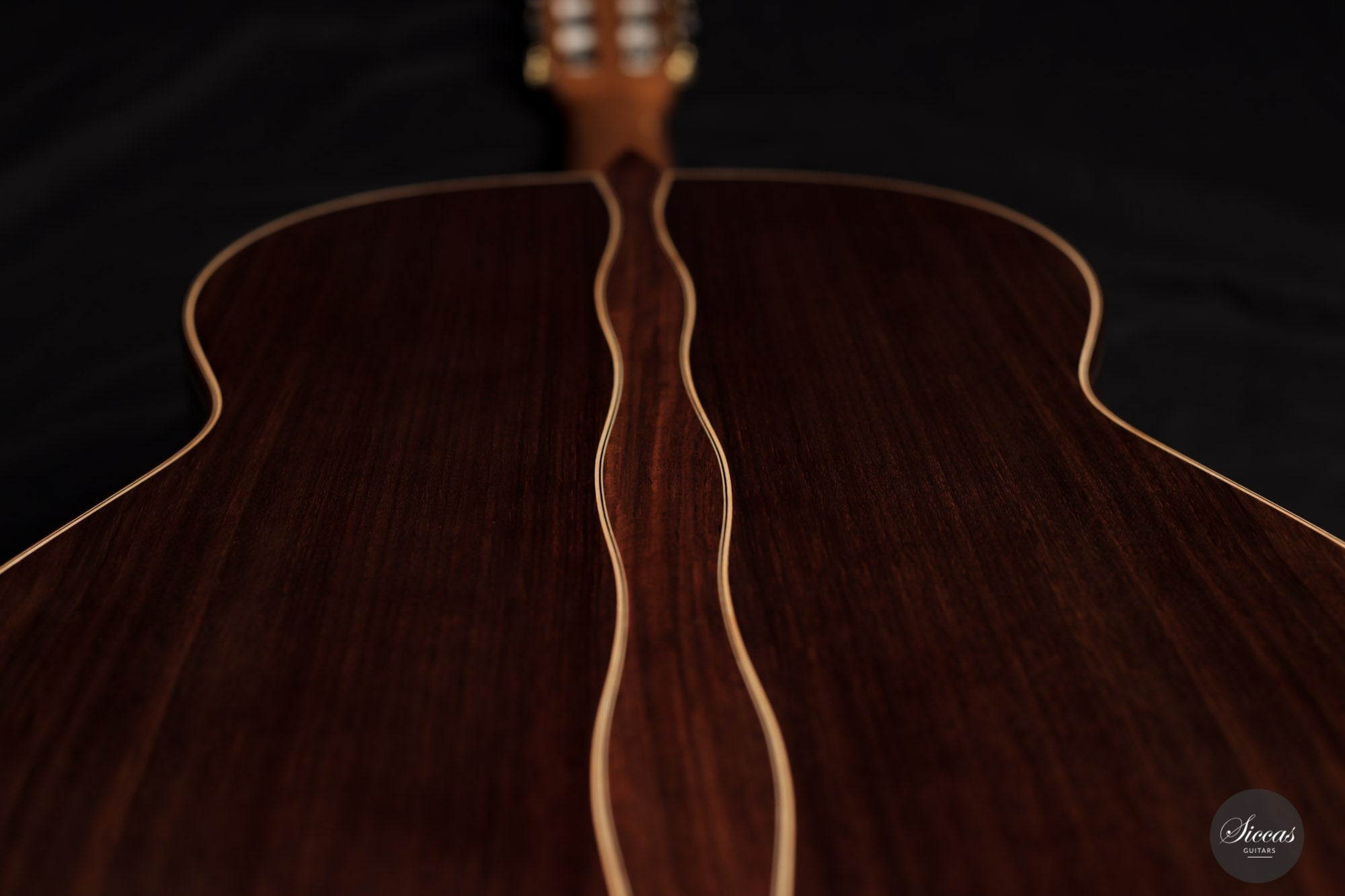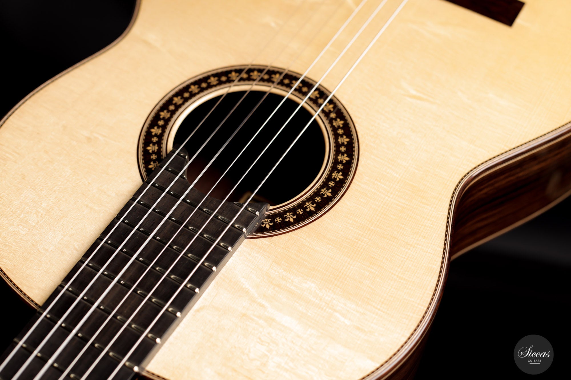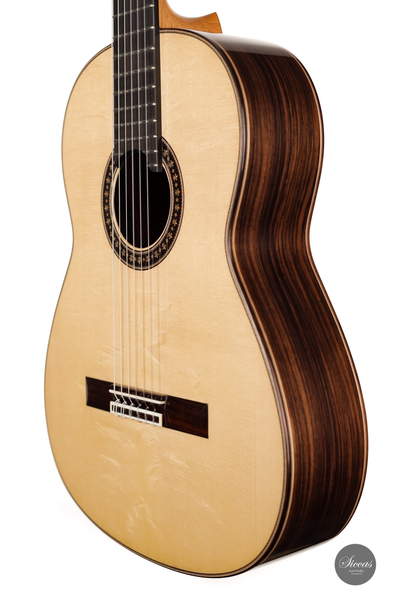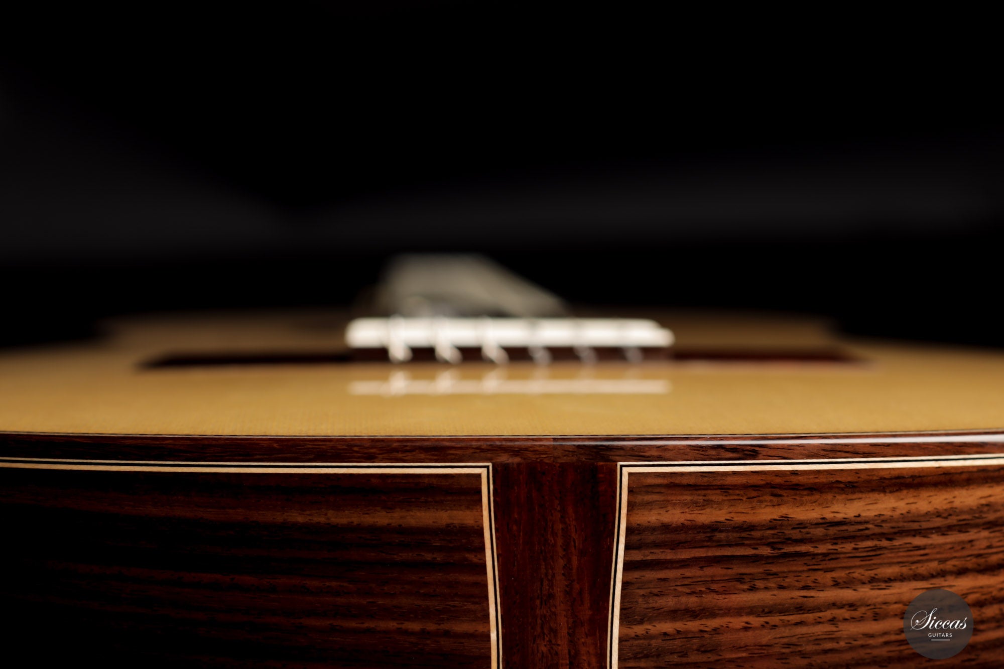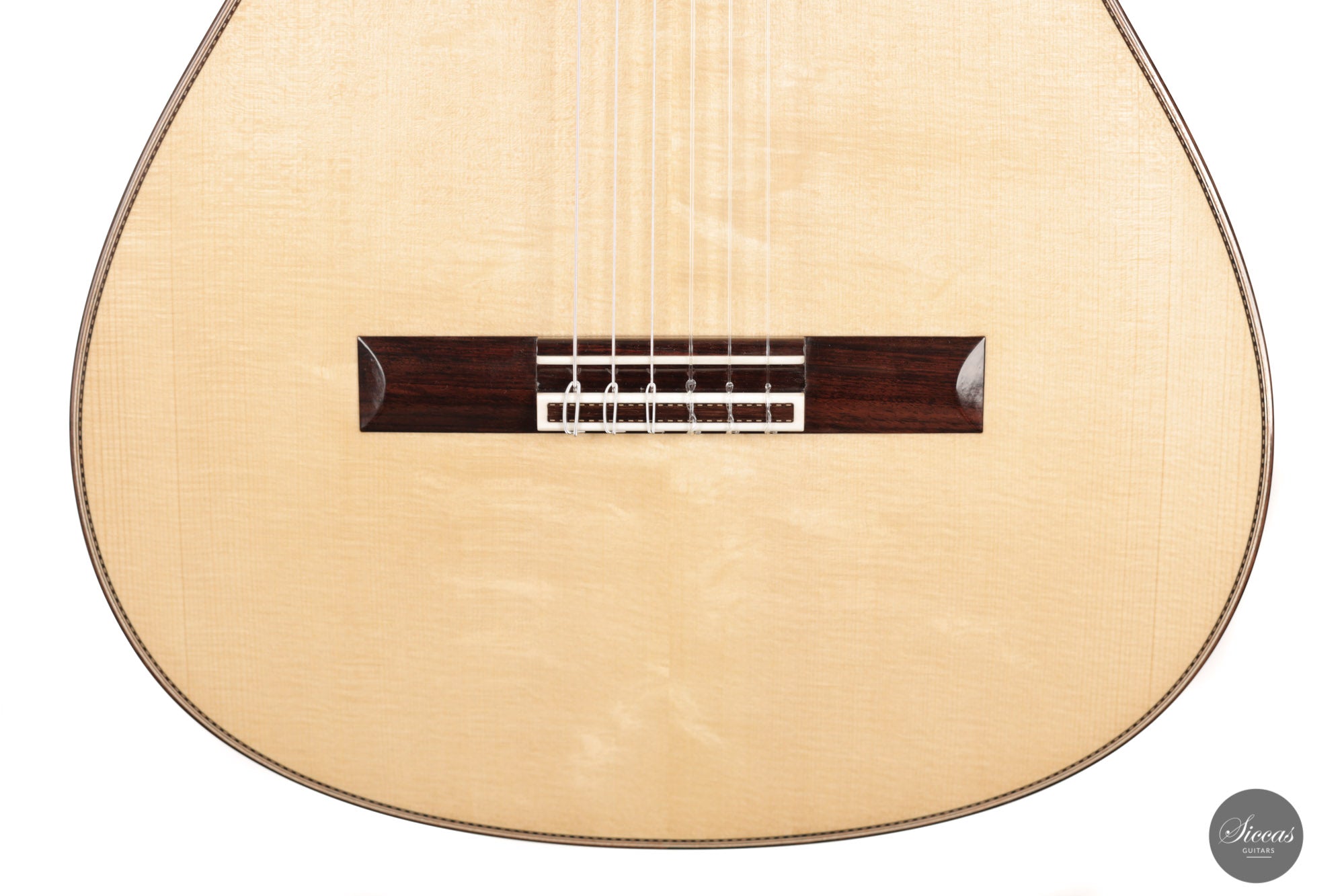 Already the appearance of this stunningly built guitar reveals why this model received an award at the guitar building competition. The instrument is tastefully decorated and the fine inlay work, which was carried out with utmost precision, gives the instrument a gorgeous and unique aesthetic. The sound of this Homenaje model impresses with its powerful and well-balanced sonority. The pleasantly crisp basses support the clear and singing trebles excellently and the playing feel is spot on. All in all, this is a traditionally built guitar of the highest level, which is very versatile and spreads a lot of playing enthusiasm.