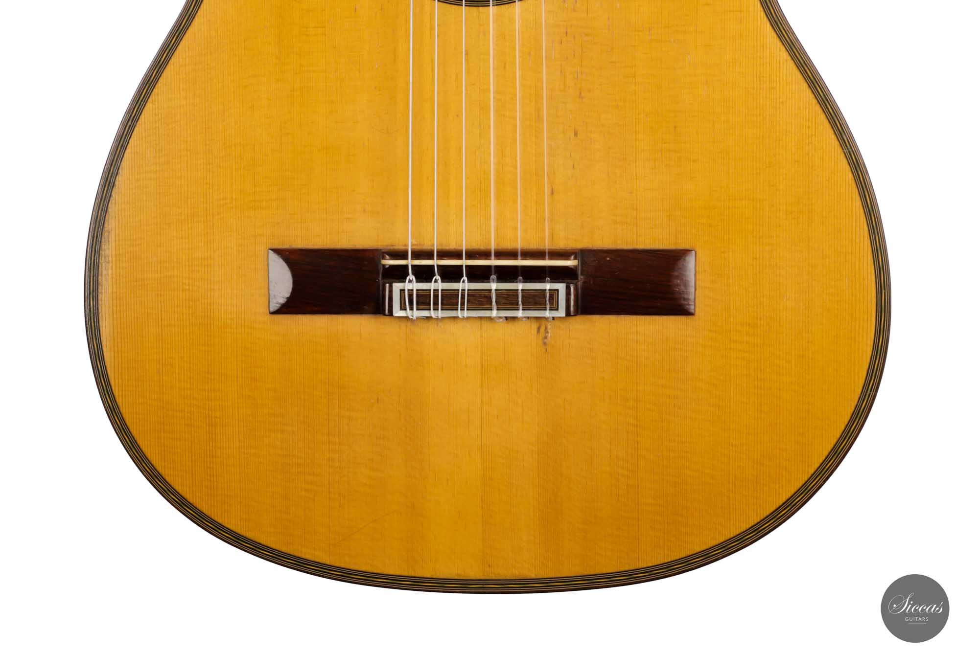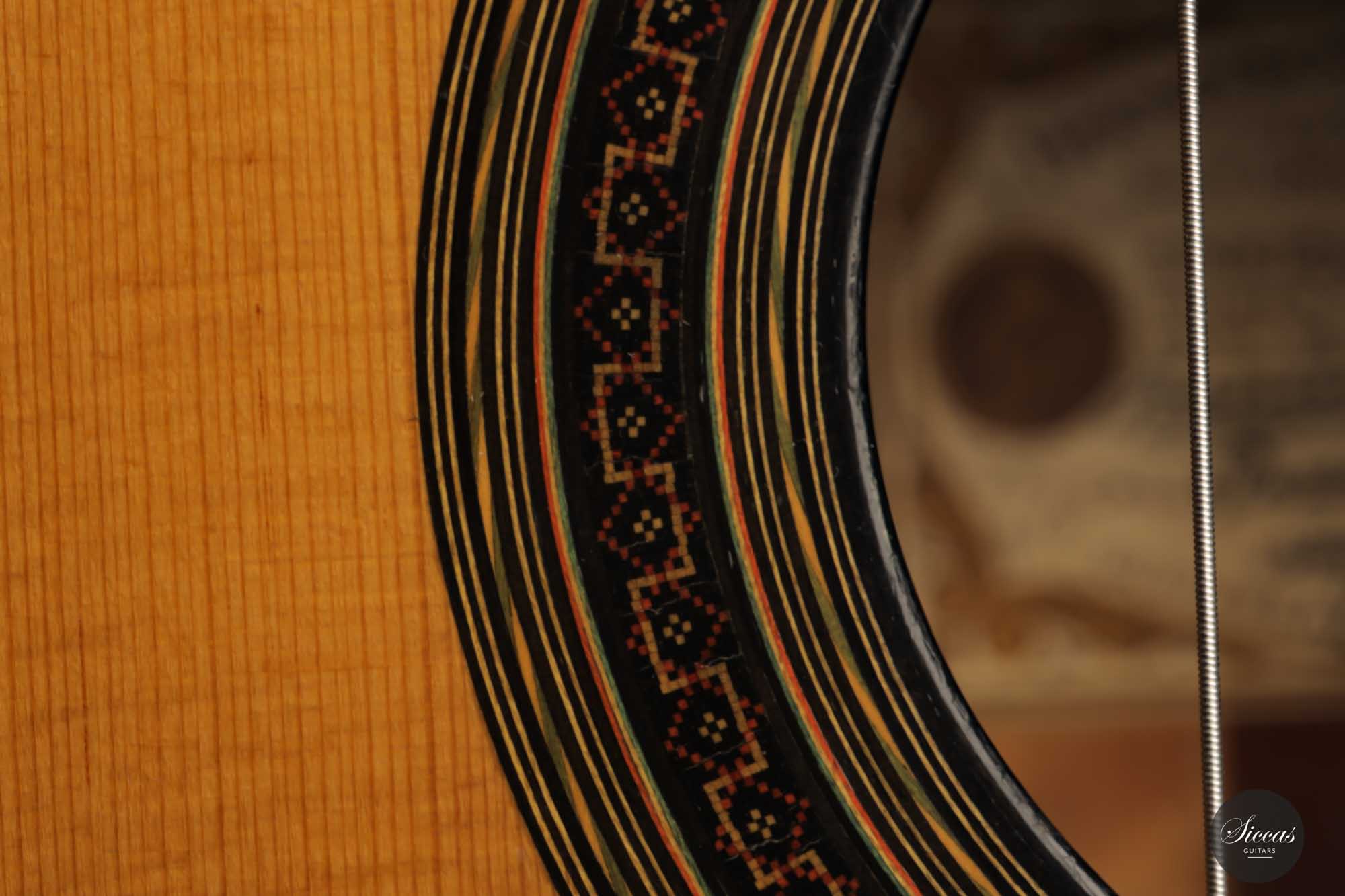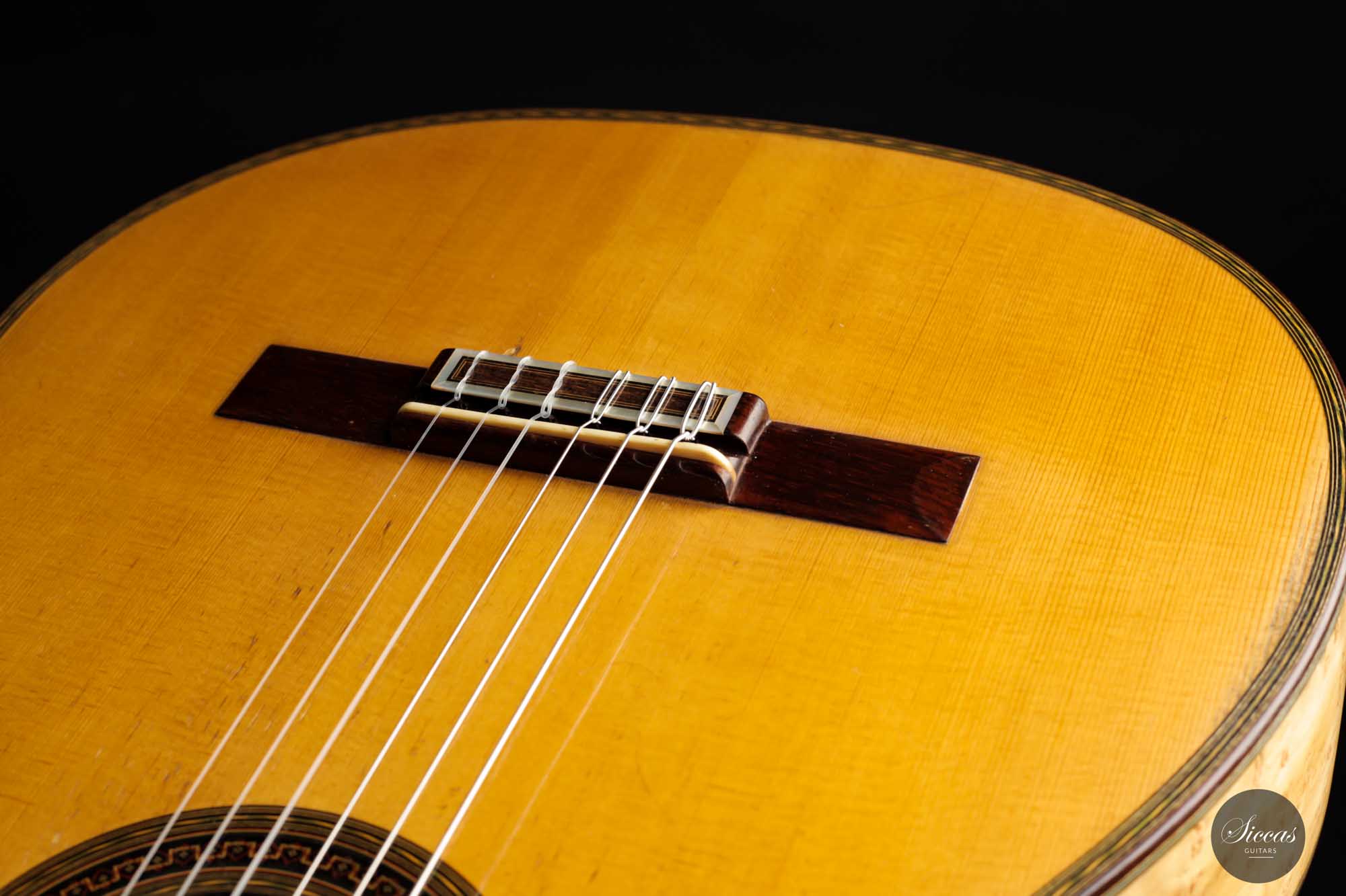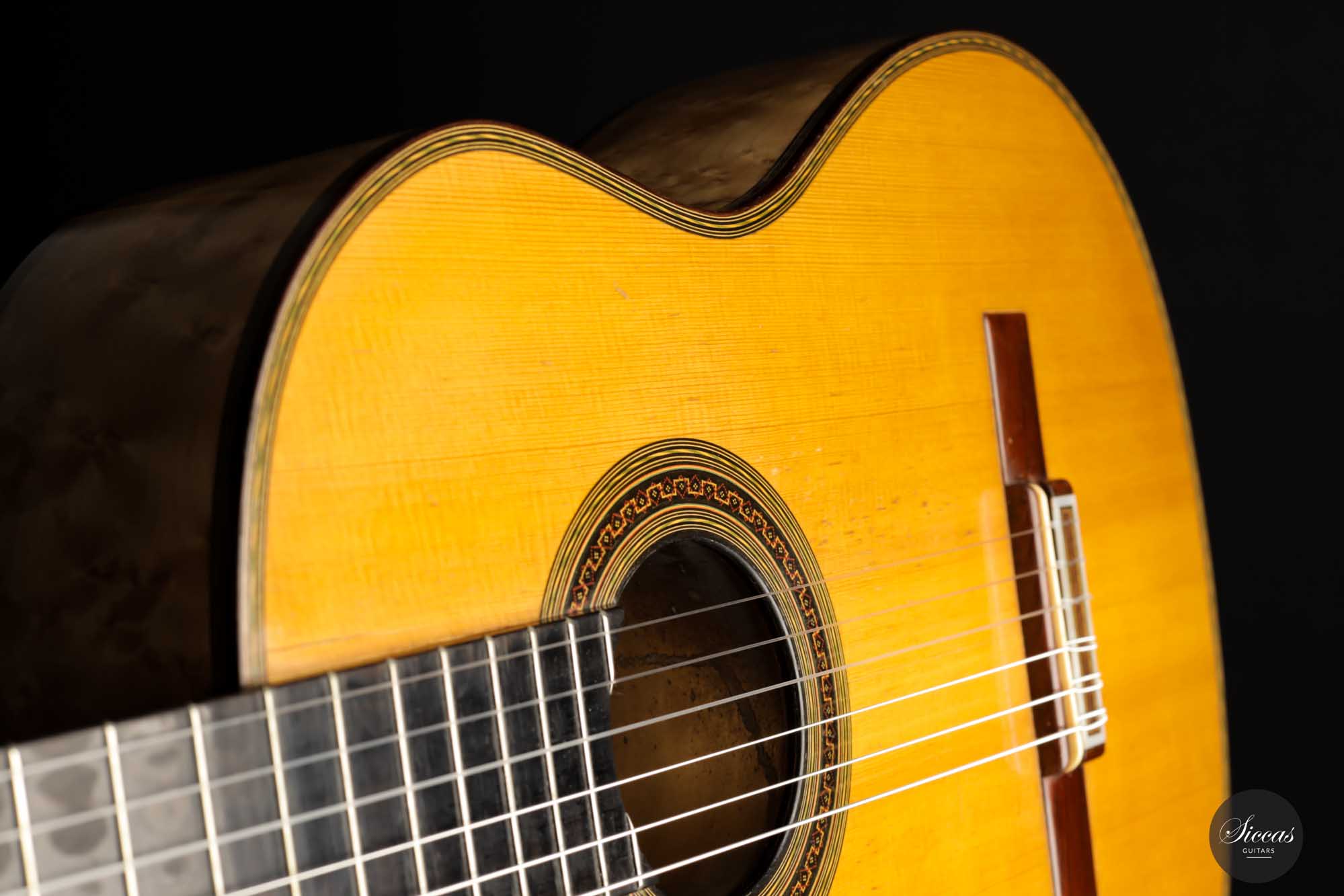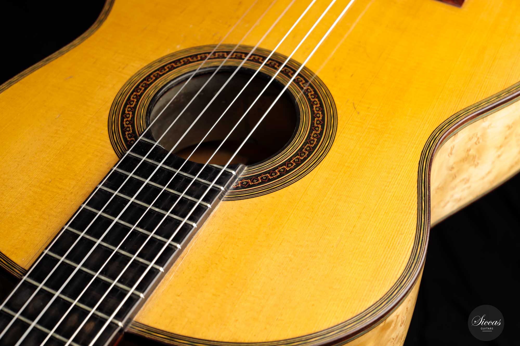 Diese Gitarre mit der Nummer 299, aus dem Jahr 1931 gehört zu den Quintessenzen der Gitarre des 20. Jahrhunderts. Es handelt sich um ein einzigartiges Modell, dessen Geschichte, Zustand und Klang uns geradezu verzaubert. An der wunderschönen Fichtendecke mit ihrer Patina erkennt man höchste Eleganz und eine sehr positive Reifung. Der Boden und die Zargen sind aus markantem Vogelaugenahorn, wobei dies einzige bislang bekannte Simplicio-Gitarre aus Vogelaugenahorn darstellt. Im Laufe ihres Bestehens hat die Gitarre lediglich einen Vorbesitzer gehabt. Darüber hinaus wurde dieses Instrument ursprünglich für Matilde Cuervas, die Frau von Emilio Pujol, gebaut, was in einem der Originalbriefe von Simplicio, die dieser Gitarre beiliegen, dargelegt wird. Ihr Zustand ist spektakulär und vollständig original, wobei sowohl der Originalkoffer als auch alle ursrprünglichen Papieren erhalten geblieben sind. Auf der Decke befinden sich drei kleine reparierte Risse an typischen Stellen: auf jeder Seite des Griffbretts und an der Deckenfuge. Am Boden sind zwei feine reparierte Risse zu finden, was aber bei dem ansonsten hervorragenden Erhaltungszustand nicht weiter ins Gewicht fällt. Dieses Instrument bringt die ganze Raffinesse akustischer Qualität auf brillante Weise zum Ausdruck. Mit ihrem eindrucksvollen Klang aus längst vergangenen Tagen, ihrer außergewöhnlichen Projektion und Kraft, und ihrer sehr bequemen Bespielbarkeit ist diese Gitarre ein einzigartiges und kostbares Erbe für die Gitarrenwelt.