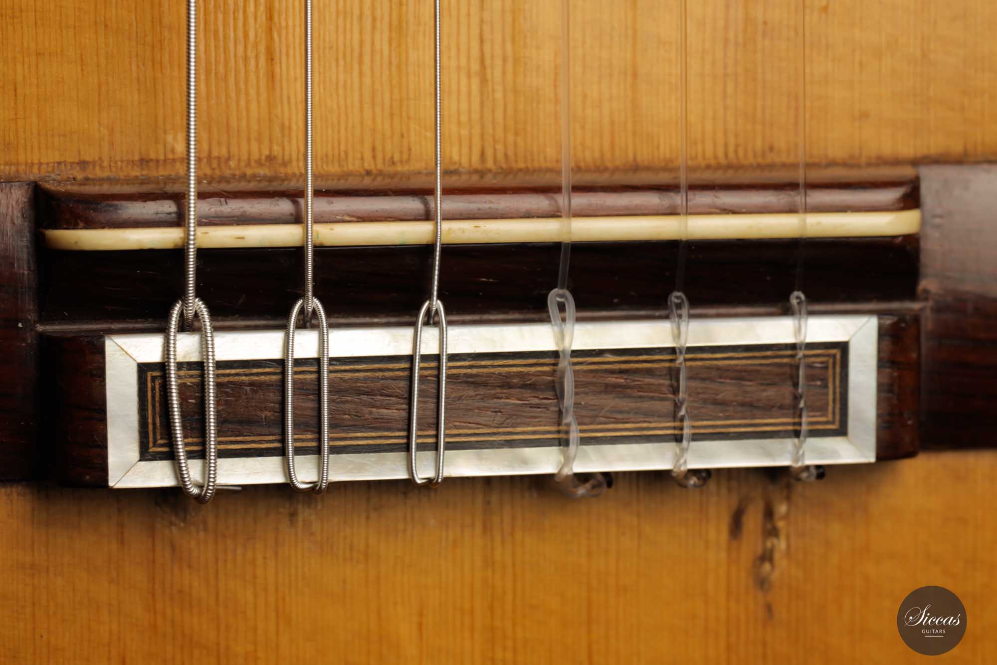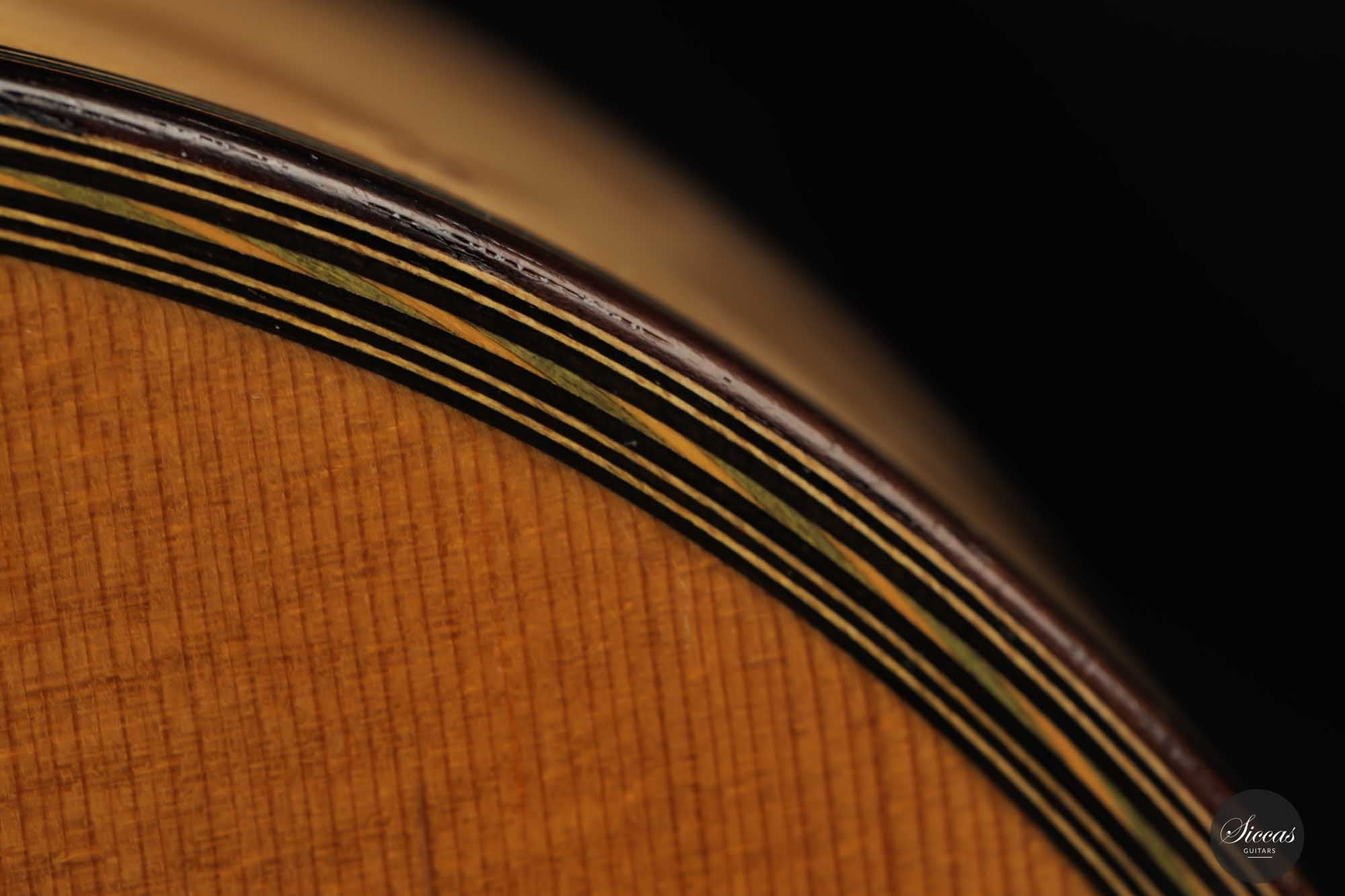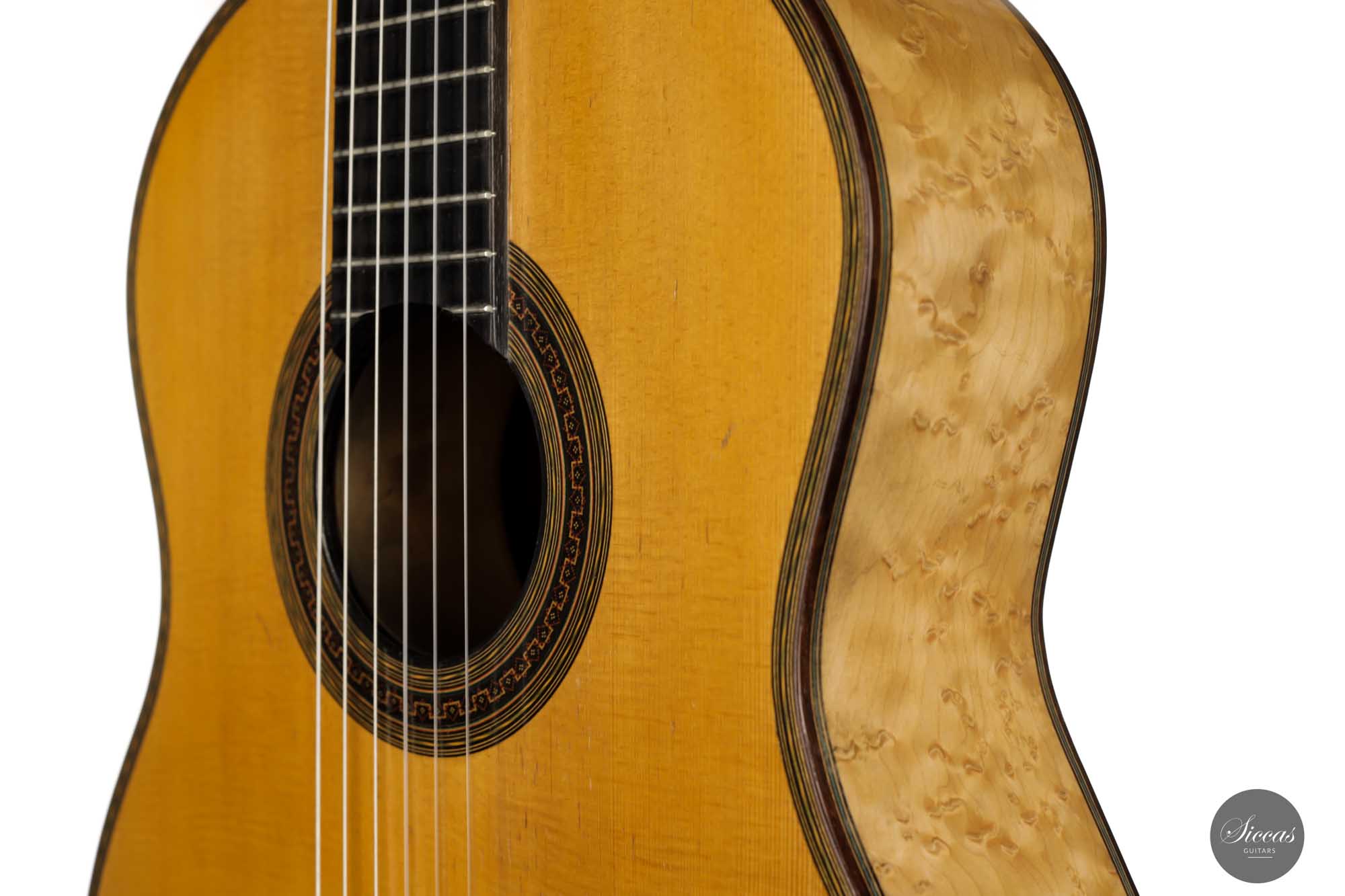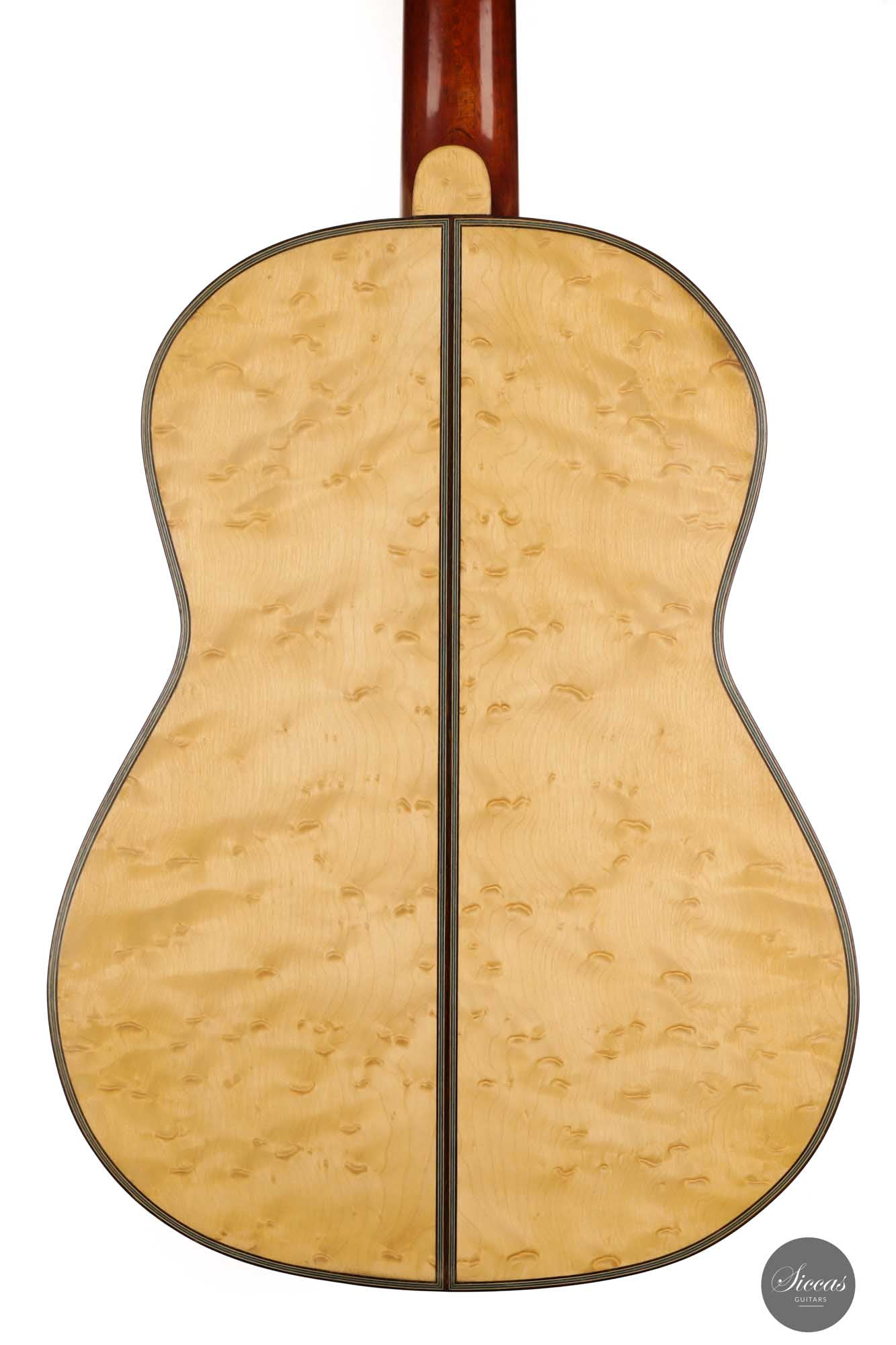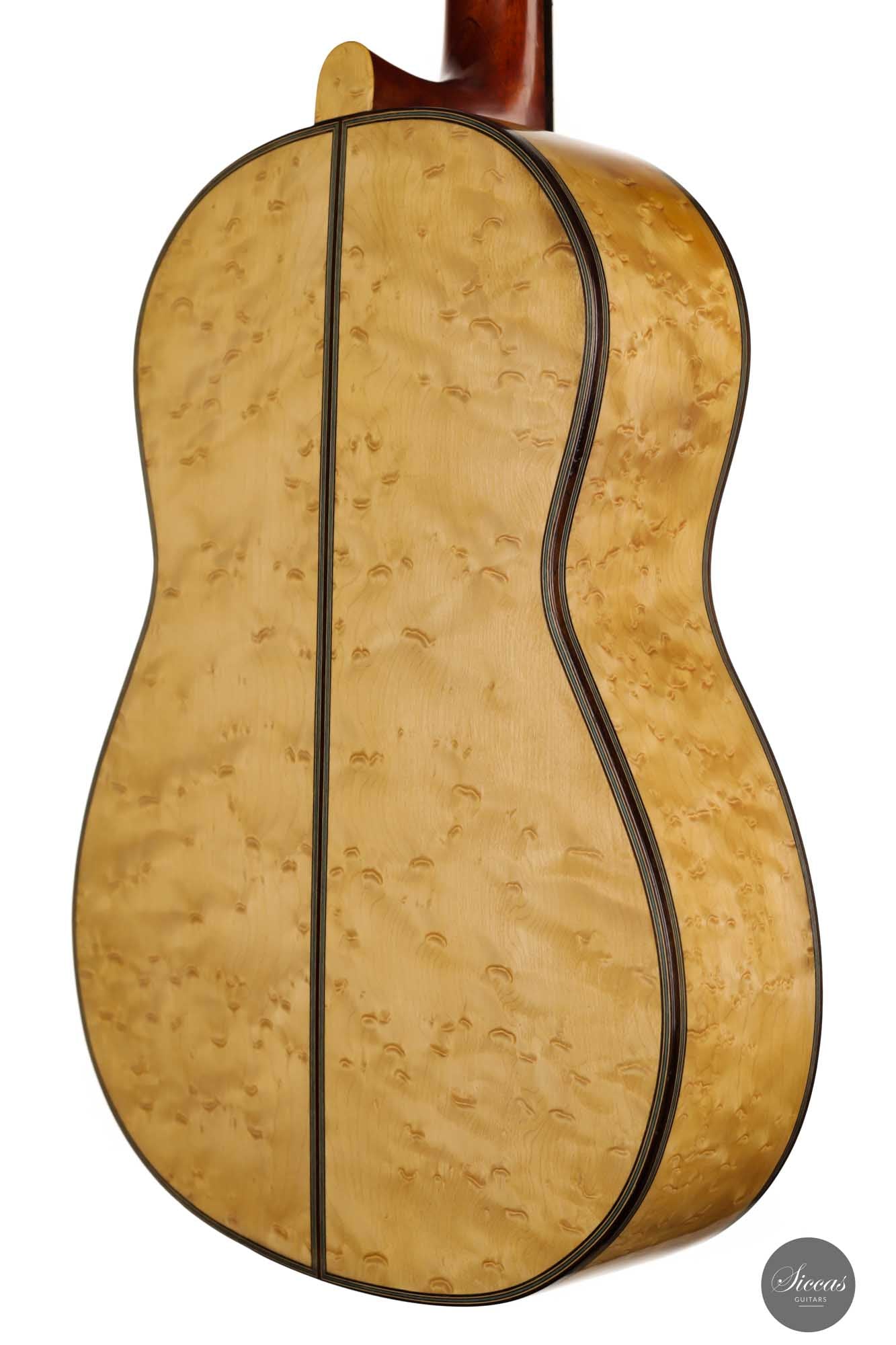 Diese Gitarre mit der Nummer 299, aus dem Jahr 1931 gehört zu den Quintessenzen der Gitarre des 20. Jahrhunderts. Es handelt sich um ein einzigartiges Modell, dessen Geschichte, Zustand und Klang uns geradezu verzaubert. An der wunderschönen Fichtendecke mit ihrer Patina erkennt man höchste Eleganz und eine sehr positive Reifung. Der Boden und die Zargen sind aus markantem Vogelaugenahorn, wobei dies einzige bislang bekannte Simplicio-Gitarre aus Vogelaugenahorn darstellt. Im Laufe ihres Bestehens hat die Gitarre lediglich einen Vorbesitzer gehabt. Darüber hinaus wurde dieses Instrument ursprünglich für Matilde Cuervas, die Frau von Emilio Pujol, gebaut, was in einem der Originalbriefe von Simplicio, die dieser Gitarre beiliegen, dargelegt wird. Ihr Zustand ist spektakulär und vollständig original, wobei sowohl der Originalkoffer als auch alle ursrprünglichen Papieren erhalten geblieben sind. Auf der Decke befinden sich drei kleine reparierte Risse an typischen Stellen: auf jeder Seite des Griffbretts und an der Deckenfuge. Am Boden sind zwei feine reparierte Risse zu finden, was aber bei dem ansonsten hervorragenden Erhaltungszustand nicht weiter ins Gewicht fällt. Dieses Instrument bringt die ganze Raffinesse akustischer Qualität auf brillante Weise zum Ausdruck. Mit ihrem eindrucksvollen Klang aus längst vergangenen Tagen, ihrer außergewöhnlichen Projektion und Kraft, und ihrer sehr bequemen Bespielbarkeit ist diese Gitarre ein einzigartiges und kostbares Erbe für die Gitarrenwelt.