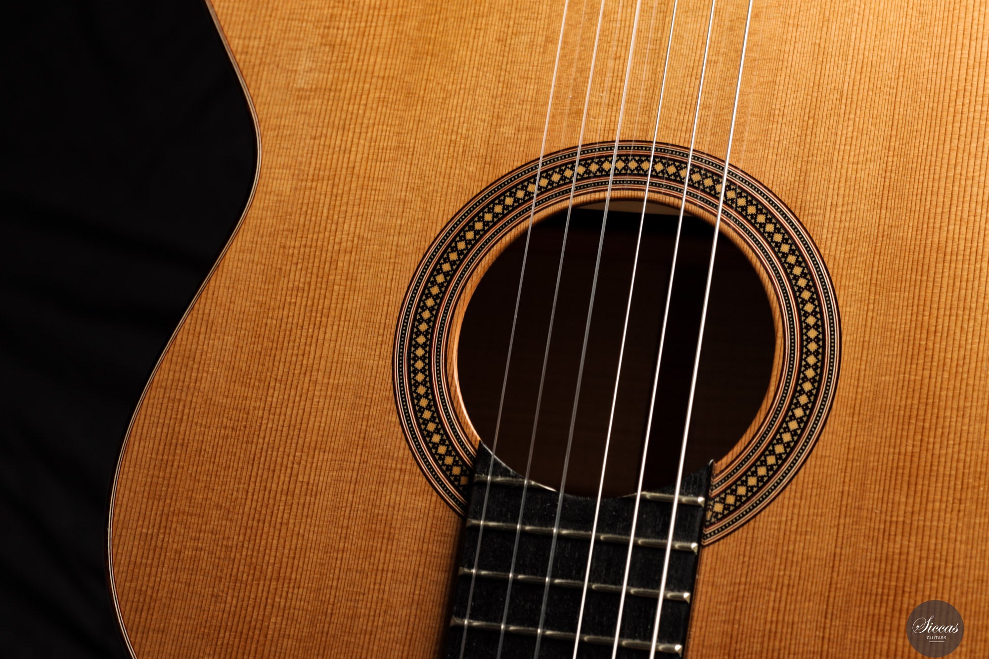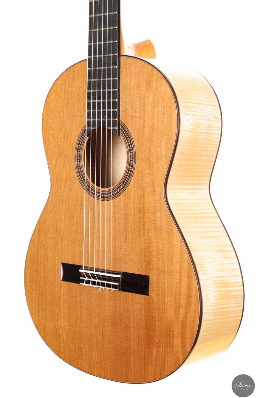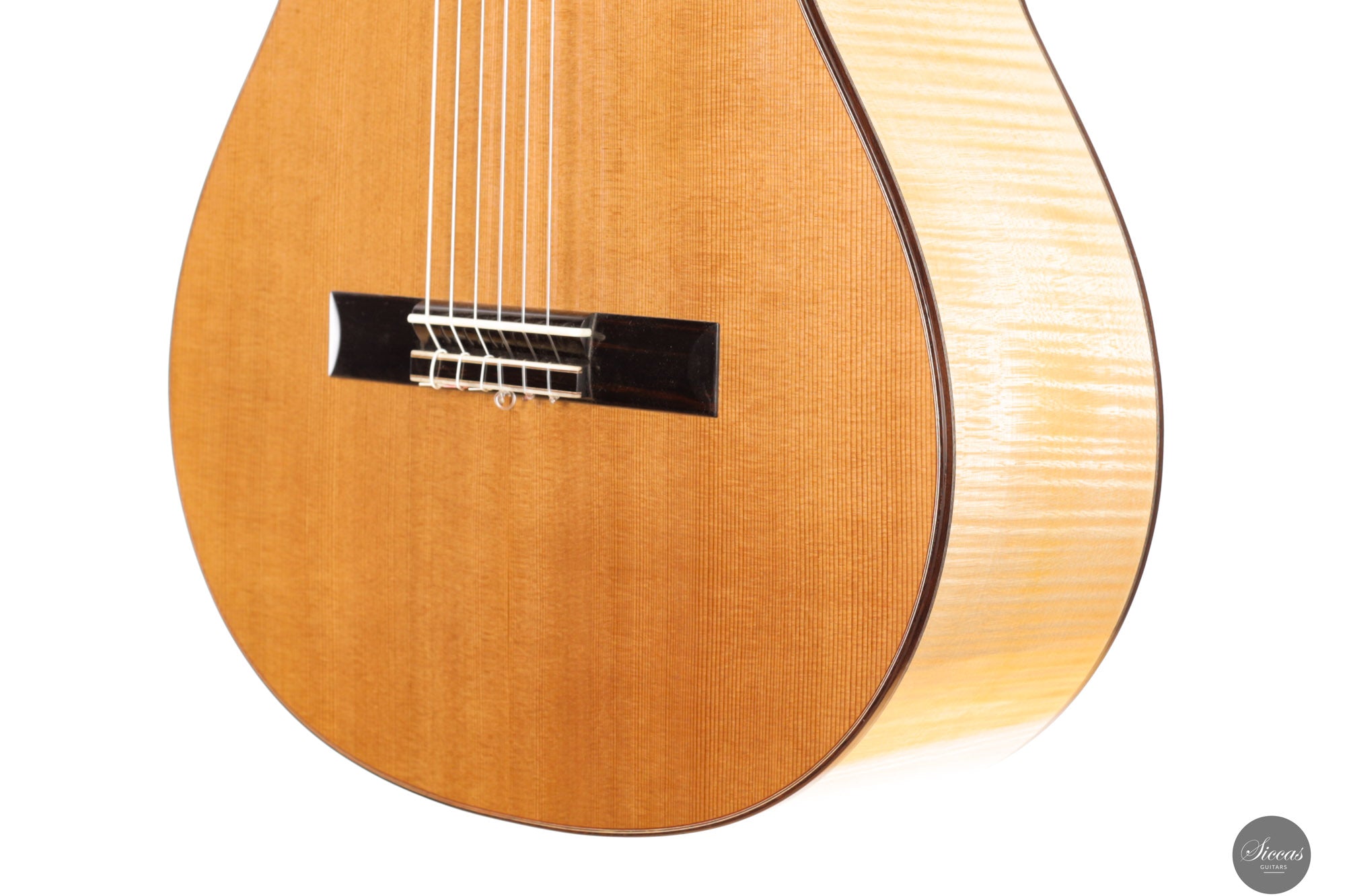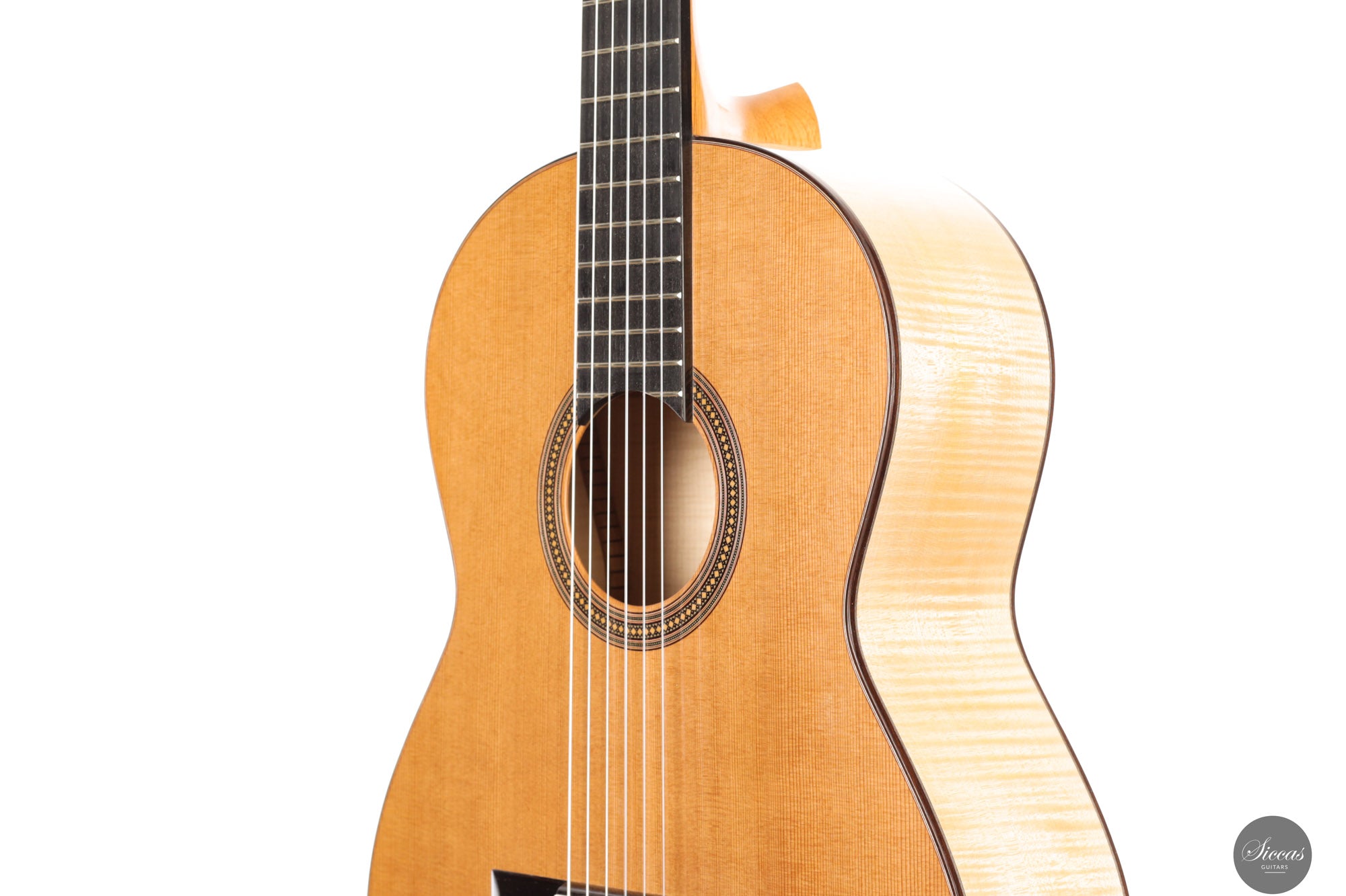 Diese Gitarre Nr. 105 aus dem Jahr 2025 ist ein sowohl optisch als auch klanglich außergewöhnliches Instrument. Die Kombination aus einer Zederndecke und geflammtem Ahorn für Boden und Zargen ist selten und erzeugt nicht nur eine markante Erscheinung, sondern auch einen unverwechselbaren Klangcharakter. Der Ton ist reich an Obertönen, von langer Tragfähigkeit und mit singenden, mühelos projizierenden Höhen. Das Instrument verfügt über eine moderate Ansprache und eine beachtliche Lautstärke, was es besonders vielseitig und ausdrucksstark macht. Dank der lattice-Verstrebung, dem Schellack-Finish und der kompakten 640-mm-Mensur bietet diese Gitarre eine hervorragende Mischung aus Reaktionsfreudigkeit, Spielkomfort und Charakterstärke.