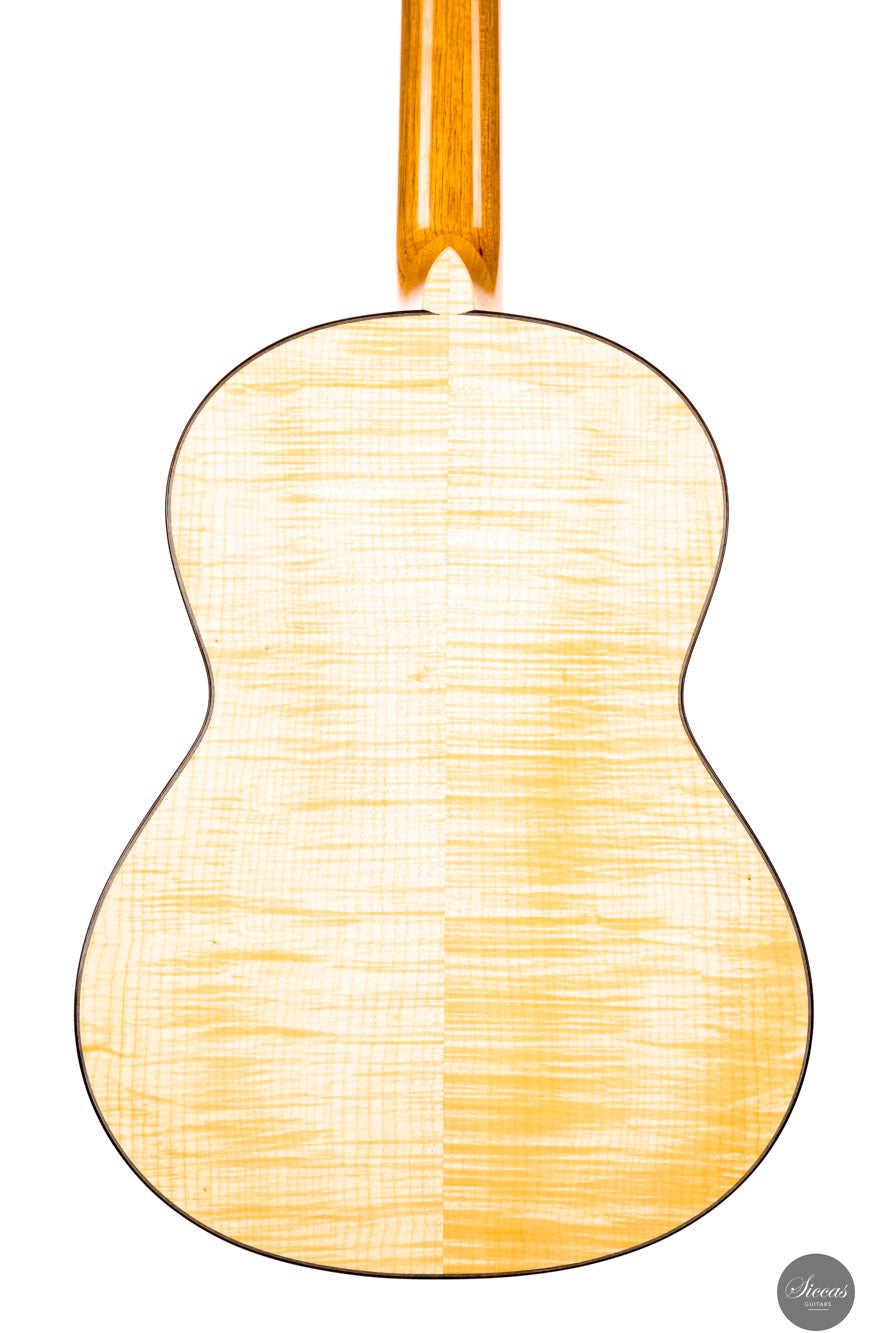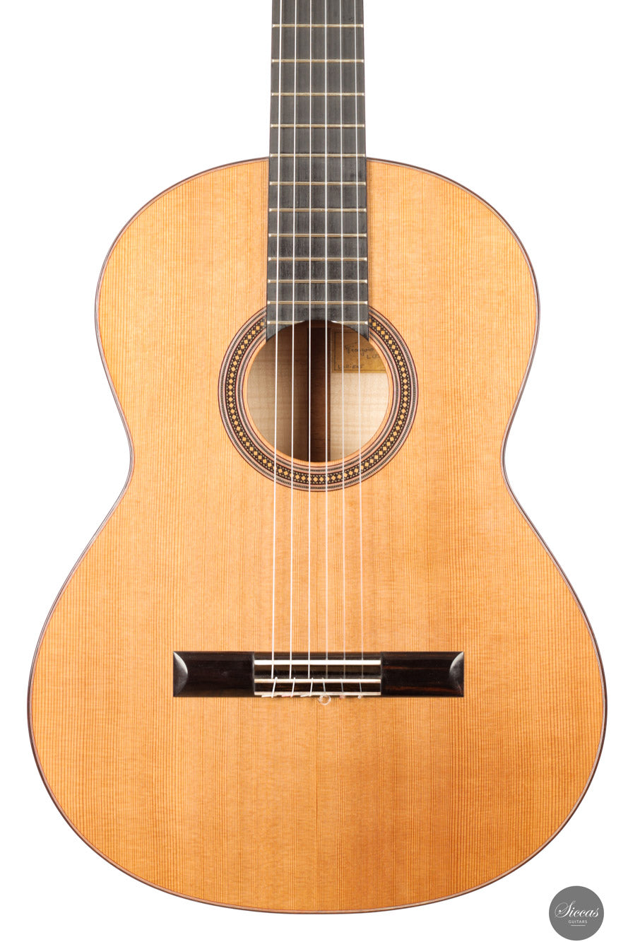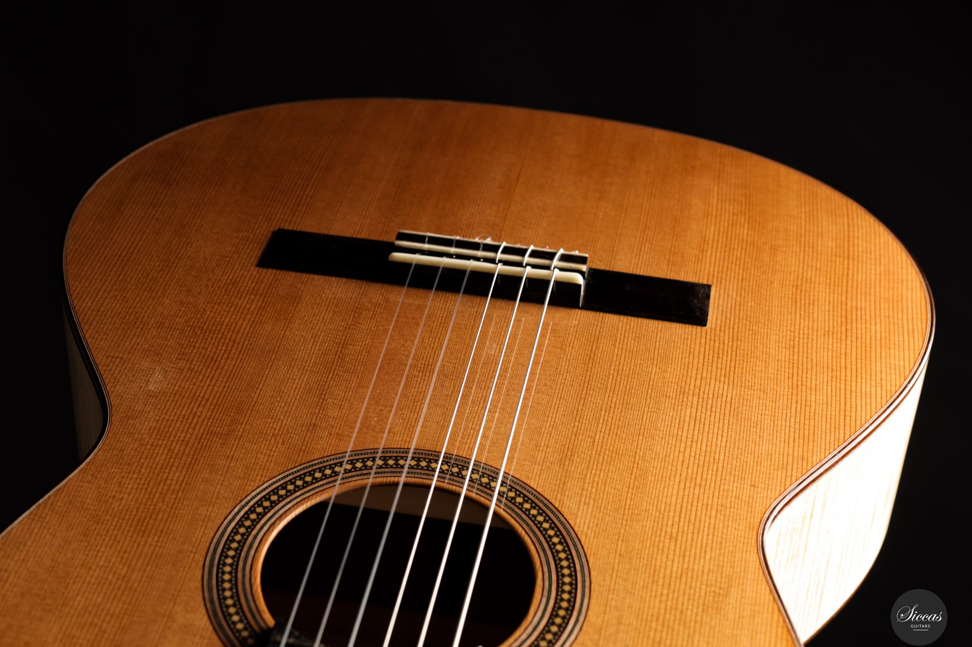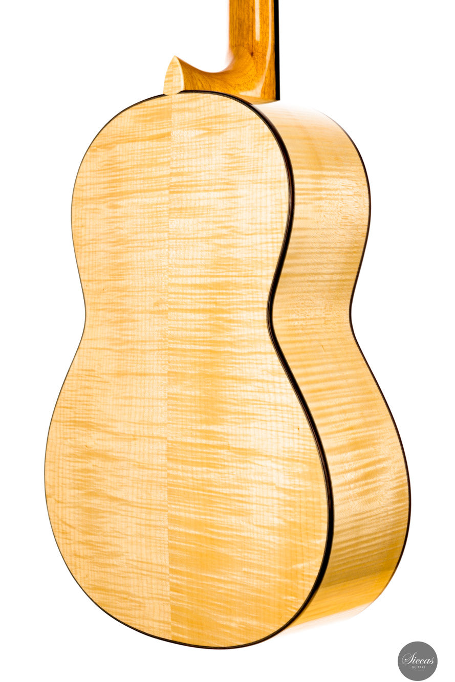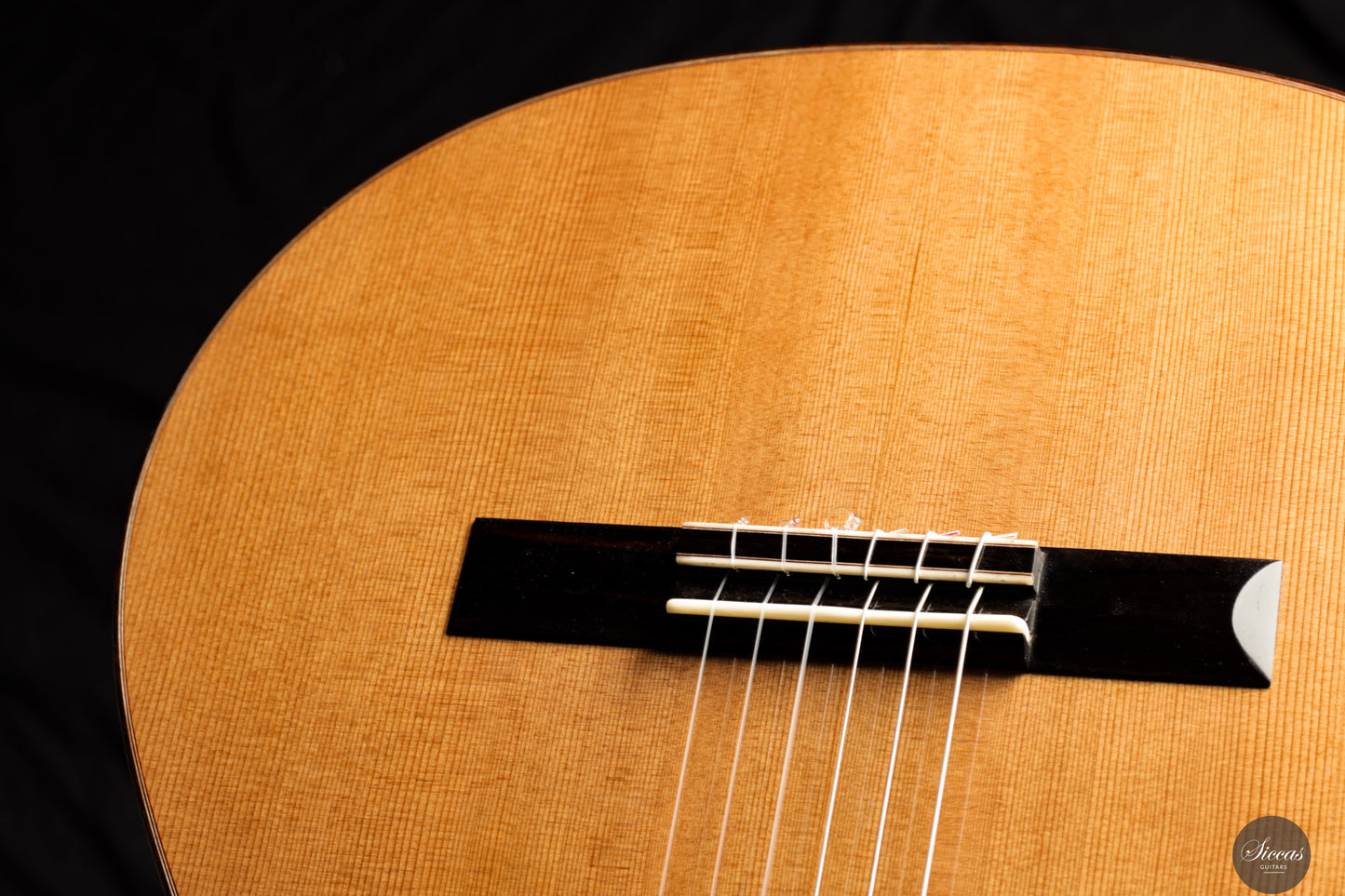Diese Gitarre Nr. 105 aus dem Jahr 2025 ist ein sowohl optisch als auch klanglich außergewöhnliches Instrument. Die Kombination aus einer Zederndecke und geflammtem Ahorn für Boden und Zargen ist selten und erzeugt nicht nur eine markante Erscheinung, sondern auch einen unverwechselbaren Klangcharakter. Der Ton ist reich an Obertönen, von langer Tragfähigkeit und mit singenden, mühelos projizierenden Höhen. Das Instrument verfügt über eine moderate Ansprache und eine beachtliche Lautstärke, was es besonders vielseitig und ausdrucksstark macht. Dank der lattice-Verstrebung, dem Schellack-Finish und der kompakten 640-mm-Mensur bietet diese Gitarre eine hervorragende Mischung aus Reaktionsfreudigkeit, Spielkomfort und Charakterstärke.