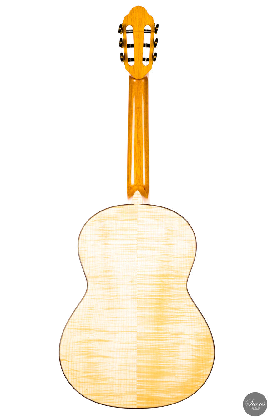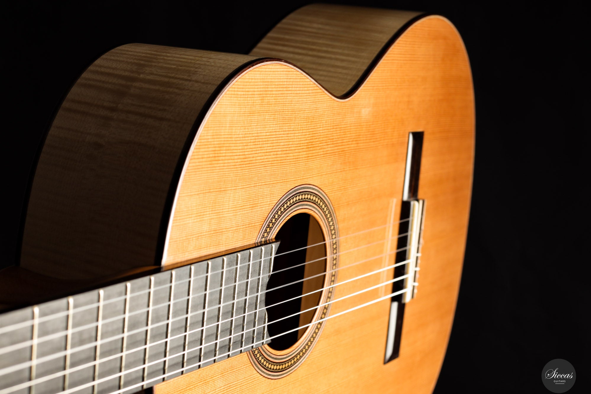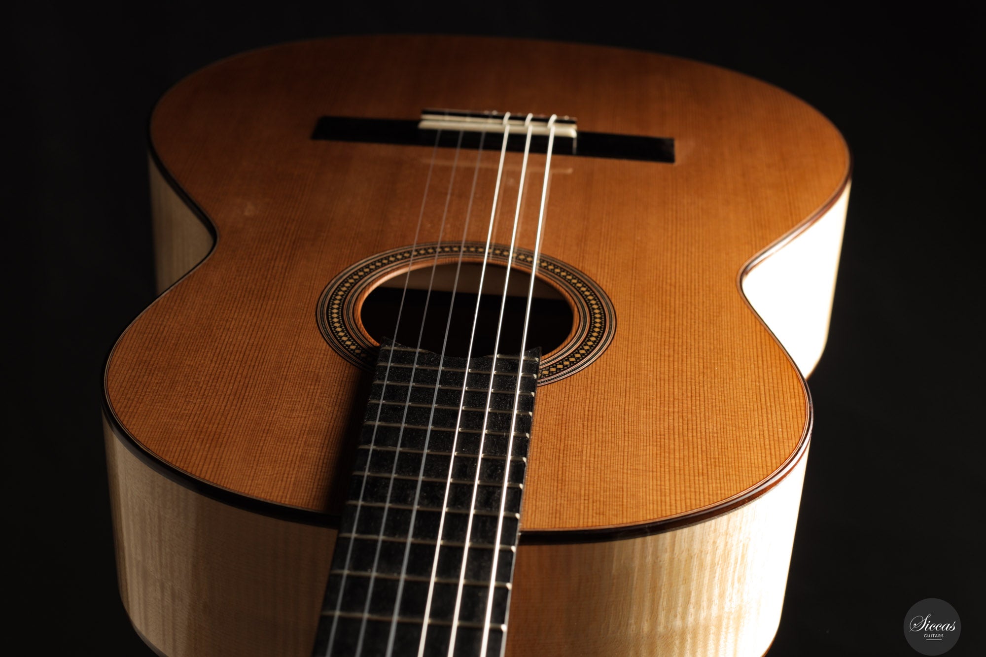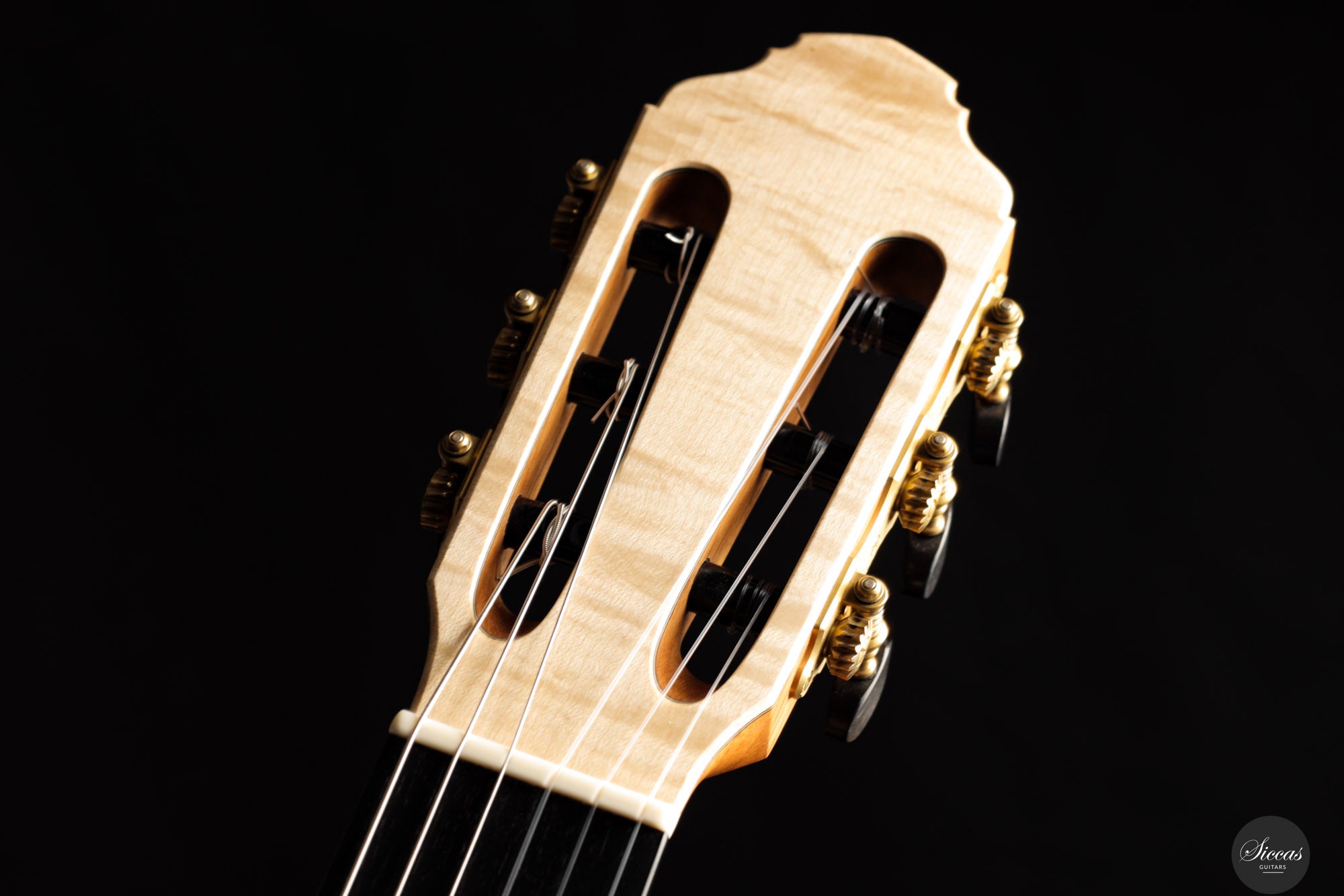 Diese Gitarre Nr. 105 aus dem Jahr 2025 ist ein sowohl optisch als auch klanglich außergewöhnliches Instrument. Die Kombination aus einer Zederndecke und geflammtem Ahorn für Boden und Zargen ist selten und erzeugt nicht nur eine markante Erscheinung, sondern auch einen unverwechselbaren Klangcharakter. Der Ton ist reich an Obertönen, von langer Tragfähigkeit und mit singenden, mühelos projizierenden Höhen. Das Instrument verfügt über eine moderate Ansprache und eine beachtliche Lautstärke, was es besonders vielseitig und ausdrucksstark macht. Dank der lattice-Verstrebung, dem Schellack-Finish und der kompakten 640-mm-Mensur bietet diese Gitarre eine hervorragende Mischung aus Reaktionsfreudigkeit, Spielkomfort und Charakterstärke.