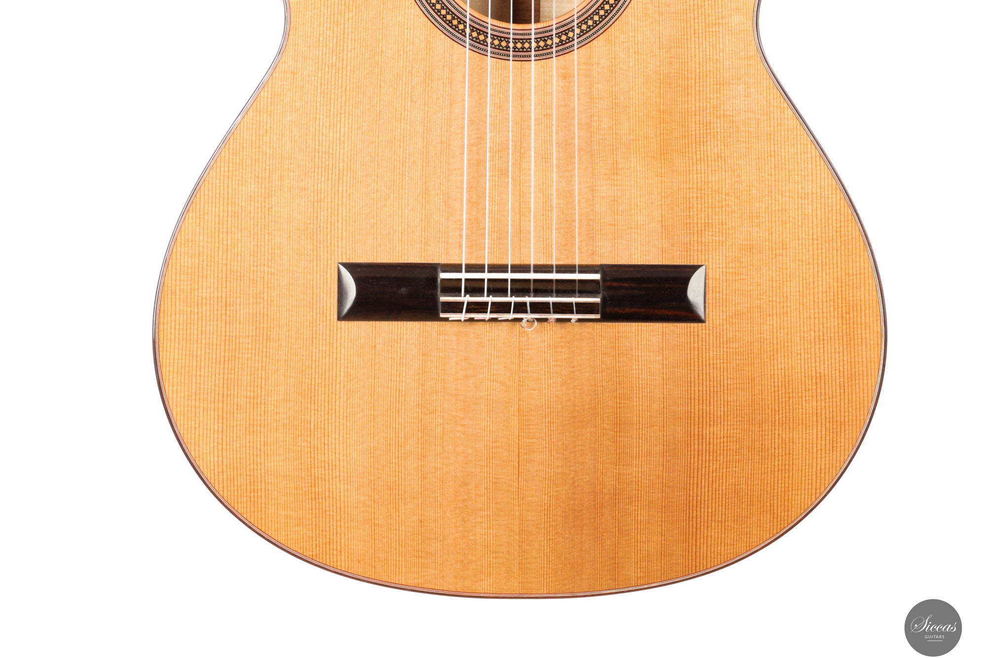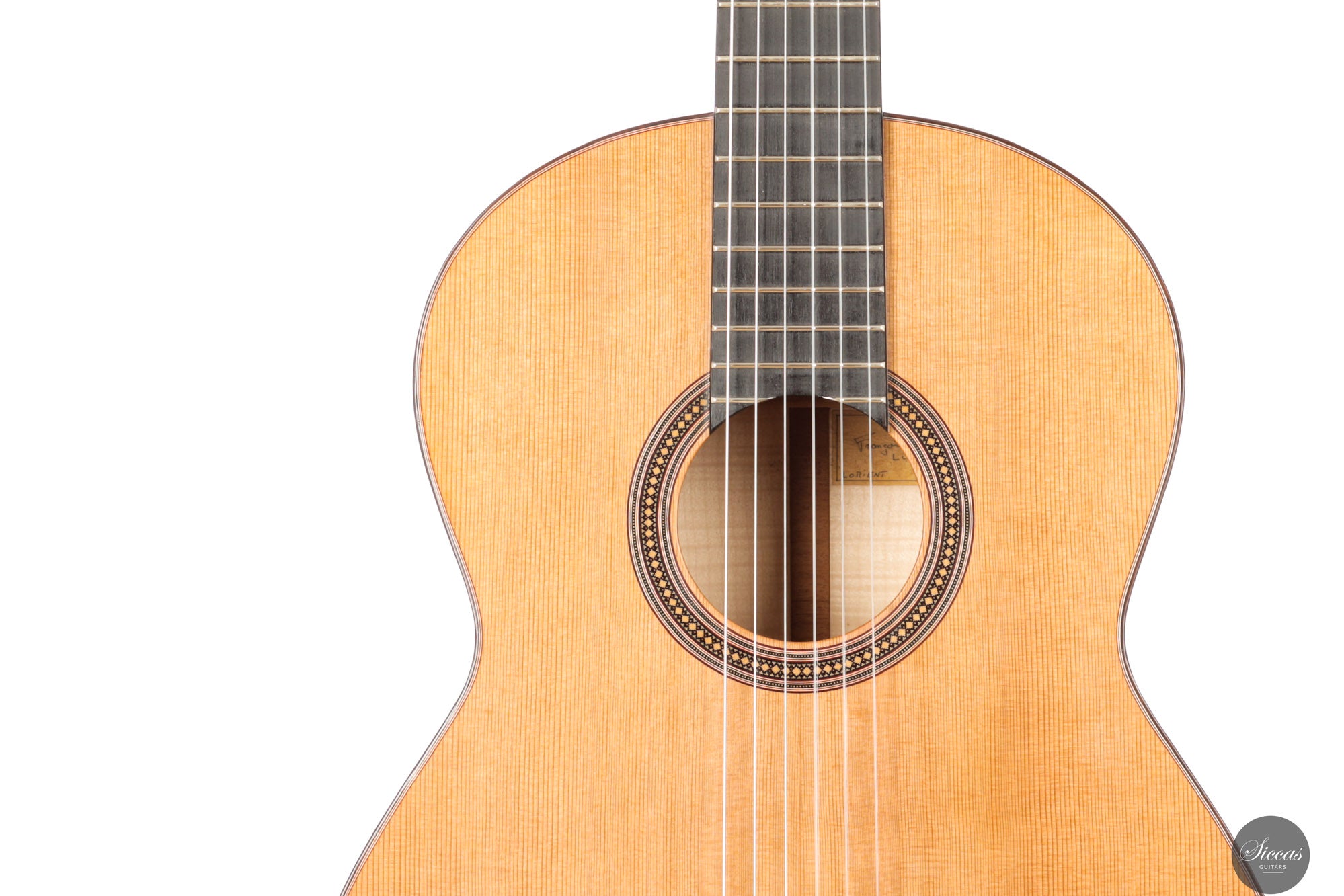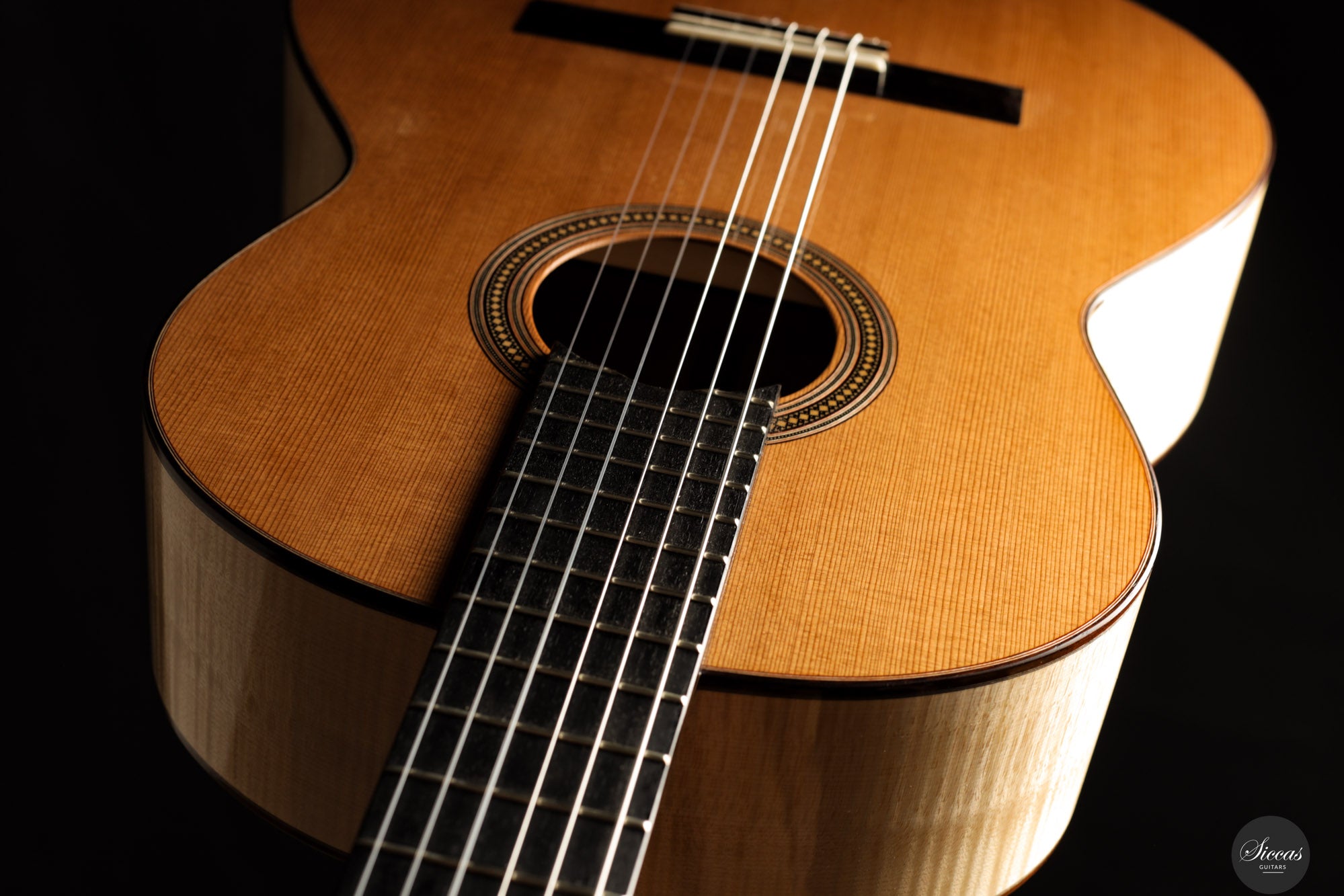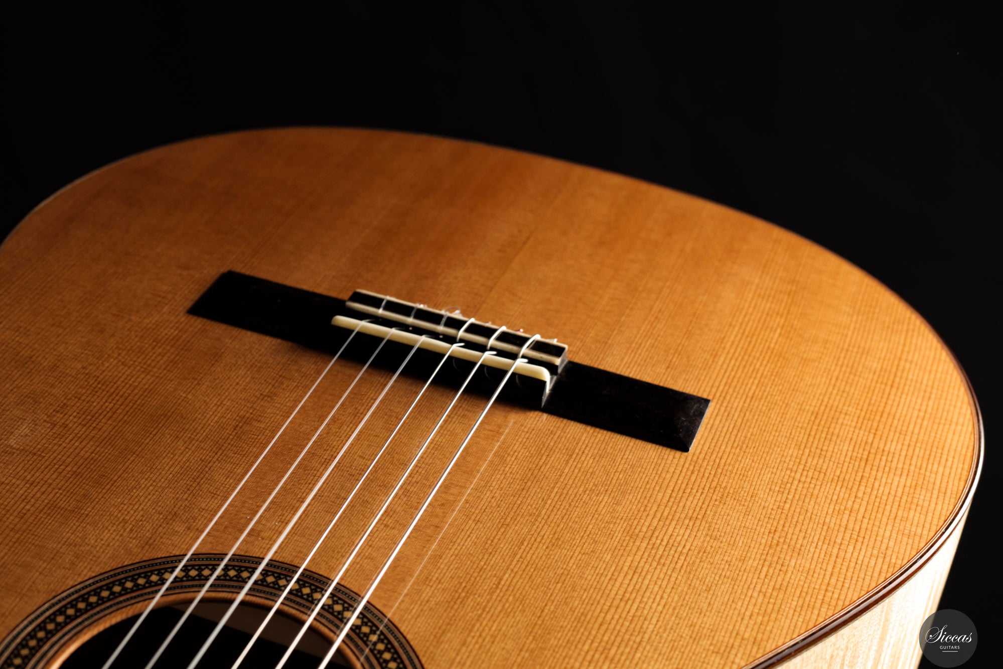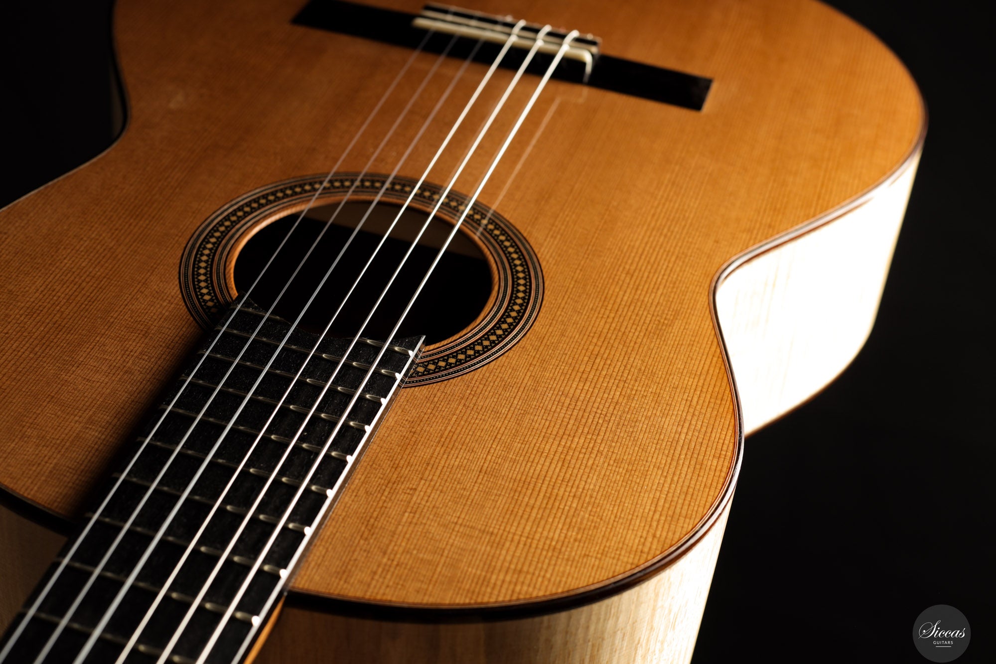 Diese Gitarre Nr. 105 aus dem Jahr 2025 ist ein sowohl optisch als auch klanglich außergewöhnliches Instrument. Die Kombination aus einer Zederndecke und geflammtem Ahorn für Boden und Zargen ist selten und erzeugt nicht nur eine markante Erscheinung, sondern auch einen unverwechselbaren Klangcharakter. Der Ton ist reich an Obertönen, von langer Tragfähigkeit und mit singenden, mühelos projizierenden Höhen. Das Instrument verfügt über eine moderate Ansprache und eine beachtliche Lautstärke, was es besonders vielseitig und ausdrucksstark macht. Dank der lattice-Verstrebung, dem Schellack-Finish und der kompakten 640-mm-Mensur bietet diese Gitarre eine hervorragende Mischung aus Reaktionsfreudigkeit, Spielkomfort und Charakterstärke.