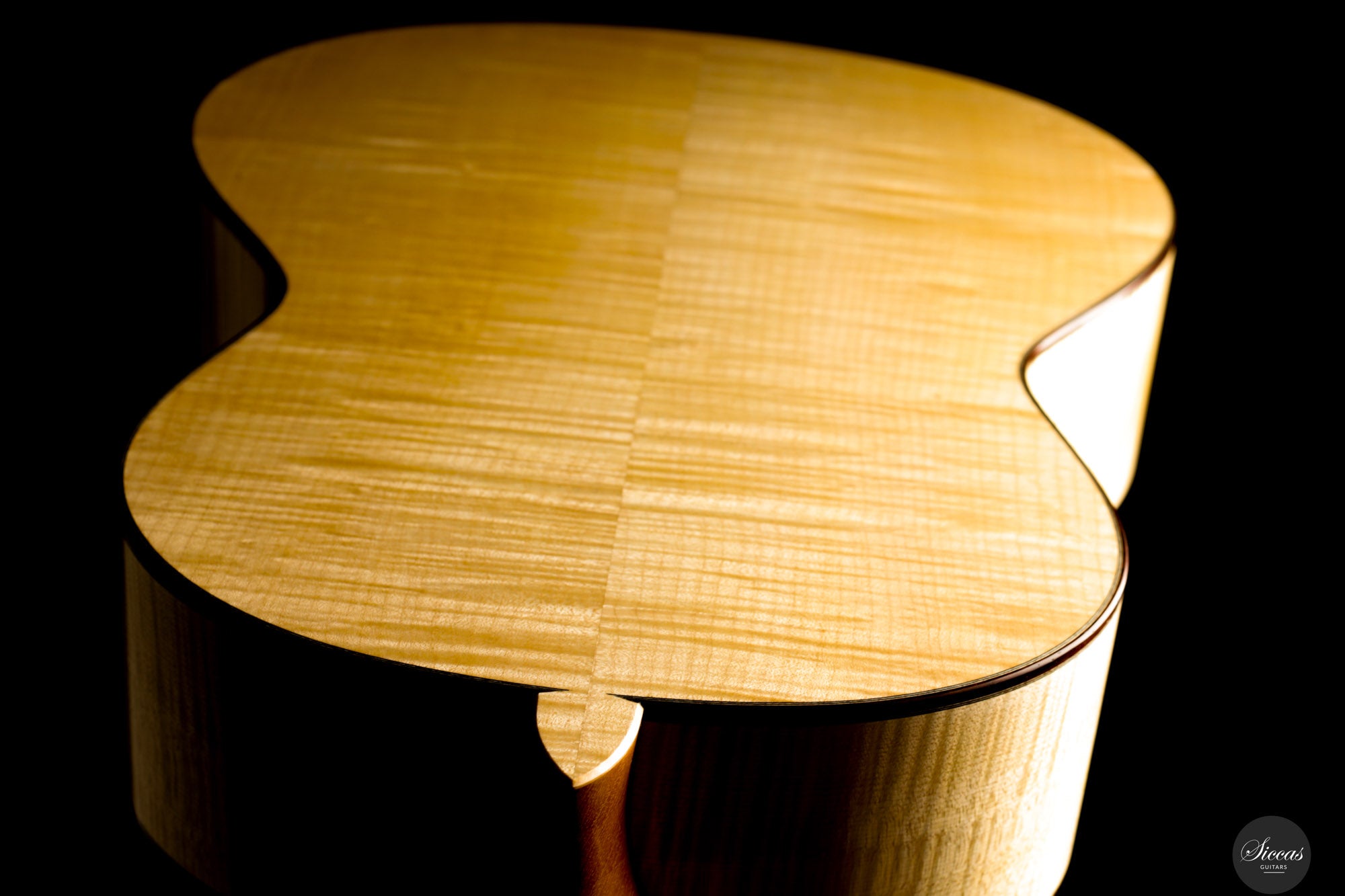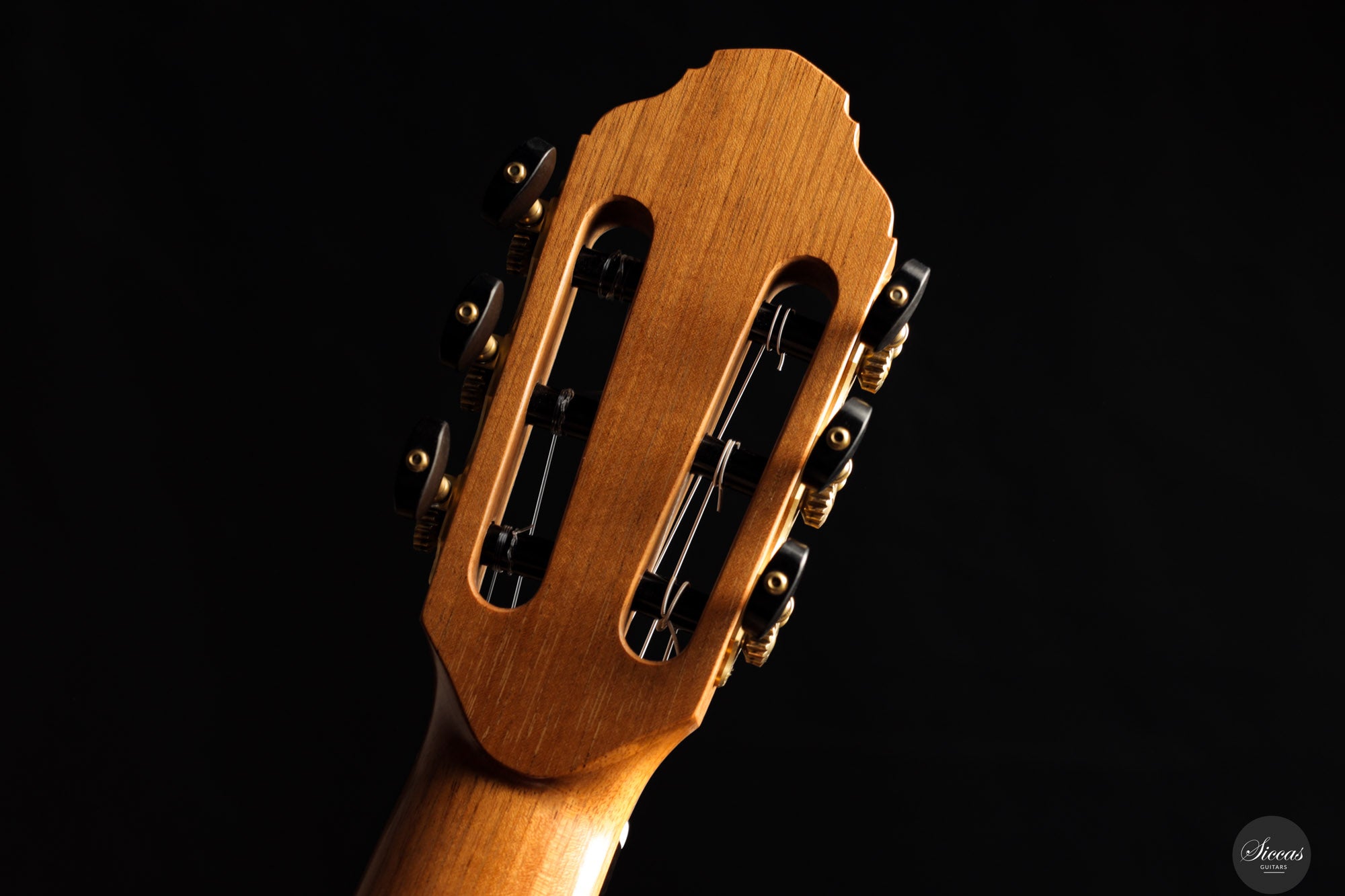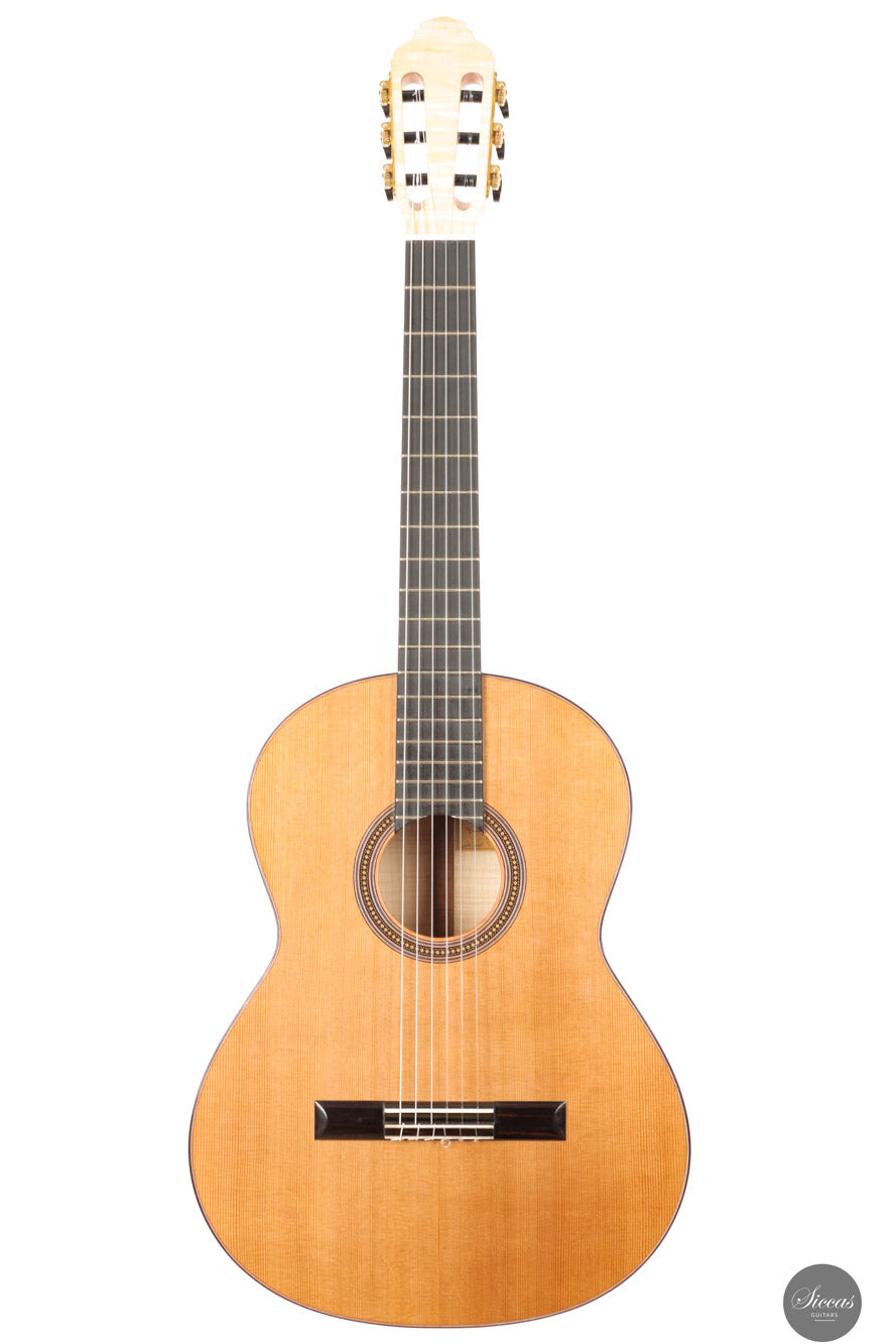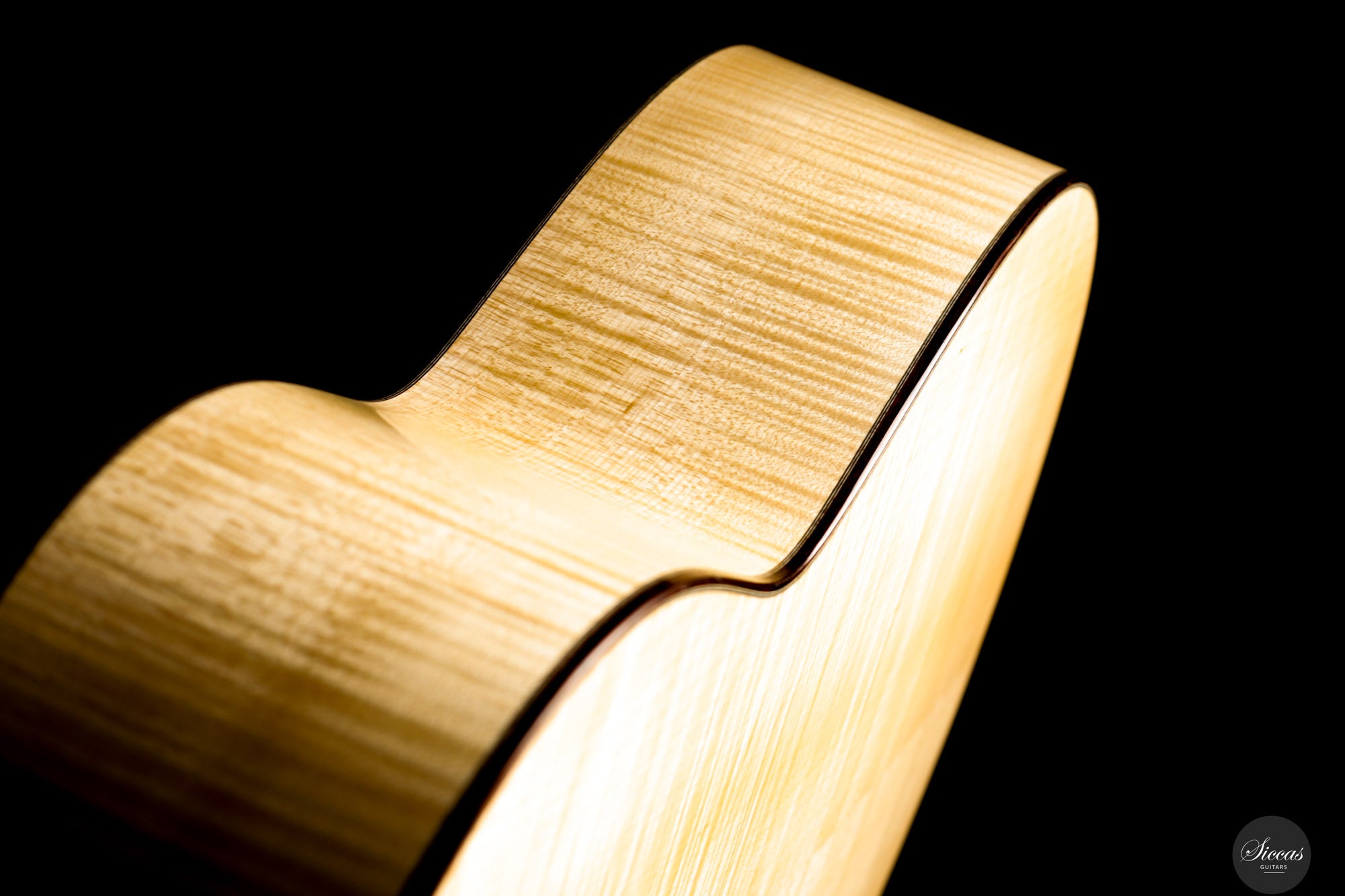 Diese Gitarre Nr. 105 aus dem Jahr 2025 ist ein sowohl optisch als auch klanglich außergewöhnliches Instrument. Die Kombination aus einer Zederndecke und geflammtem Ahorn für Boden und Zargen ist selten und erzeugt nicht nur eine markante Erscheinung, sondern auch einen unverwechselbaren Klangcharakter. Der Ton ist reich an Obertönen, von langer Tragfähigkeit und mit singenden, mühelos projizierenden Höhen. Das Instrument verfügt über eine moderate Ansprache und eine beachtliche Lautstärke, was es besonders vielseitig und ausdrucksstark macht. Dank der lattice-Verstrebung, dem Schellack-Finish und der kompakten 640-mm-Mensur bietet diese Gitarre eine hervorragende Mischung aus Reaktionsfreudigkeit, Spielkomfort und Charakterstärke.