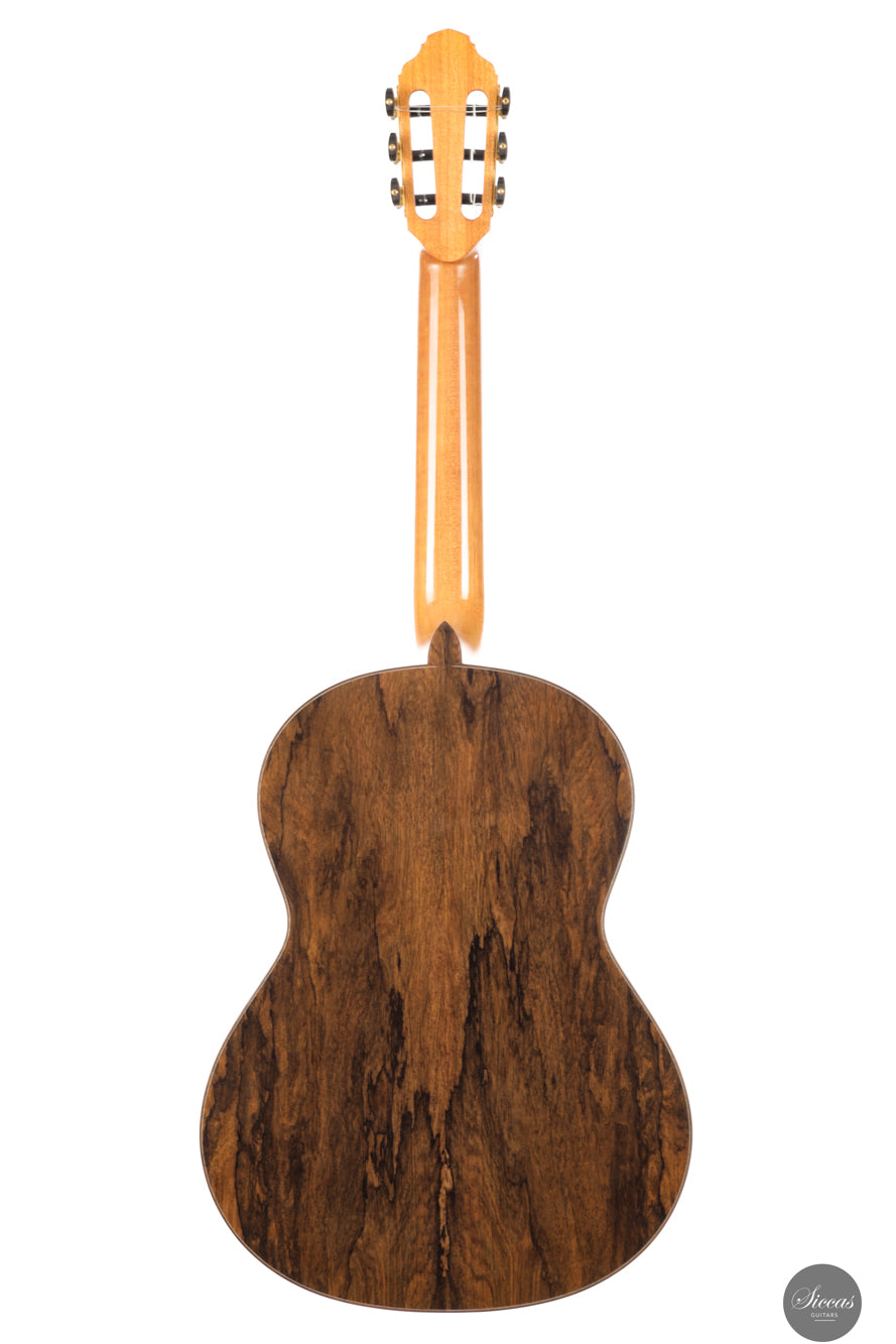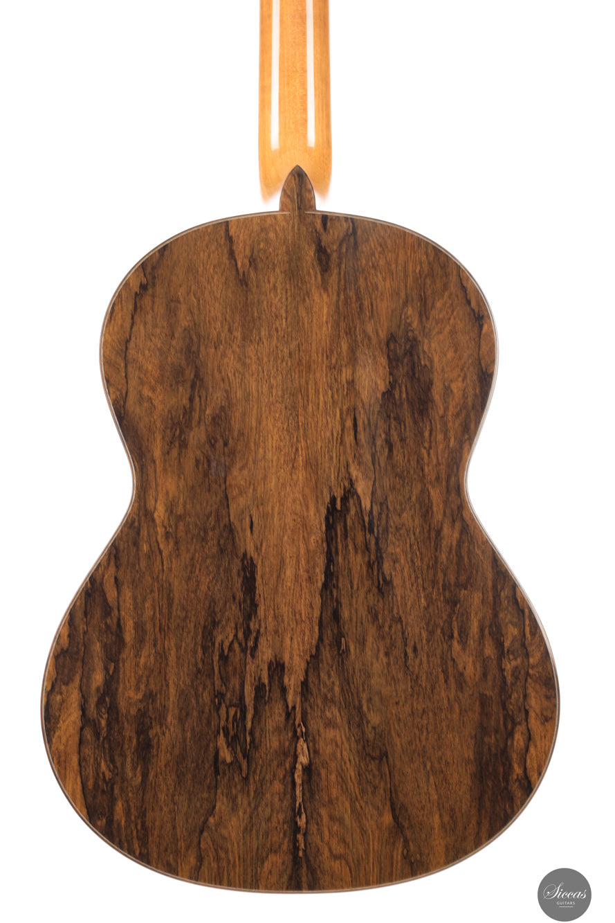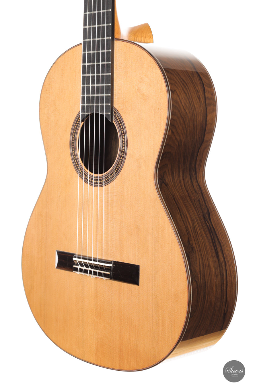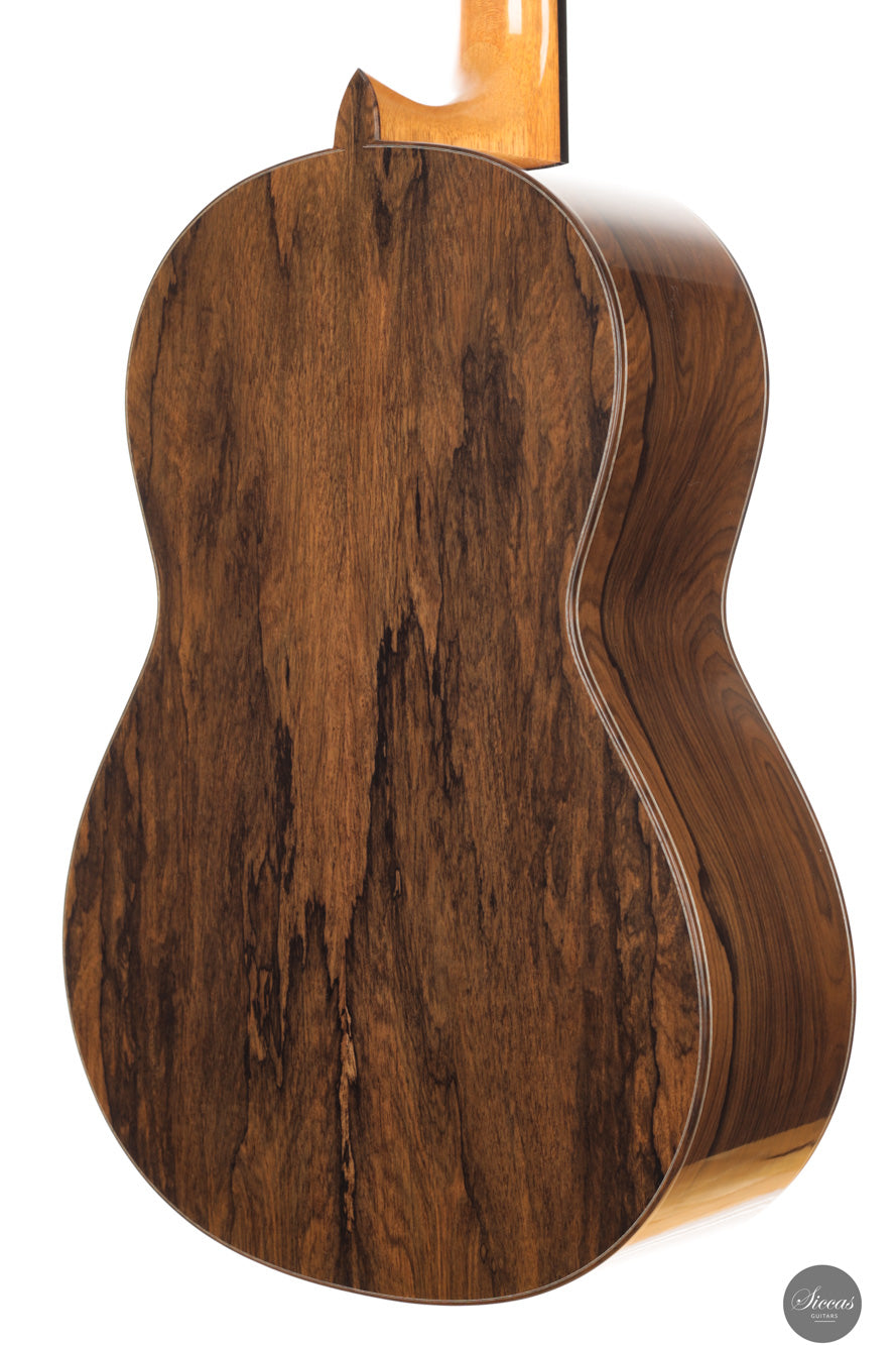 Die Gitarre Nr. 108 aus dem Jahr 2026 bestätigt erneut François Leonards Fähigkeit, Instrumente mit außergewöhnlicher klanglicher Ausgewogenheit und Tiefe zu bauen. Mit einer Decke aus Zeder und Boden und Zargen aus Ziricote ist diese lattice-verleimte Gitarre klanglich vollständig und zugleich differenziert. Die Bässe sind warm und tiefgründig, die Höhen offen und luftig, mit brillanter Klarheit, ohne jemals scharf zu wirken. Besonders auffällig ist das ausgeprägte Sustain, das Phrasierung und Legatospiel wirkungsvoll unterstützt.