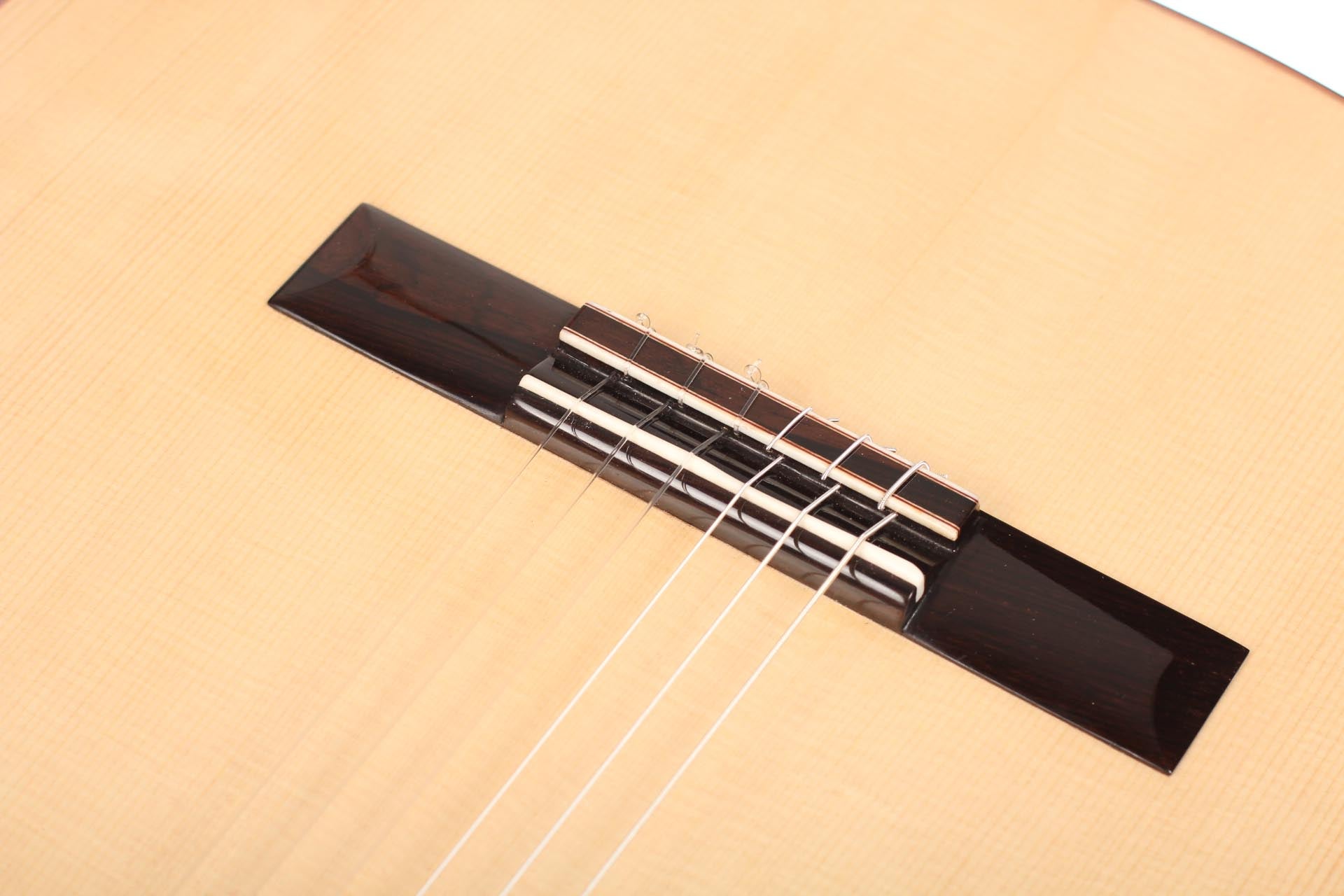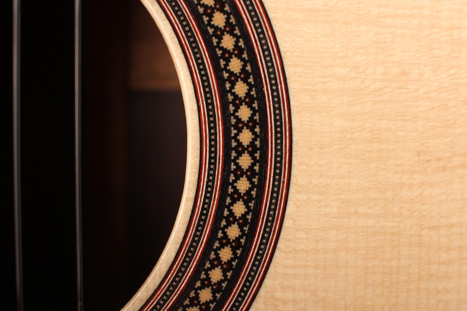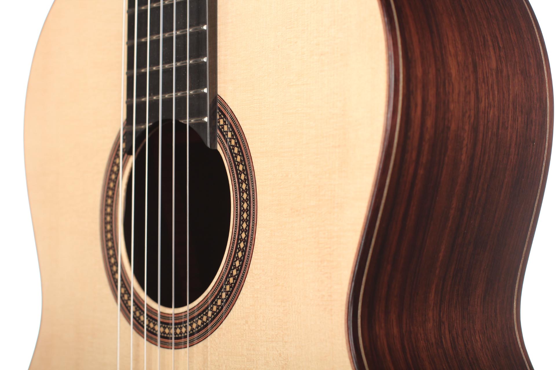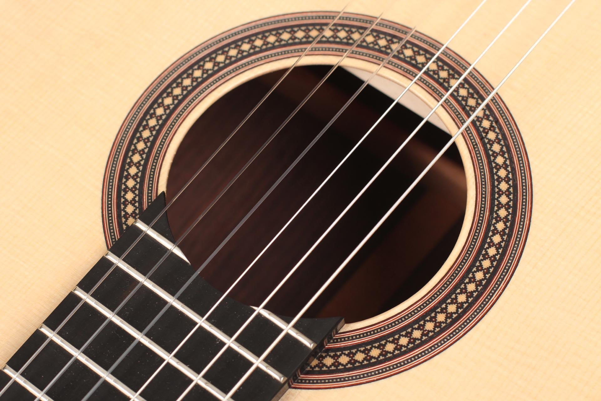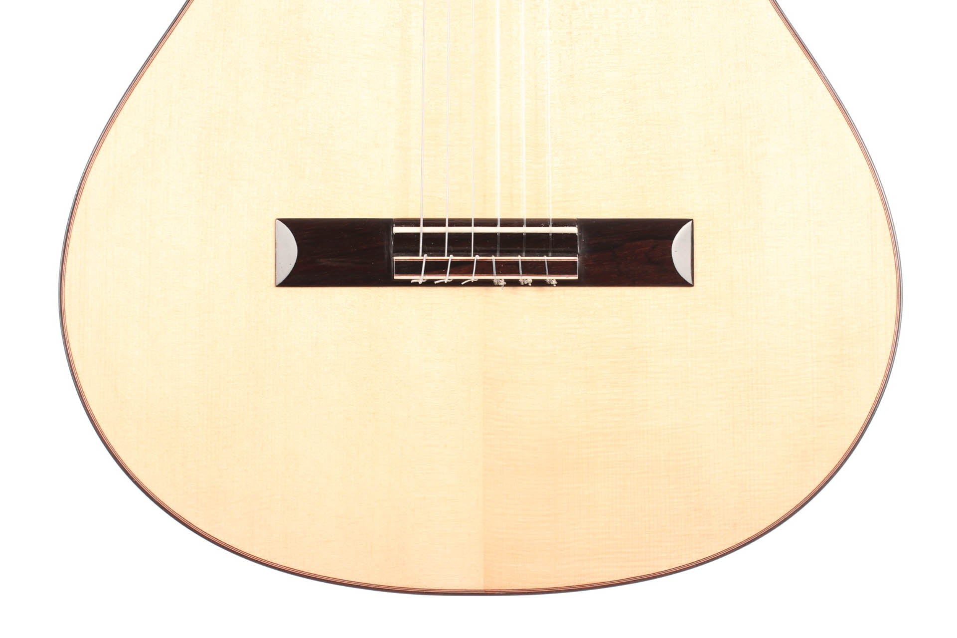 This guitar from 2017 combines traditional guitar building techniques with the master’s own lattice bracing concept. The design is beautiful and timeless with a light spruce top contrasting pleasantly with the dark rosewood back and sides and highlighting the precious and detailed ornamentation on the rosette and the gorgeously grained bridge. The sound is powerful and responsive with a great dynamic range. The tuners are made by Gotoh. A hard-shell case is included.