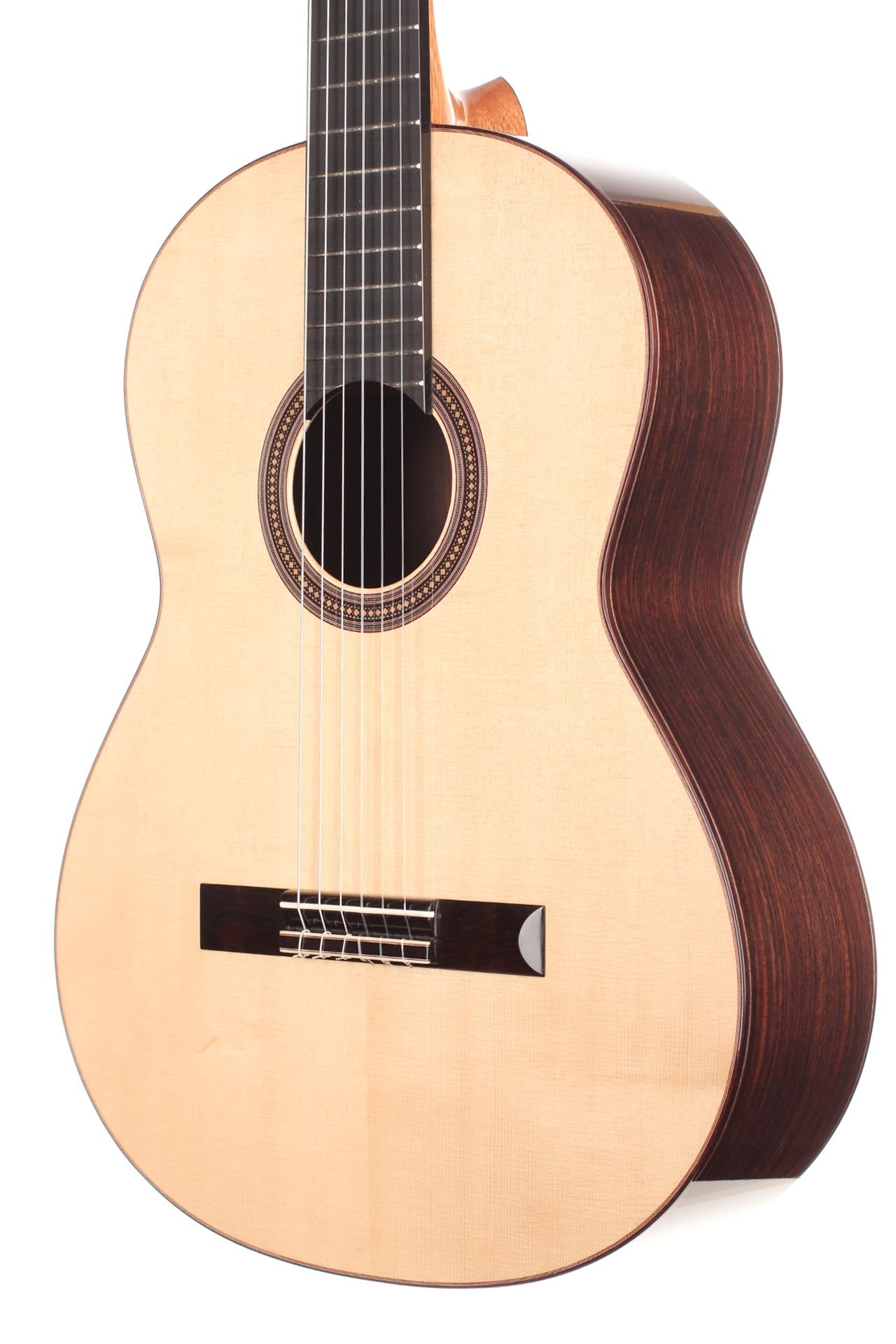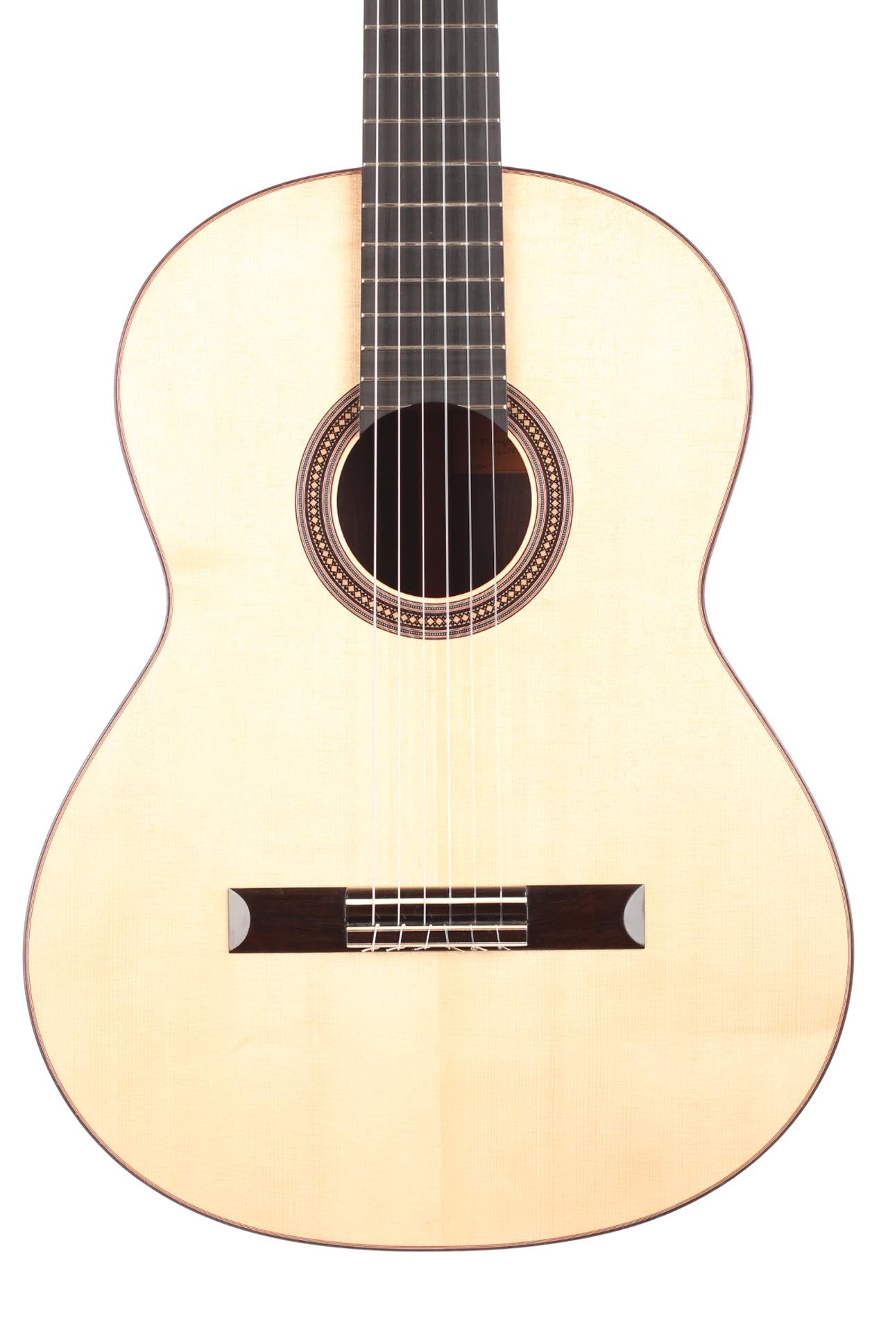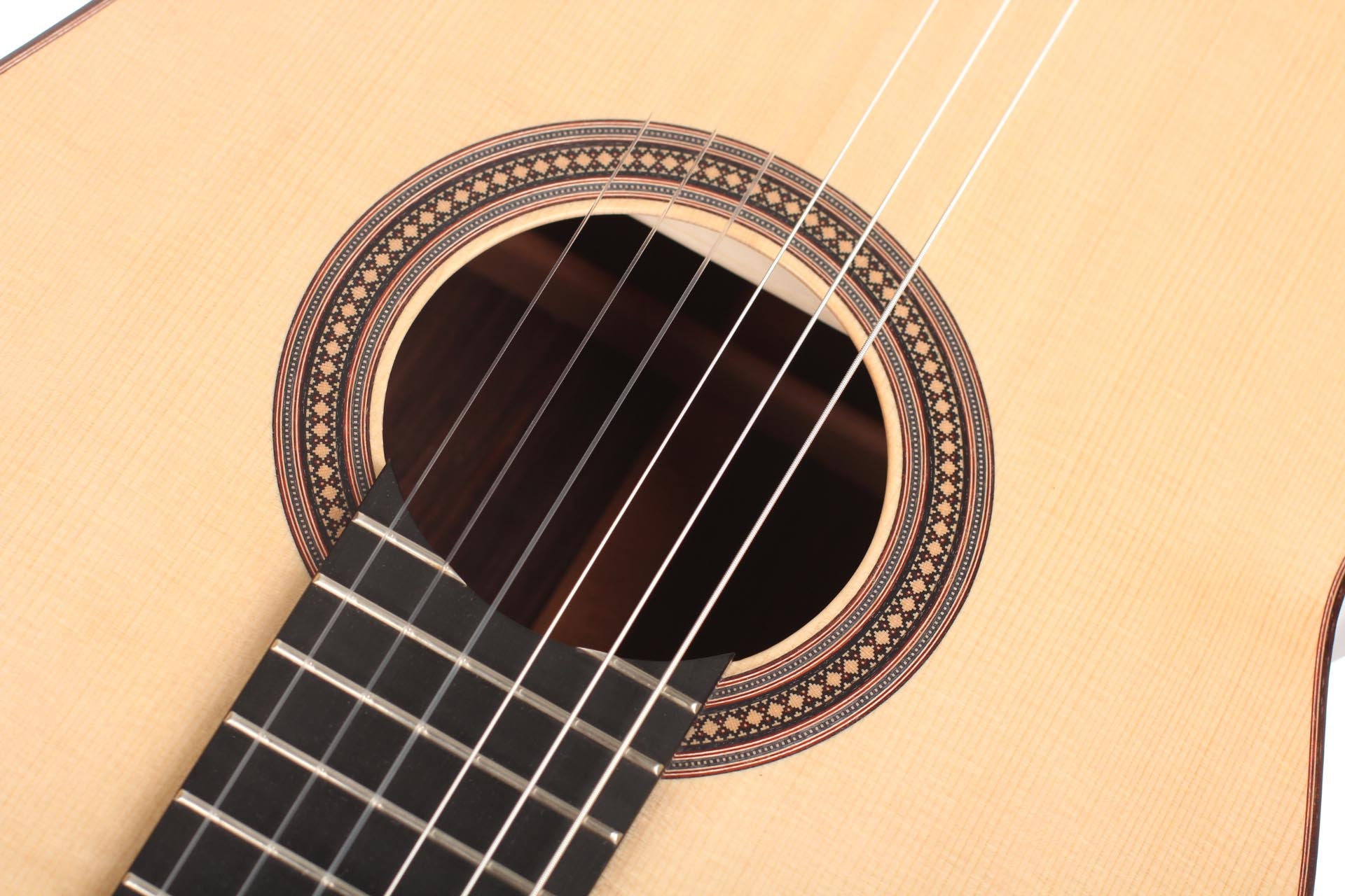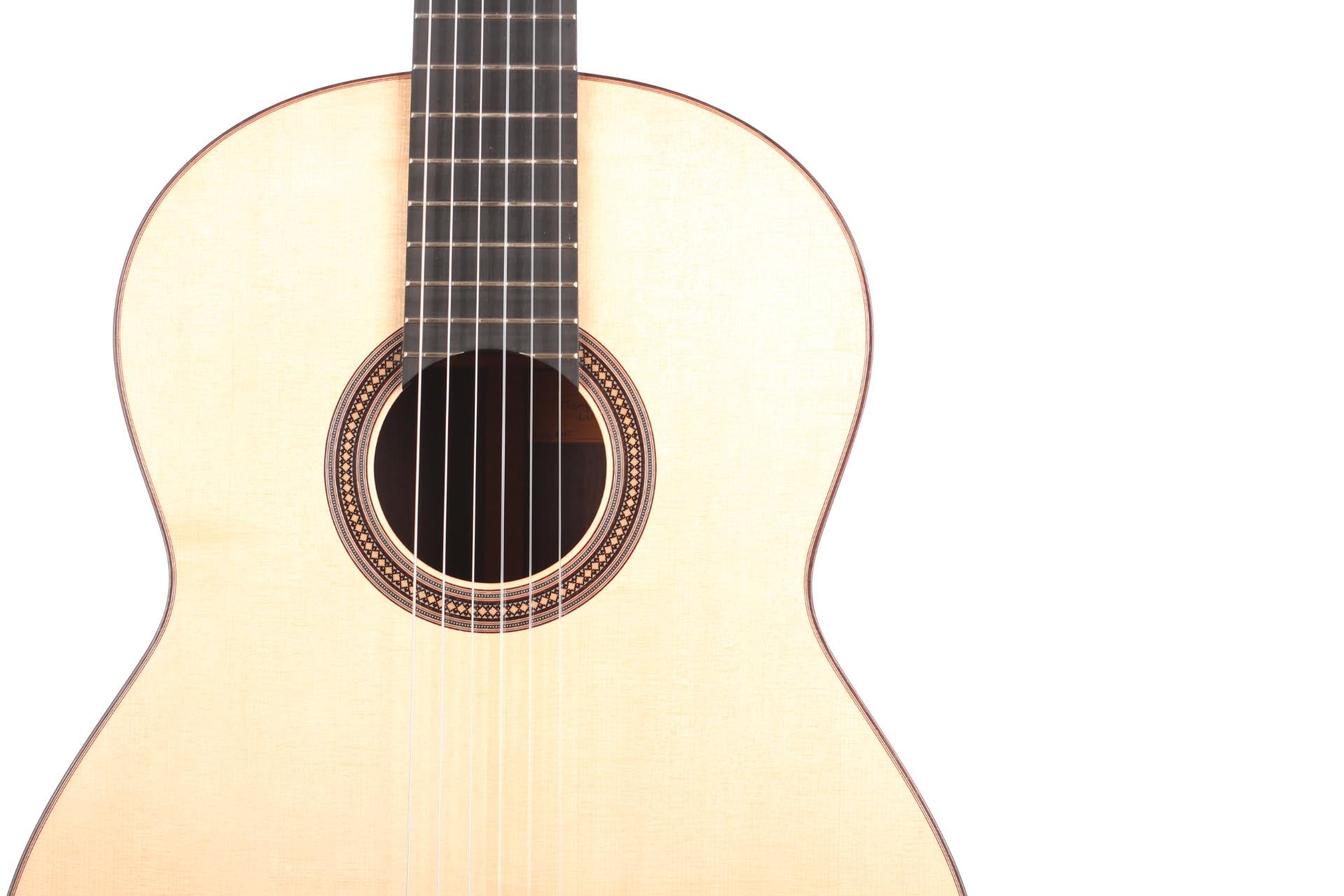 Diese Gitarre von 2017 kombiniert traditionelle Gitarrenbaukunst mit einem eigenen Lattice-Bracing Konzept des Meisters. Das Design ist wunderschön und zeitlos mit einer hellen Fichtendecke, die in angenehmem Kontrast zum dunklen Palisander in Boden und Zargen steht und die edle, detailreiche Verzierung in der Rosette und den wunderbar gemaserten Steg hervorhebt. Der Klang ist kraftvoll und direkt und verfügt über eine großartige Dynamik. Die Mechaniken sind von Gotoh. Ein Hartschalenkoffer von Humicase ist inklusive.