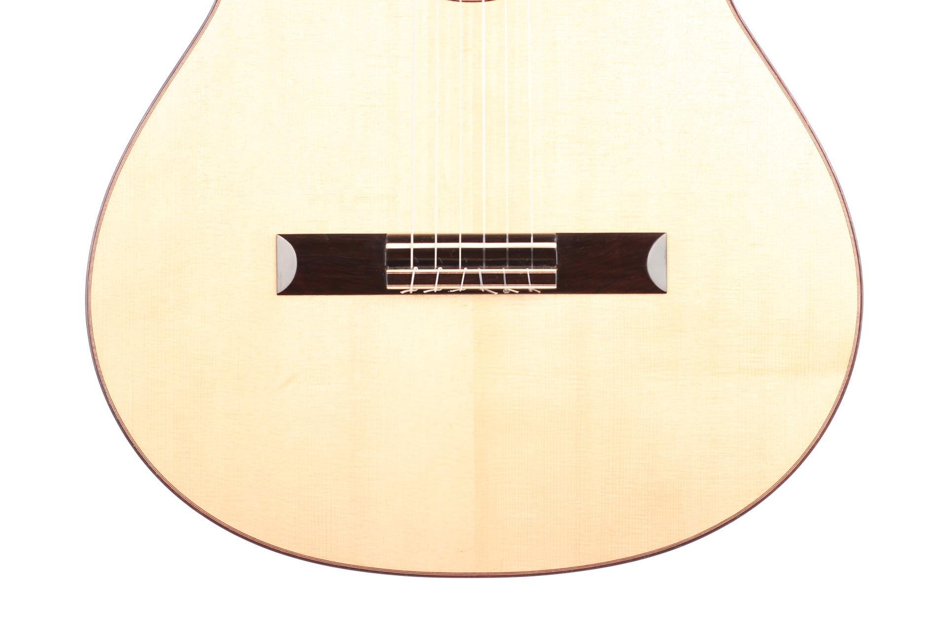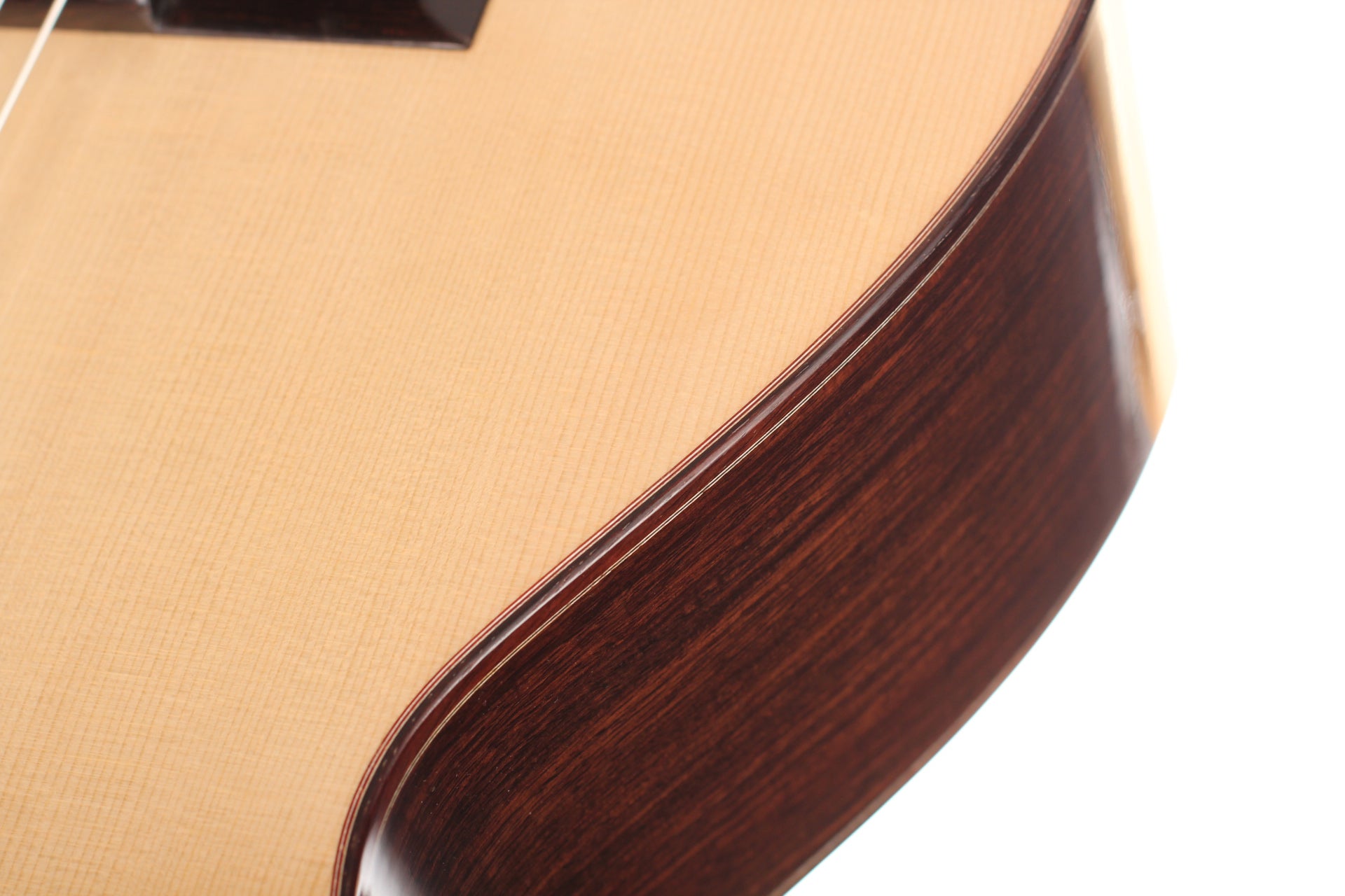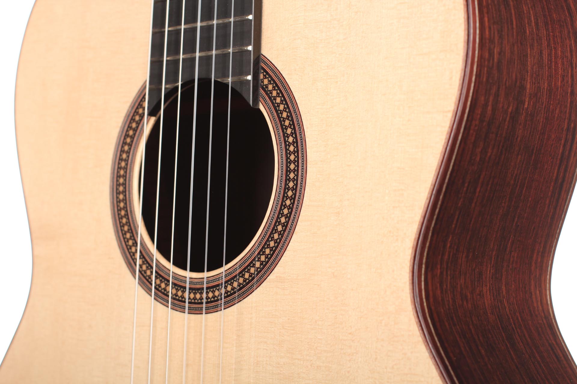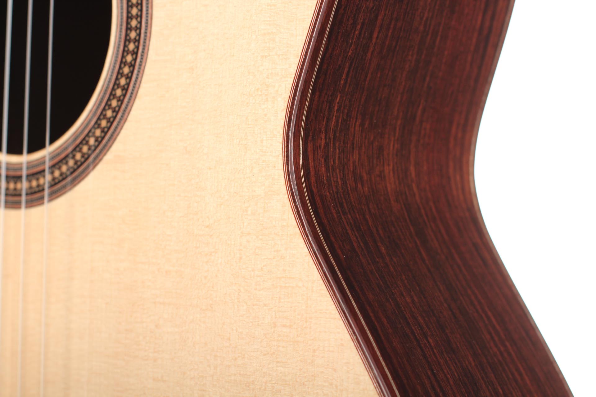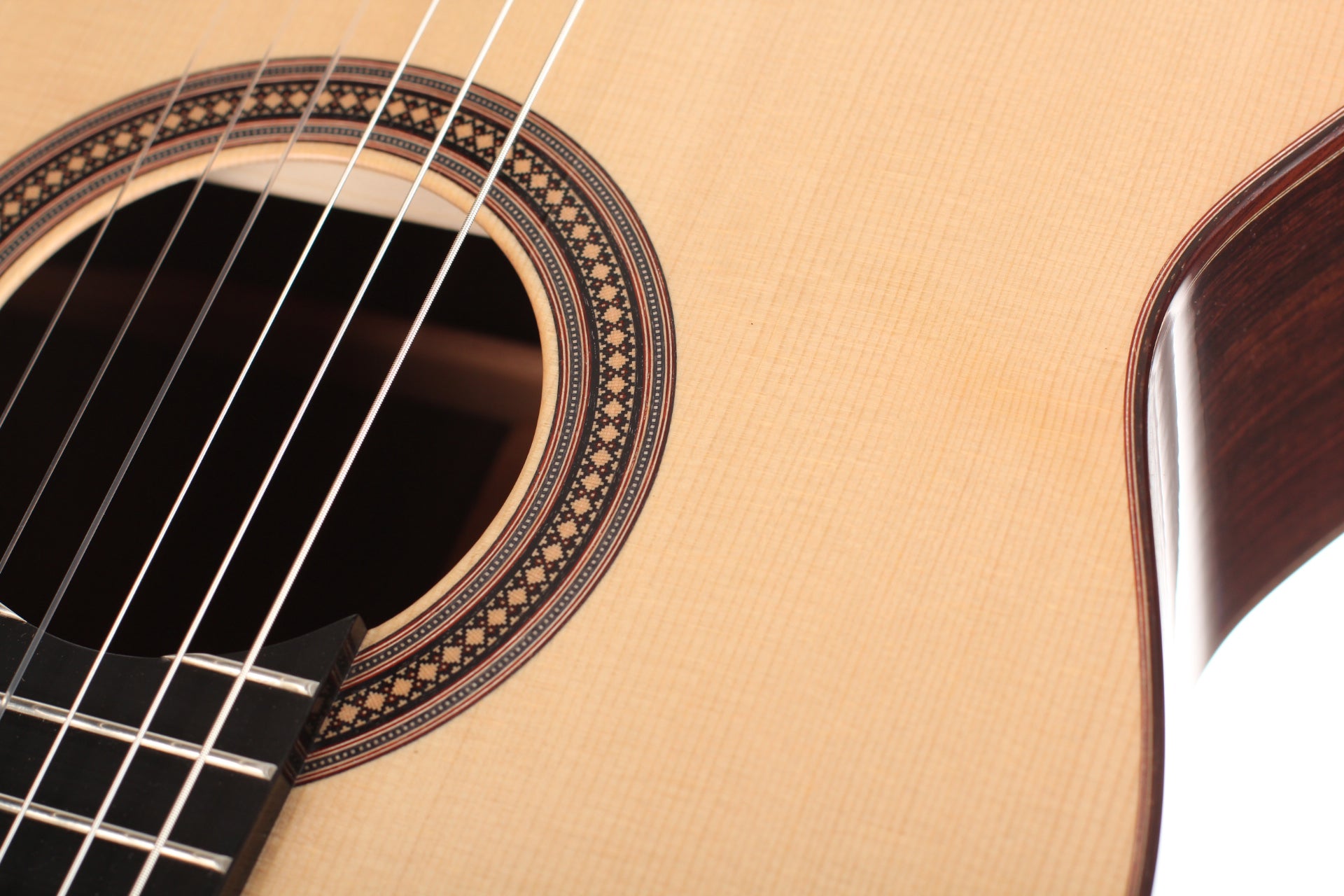 Diese Gitarre von 2017 kombiniert traditionelle Gitarrenbaukunst mit einem eigenen Lattice-Bracing Konzept des Meisters. Das Design ist wunderschön und zeitlos mit einer hellen Fichtendecke, die in angenehmem Kontrast zum dunklen Palisander in Boden und Zargen steht und die edle, detailreiche Verzierung in der Rosette und den wunderbar gemaserten Steg hervorhebt. Der Klang ist kraftvoll und direkt und verfügt über eine großartige Dynamik. Die Mechaniken sind von Gotoh. Ein Hartschalenkoffer von Humicase ist inklusive.