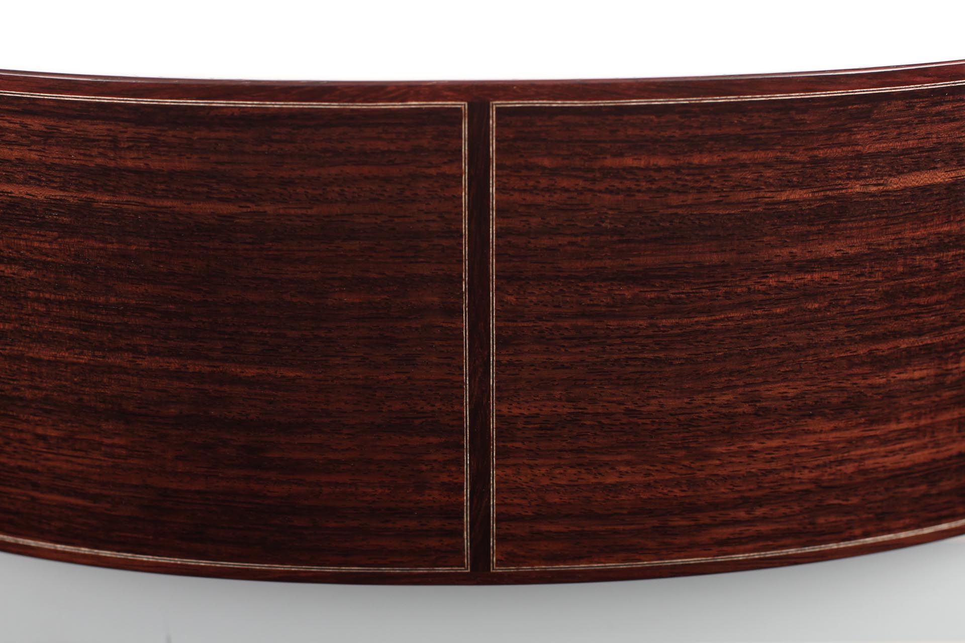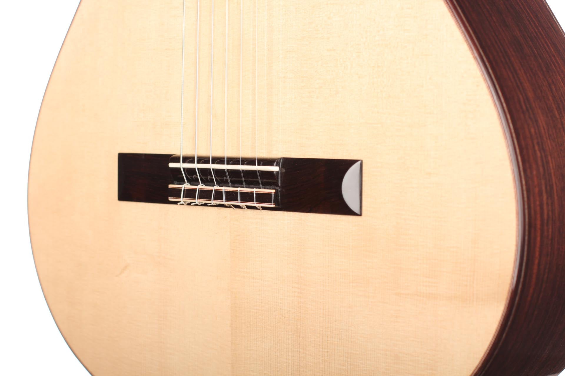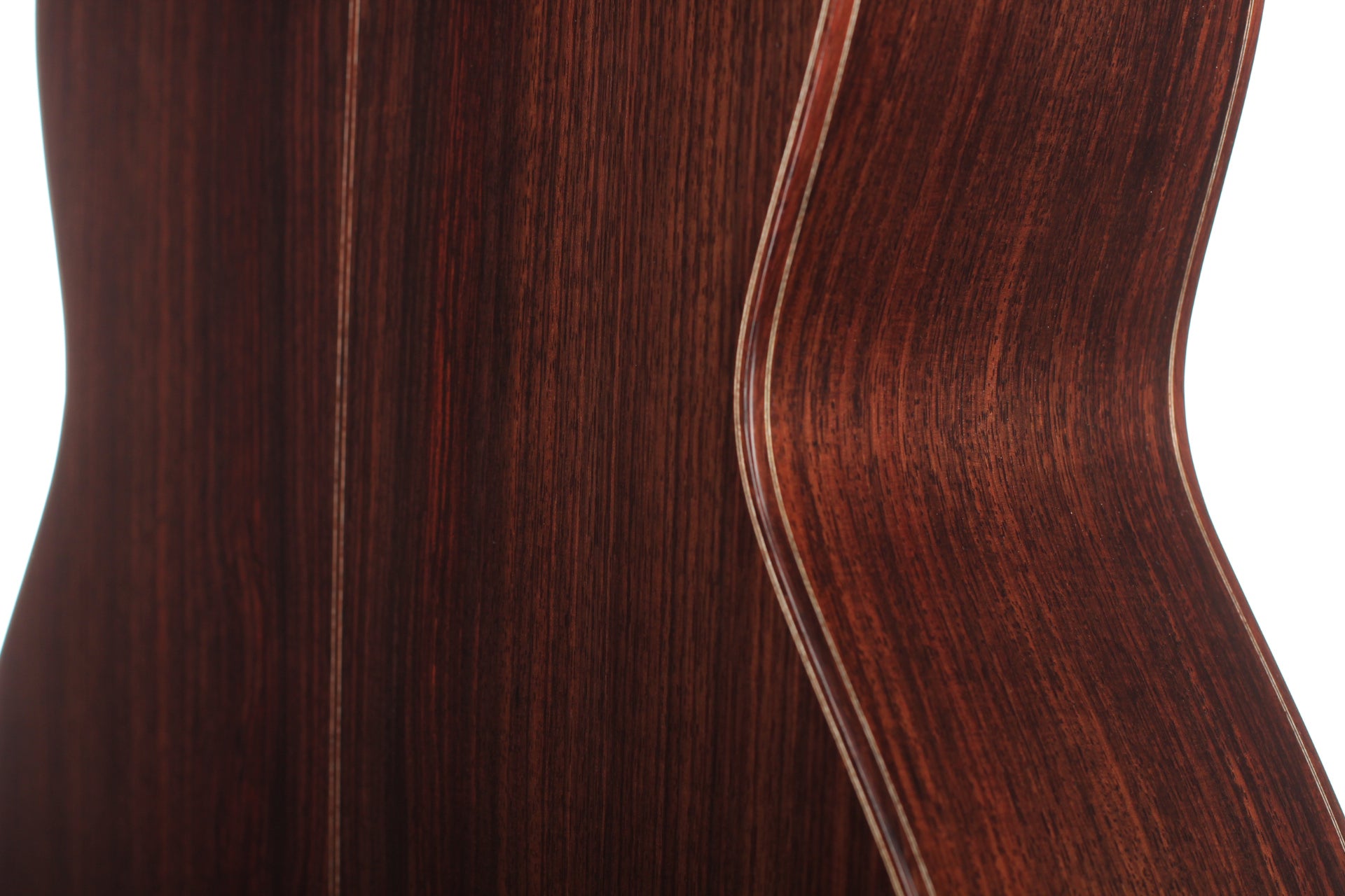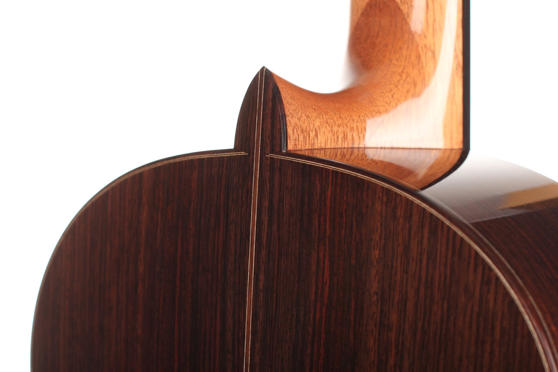 Diese Gitarre von 2017 kombiniert traditionelle Gitarrenbaukunst mit einem eigenen Lattice-Bracing Konzept des Meisters. Das Design ist wunderschön und zeitlos mit einer hellen Fichtendecke, die in angenehmem Kontrast zum dunklen Palisander in Boden und Zargen steht und die edle, detailreiche Verzierung in der Rosette und den wunderbar gemaserten Steg hervorhebt. Der Klang ist kraftvoll und direkt und verfügt über eine großartige Dynamik. Die Mechaniken sind von Gotoh. Ein Hartschalenkoffer von Humicase ist inklusive.