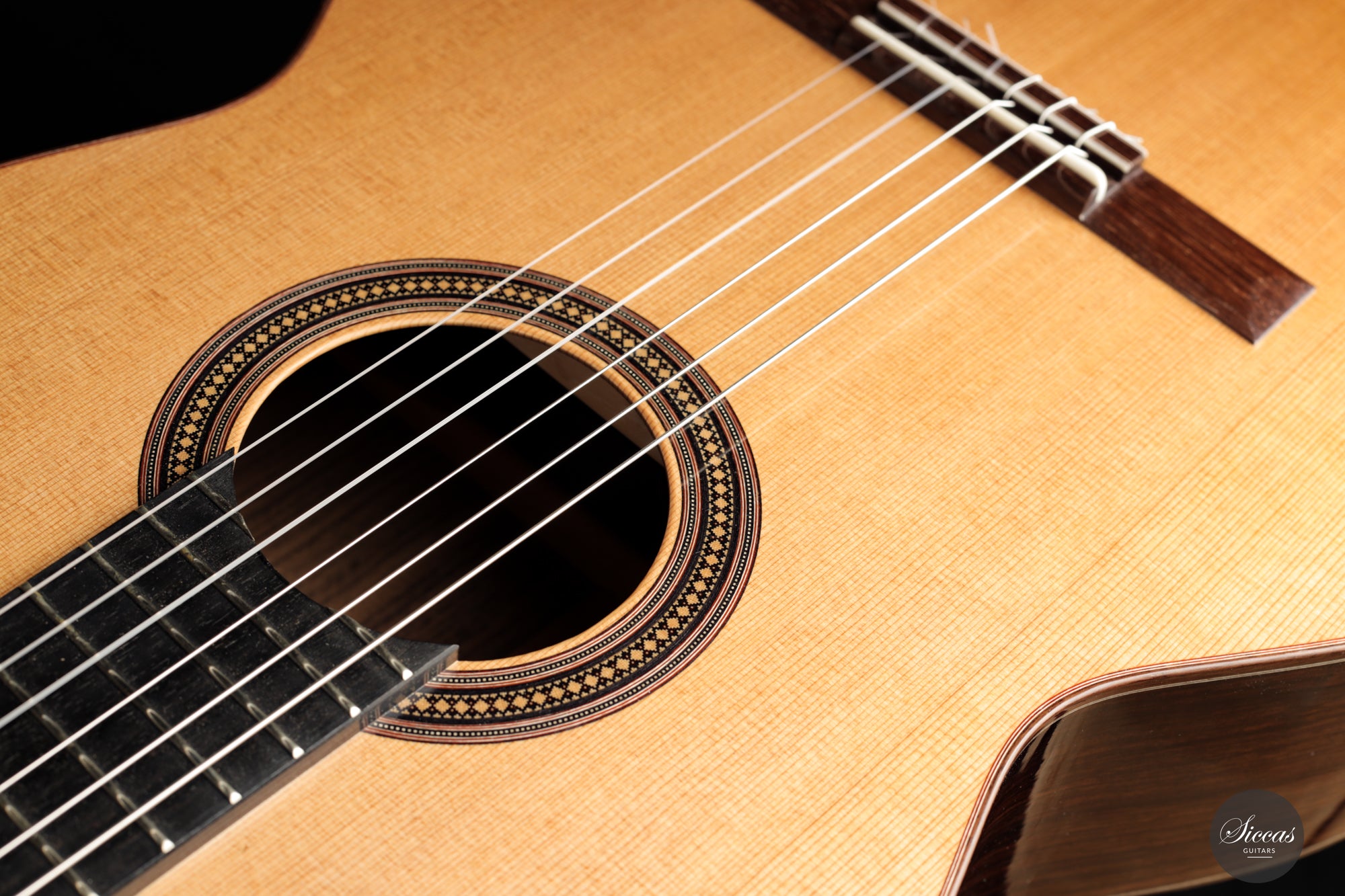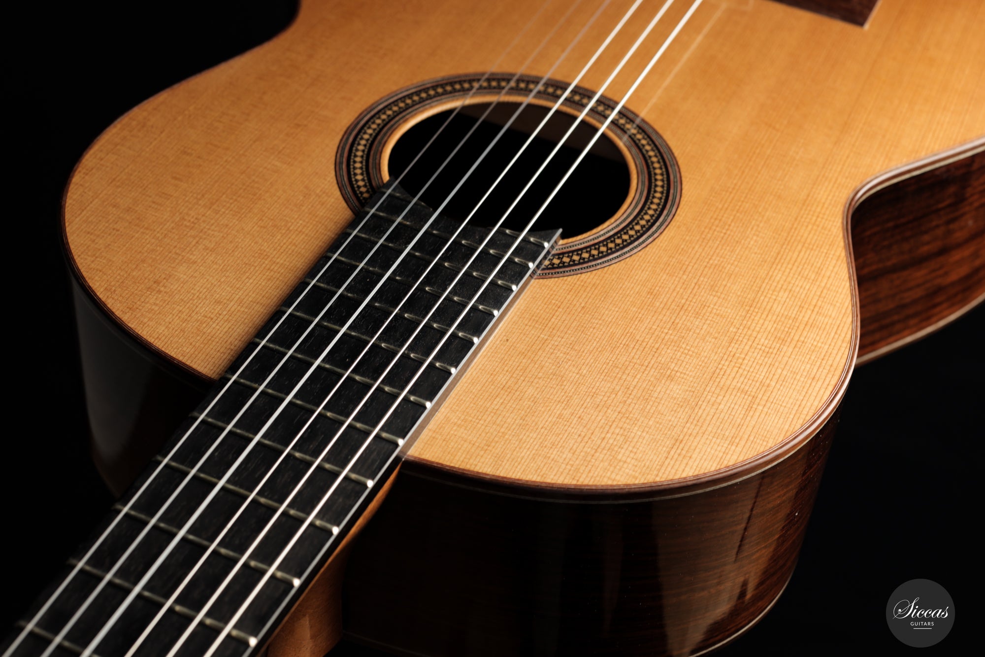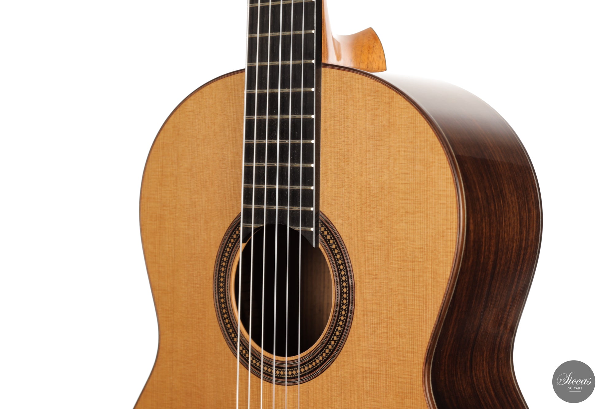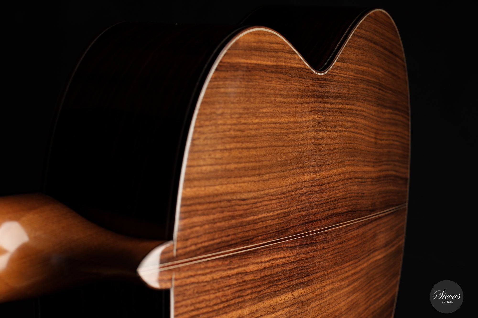 In the echelons of elite musical craftsmanship, the 2023 Francois Regis Leonard stands as a beacon of sonic excellence. With precision akin to a sculptor's finest touch, this masterpiece is carved from the gentle embrace of cedar, granting its soundboard a vibrant resonance. Paired with this is the opulent depth of Indian rosewood, enveloping the guitar's form, presenting a blend of audacity and tradition in one fell swoop.