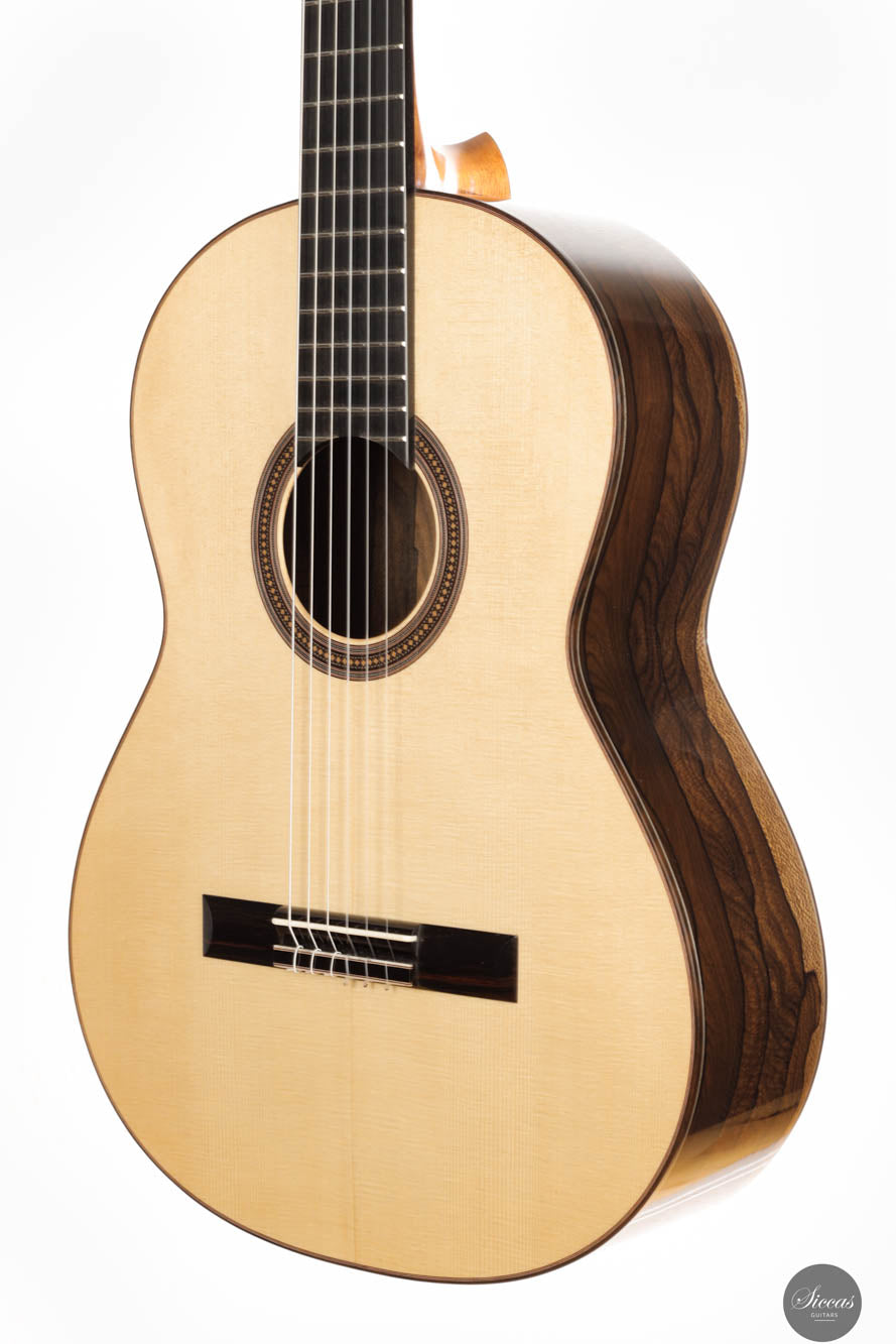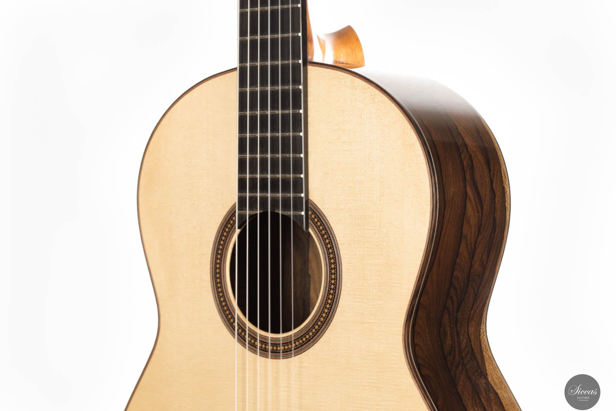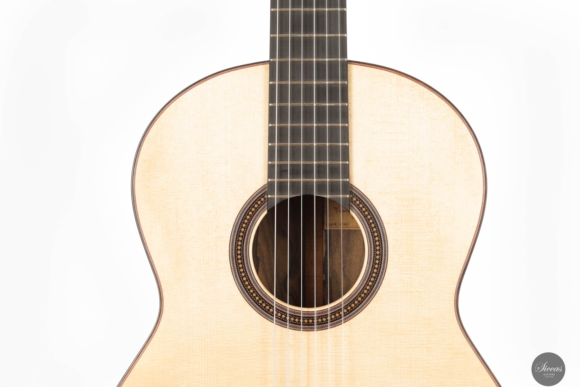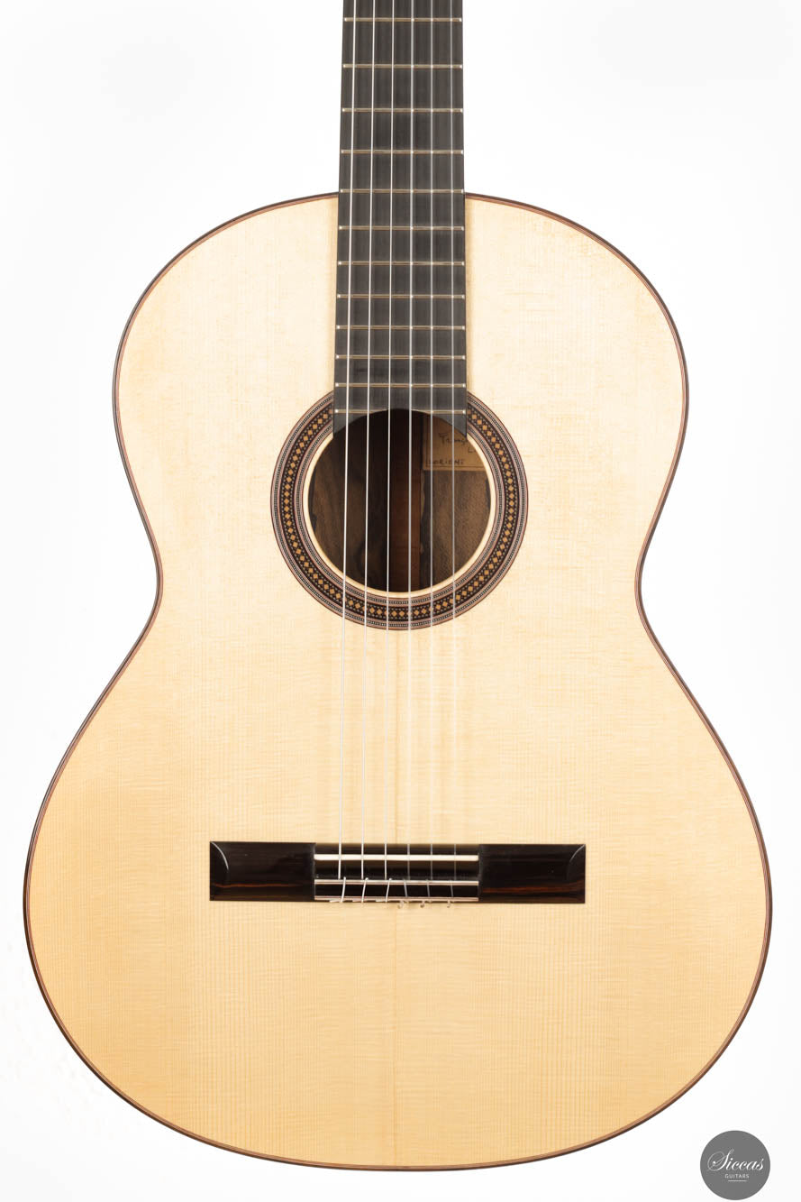 Die Gitarre Nr. 100 markiert einen bedeutenden Meilenstein in der Karriere von François Leonard und demonstriert sein meisterhaftes Können als Gitarrenbauer mit einem wahrhaft herausragenden Konzertinstrument. Dank ihrer Gitterkonstruktion liefert diese Gitarre ein außergewöhnliches Volumen, das die Anforderungen professioneller Musiker in jeder Aufführungssituation erfüllt. Ihre bemerkenswerte Bespielbarkeit ermöglicht eine mühelose Kontrolle, sodass Musiker ihre Kunst vollständig zum Ausdruck bringen können. Die Fichtendecke trägt zu einem wunderschönen Klang der Höhen und reichen Obertönen bei, während die klassische Wahl von indischem Palisander für Boden und Zargen Vielseitigkeit verleiht und sie zu einer idealen Konzertgitarre für eine Vielzahl von Musikstilen macht.