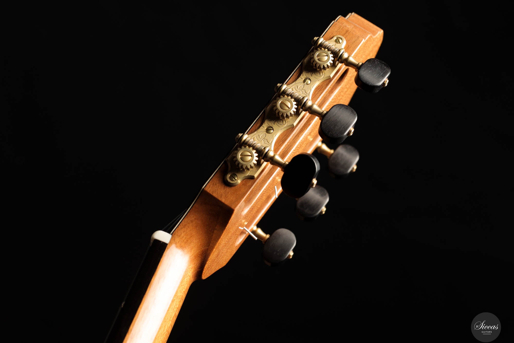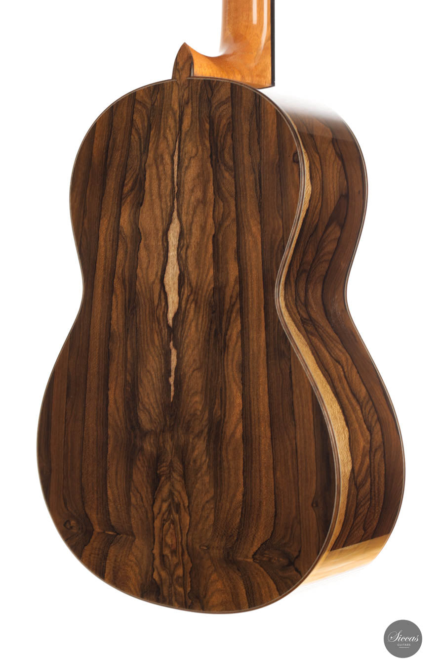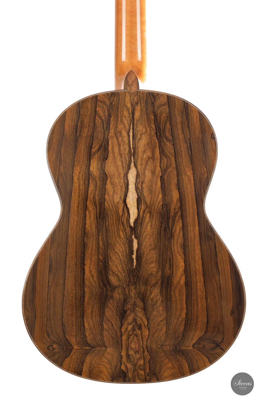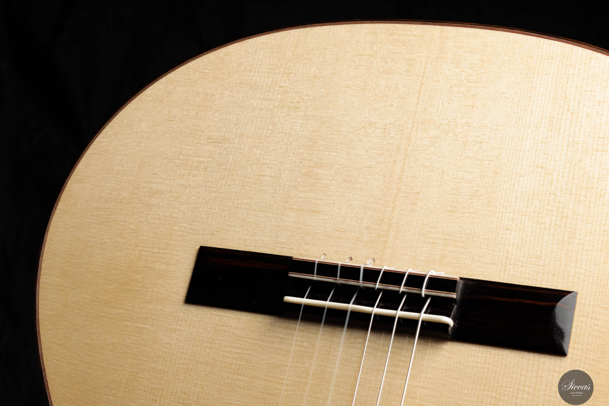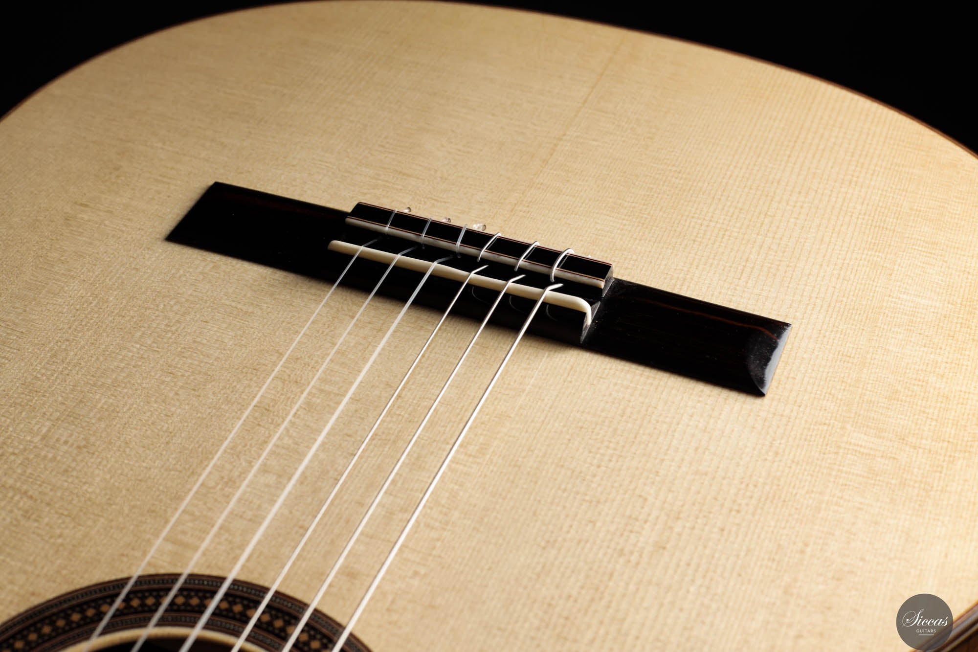 Die Gitarre Nr. 100 markiert einen bedeutenden Meilenstein in der Karriere von François Leonard und demonstriert sein meisterhaftes Können als Gitarrenbauer mit einem wahrhaft herausragenden Konzertinstrument. Dank ihrer Gitterkonstruktion liefert diese Gitarre ein außergewöhnliches Volumen, das die Anforderungen professioneller Musiker in jeder Aufführungssituation erfüllt. Ihre bemerkenswerte Bespielbarkeit ermöglicht eine mühelose Kontrolle, sodass Musiker ihre Kunst vollständig zum Ausdruck bringen können. Die Fichtendecke trägt zu einem wunderschönen Klang der Höhen und reichen Obertönen bei, während die klassische Wahl von indischem Palisander für Boden und Zargen Vielseitigkeit verleiht und sie zu einer idealen Konzertgitarre für eine Vielzahl von Musikstilen macht.