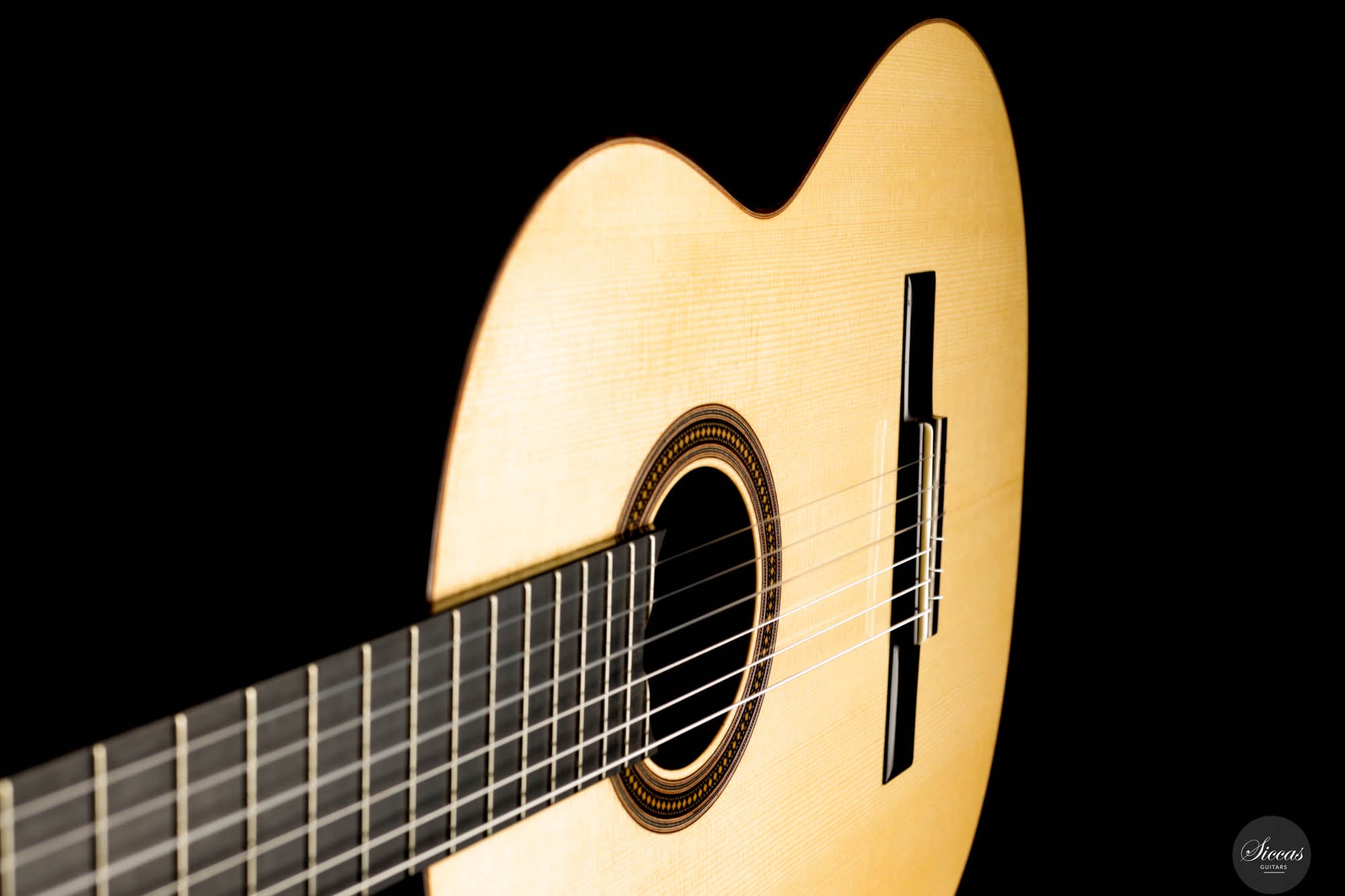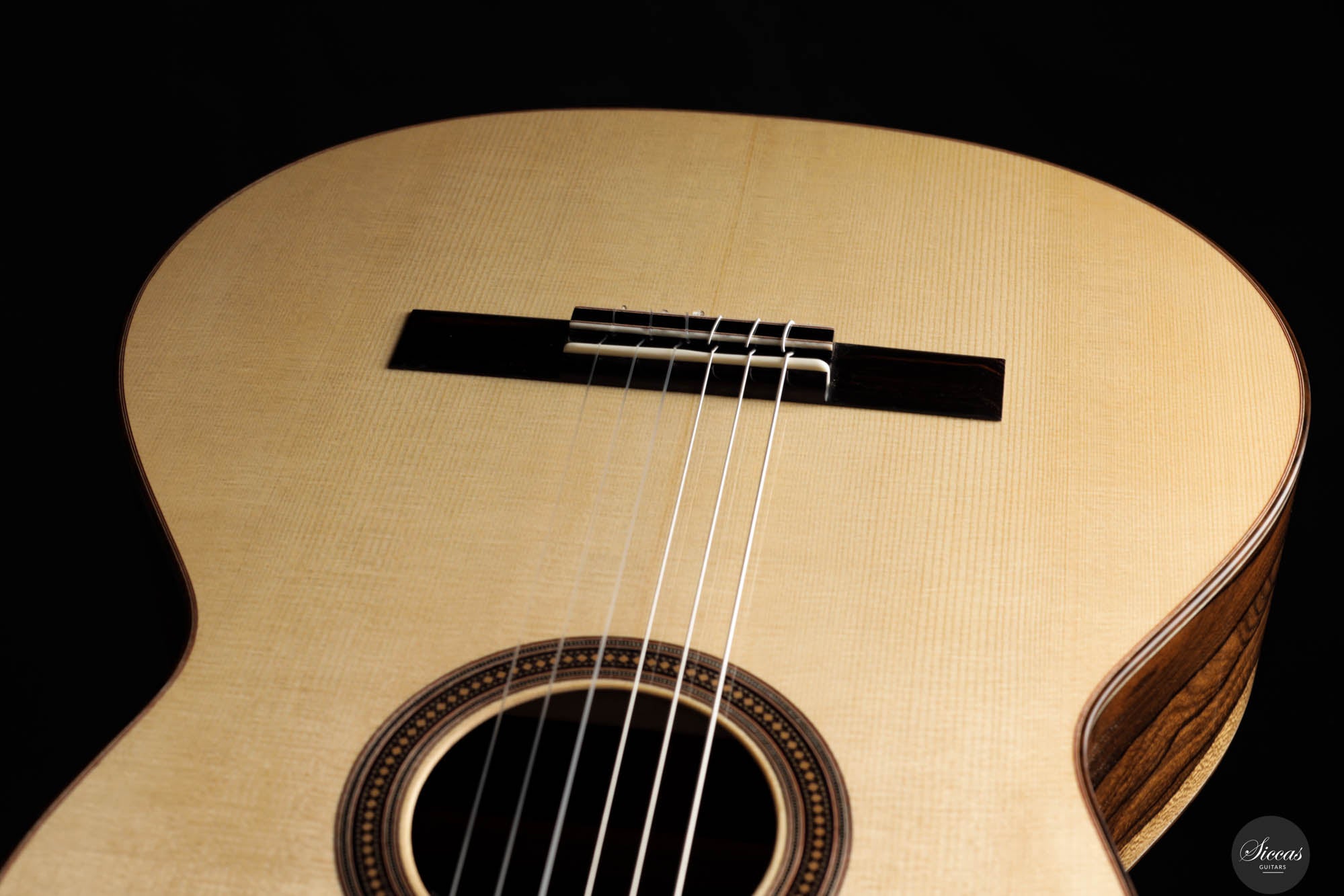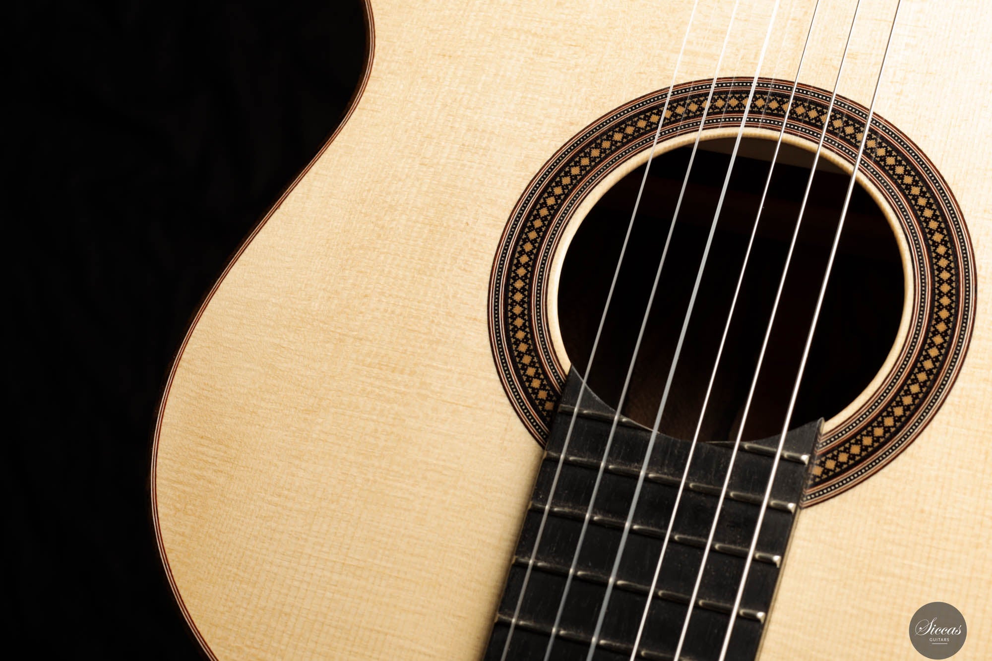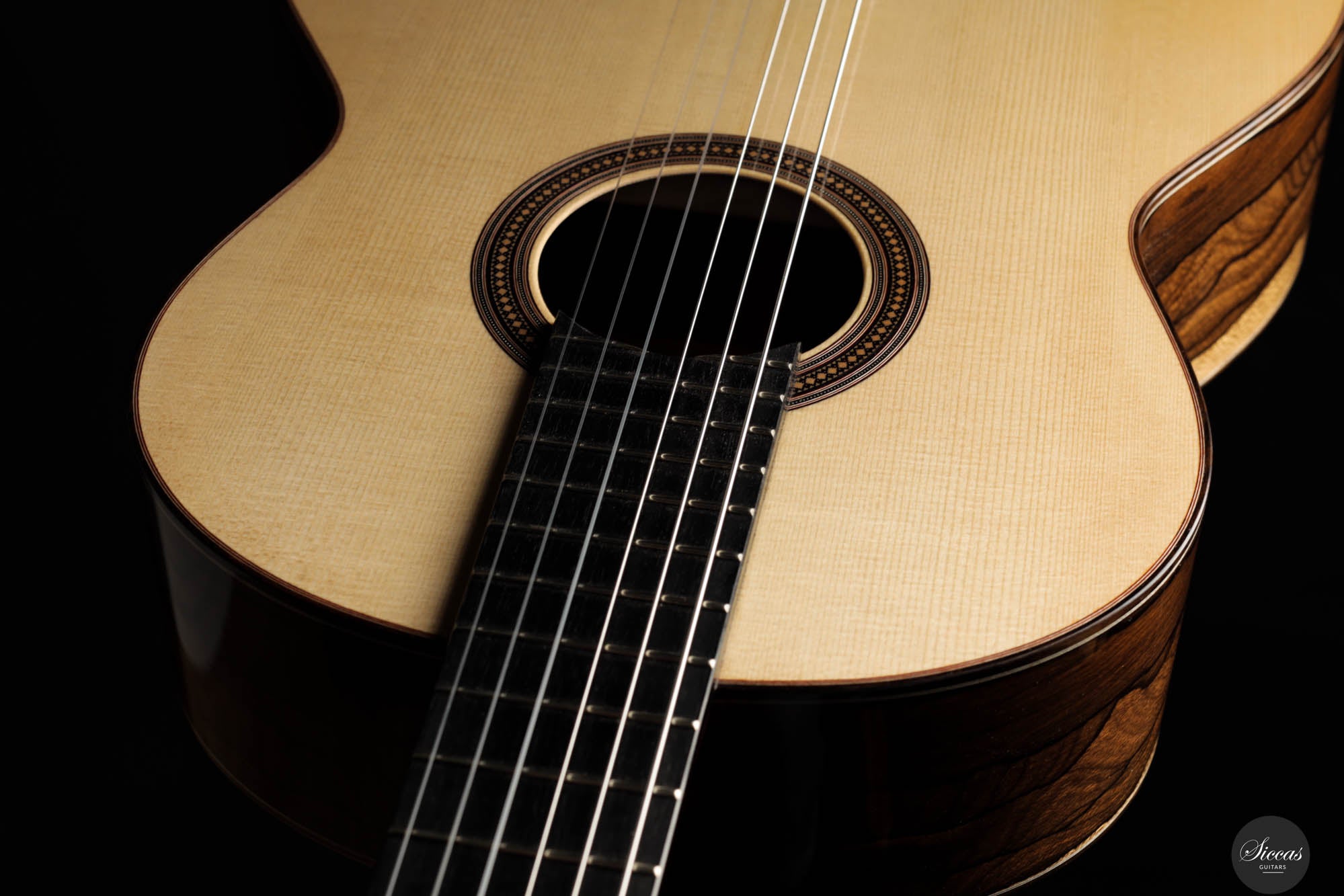 Die Gitarre Nr. 100 markiert einen bedeutenden Meilenstein in der Karriere von François Leonard und demonstriert sein meisterhaftes Können als Gitarrenbauer mit einem wahrhaft herausragenden Konzertinstrument. Dank ihrer Gitterkonstruktion liefert diese Gitarre ein außergewöhnliches Volumen, das die Anforderungen professioneller Musiker in jeder Aufführungssituation erfüllt. Ihre bemerkenswerte Bespielbarkeit ermöglicht eine mühelose Kontrolle, sodass Musiker ihre Kunst vollständig zum Ausdruck bringen können. Die Fichtendecke trägt zu einem wunderschönen Klang der Höhen und reichen Obertönen bei, während die klassische Wahl von indischem Palisander für Boden und Zargen Vielseitigkeit verleiht und sie zu einer idealen Konzertgitarre für eine Vielzahl von Musikstilen macht.