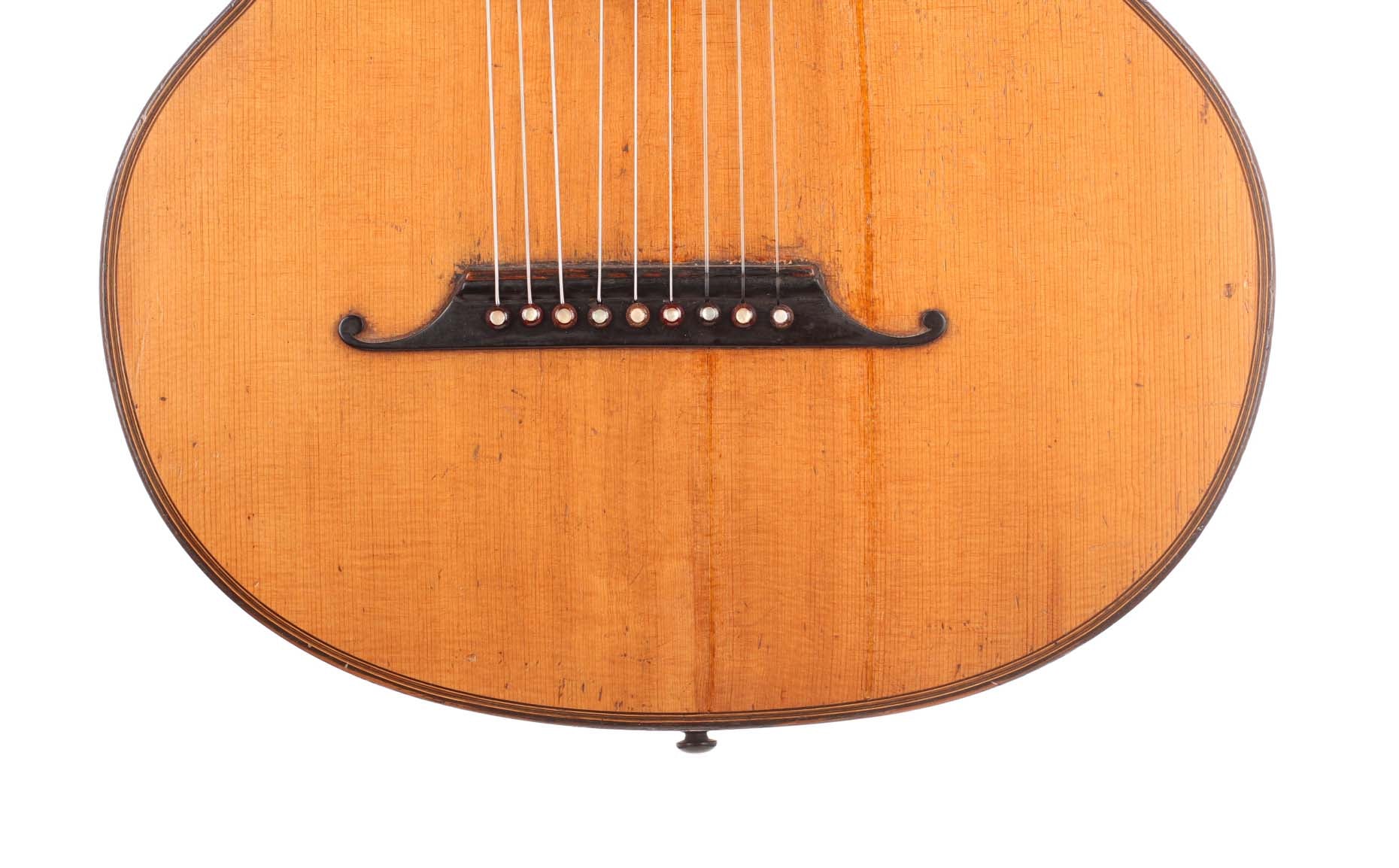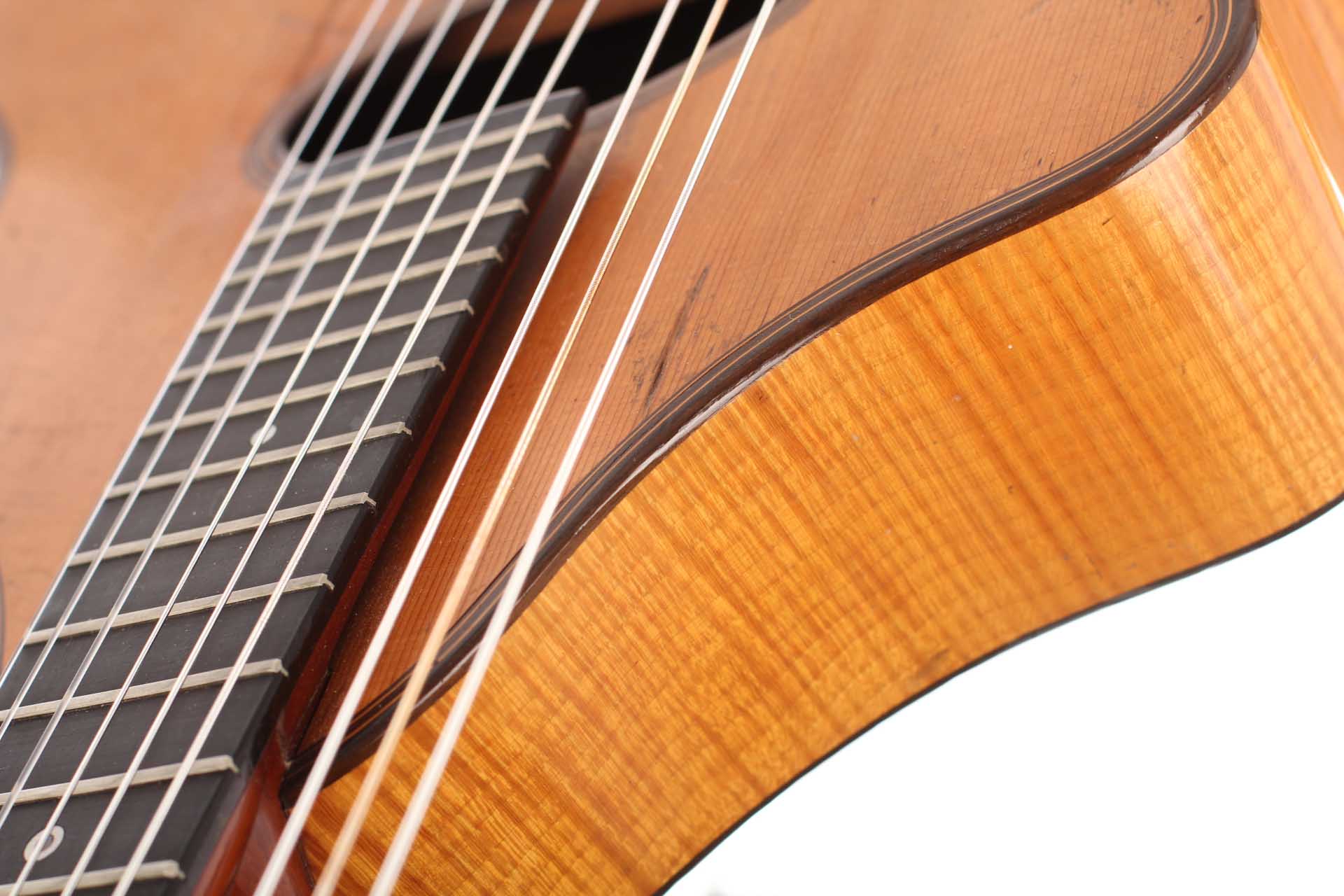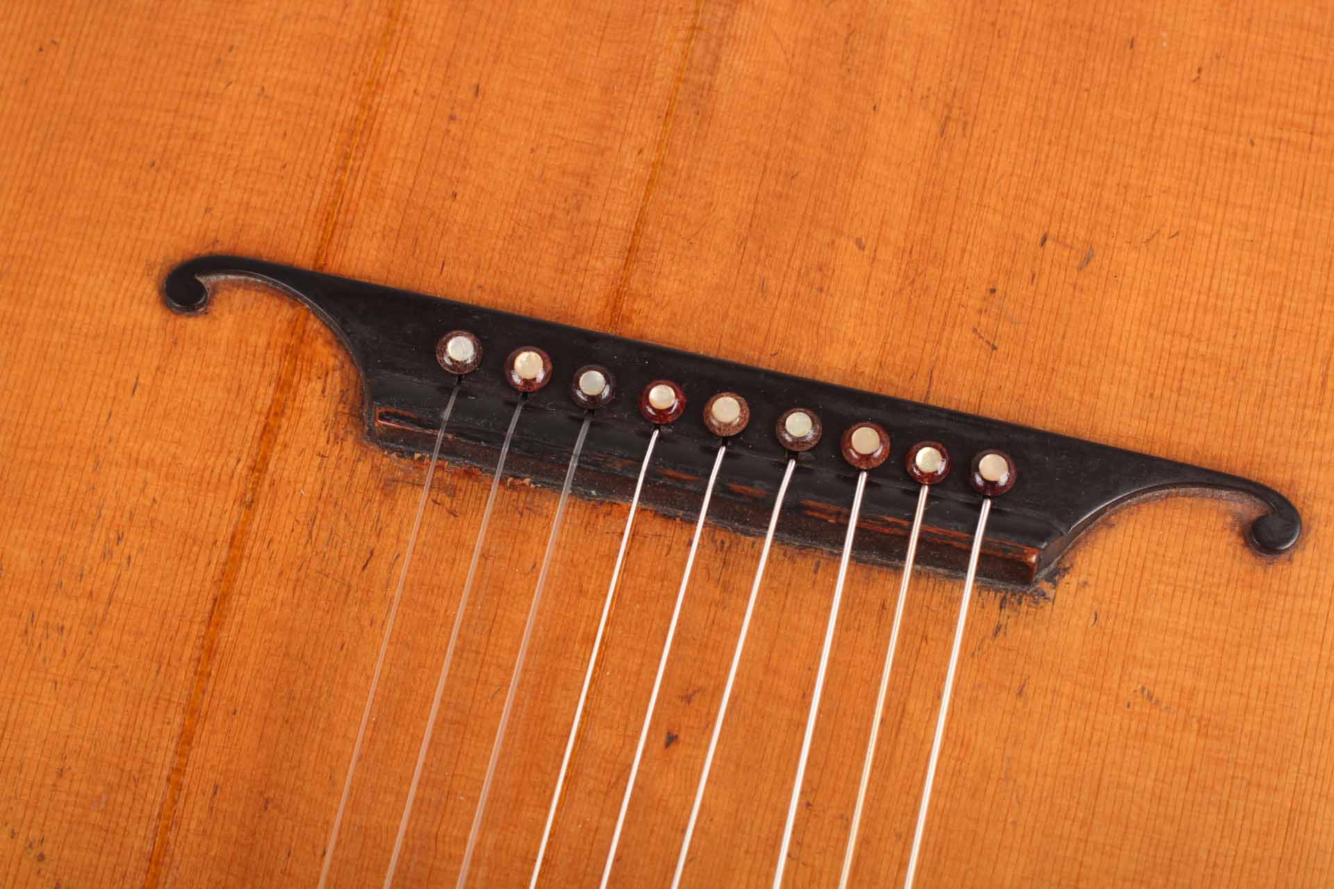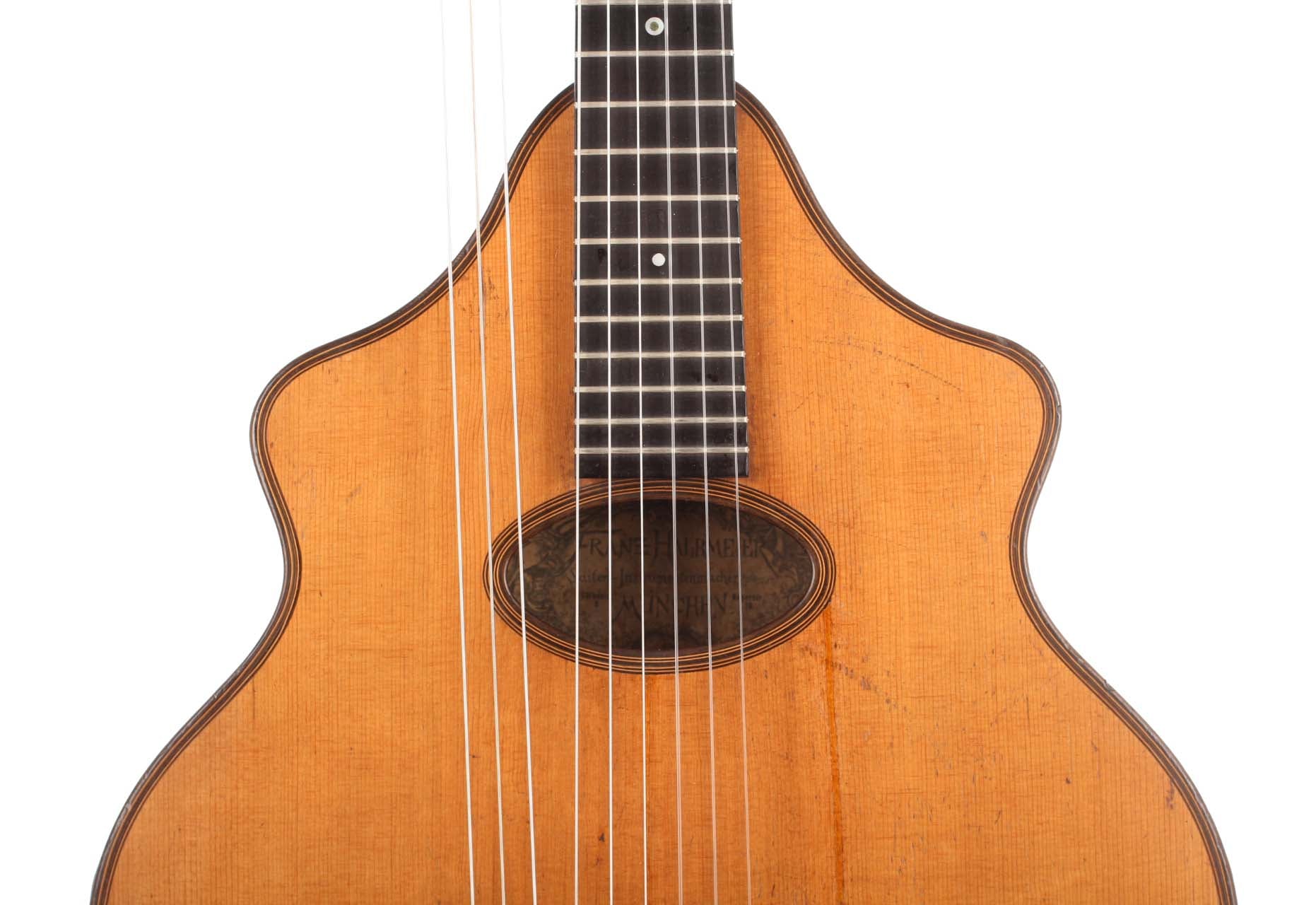"Wappenguitar" by Franz Halbmeier, built ca. 1915. Back and sides are made of maple – the top is made of spruce. The guitar has six melody strings and two freerunning bass strings. Good shape – little repairs.