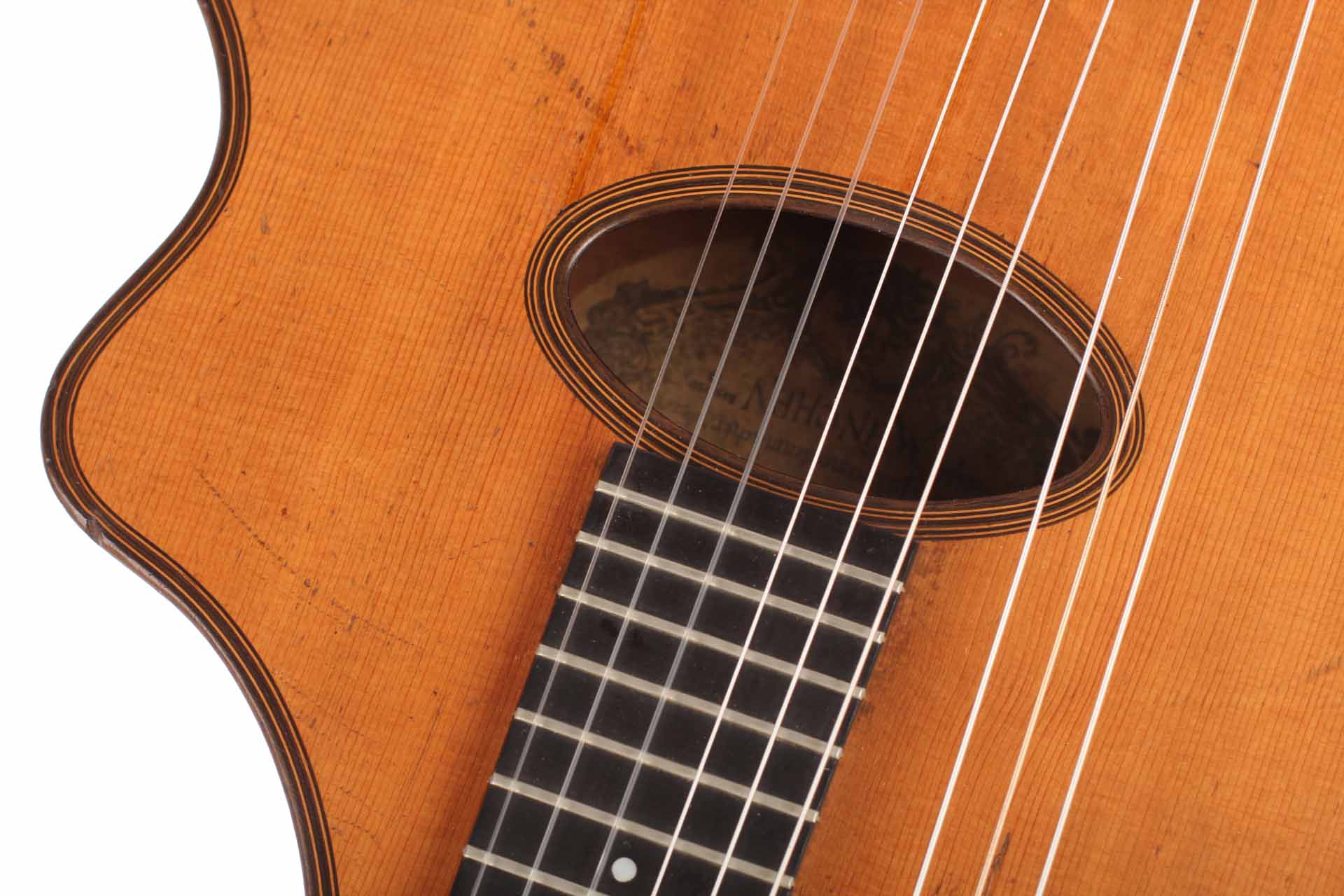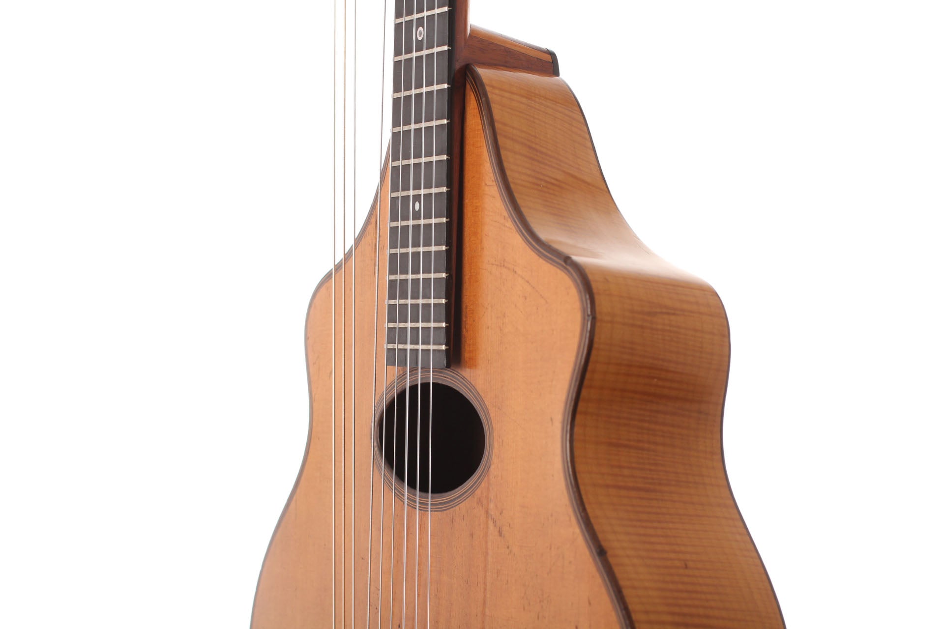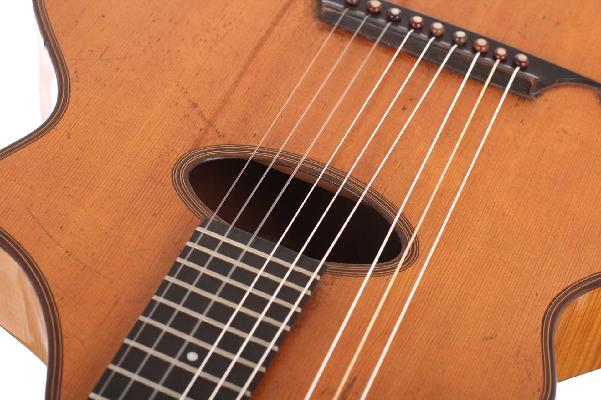 "Wappenguitar" by Franz Halbmeier, built ca. 1915. Back and sides are made of maple – the top is made of spruce. The guitar has six melody strings and two freerunning bass strings. Good shape – little repairs.